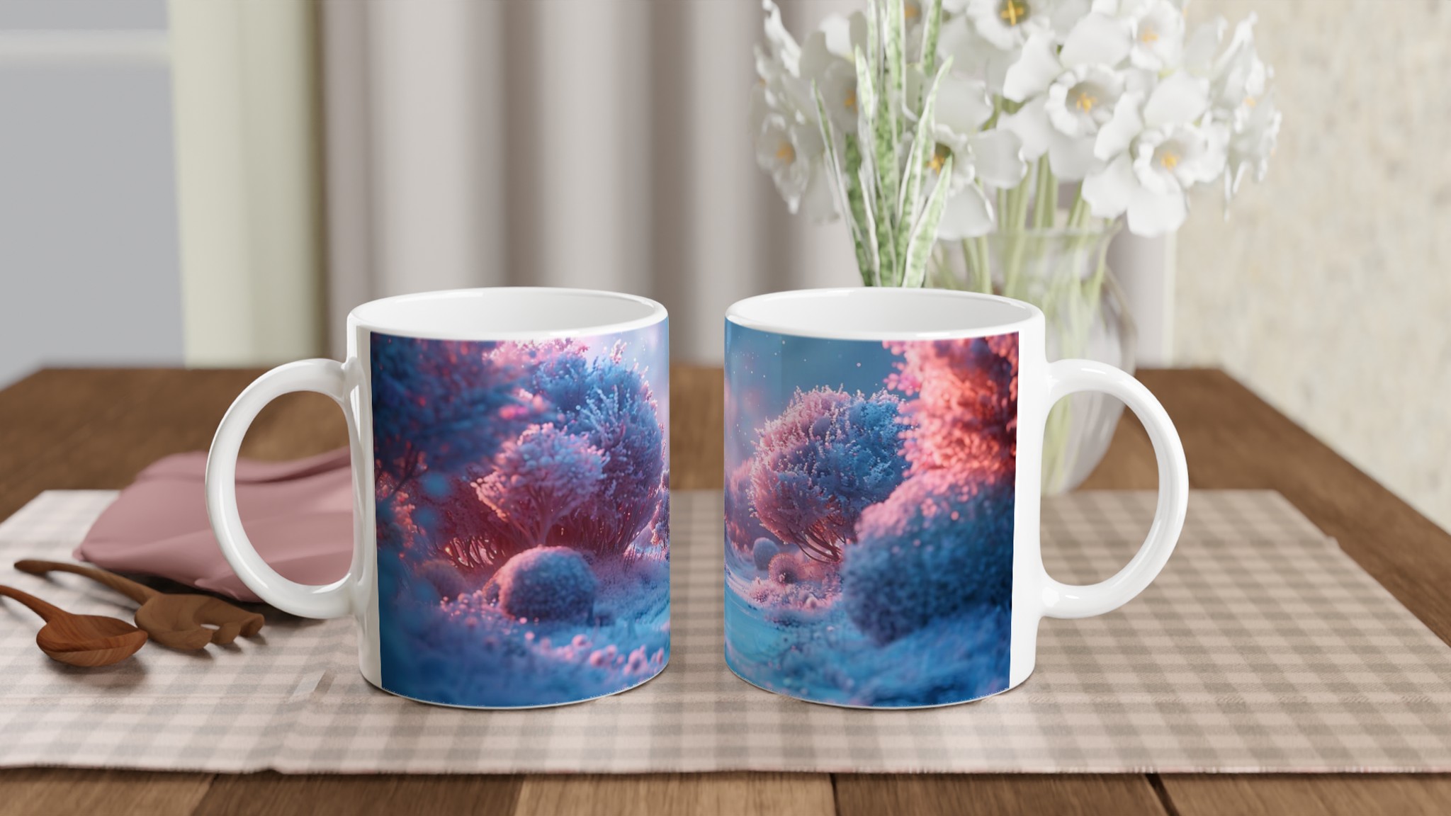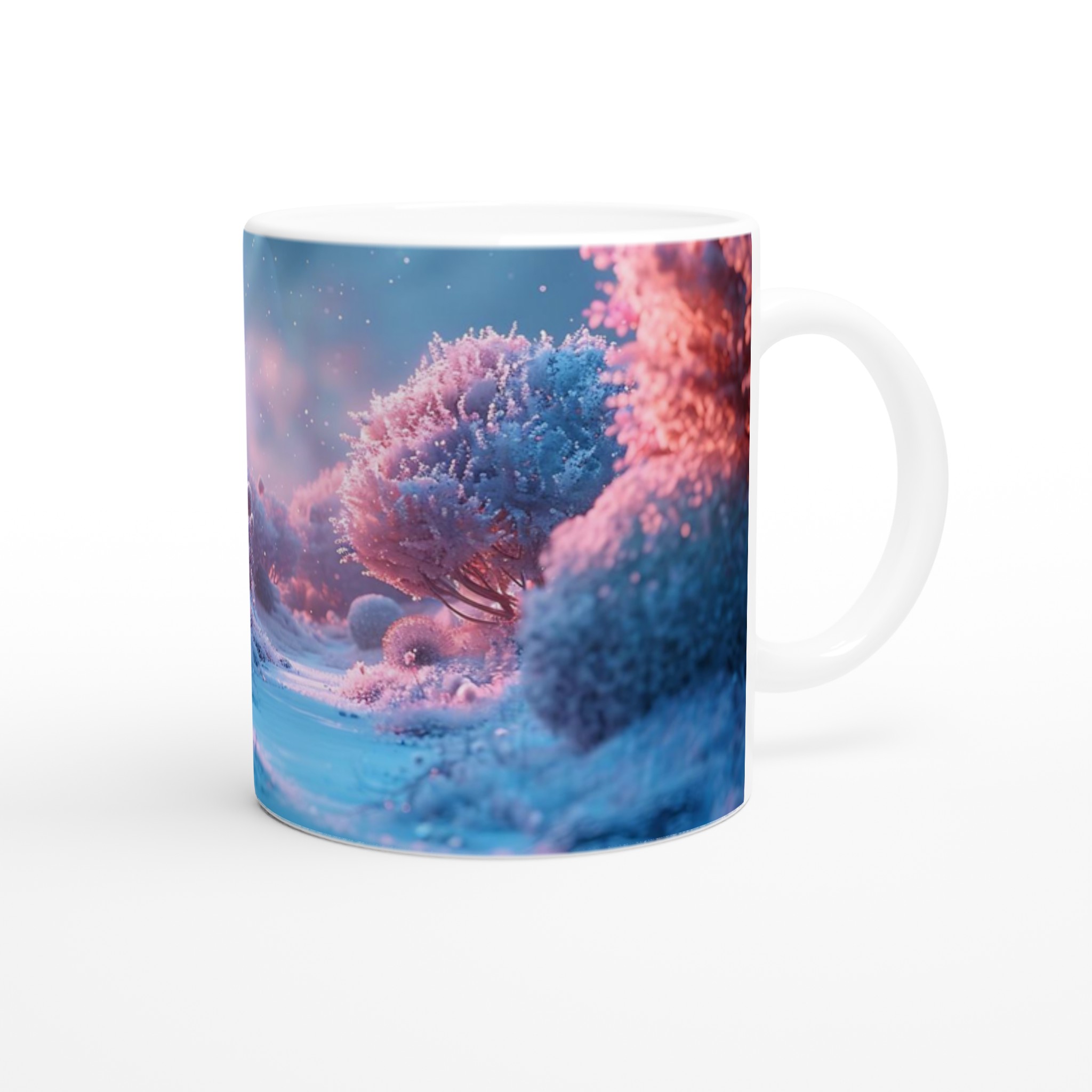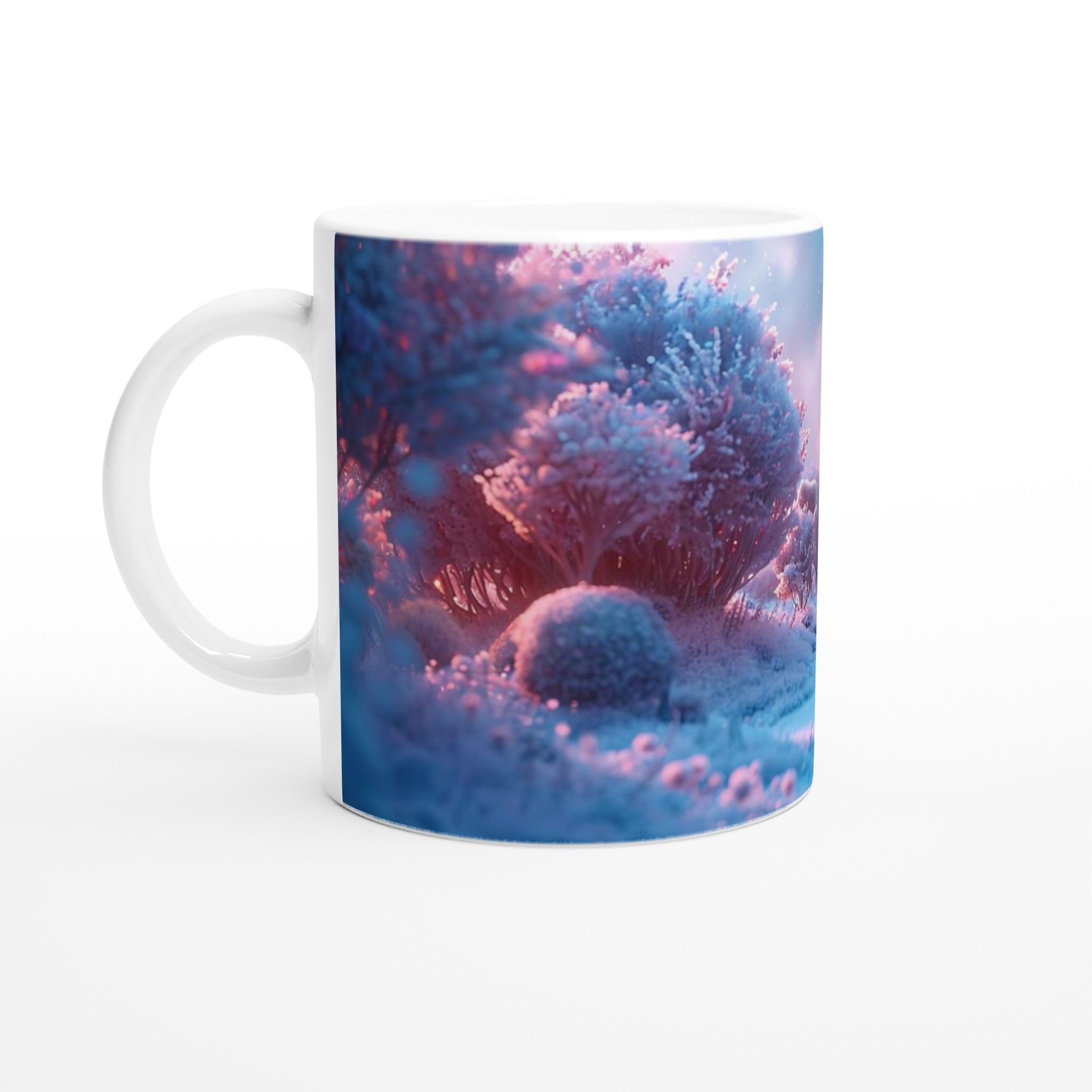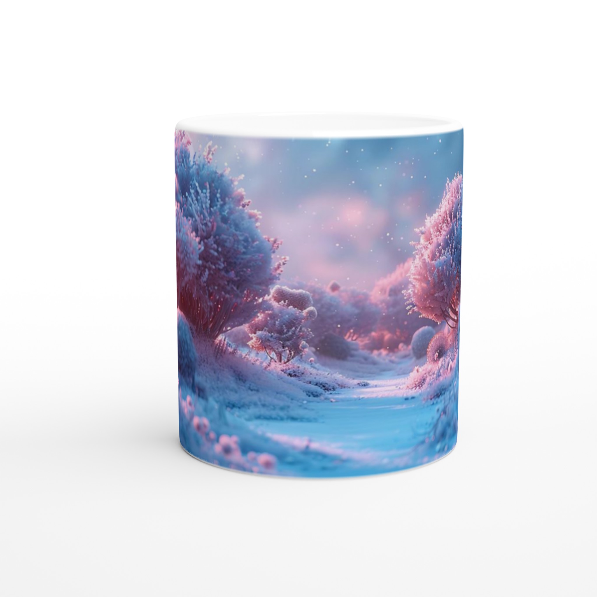 Fånga magin från ett drömlikt vinterlandskap varje gång du tar en klunk med denna förtrollande keramiska mugg. De mjuka pastelltonerna av frostat rosa och isblått, inspirerade av en snötäckt, skimrande skog, skapar en känsla av lugn och undran. Den här stilrena keramiska muggen blir snabbt en vardagsfavorit. Perfekt för morgonkaffet, kvällens varma choklad eller när du bara vill njuta av en kopp te. Den blanka vita ytan gör att trycken framhävs med klara och levande färger, som håller sig fina även efter många turer i mikron och diskmaskinen.