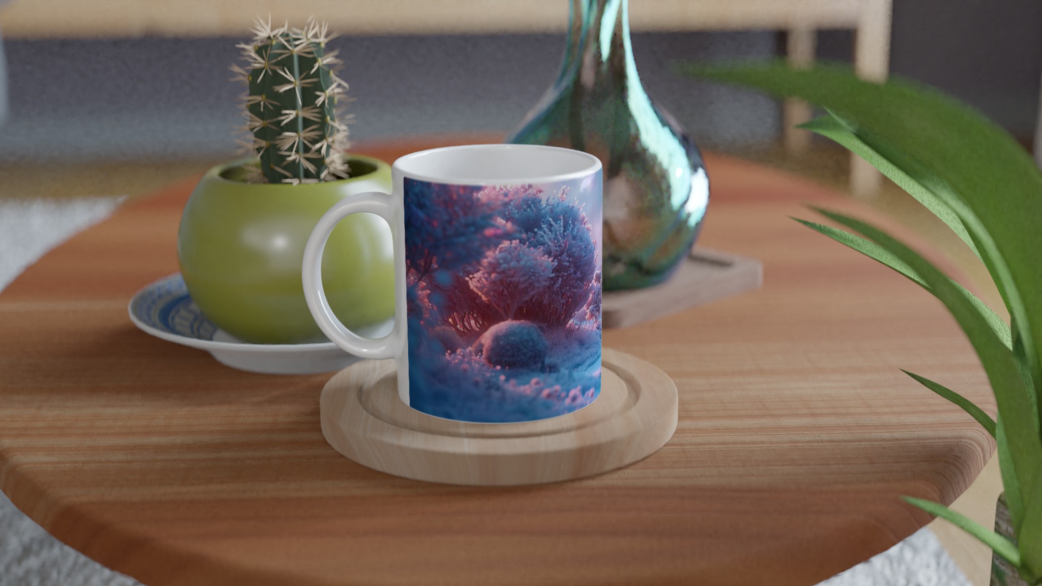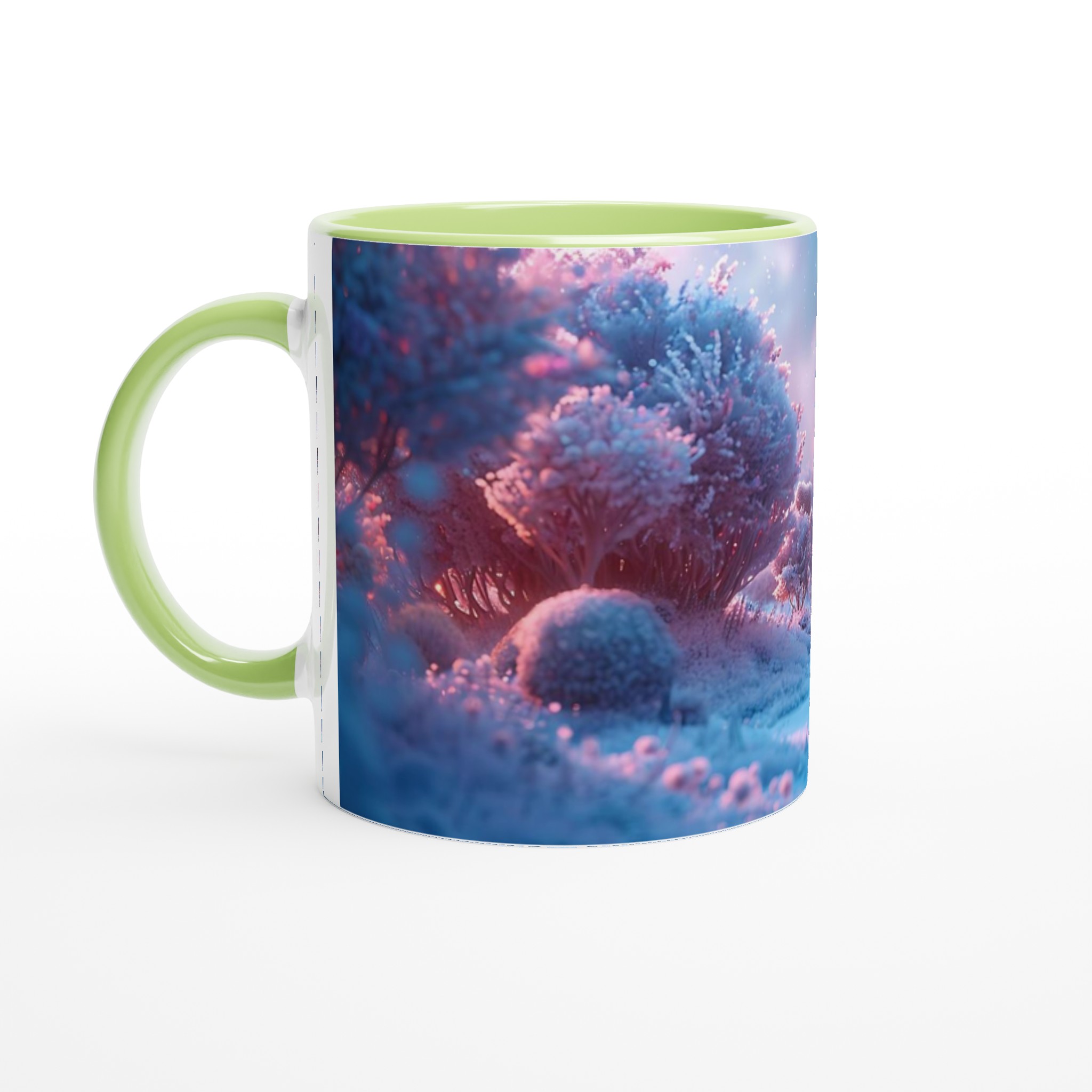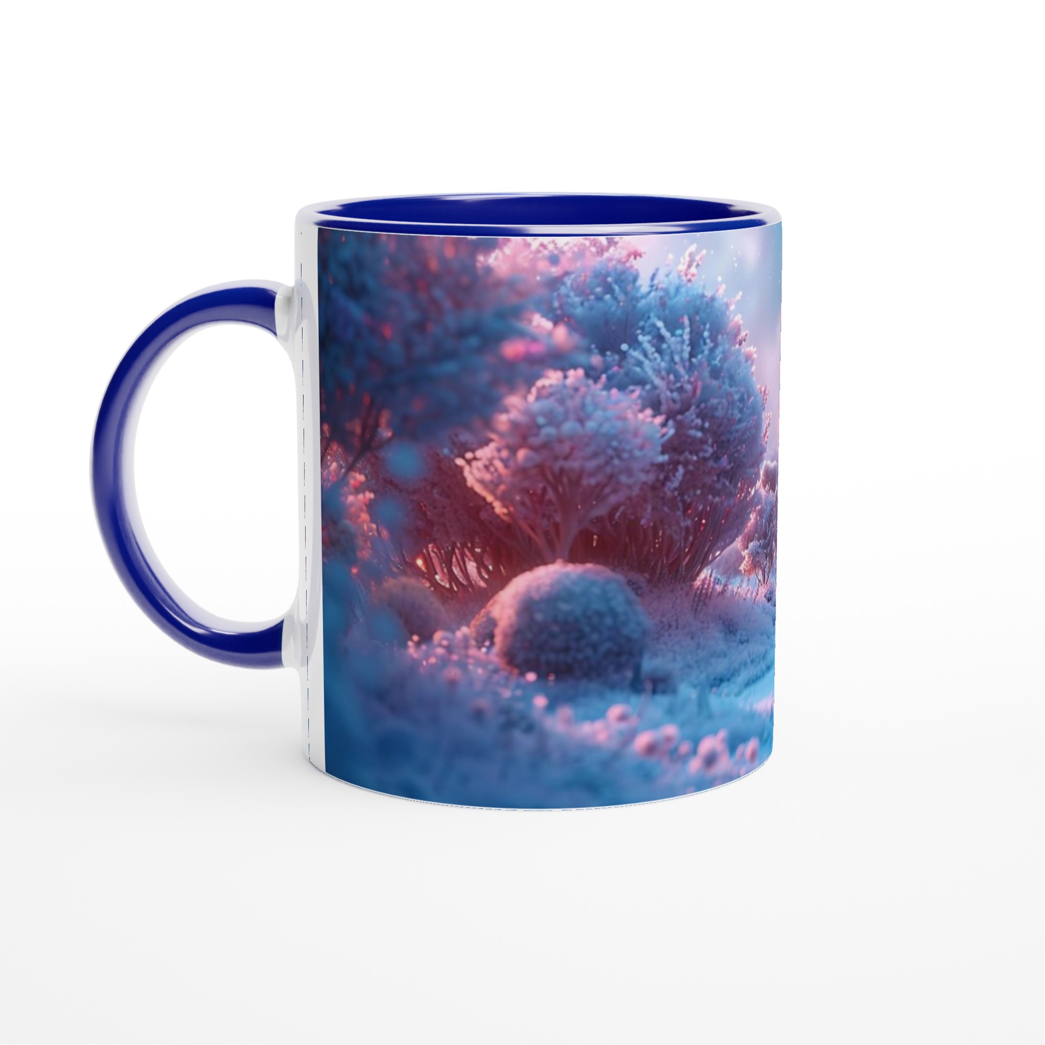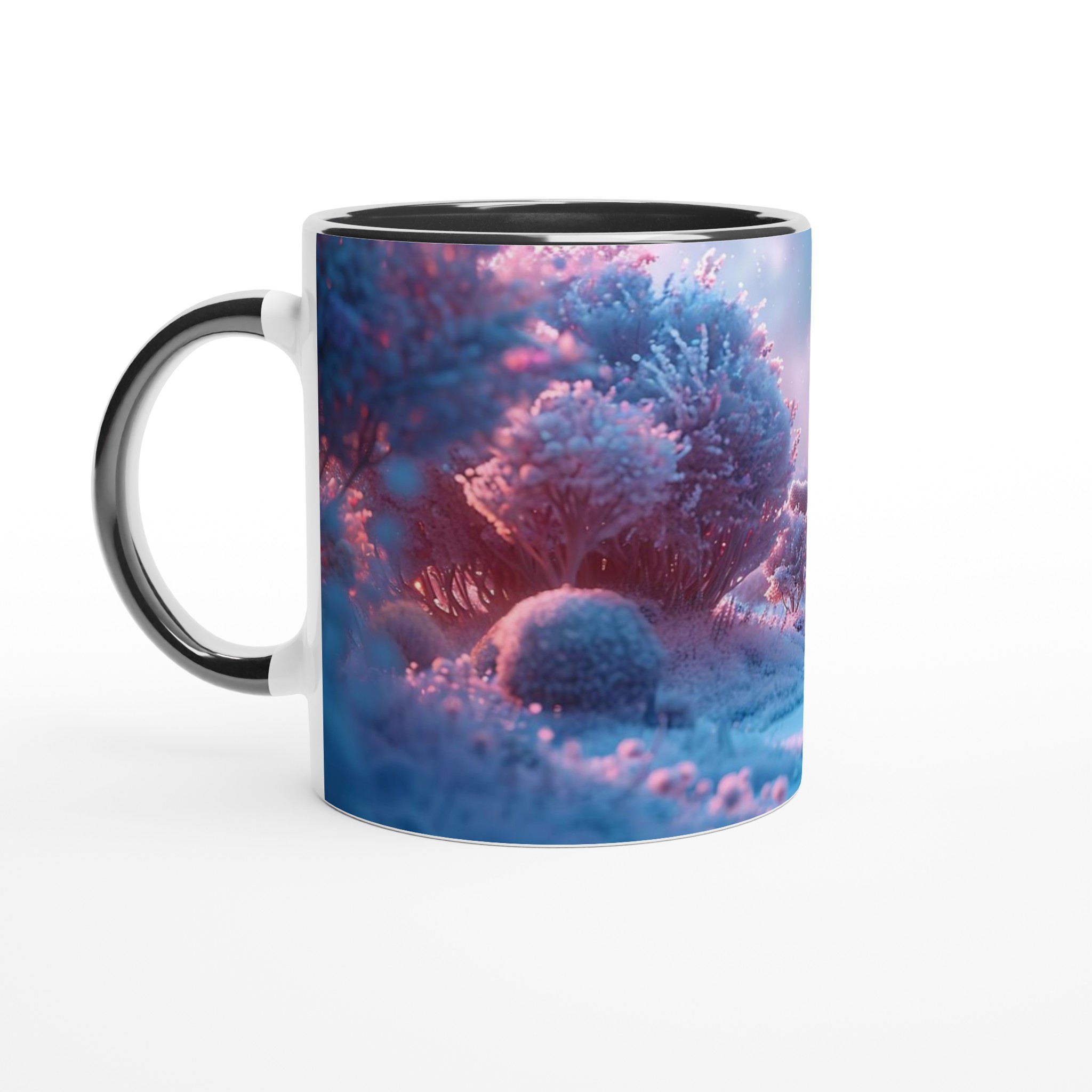 Fånga magin från ett drömlikt vinterlandskap varje gång du tar en klunk med denna förtrollande keramiska mugg. De mjuka pastelltonerna av frostat rosa och isblått, inspirerade av en snötäckt, skimrande skog, skapar en känsla av lugn och undran. Den här stilrena keramiska muggen blir snabbt en vardagsfavorit. Perfekt för morgonkaffet, kvällens varma choklad eller när du bara vill njuta av en kopp te. Den blanka vita ytan gör att trycken framhävs med klara och levande färger, som håller sig fina även efter många turer i mikron och diskmaskinen.