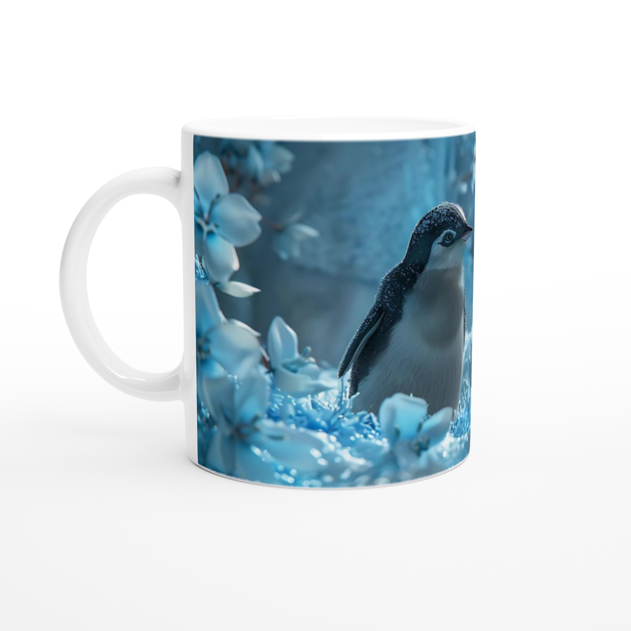 Inspirerad av den magiska skönheten hos en liten pingvin i ett frostigt blomsterlandskap, fångar denna mugg vinterns stillhet och förtrollning. Den blanka vita ytan ger ett skarpt och levande tryck som verkligen sticker ut, oavsett om det är en personlig design, ett roligt citat eller en present till någon du tycker om.