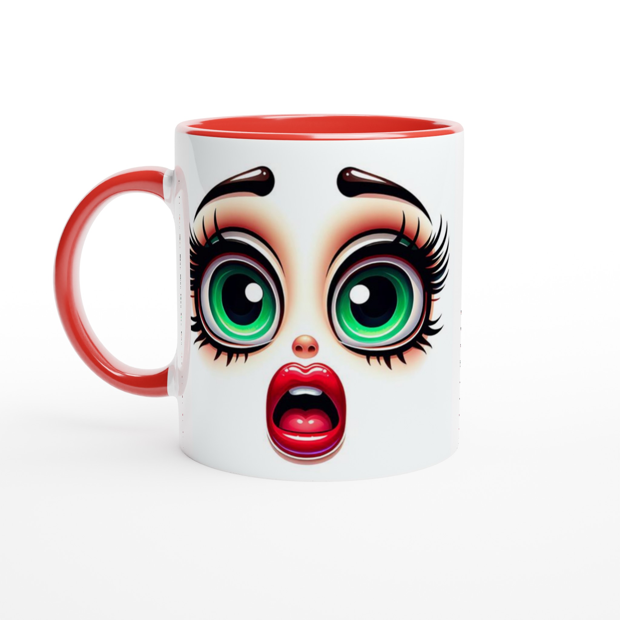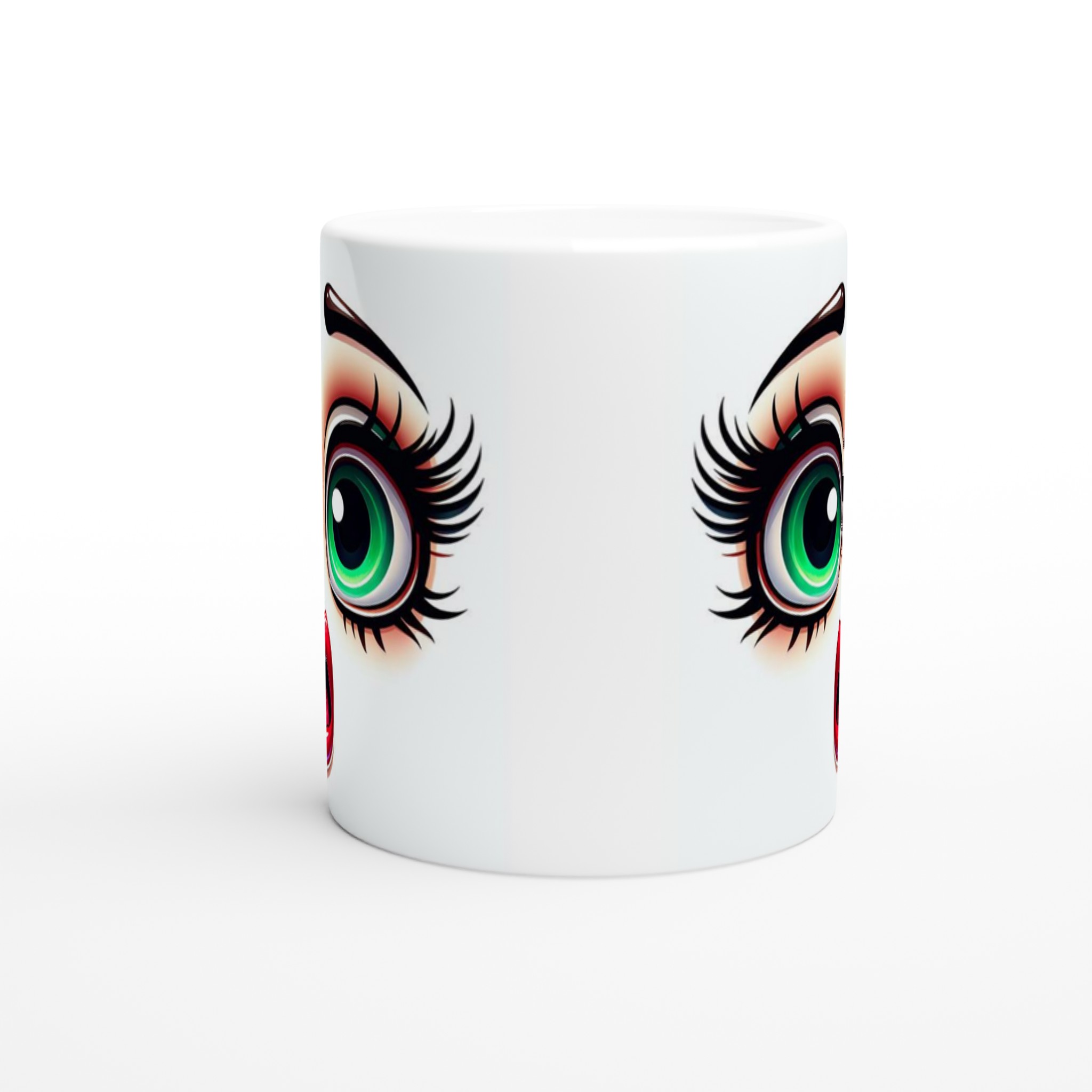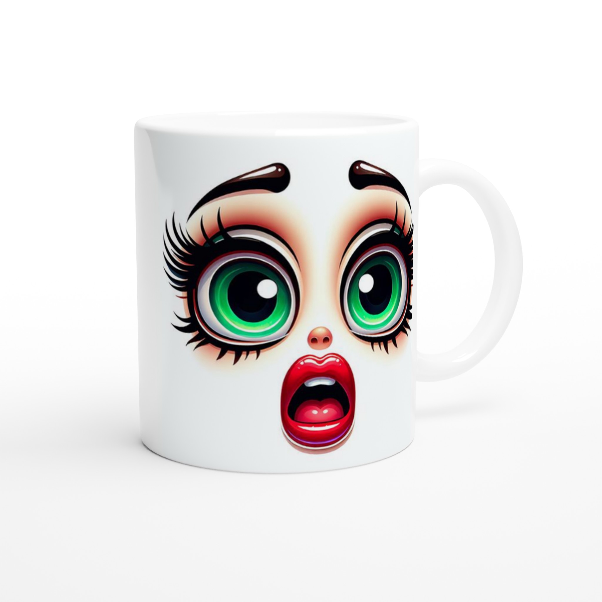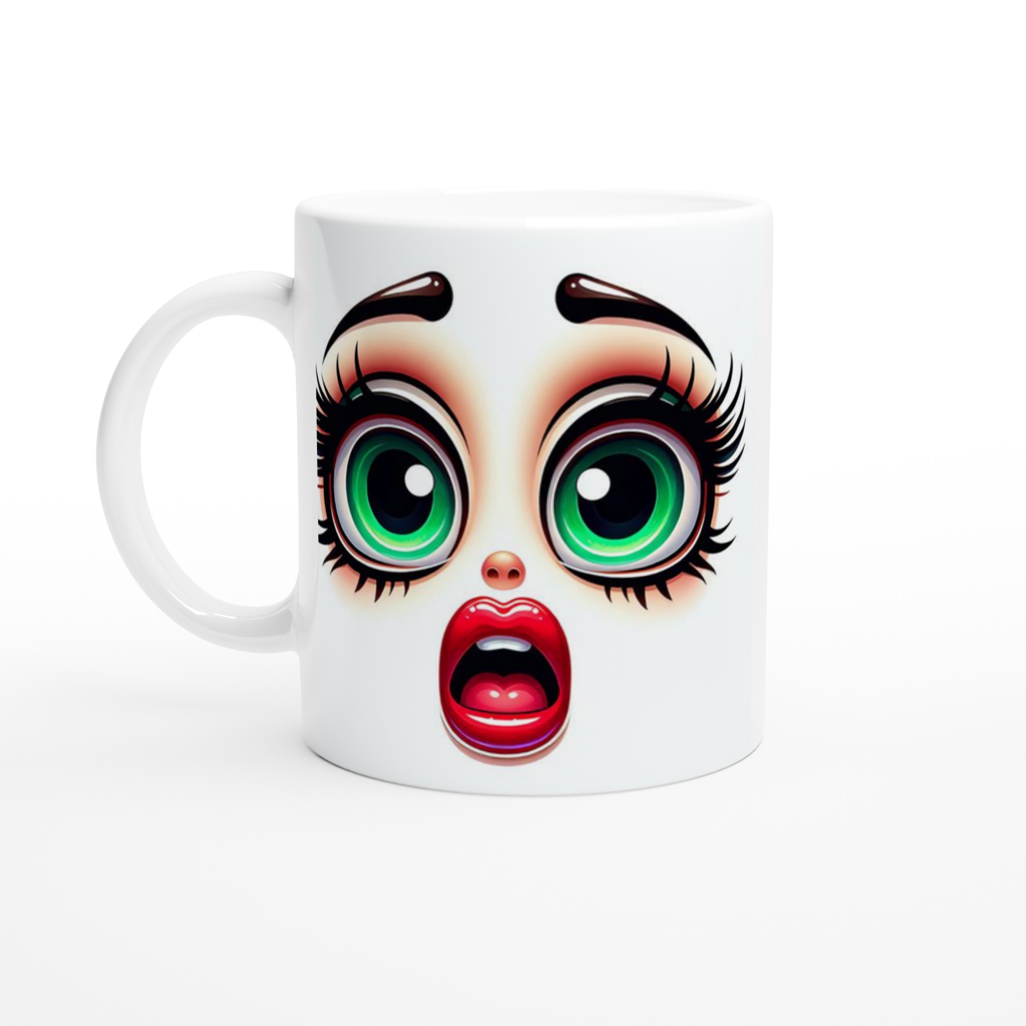 Lyft varje kaffestund med vår premium keramikmugg – stilren, hållbar och skapad för att låta ditt motiv glänsa. Denna unika mugg fångar blicken med sin distinkta design av förvånade, uttrycksfulla ögon med glänsande grön iris och livfulla röda läppar, vilket ger en lekfull och konstnärlig touch till din dryckesupplevelse. Det är det perfekta sättet att starta dagen med ett leende, eller ge bort en gåva som verkligen överraskar.