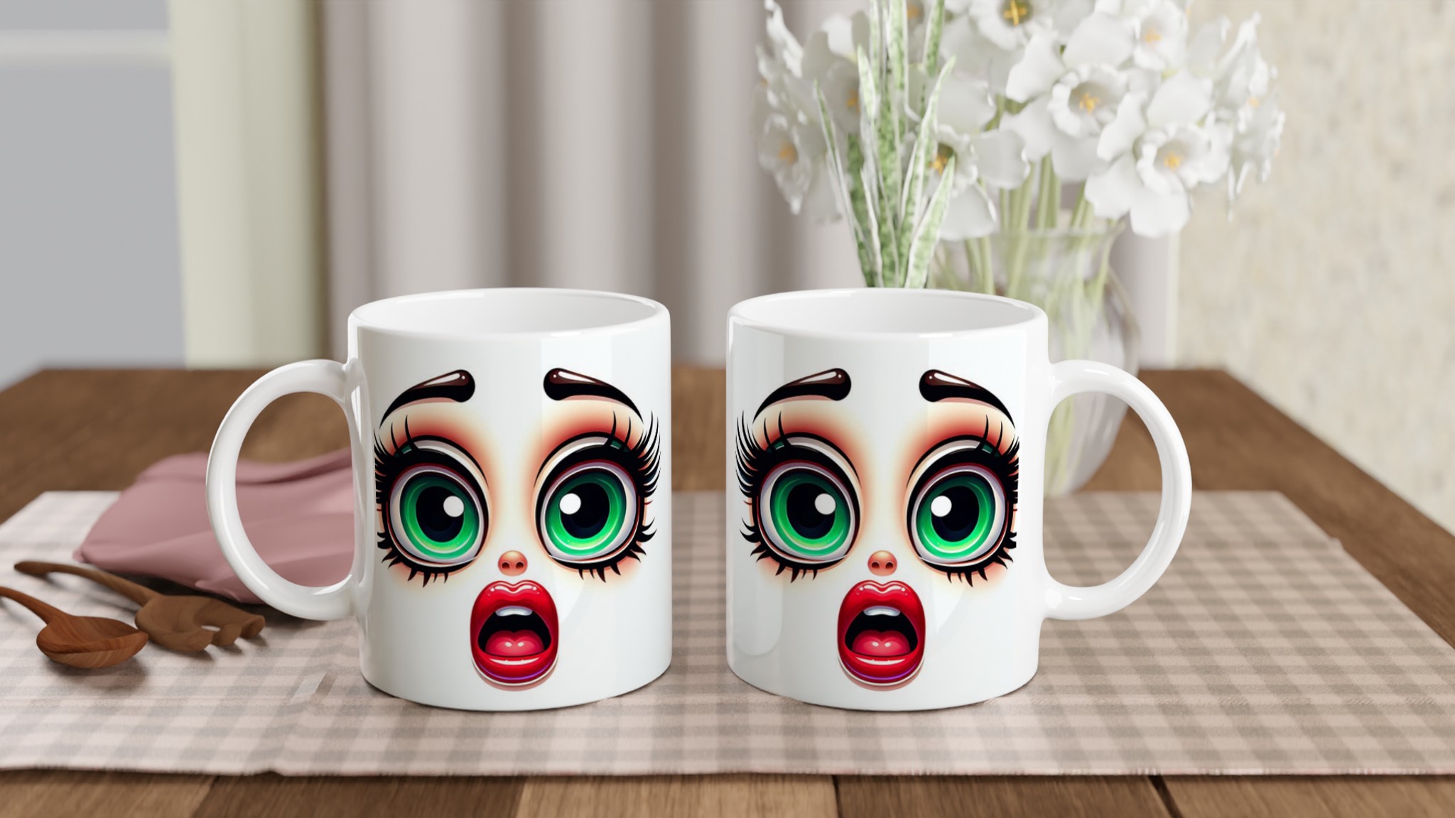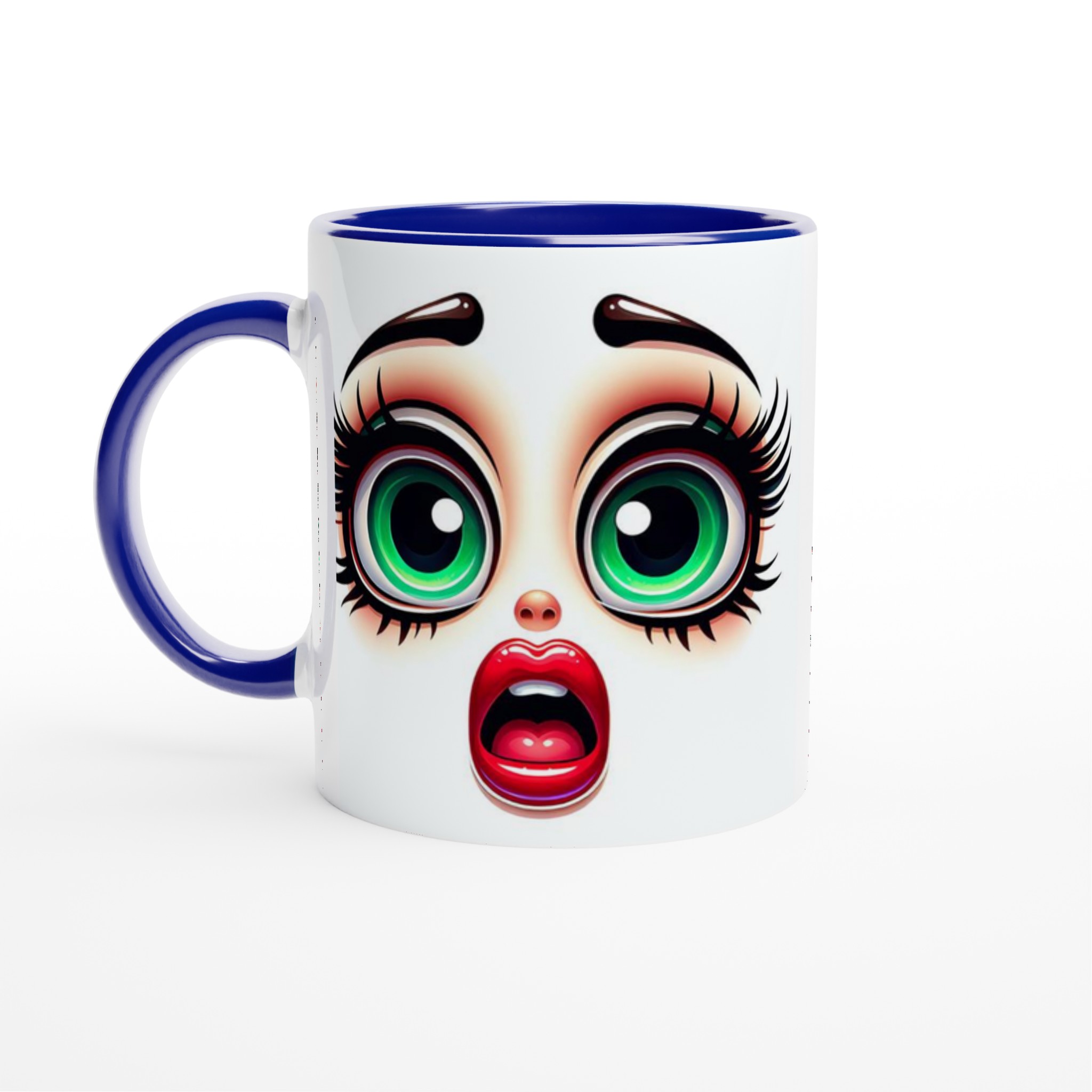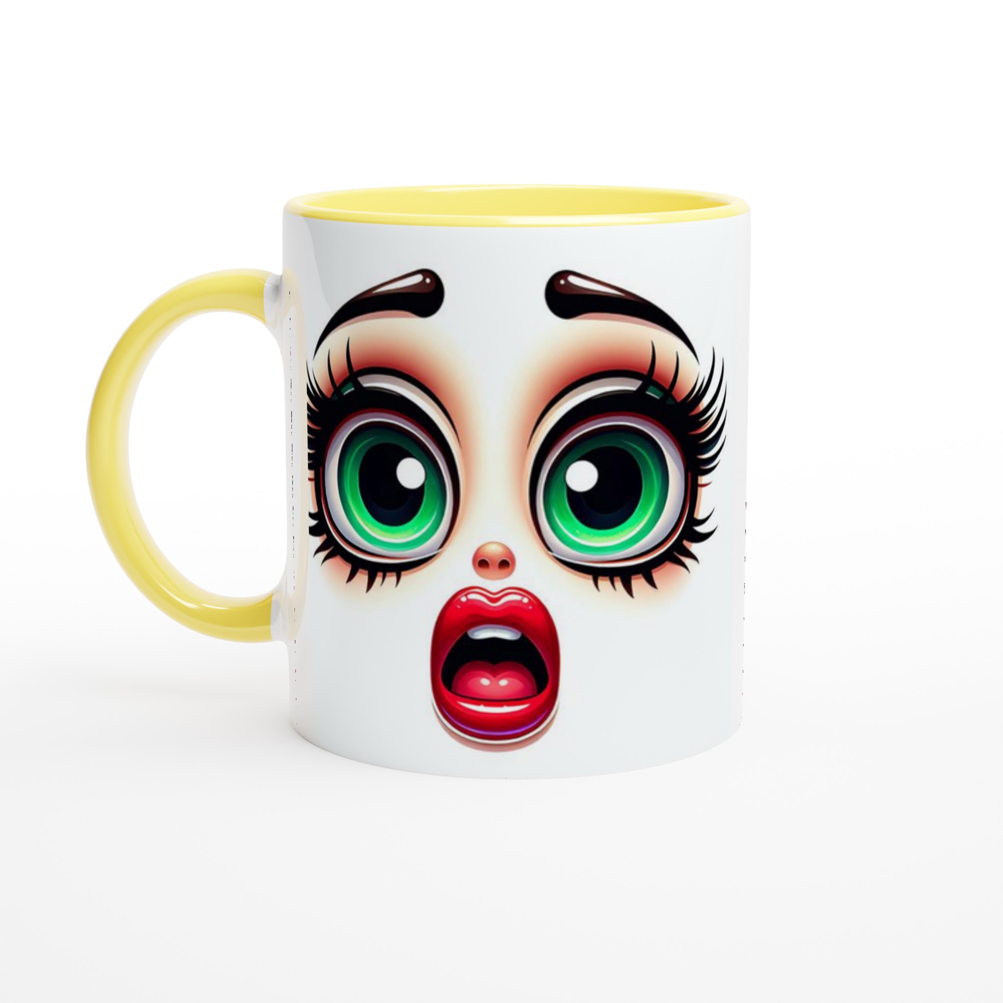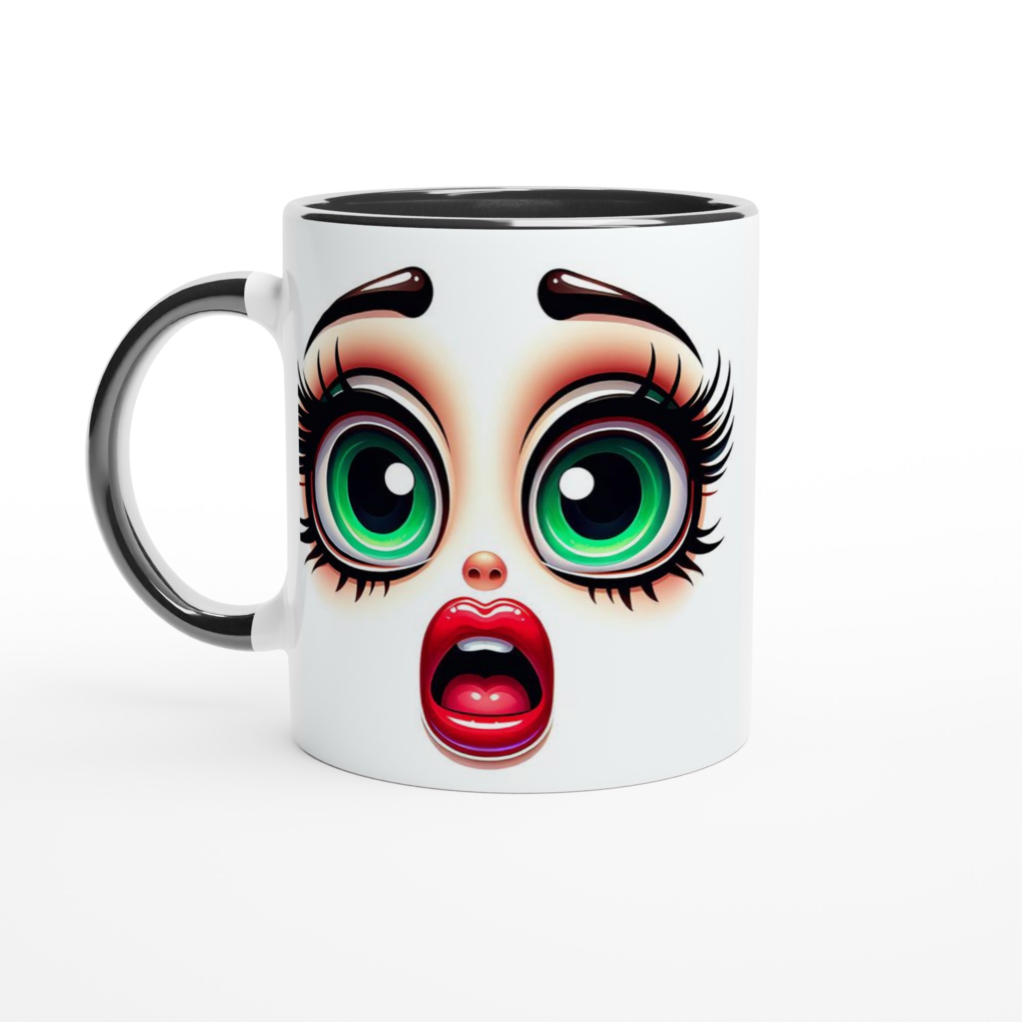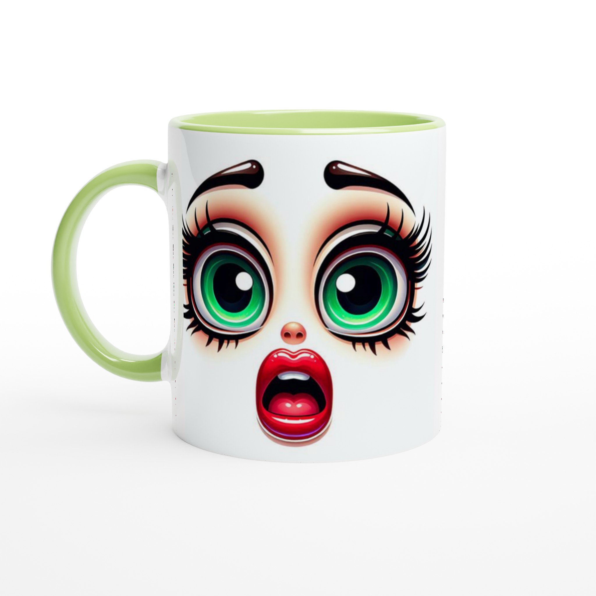 Lyft varje kaffestund med vår premium keramikmugg – stilren, hållbar och skapad för att låta ditt motiv glänsa. Denna unika mugg fångar blicken med sin distinkta design av förvånade, uttrycksfulla ögon med glänsande grön iris och livfulla röda läppar, vilket ger en lekfull och konstnärlig touch till din dryckesupplevelse. Det är det perfekta sättet att starta dagen med ett leende, eller ge bort en gåva som verkligen överraskar.