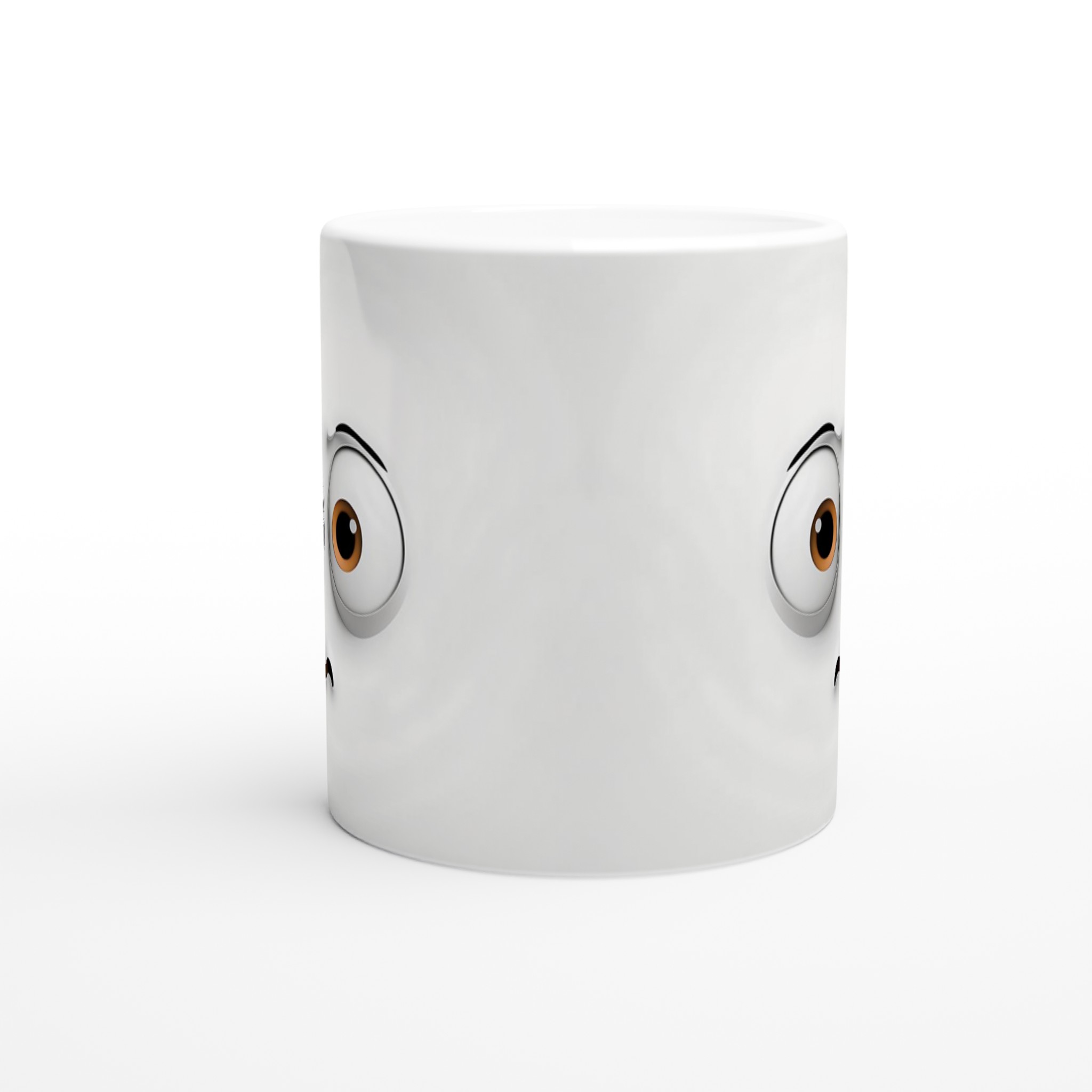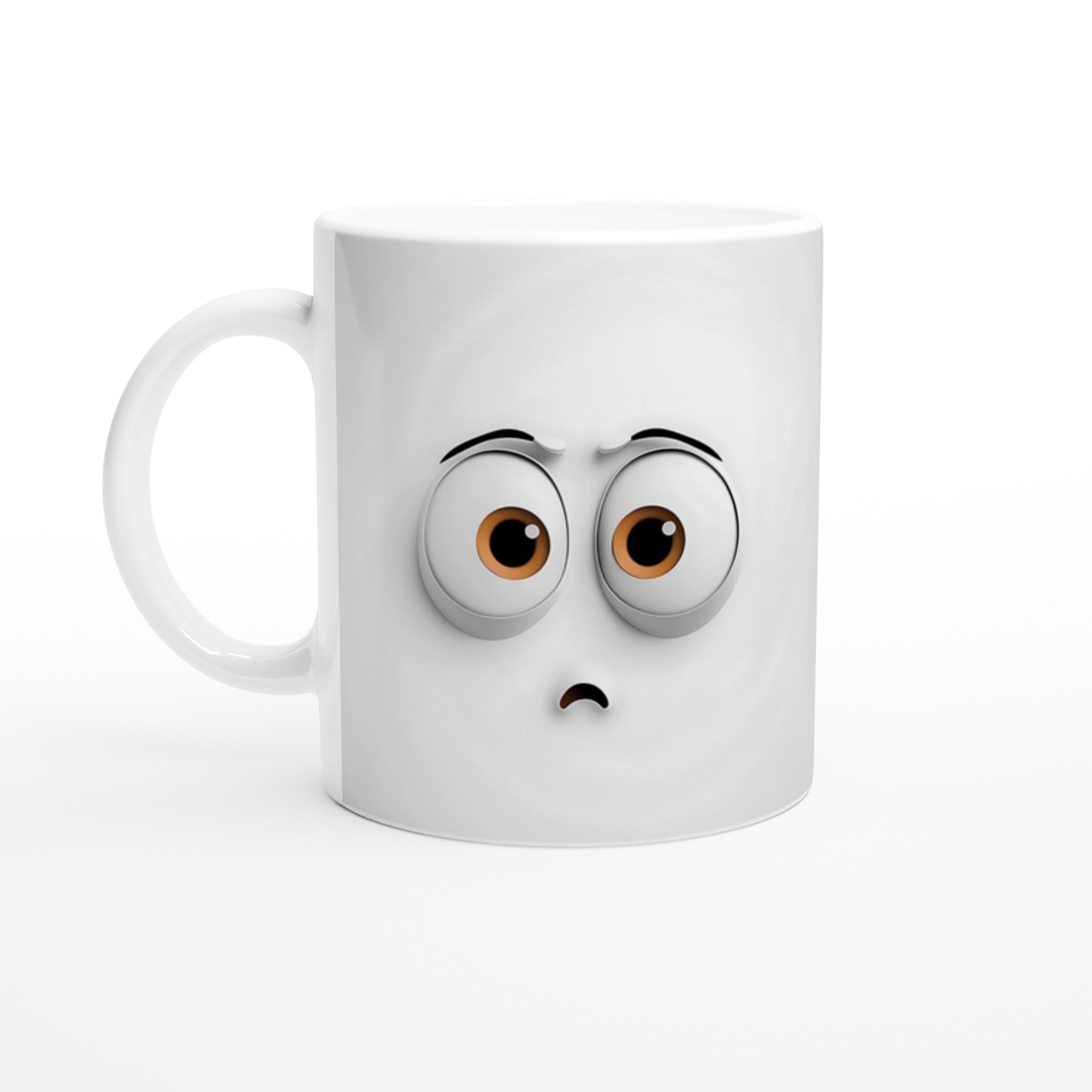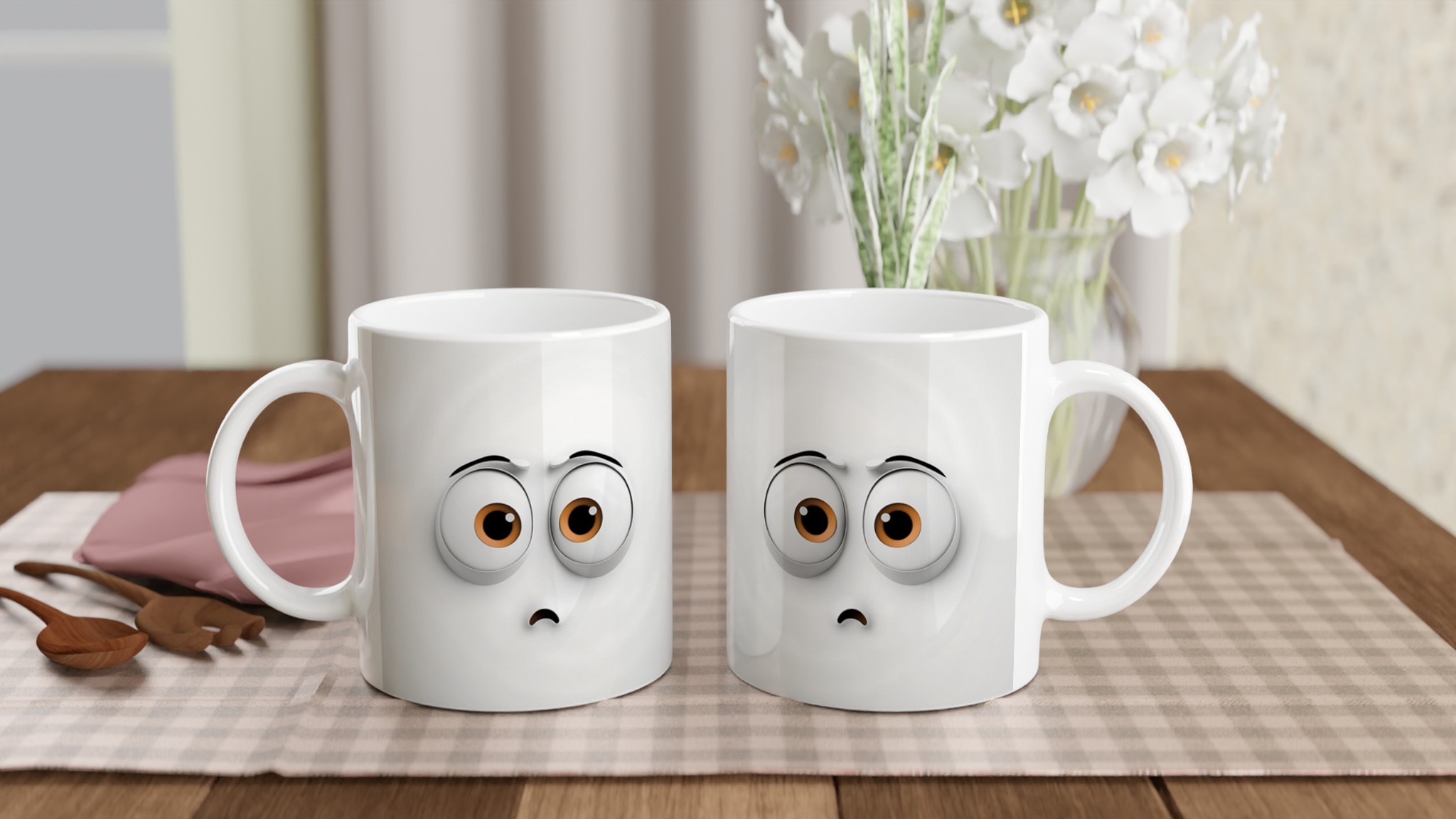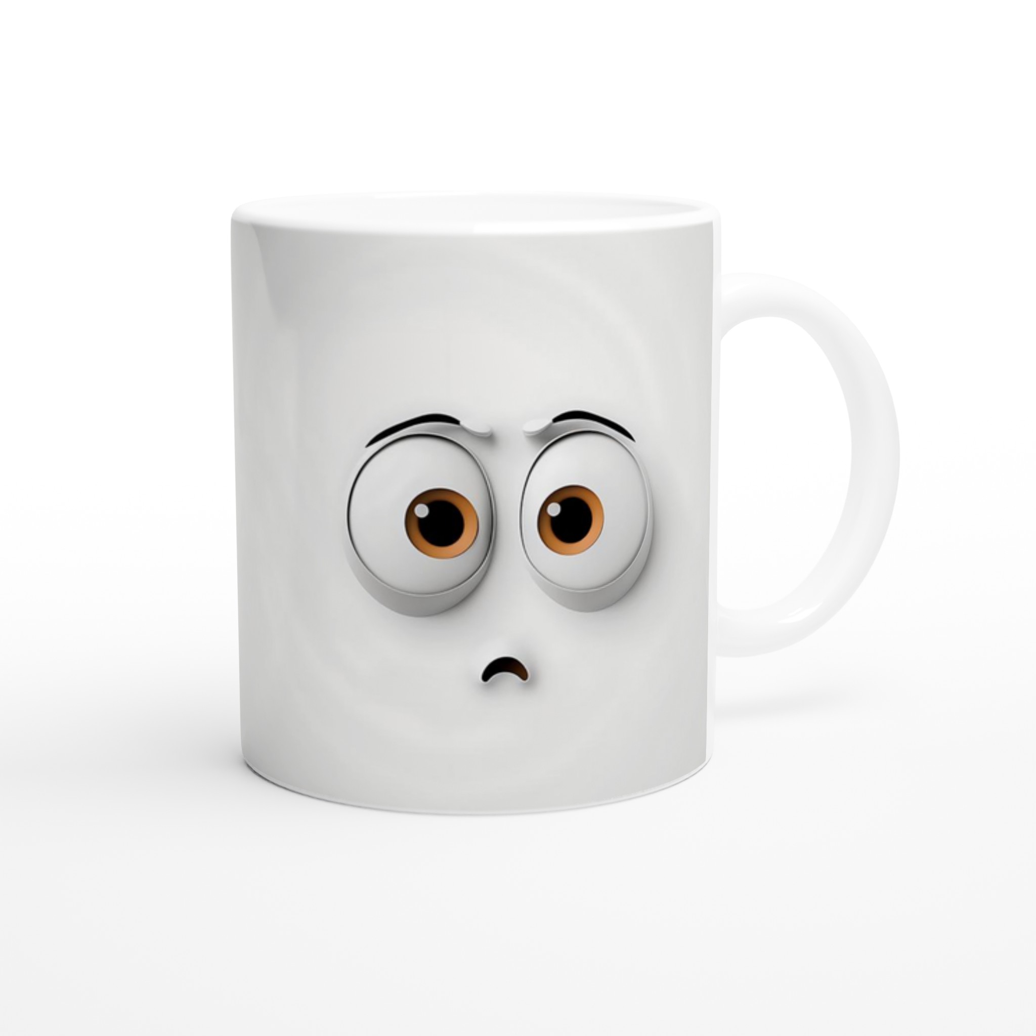 Denna charmiga mugg, prydd med ett par stora, förvånade tecknade ögon och en liten ’oops’-mun, kommer garanterat att väcka leenden vid varje användning. Den blanka vita ytan ger ett skarpt och levande tryck som verkligen sticker ut, oavsett om det är en personlig design, ett roligt citat eller en present till någon du tycker om. Perfekt för dem som älskar humor och unika detaljer i vardagen!