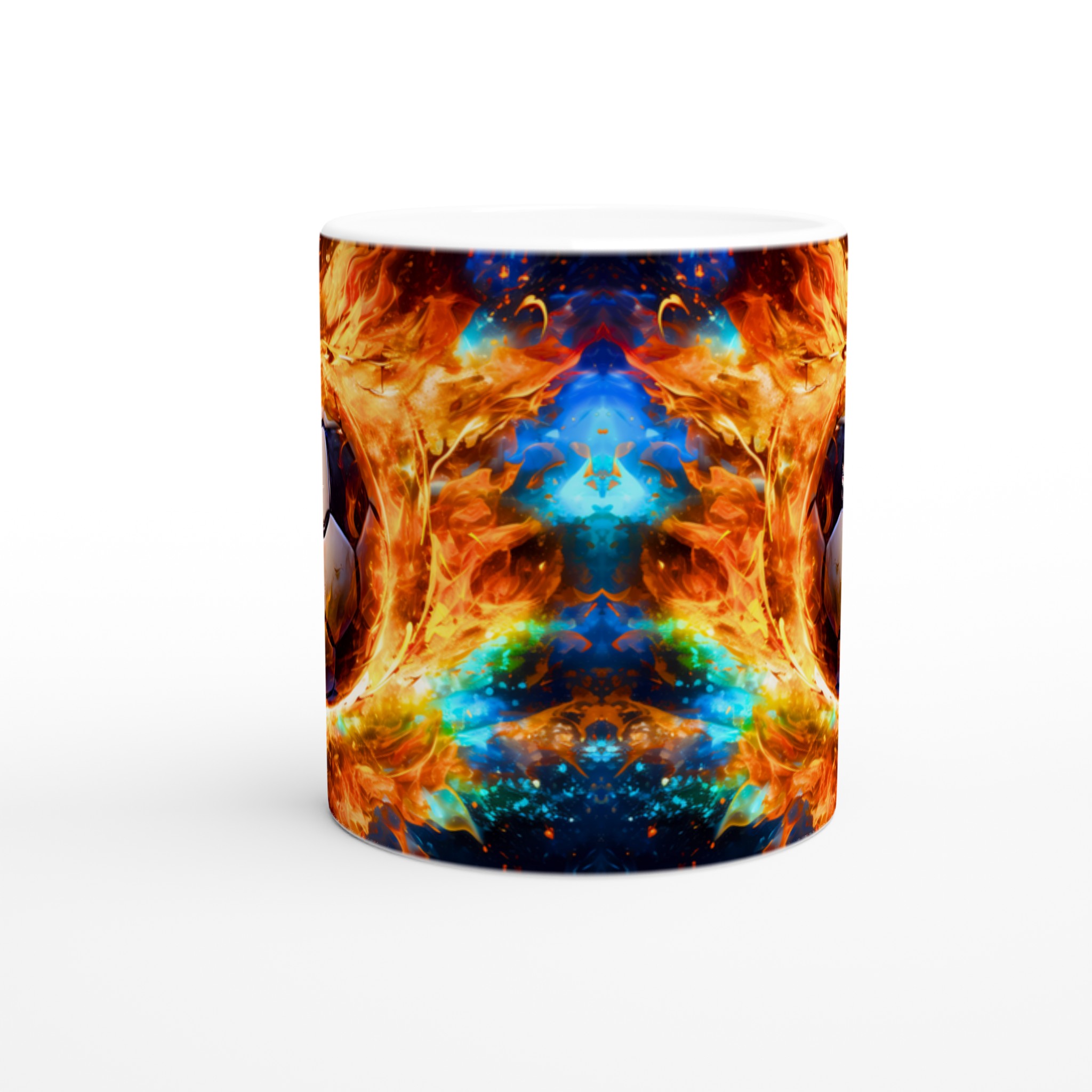 Den blanka vita ytan gör att det intensiva trycket framhävs med klara och levande färger, där de brinnande orangea och svala blå tonerna skapar en slående kontrast. Trycket håller sig vackert och levande, även efter många turer i mikron och diskmaskinen, vilket garanterar att din mugg behåller sin stjärnglans.