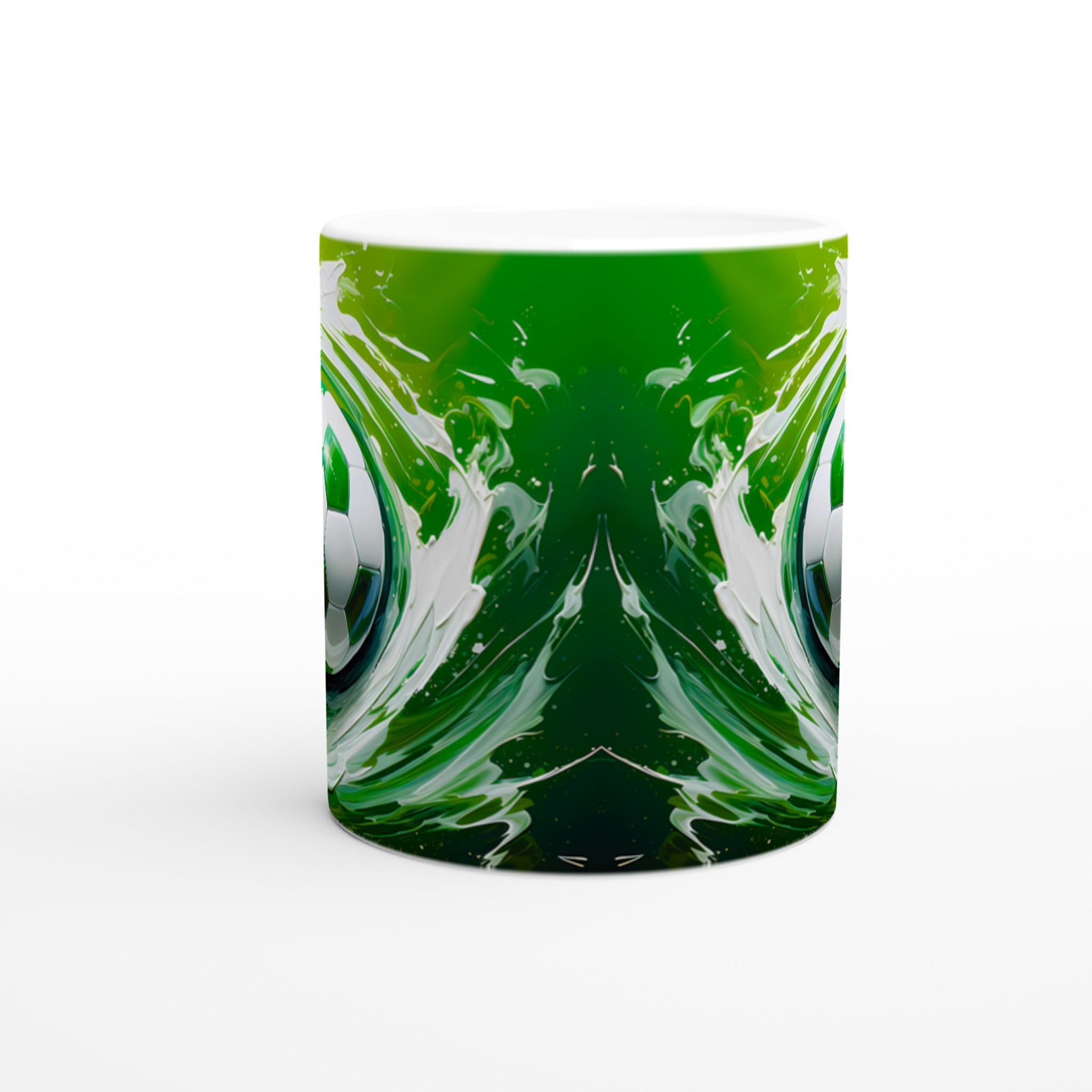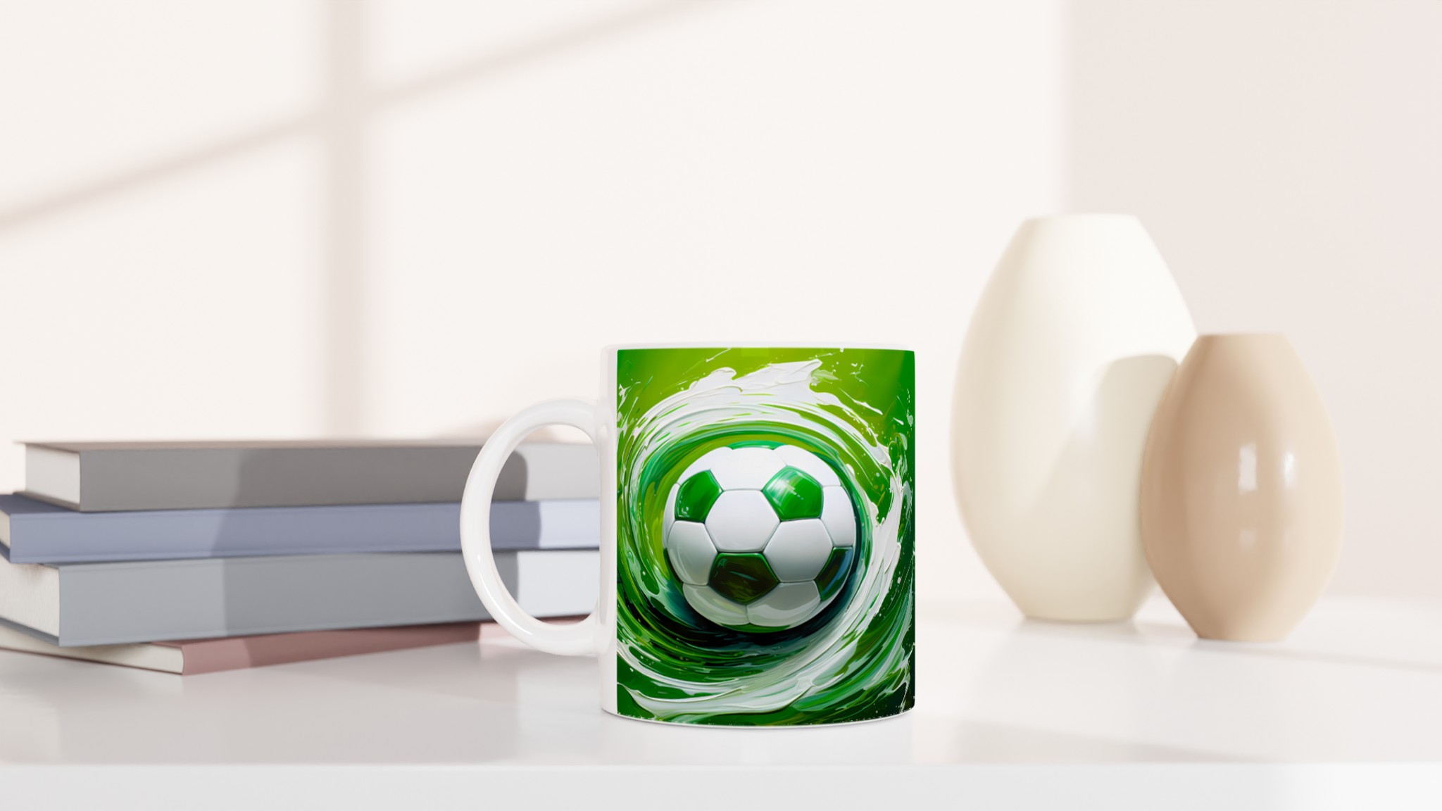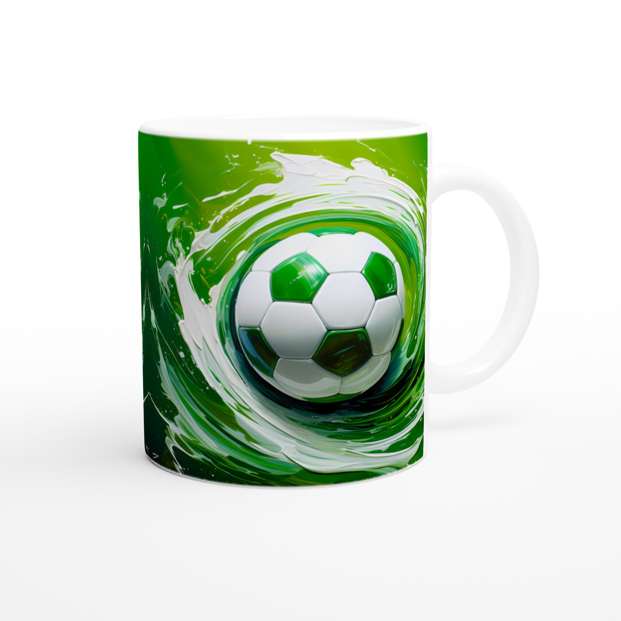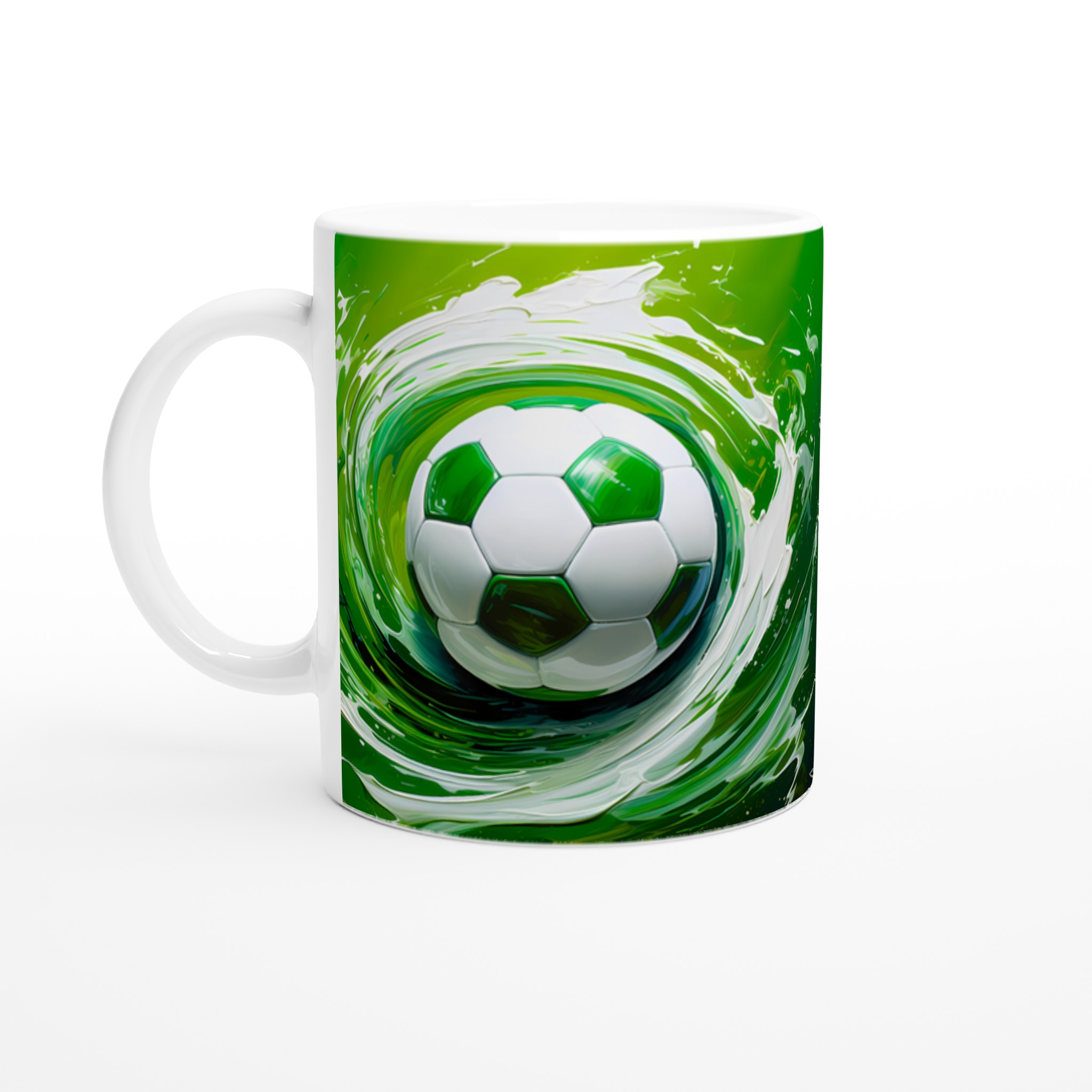 Fånga sportandan varje dag med denna dynamiska keramiska mugg, som blir en given favorit i hemmet eller på kontoret. Perfekt för morgonkaffet, en stärkande kopp te under matchen, eller en kvällsfika efter träningen. Den levande designen, inspirerad av en fotbolls rörelse genom gröna och vita färgstänk, ger en energisk och modern känsla som lyfter fram din passion för sport. Den blanka vita ytan ser till att trycken framhävs med klara och levande färger, som håller sig fina även efter många turer i mikron och diskmaskinen.