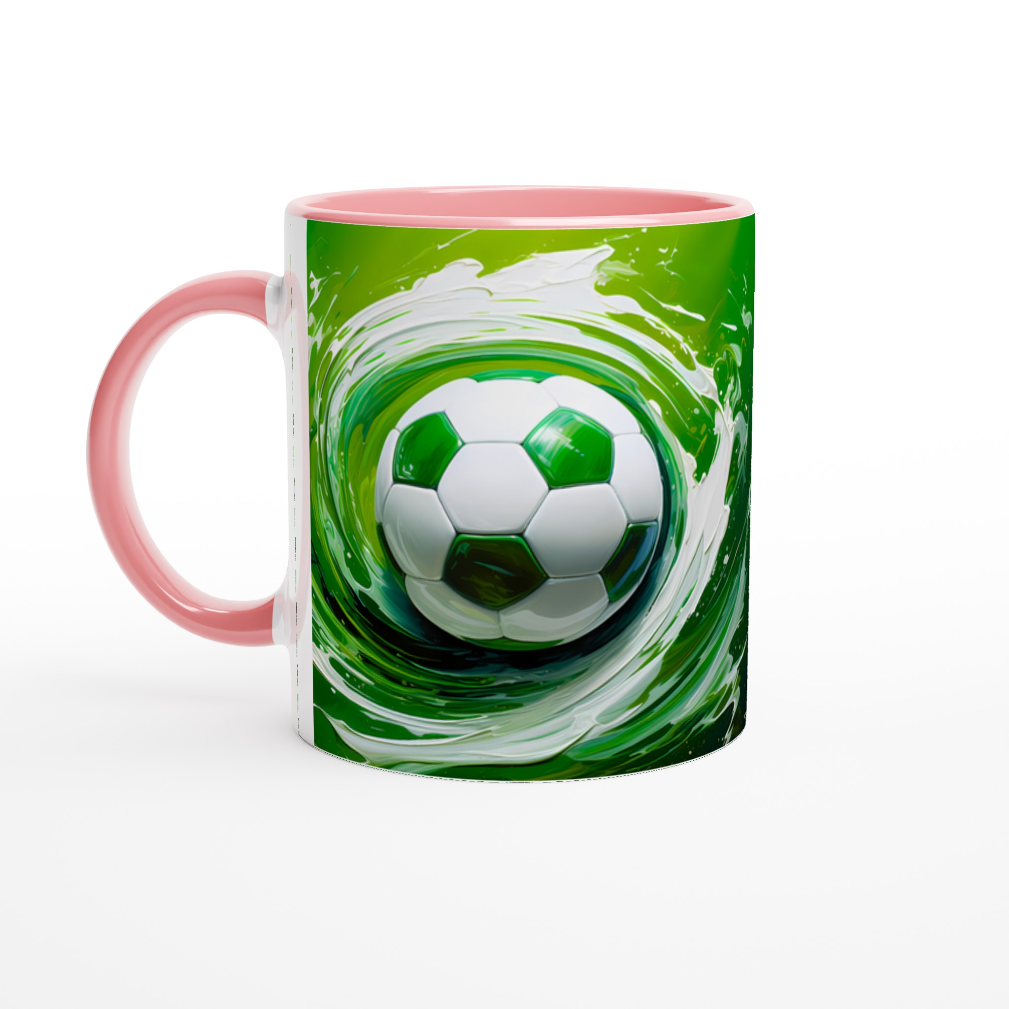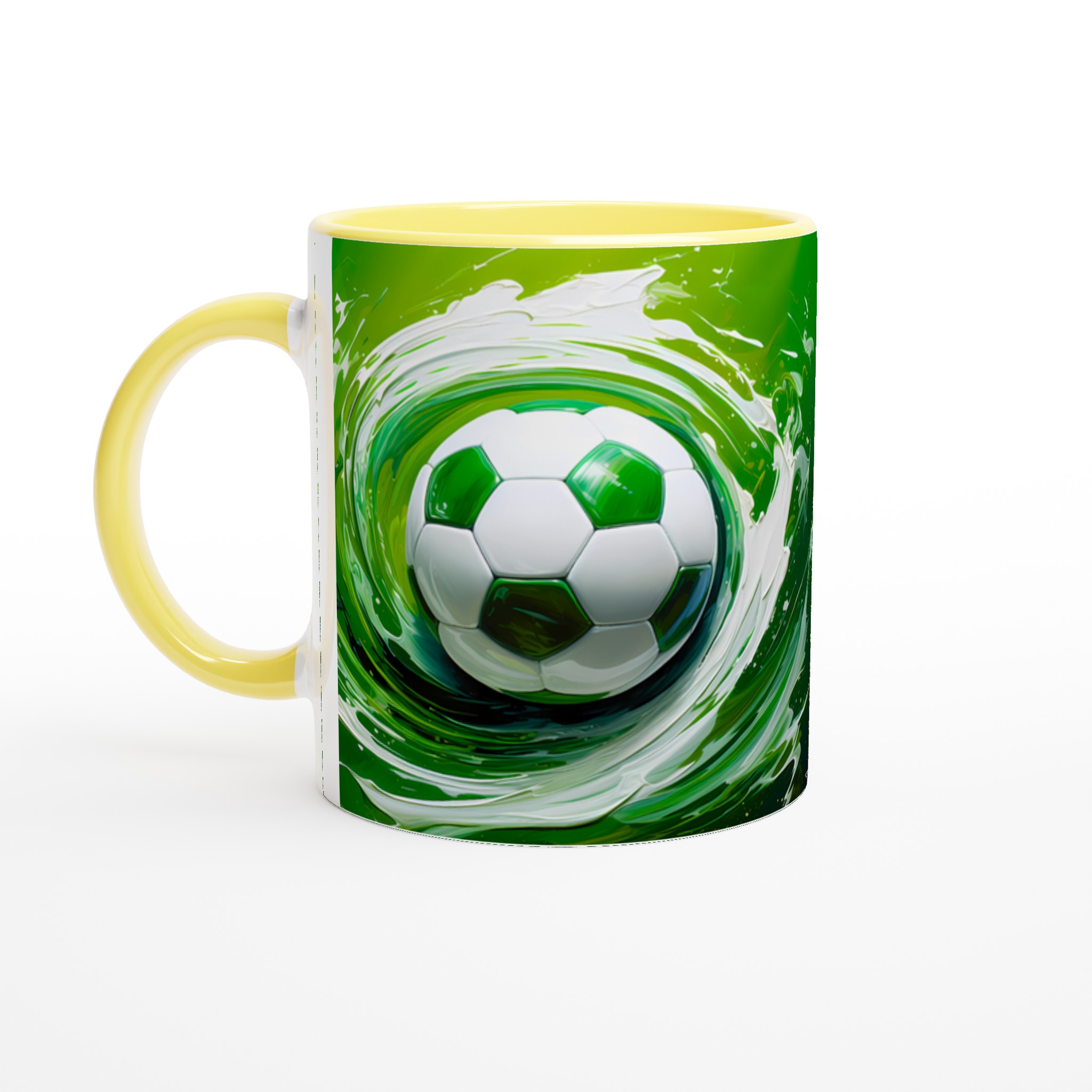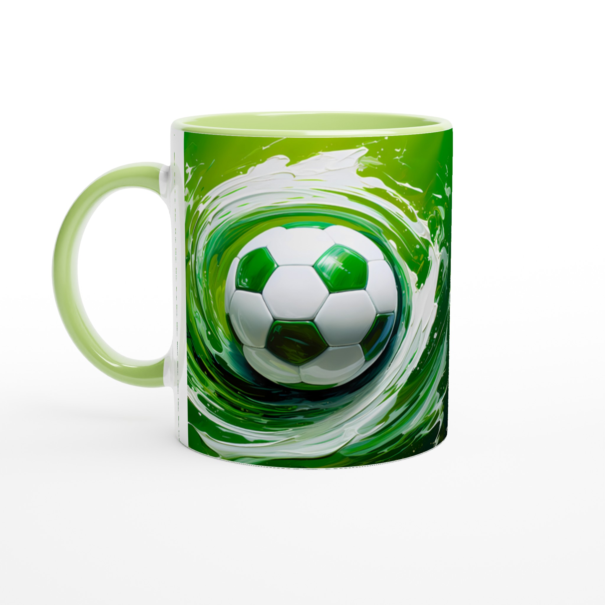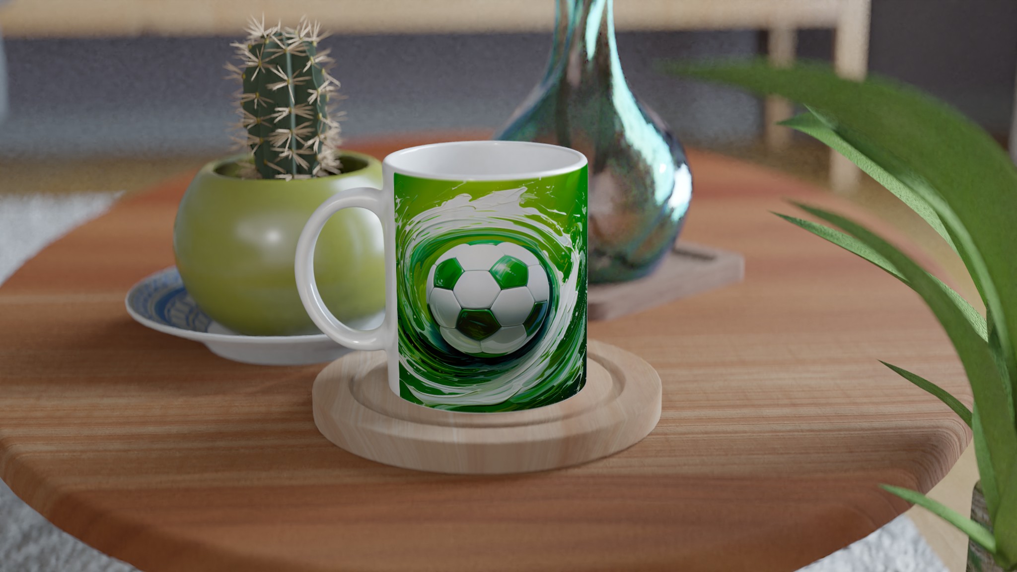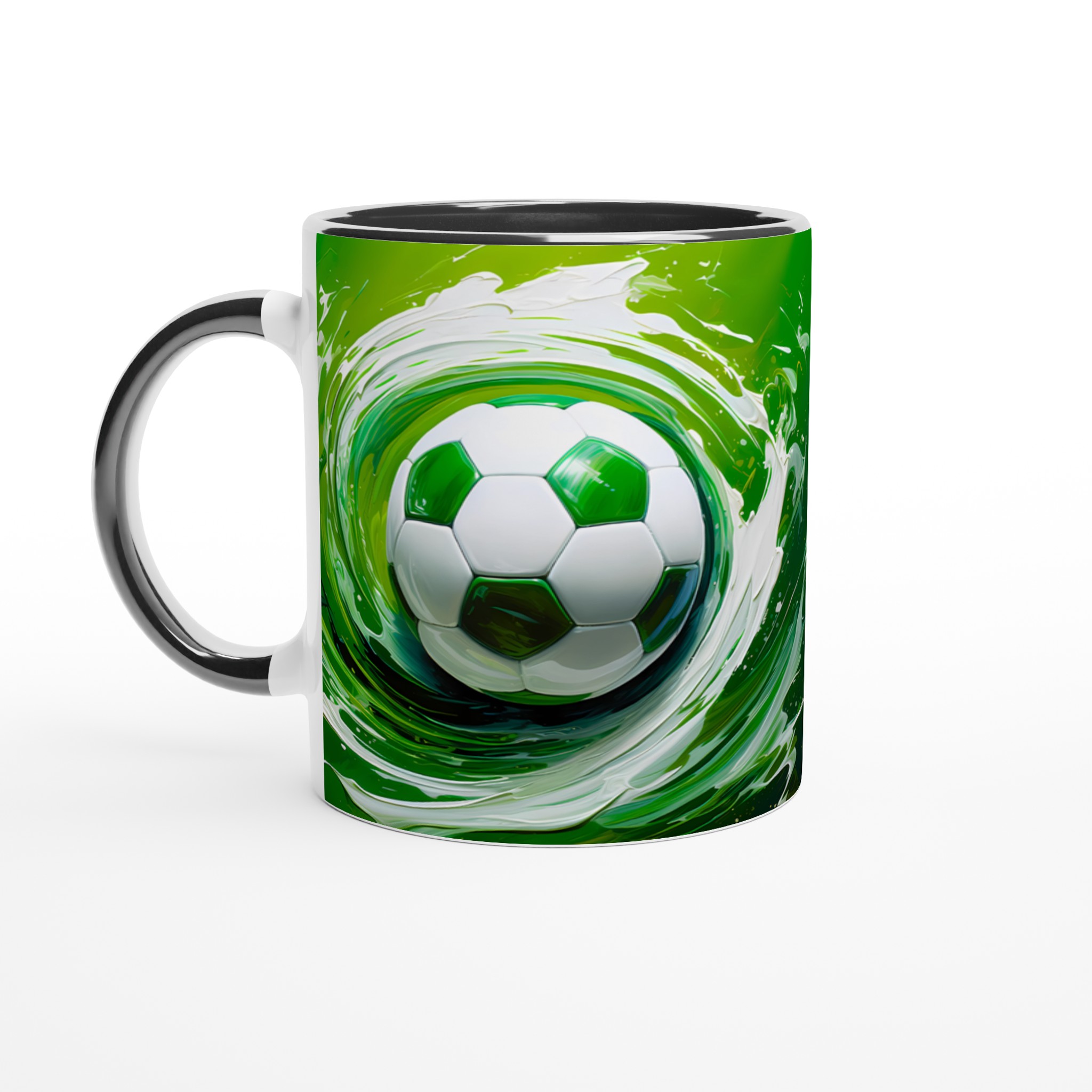 Fånga sportandan varje dag med denna dynamiska keramiska mugg, som blir en given favorit i hemmet eller på kontoret. Perfekt för morgonkaffet, en stärkande kopp te under matchen, eller en kvällsfika efter träningen. Den levande designen, inspirerad av en fotbolls rörelse genom gröna och vita färgstänk, ger en energisk och modern känsla som lyfter fram din passion för sport. Den blanka vita ytan ser till att trycken framhävs med klara och levande färger, som håller sig fina även efter många turer i mikron och diskmaskinen.