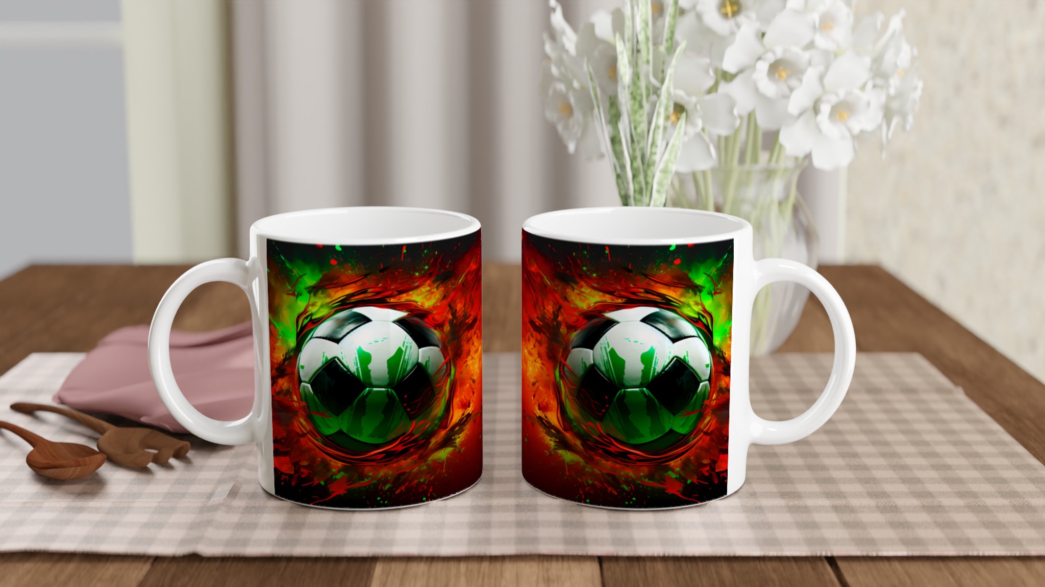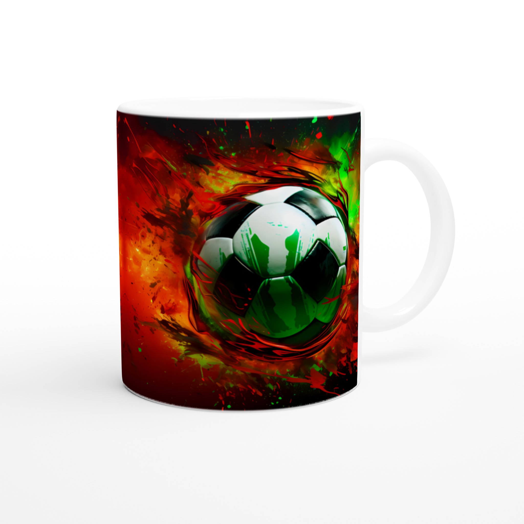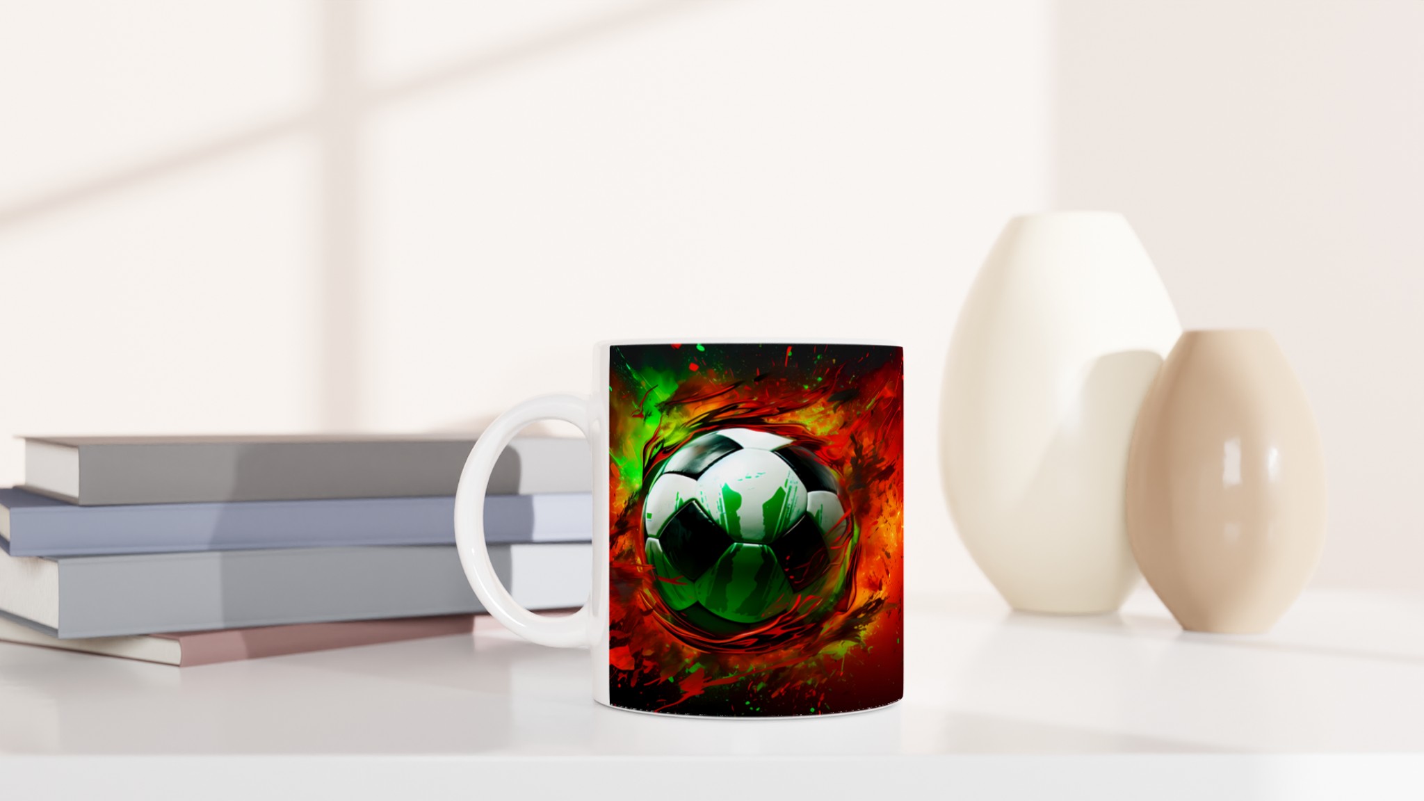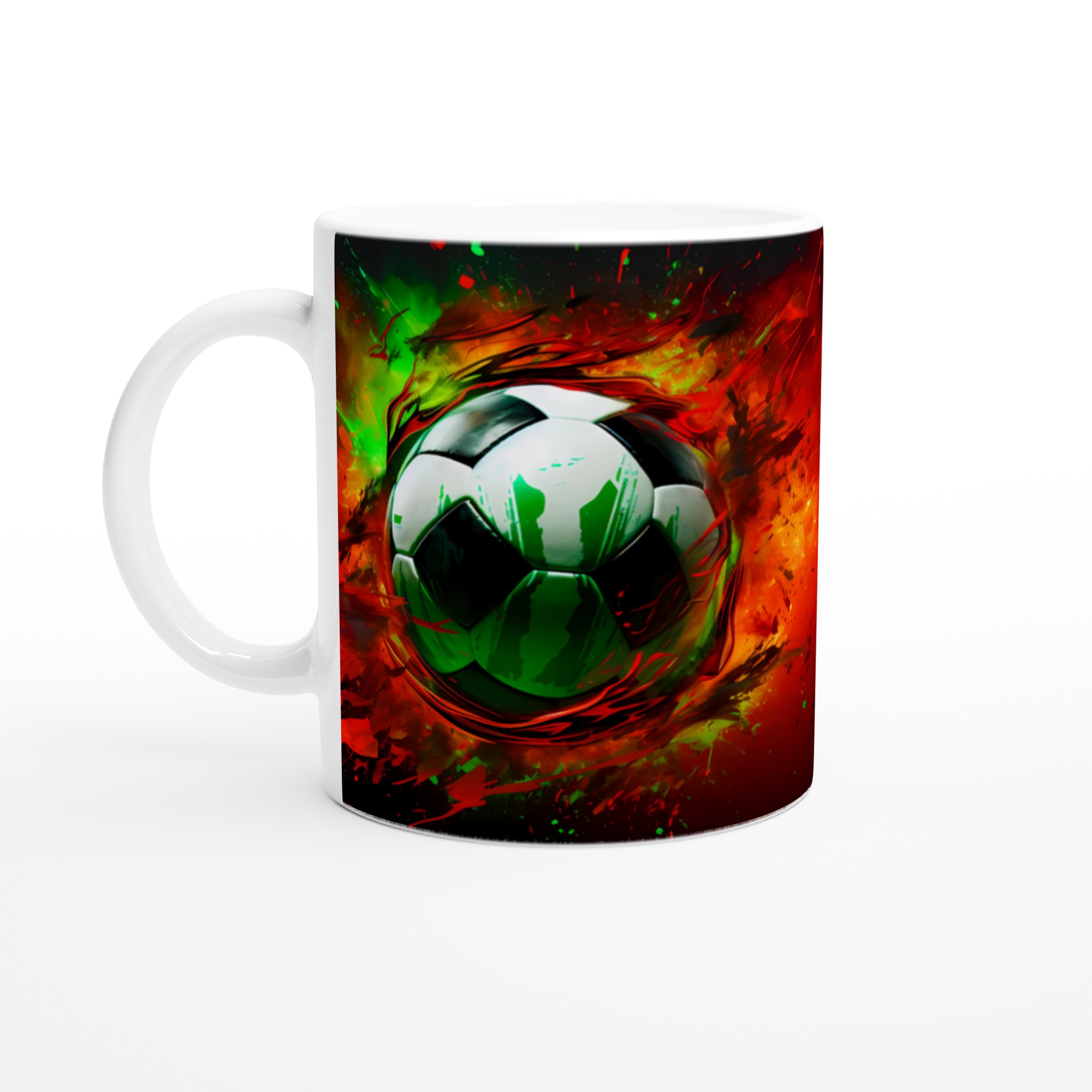 Fånga sportens glöd och fotbollsfeber med varje klunk ur denna dynamiska keramiska mugg. Dess energiska design, inspirerad av fotboll i rörelse, utstrålar en passionerad känsla med levande gröna och röda färgstänk som förmedlar spänningen från planen. Den här stilrena muggen blir snabbt en vardagsfavorit för alla som älskar sport, perfekt för morgonkaffet, kvällens varma choklad eller när du bara vill njuta av en kopp te. Den blanka vita ytan gör att trycken framhävs med klara och levande färger, som håller sig fina även efter många turer i mikron och diskmaskinen.