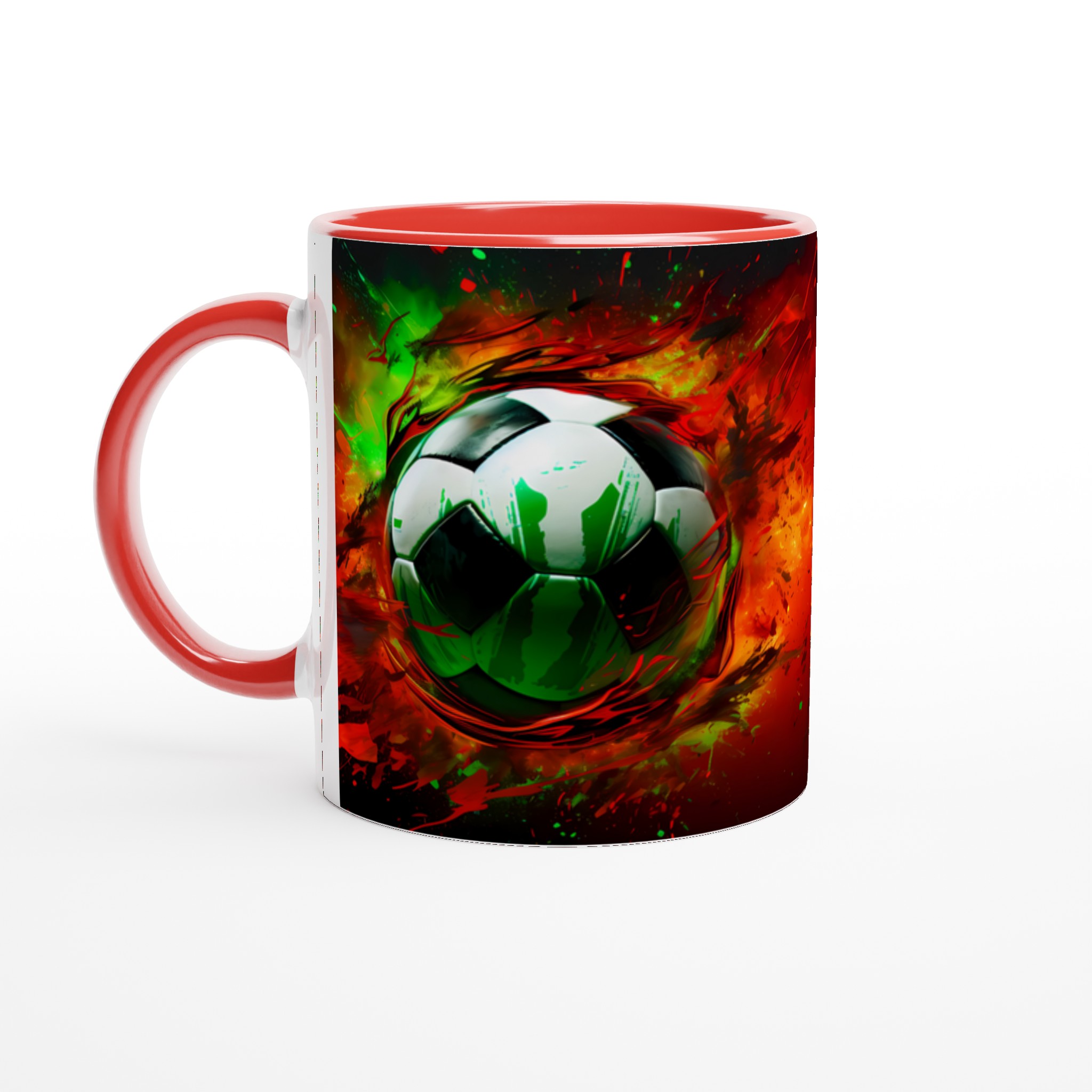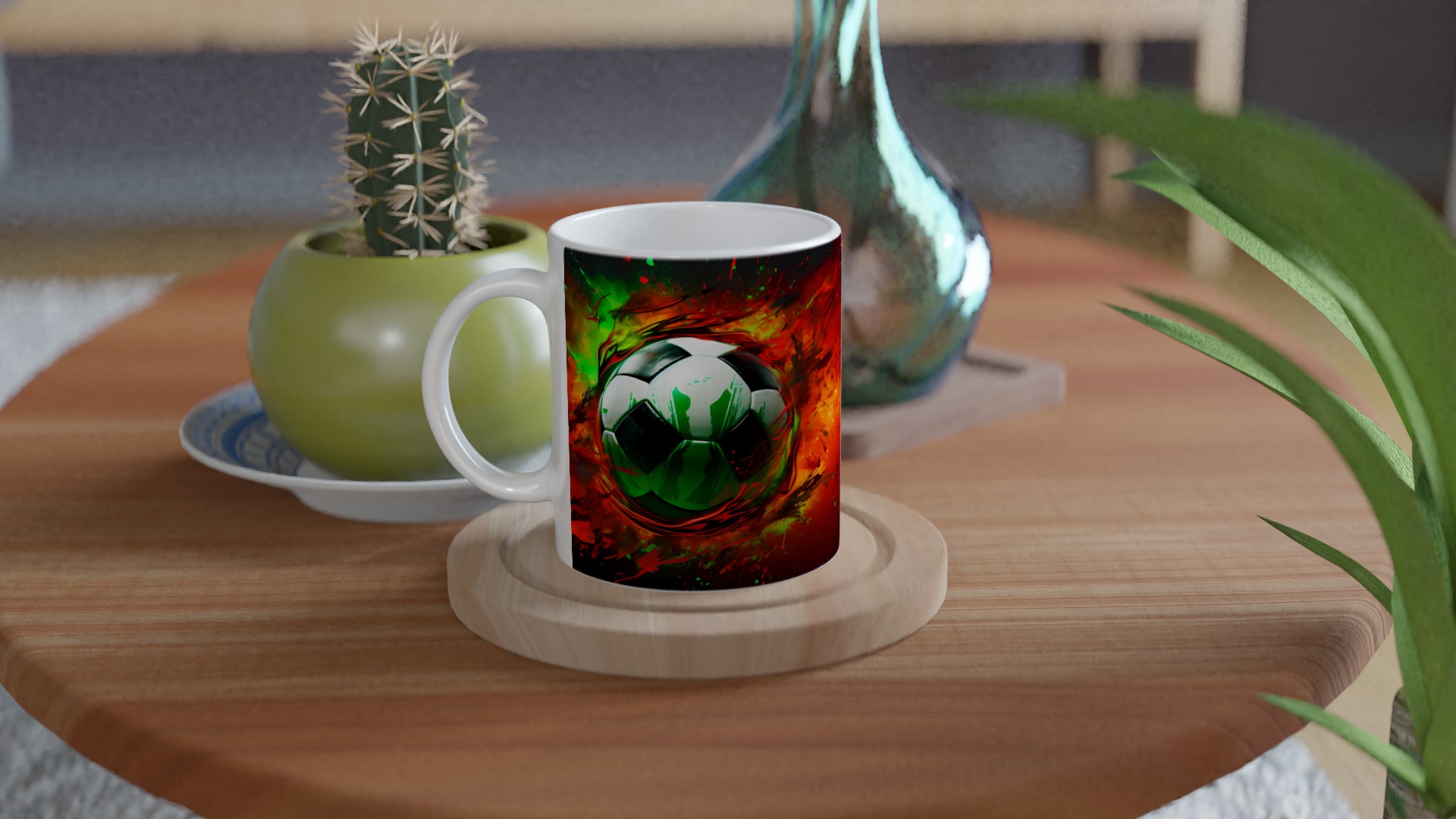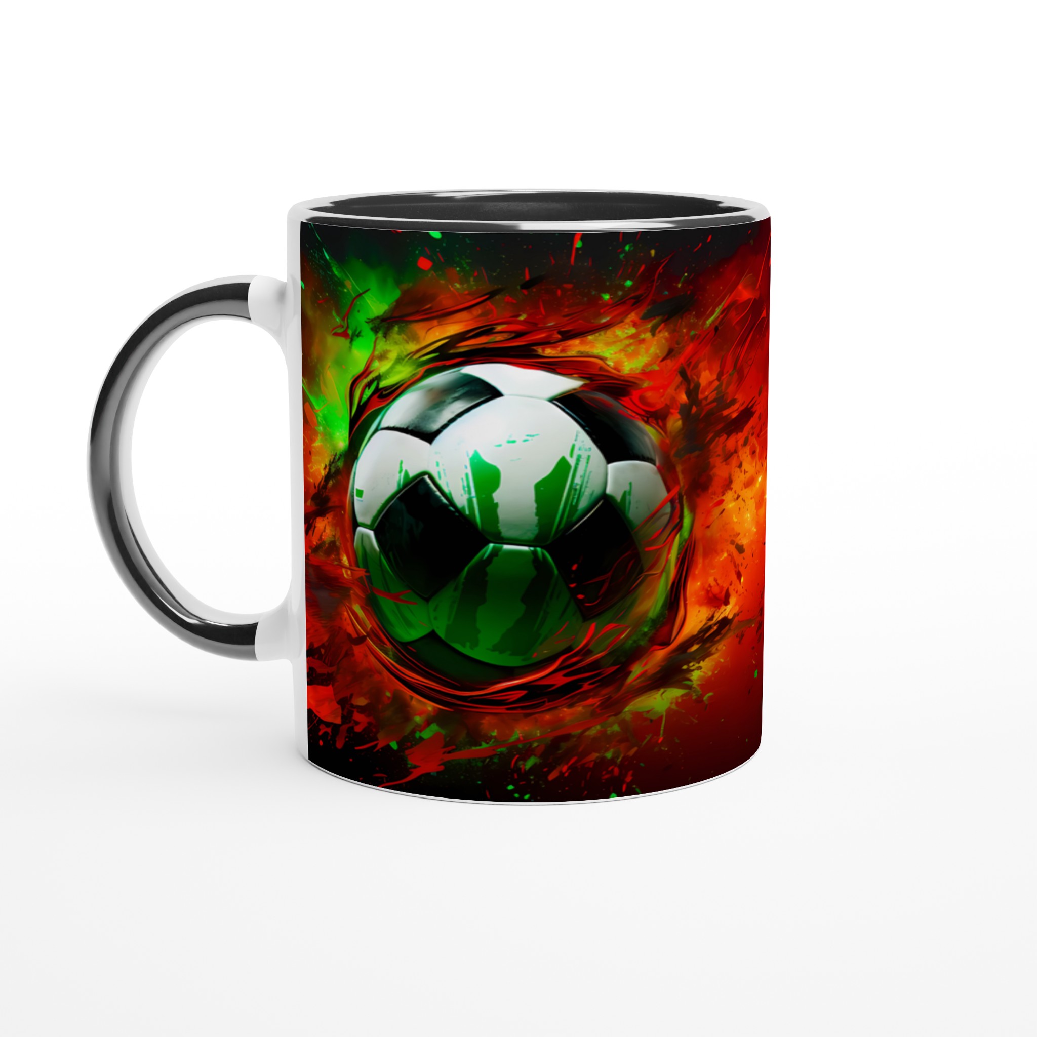 Fånga sportens glöd och fotbollsfeber med varje klunk ur denna dynamiska keramiska mugg. Dess energiska design, inspirerad av fotboll i rörelse, utstrålar en passionerad känsla med levande gröna och röda färgstänk som förmedlar spänningen från planen. Den här stilrena muggen blir snabbt en vardagsfavorit för alla som älskar sport, perfekt för morgonkaffet, kvällens varma choklad eller när du bara vill njuta av en kopp te. Den blanka vita ytan gör att trycken framhävs med klara och levande färger, som håller sig fina även efter många turer i mikron och diskmaskinen.