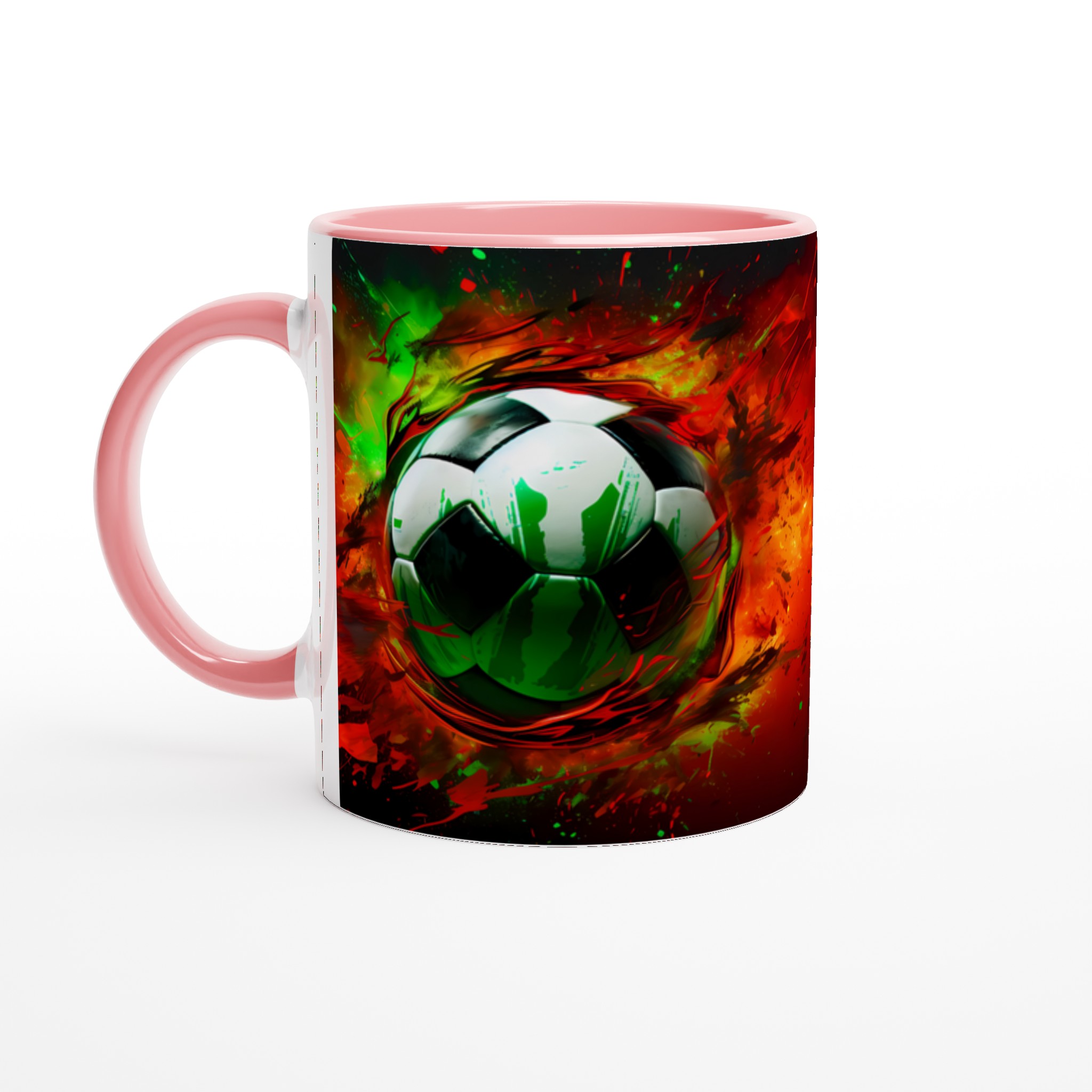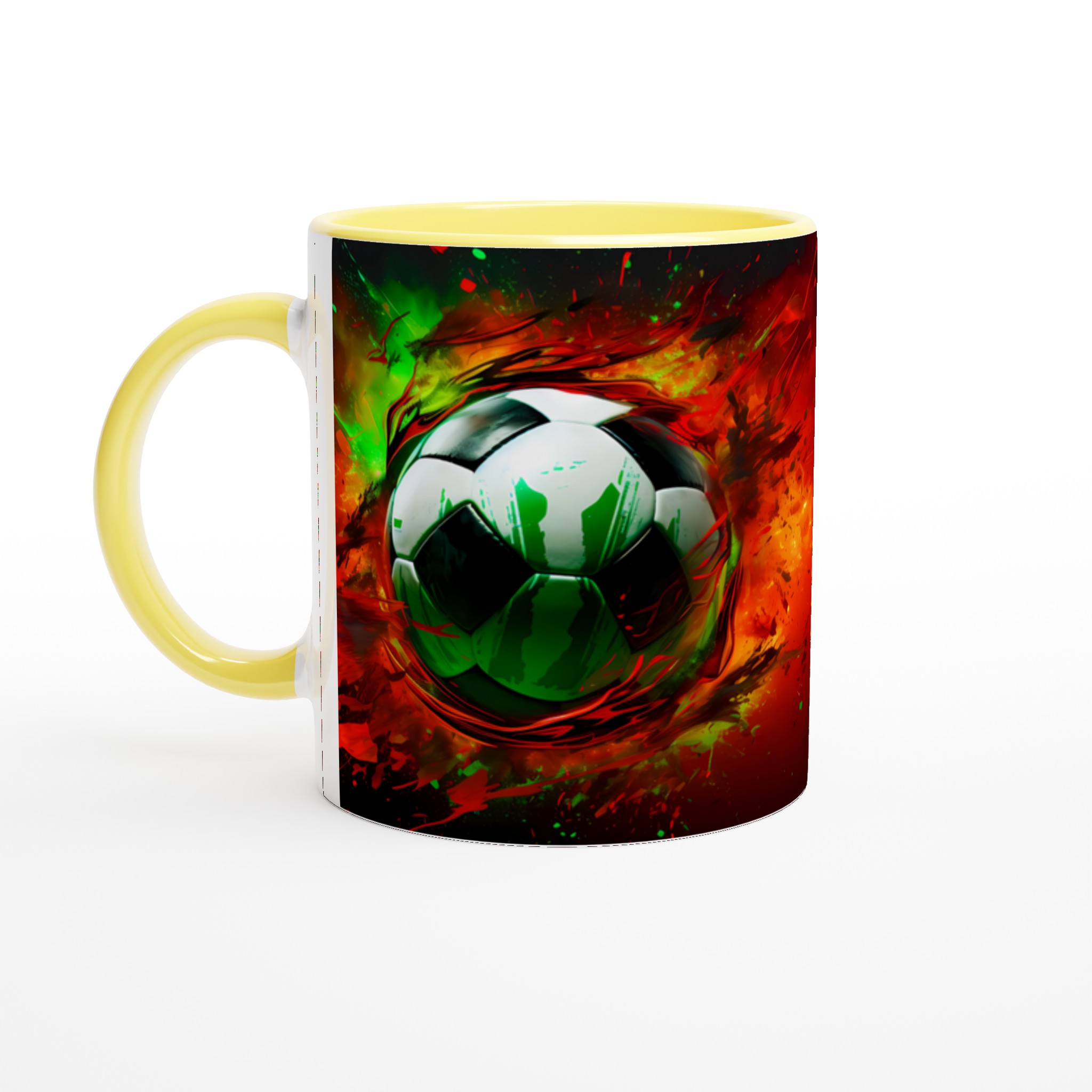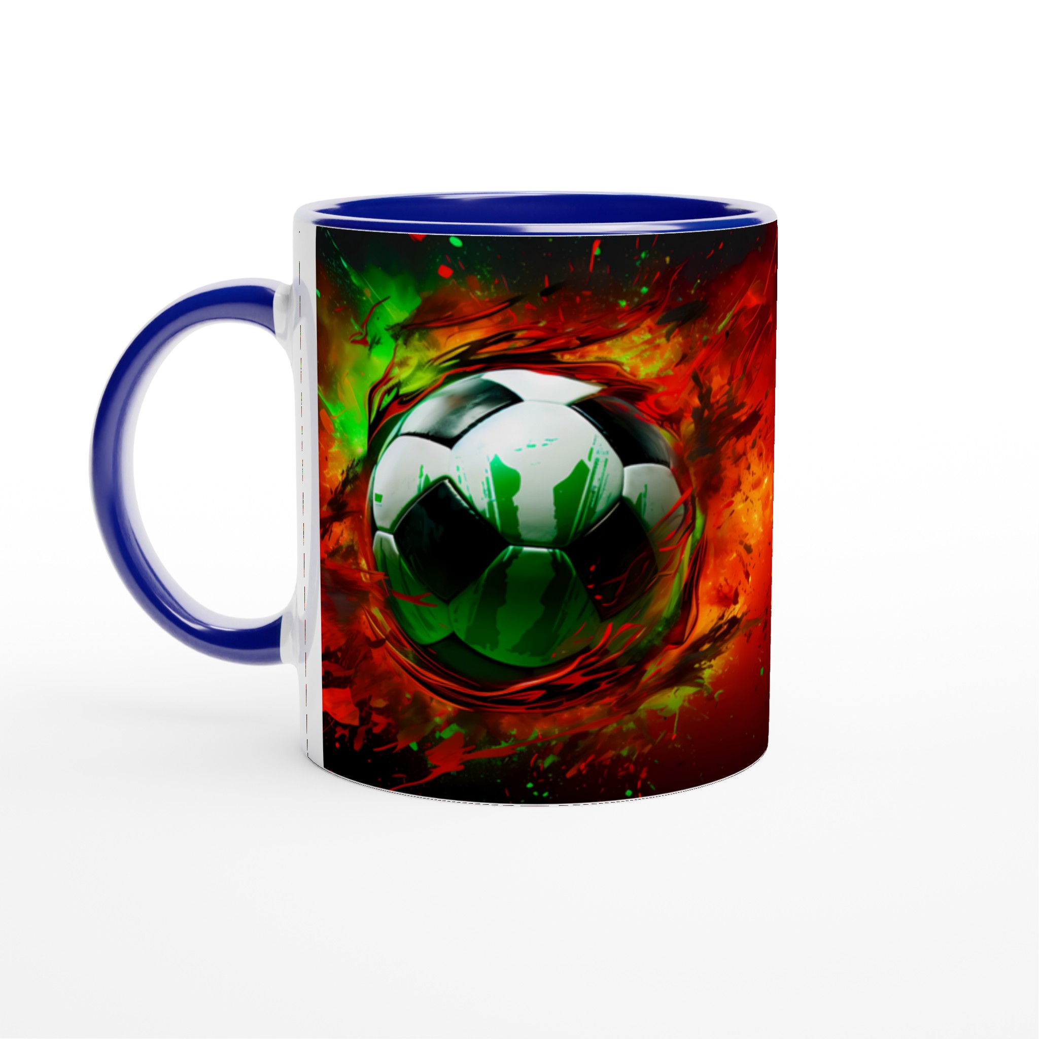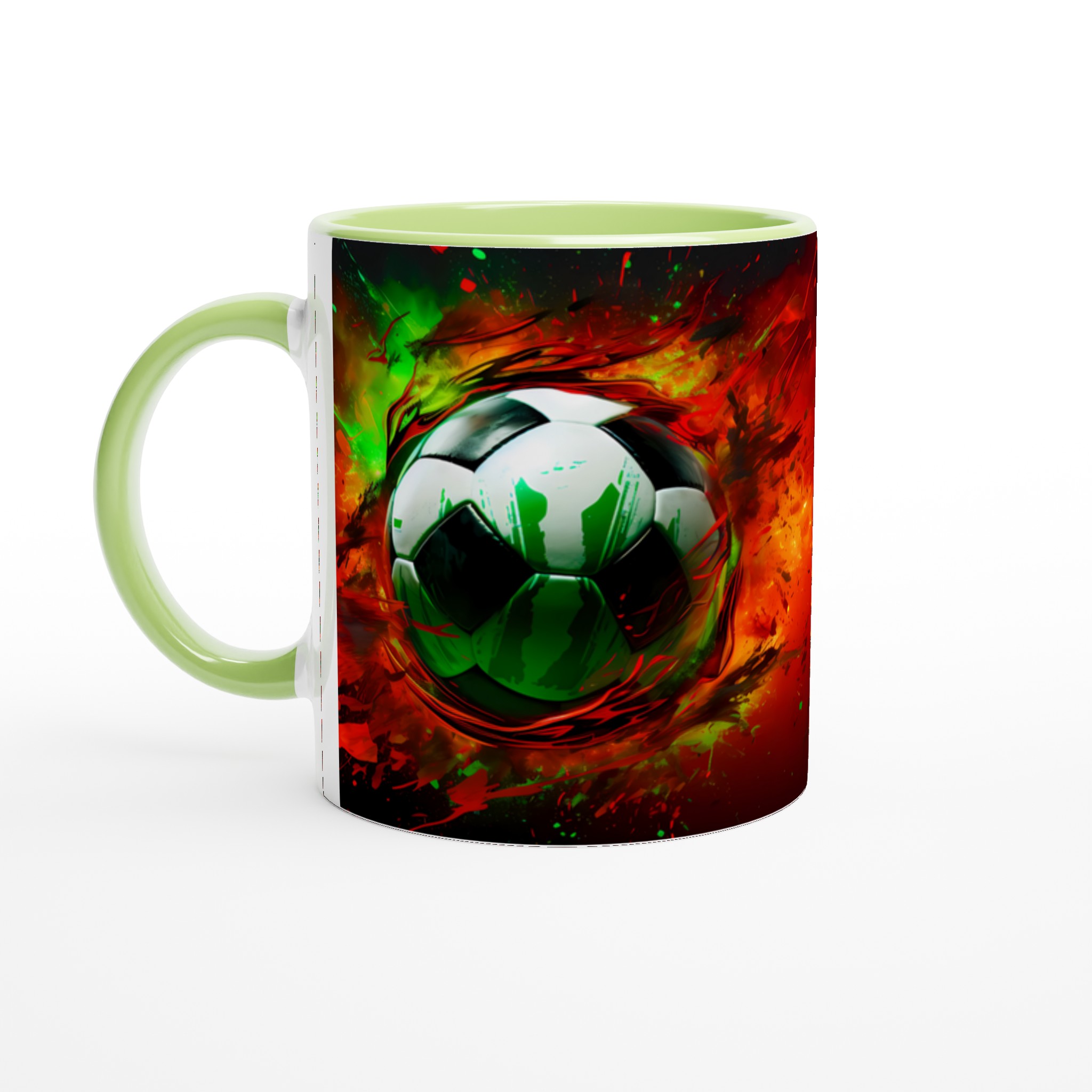 Fånga sportens glöd och fotbollsfeber med varje klunk ur denna dynamiska keramiska mugg. Dess energiska design, inspirerad av fotboll i rörelse, utstrålar en passionerad känsla med levande gröna och röda färgstänk som förmedlar spänningen från planen. Den här stilrena muggen blir snabbt en vardagsfavorit för alla som älskar sport, perfekt för morgonkaffet, kvällens varma choklad eller när du bara vill njuta av en kopp te. Den blanka vita ytan gör att trycken framhävs med klara och levande färger, som håller sig fina även efter många turer i mikron och diskmaskinen.