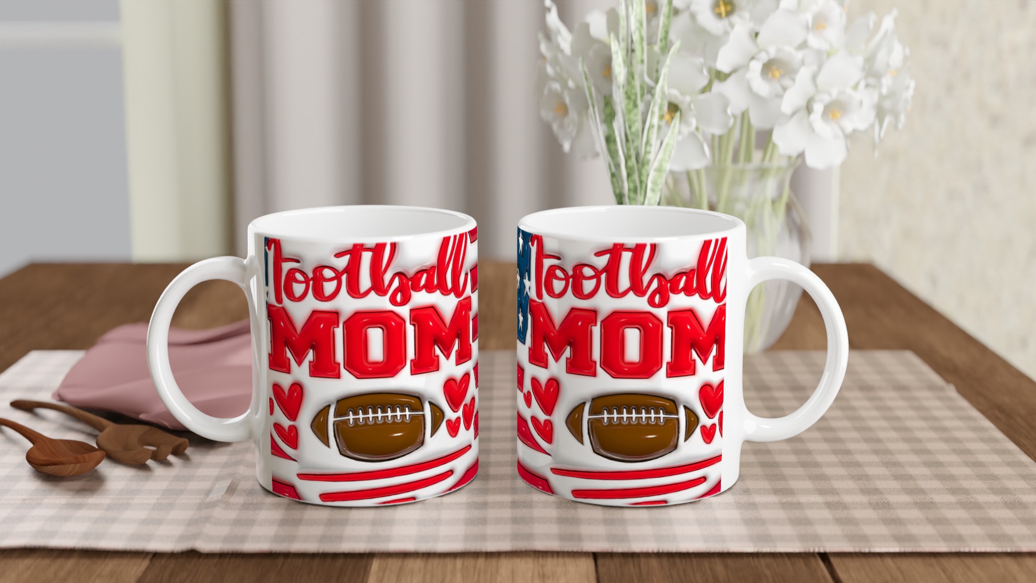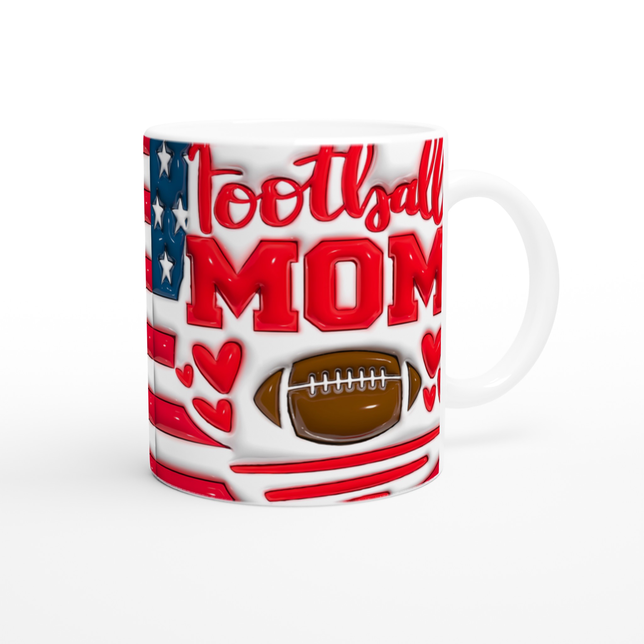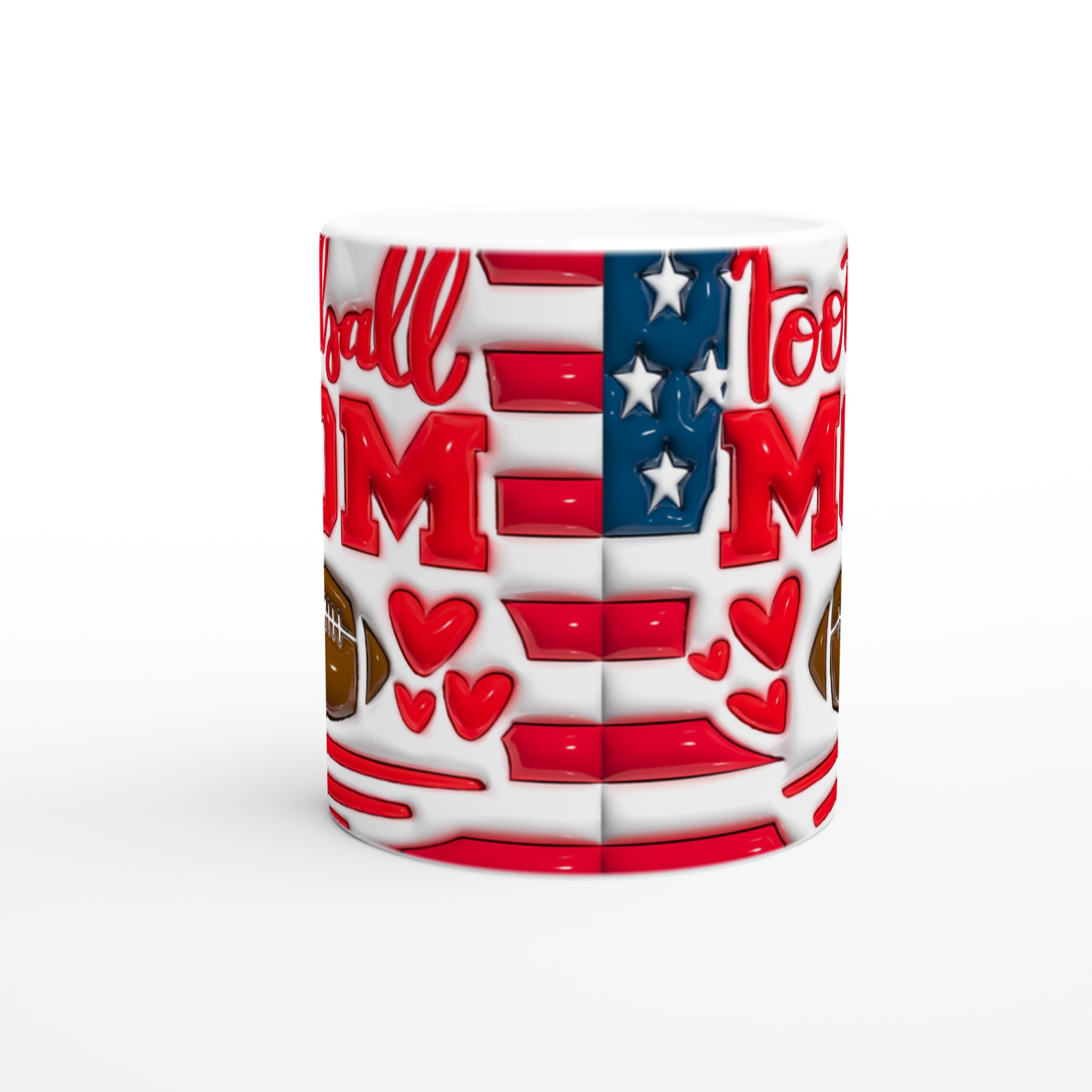 Visa din fotbollsstolthet med den här levande keramiska muggen! Perfekt för varje dedikerad fotbollsmamma som vill starta dagen med en energisk touch eller varva ner med en varm dryck efter en intensiv match. Designen, som pryds av ”Football MOM” i djärva, glansiga röda bokstäver mot en bakgrund av stjärnor och ränder, fångar essensen av amerikansk fotbollsanda. Den blanka vita ytan låter dessa patriotiska färger och det lekfulla fotbollsmotivet verkligen poppa, och de behåller sin lyster även efter otaliga användningar och diskningar.