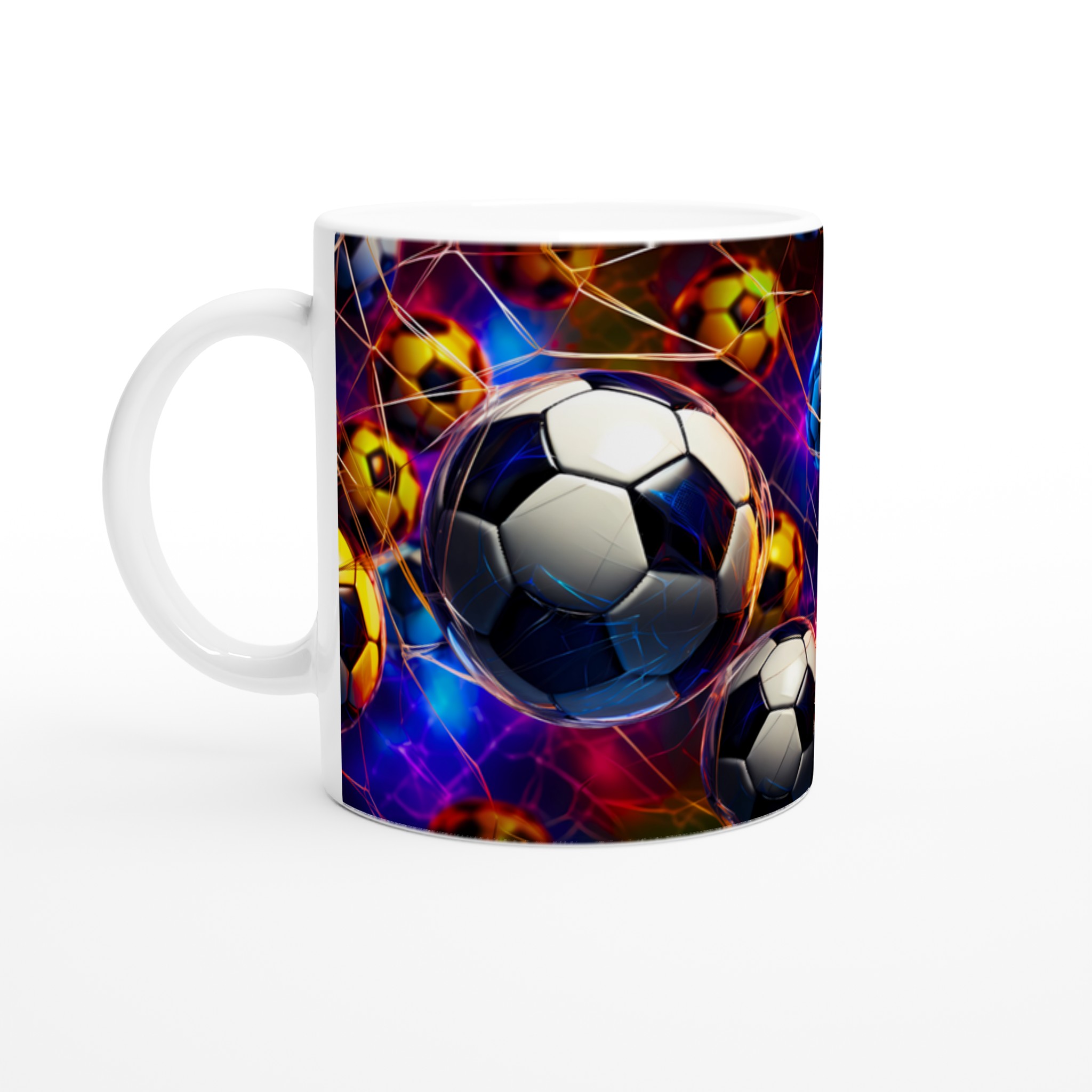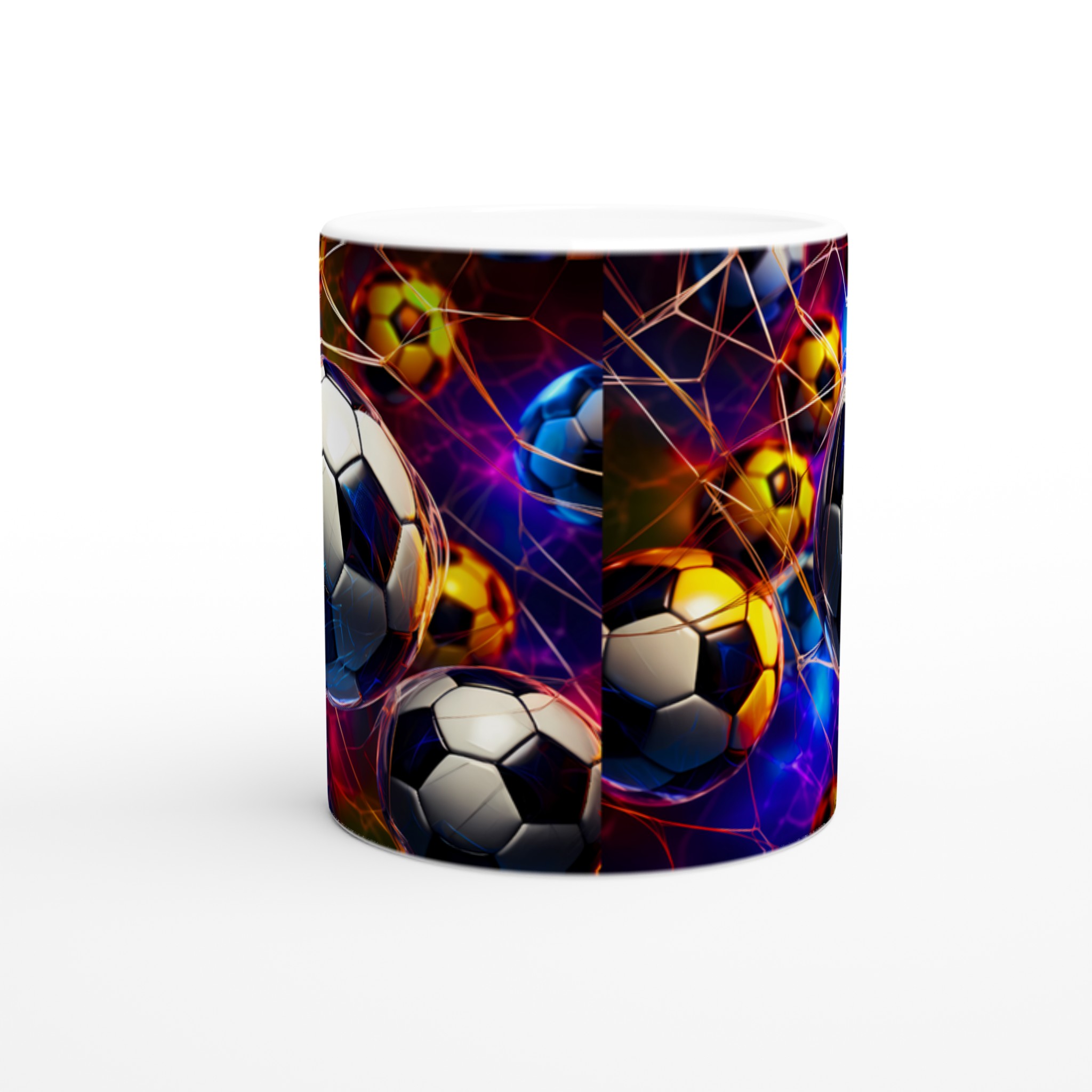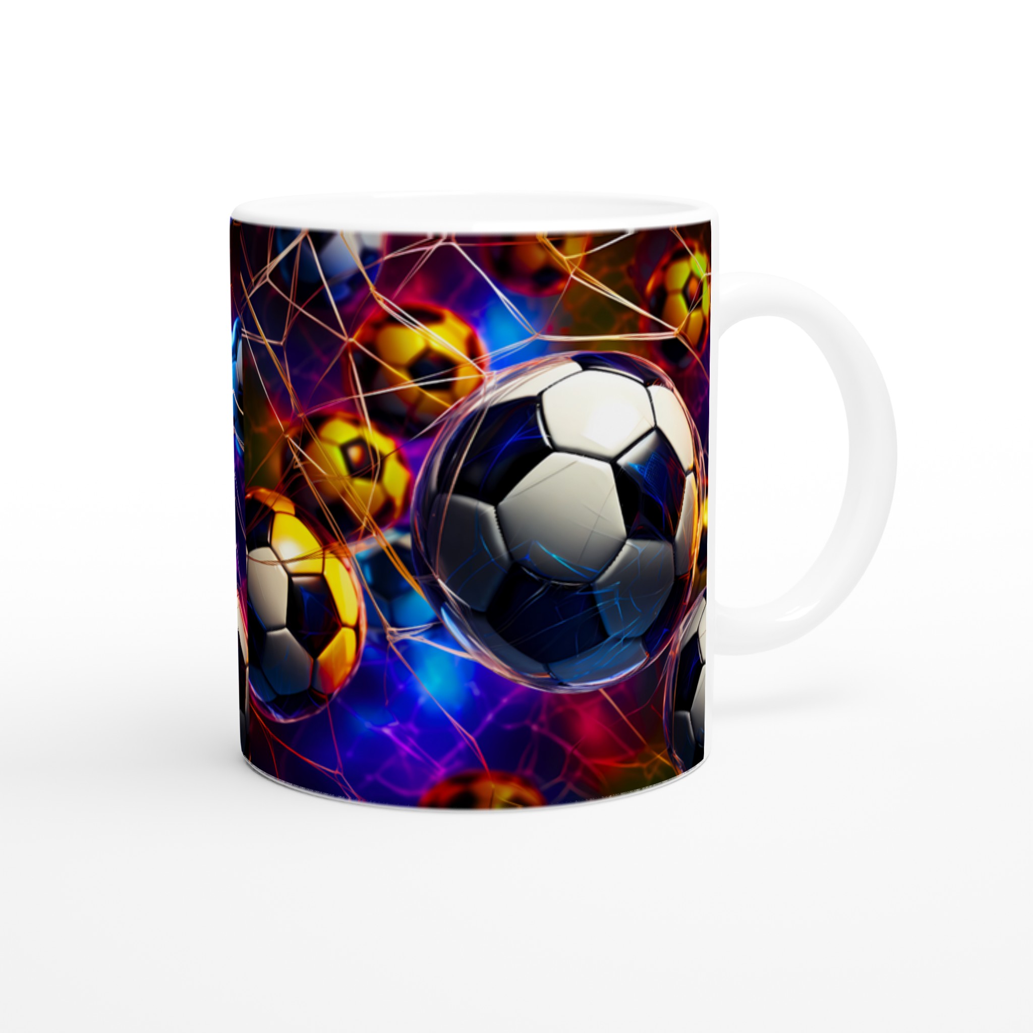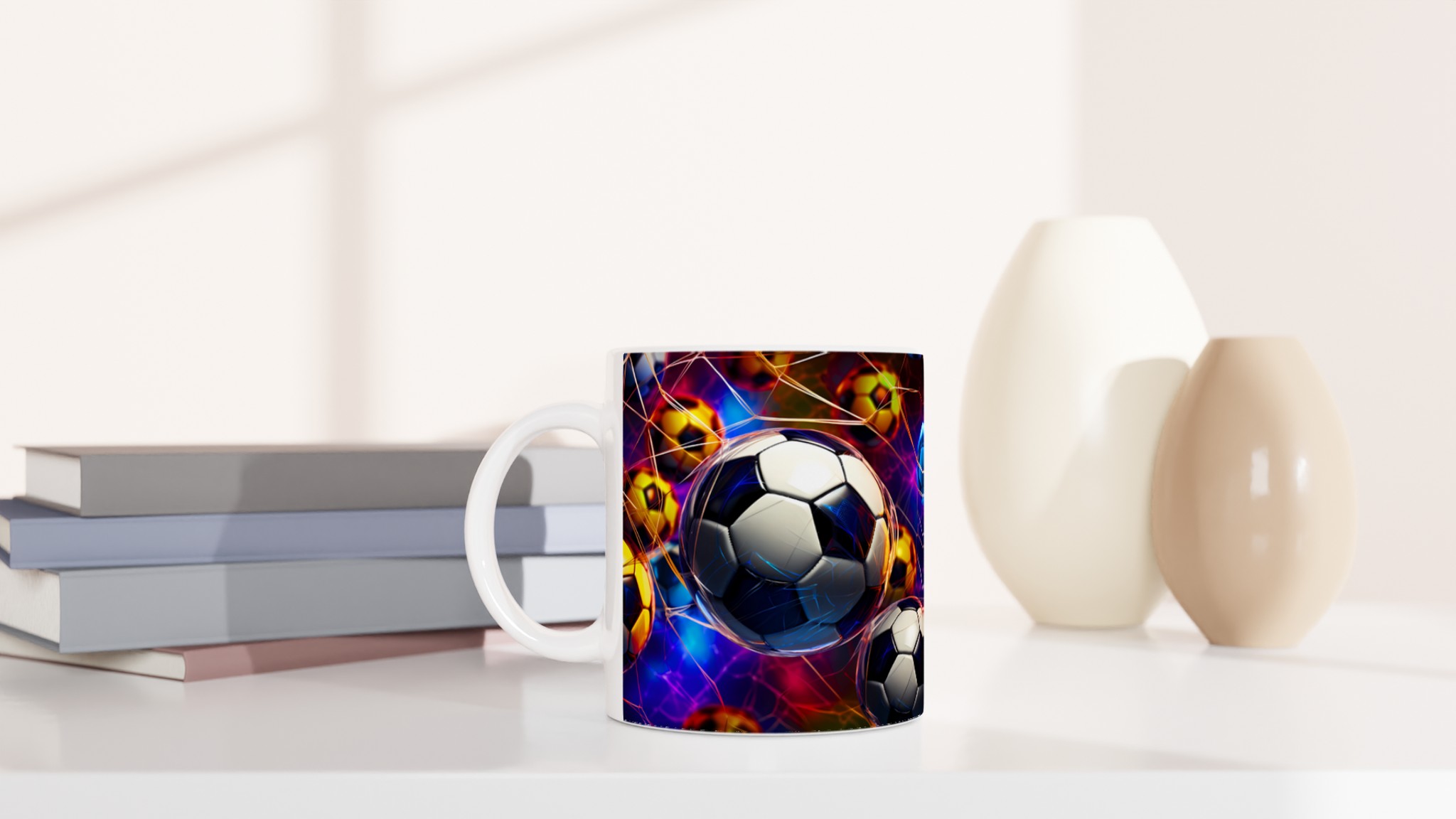 Lyft din kaffe- eller teupplevelse till nästa nivå med vår Keramiska Fotbollsmugg, en sann vardagsfavorit för alla fotbollsfans och den perfekta presenten. Den här muggen är designad med en dynamisk och pulserande bild av fotbollar i ett neonupplyst nät, som fångar spänningen och energin från spelet. De klara, levande färgerna kommer garanterat att sticka ut och bibehålla sin lyster, även efter otaliga omgångar i mikron och diskmaskinen.