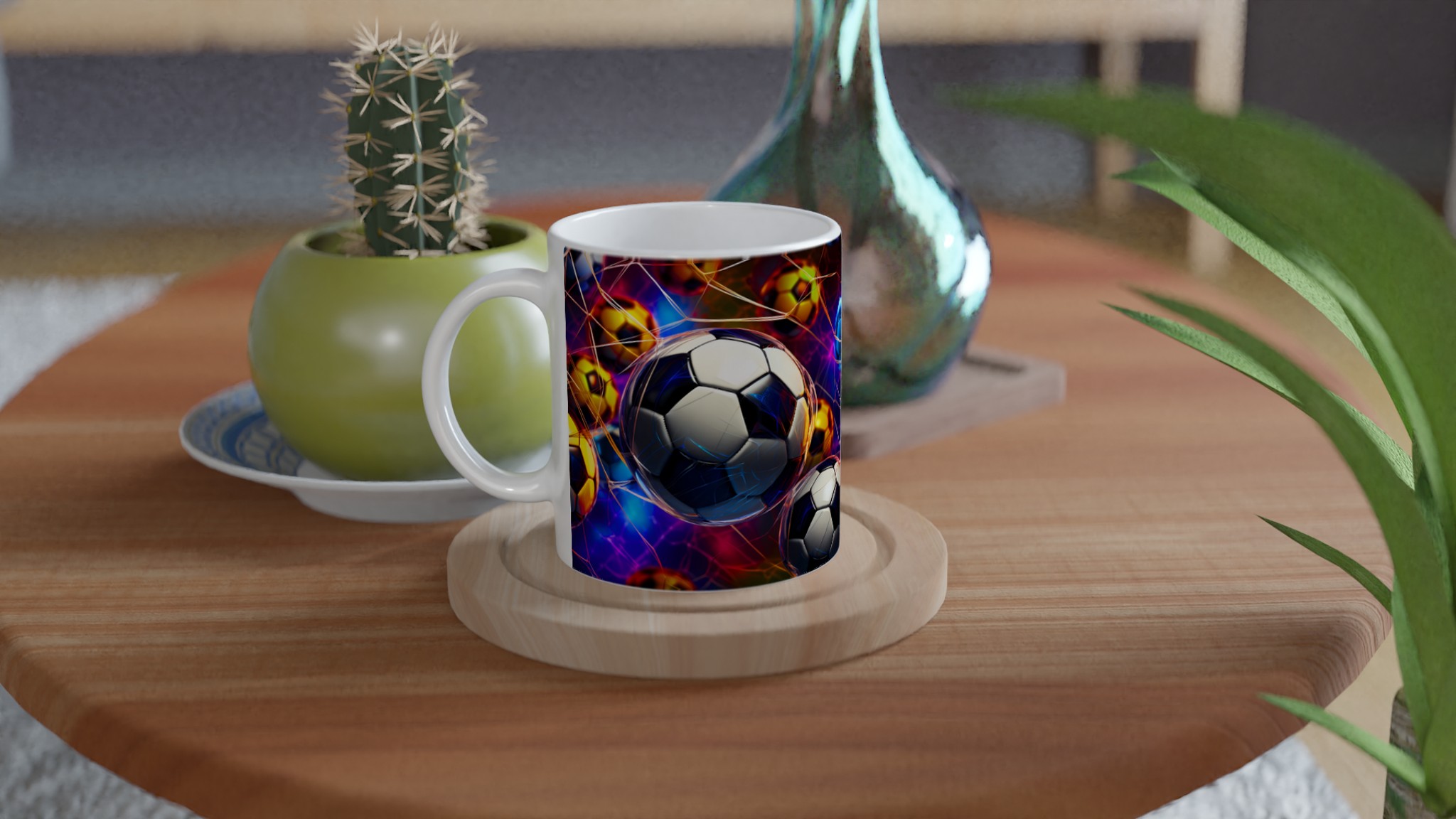 Klassisk keramikmugg, 11 oz, med en dynamisk fotbollsdesign