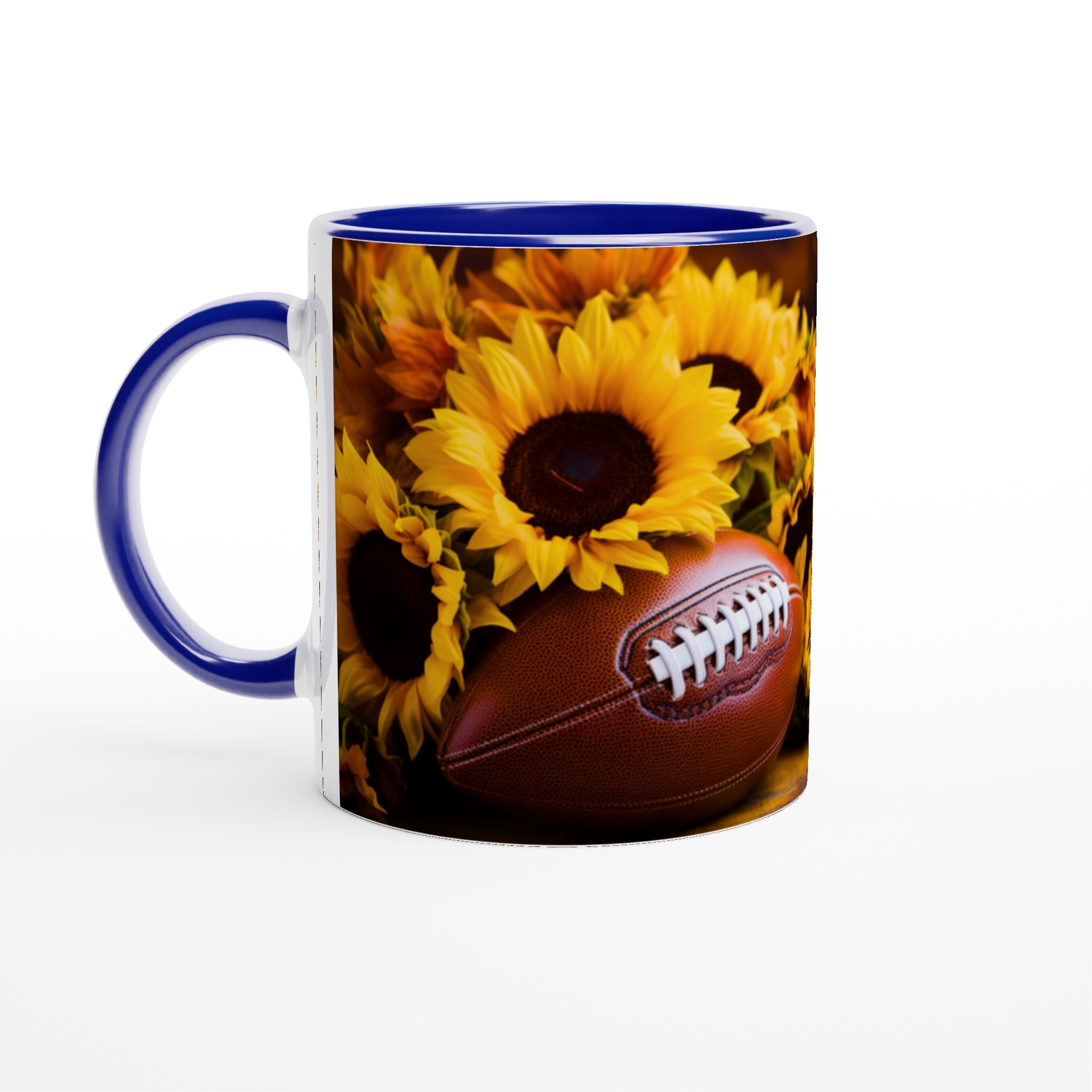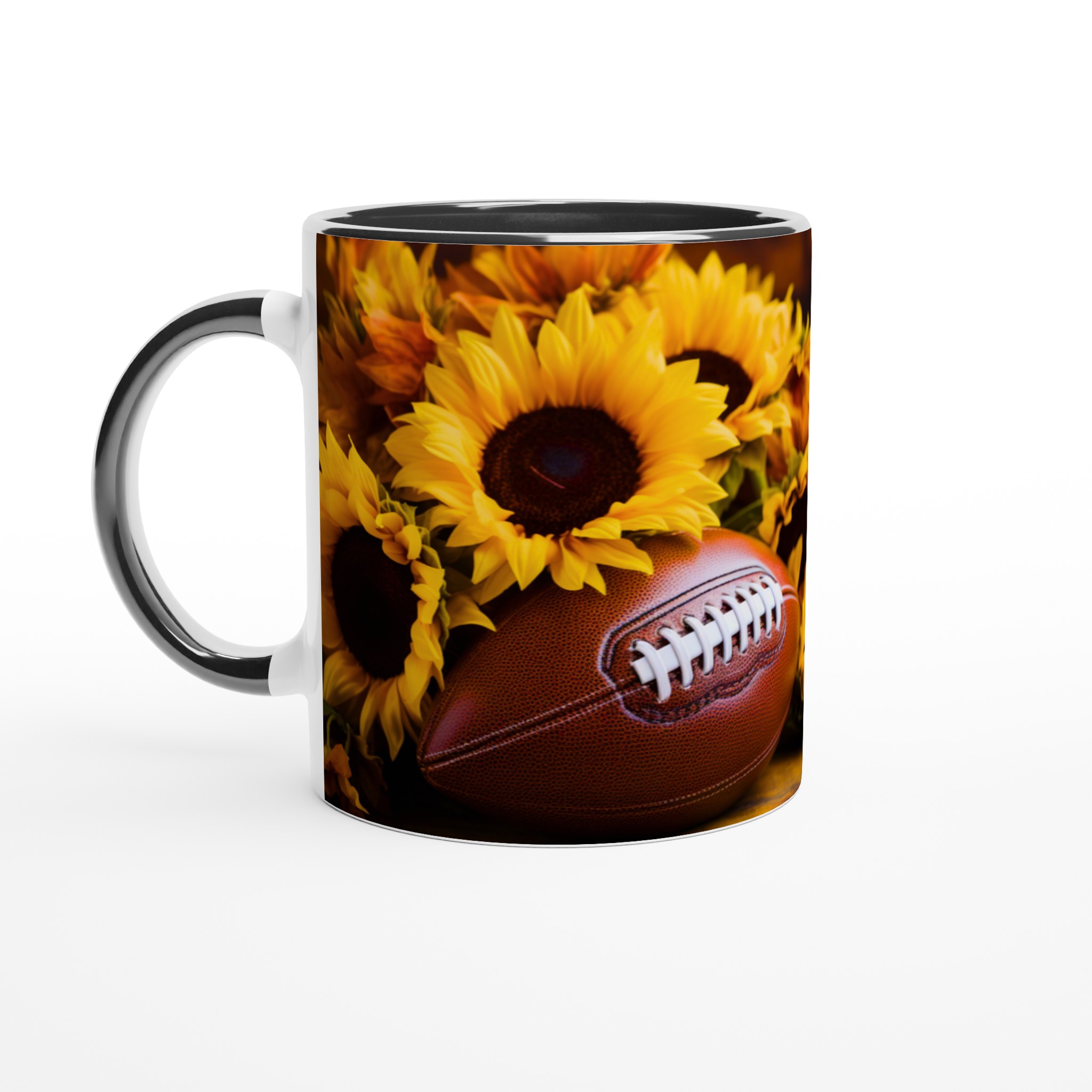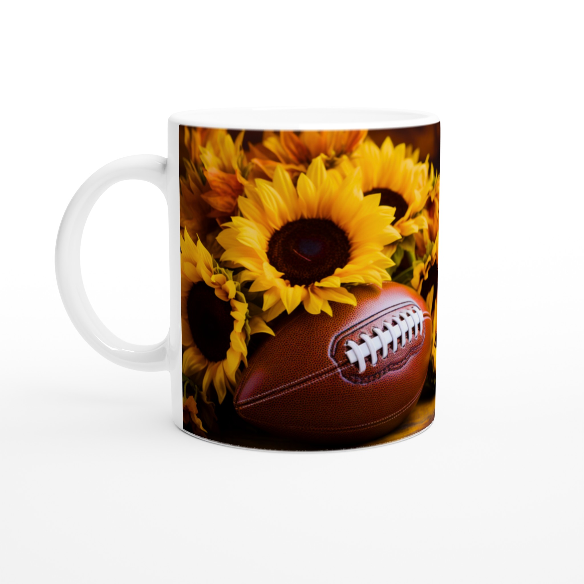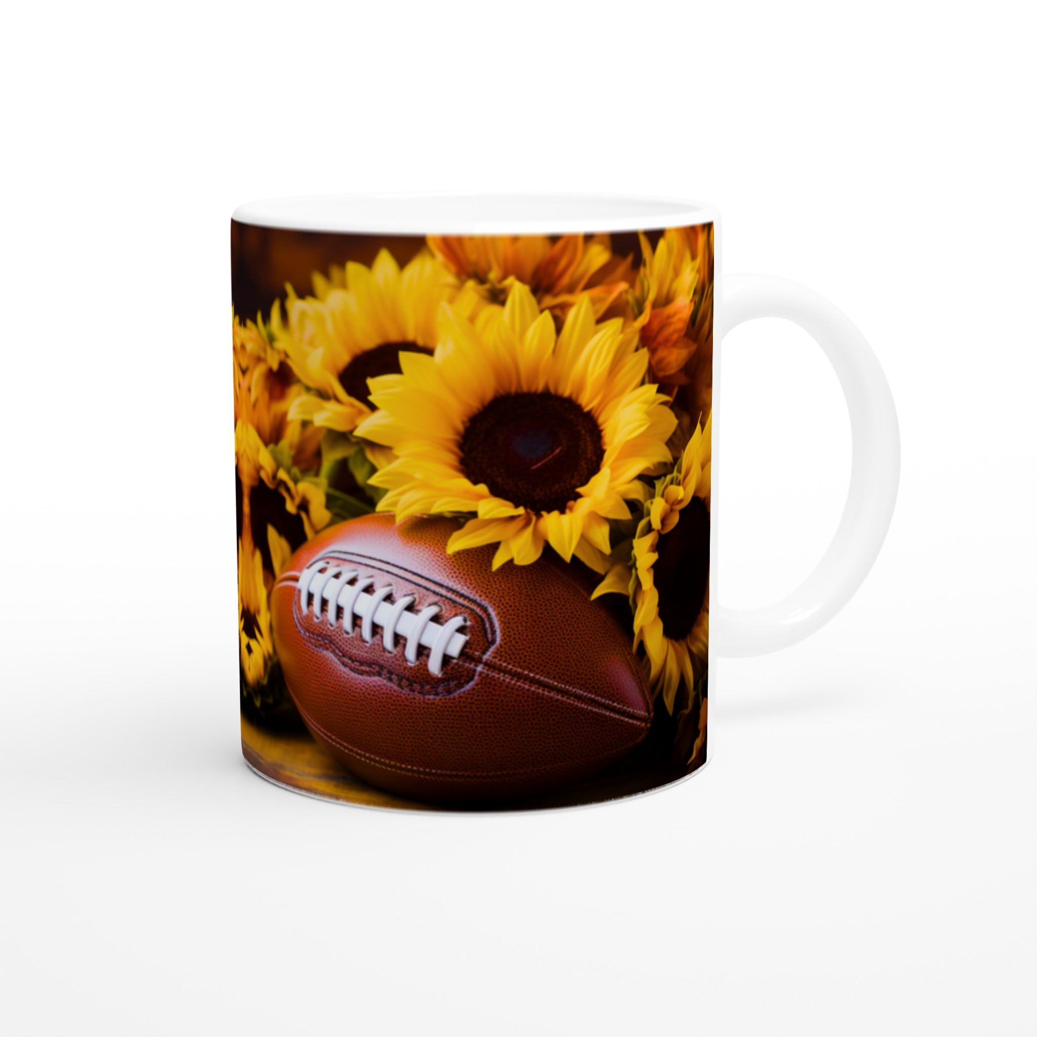 Fånga den härliga höststämningen och spänningen inför matchdagen med denna charmiga keramiska mugg, perfekt för varje fotbollsentusiast och älskare av varma drycker. Med sitt levande motiv av en amerikansk fotboll omgiven av strålande solrosor, för den med sig en känsla av glädje, gemenskap och passion direkt till ditt köksbord. Denna mugg är inte bara en behållare för din favoritdryck – den är en hyllning till de gyllene bladen, den krispiga luften och de oförglömliga matcherna.