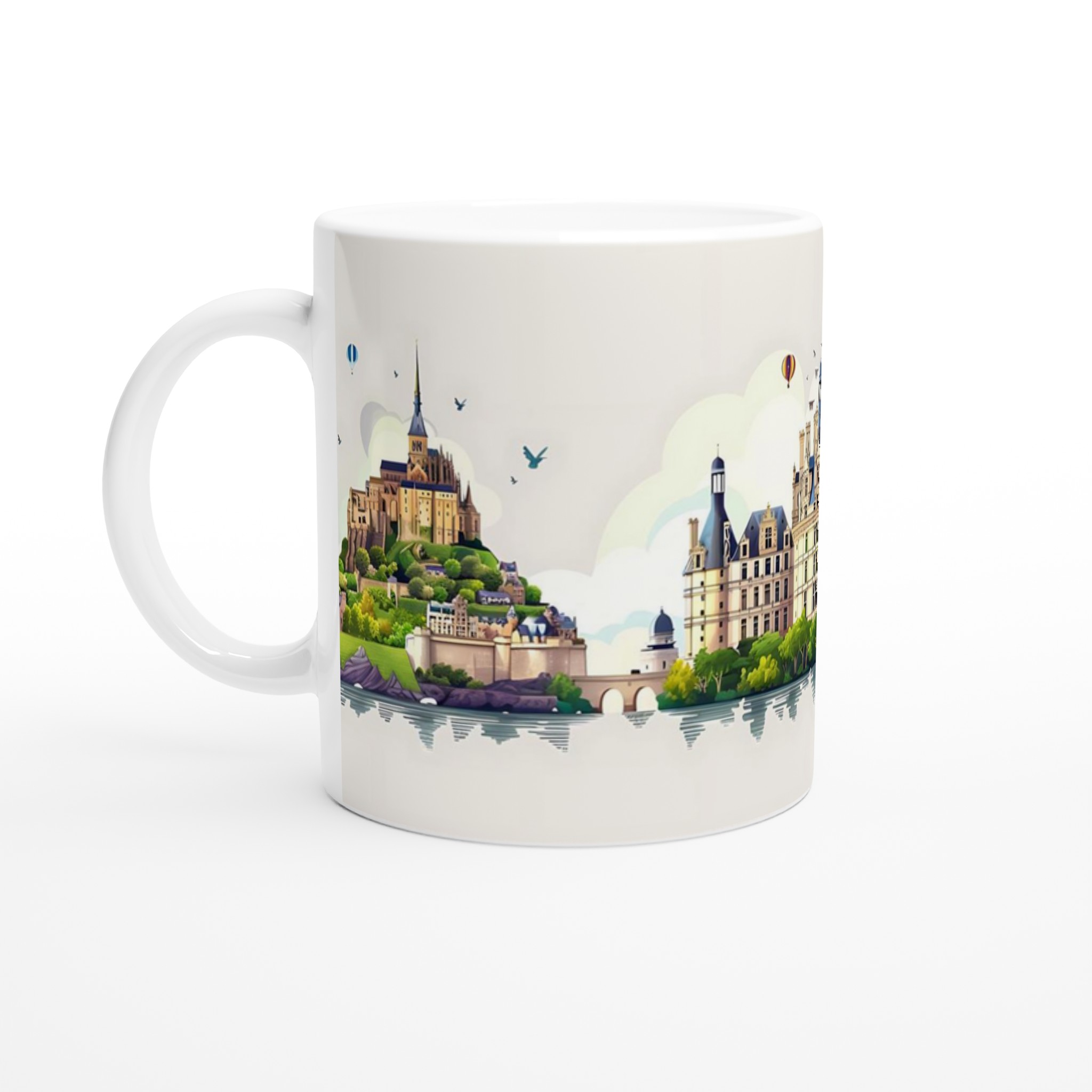 Inspirerad av Frankrikes storslagna arkitektur, med slott som Mont Saint-Michel och Chenonceau, samt Eiffeltornet, förvandlar denna mugg din fikapaus till en miniresa. Den detaljerade och levande illustrationen i en mjuk färgpalett förmedlar en känsla av lugn och äventyr, perfekt för den som drömmer om historiska landskap och parisiska vyer.