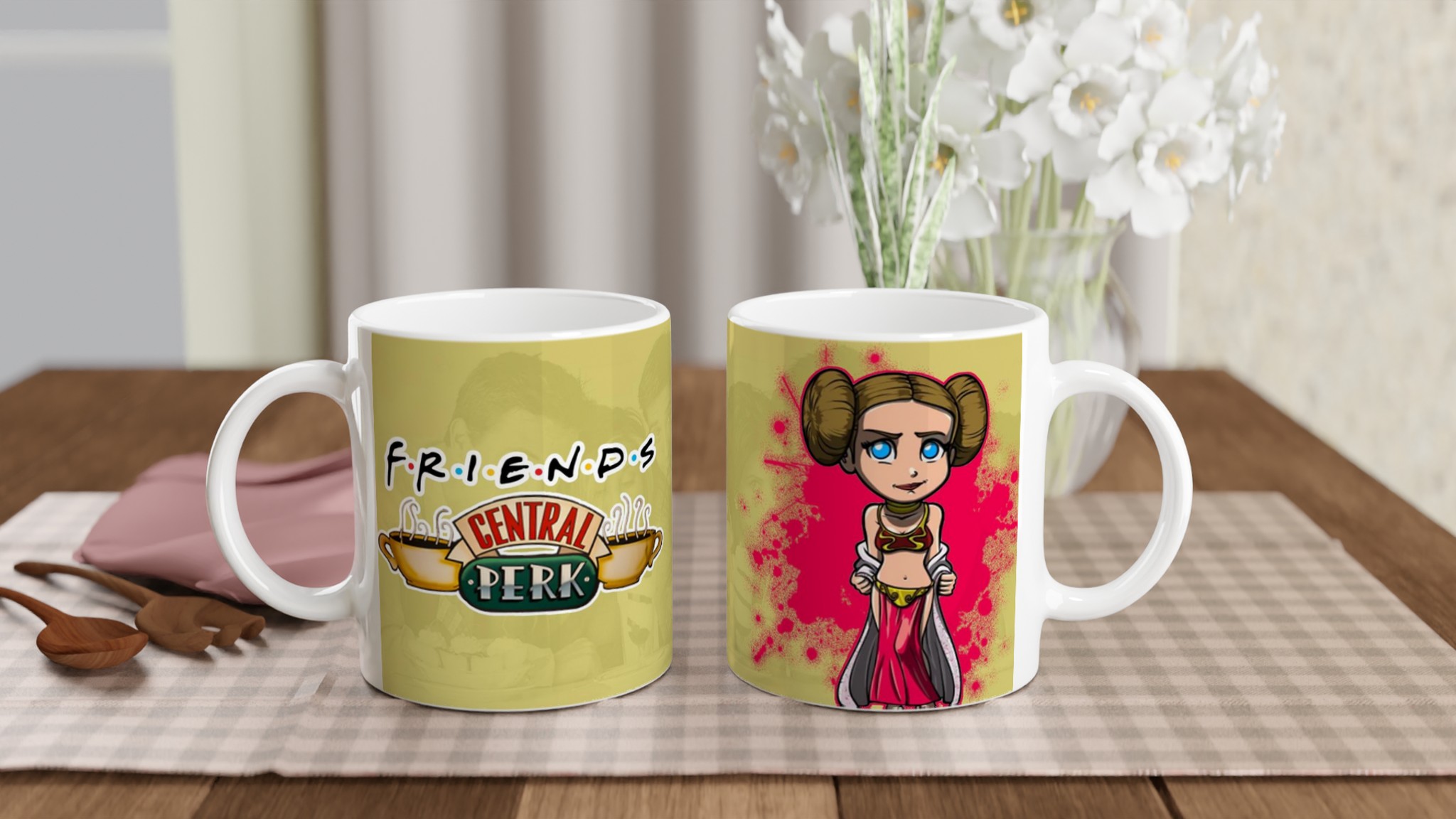 Förena din kärlek till ikoniska tv-serier och galaktiska äventyr med vår unika Keramisk Mugg – en äkta vardagsfavorit! Denna mugg hyllar både den älskade serien Friends, med den igenkännbara Central Perk-loggan, och Star Wars, med en charmig karikatyr av Prinsessan Leia. Perfekt för morgonkaffet, kvällens varma choklad eller när du bara vill njuta av en kopp te medan du drömmer dig bort till både New Yorks kaféer och avlägsna galaxer.