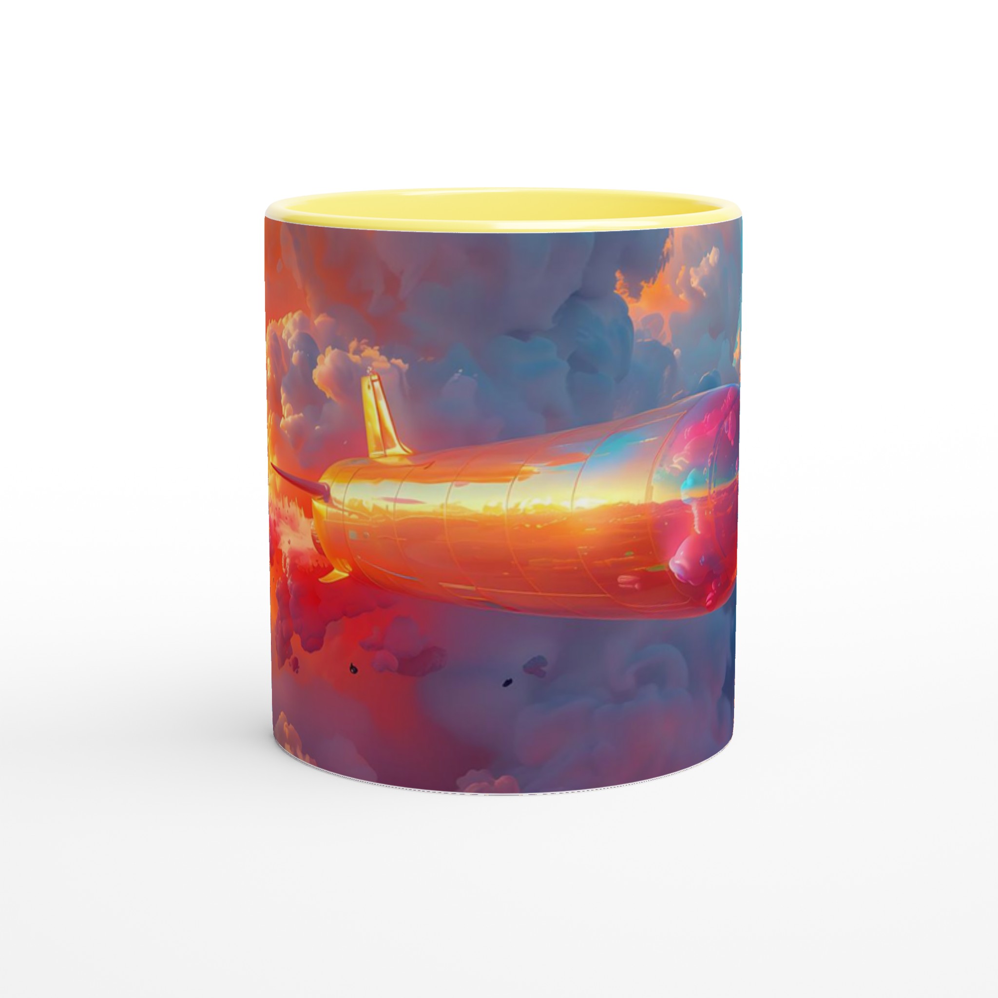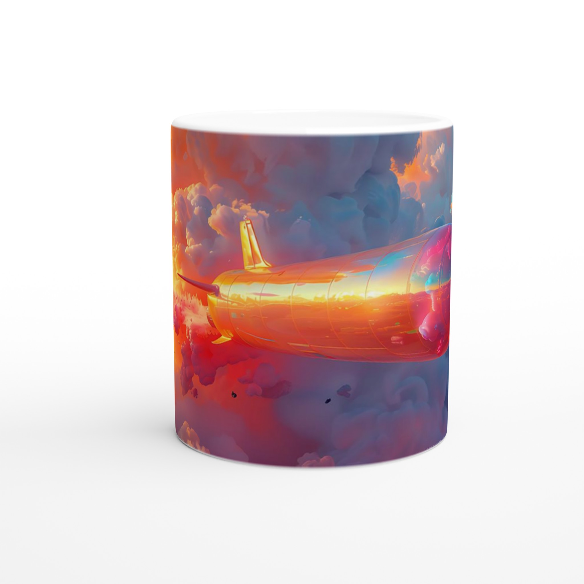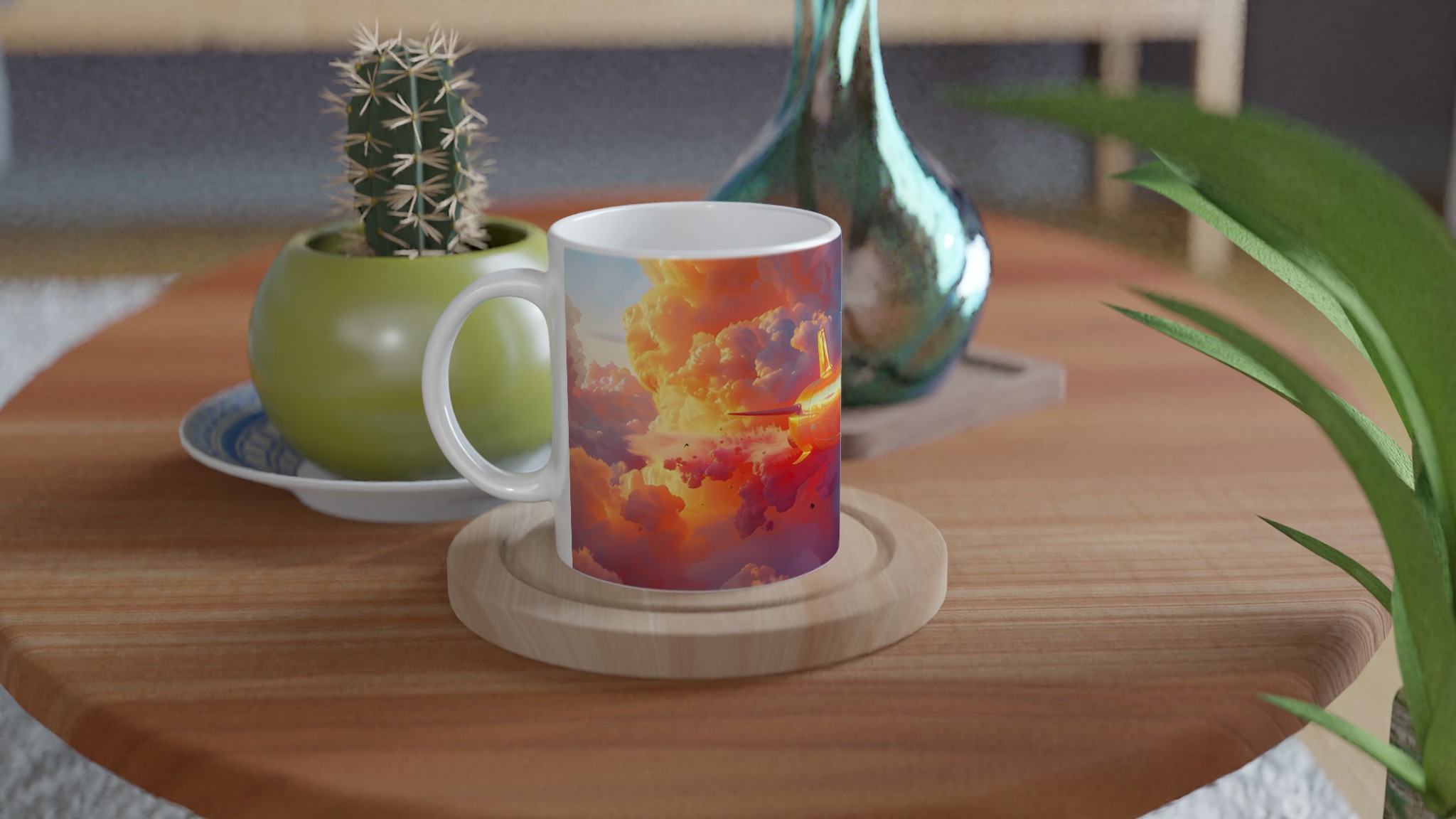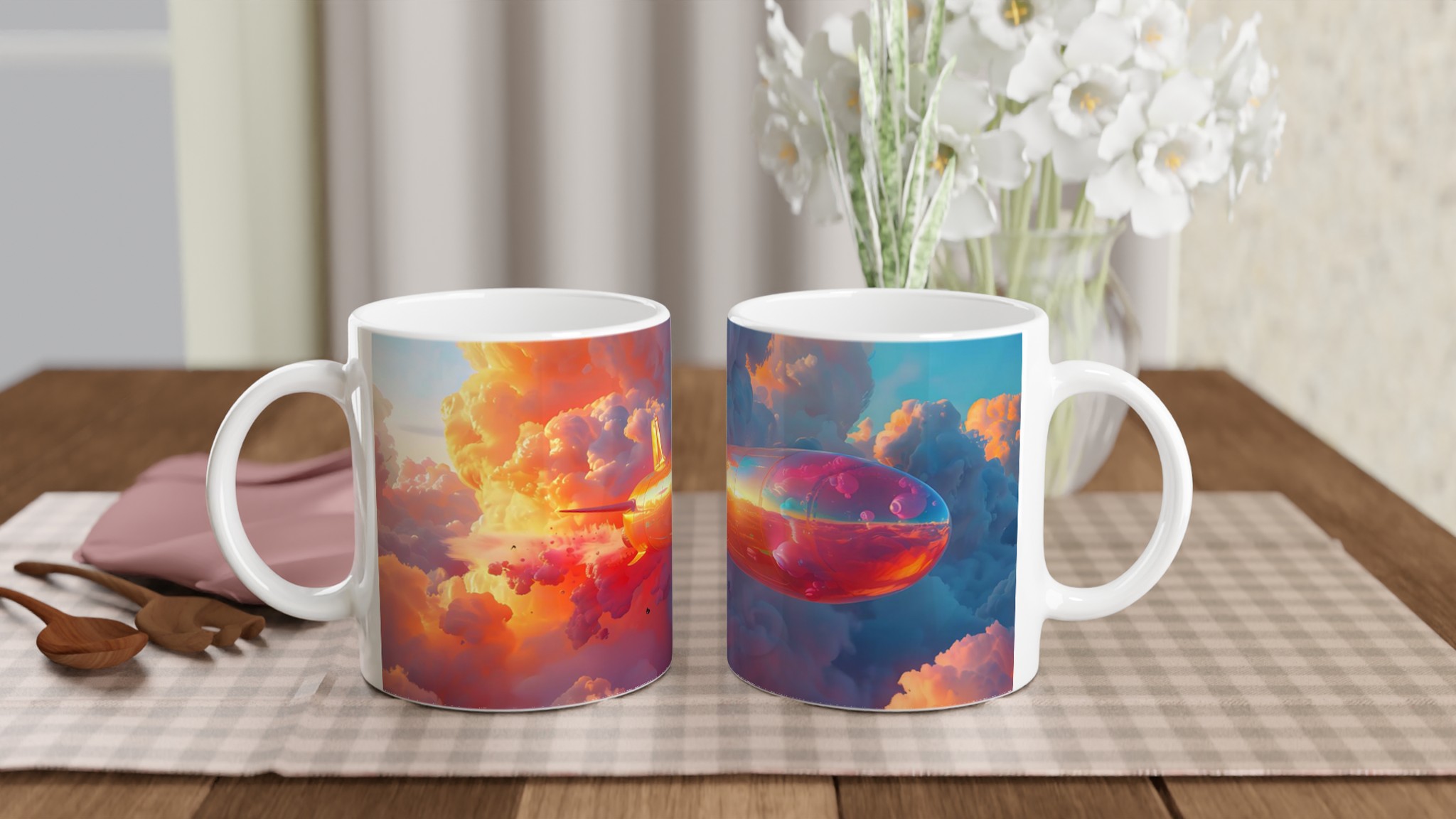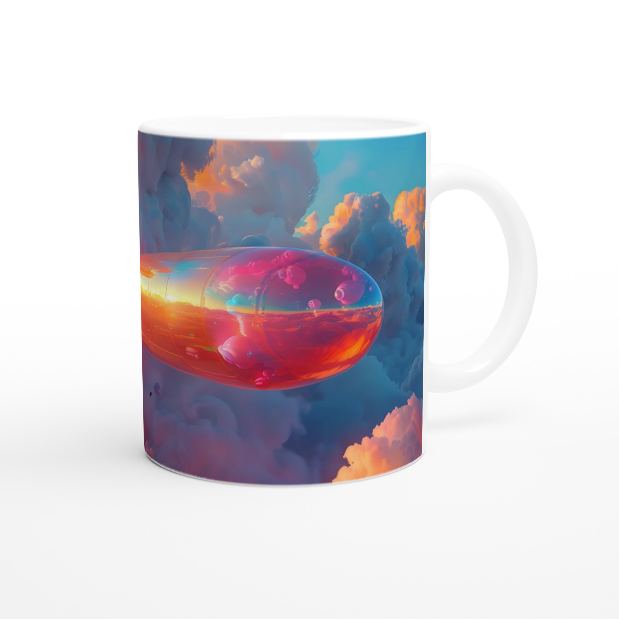 Väck din fantasi med denna unika 11 oz keramiska mugg, som fångar den eteriska skönheten från drömlika skyar och futuristiska farkoster. Varje morgonkaffe eller eftermiddagste blir en resa genom fantastiska landskap, perfekt för den som älskar sci-fi, surrealistisk konst eller bara vill ha en mugg som sticker ut.