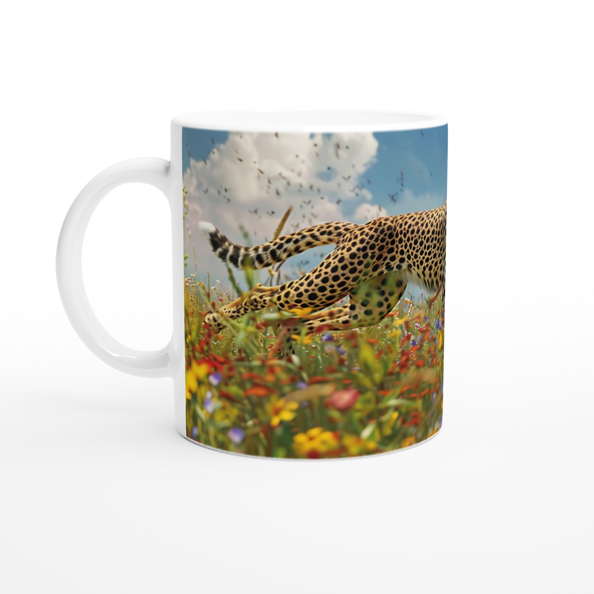 Inspirerad av naturens vilda skönhet, med en majestätisk gepard som rusar fram över en levande blomsteräng, ger denna mugg en känsla av frihet och färg till din dag. Den blanka vita ytan ger ett skarpt och levande tryck som verkligen sticker ut, oavsett om det är en personlig design, ett roligt citat eller en present till någon du tycker om.