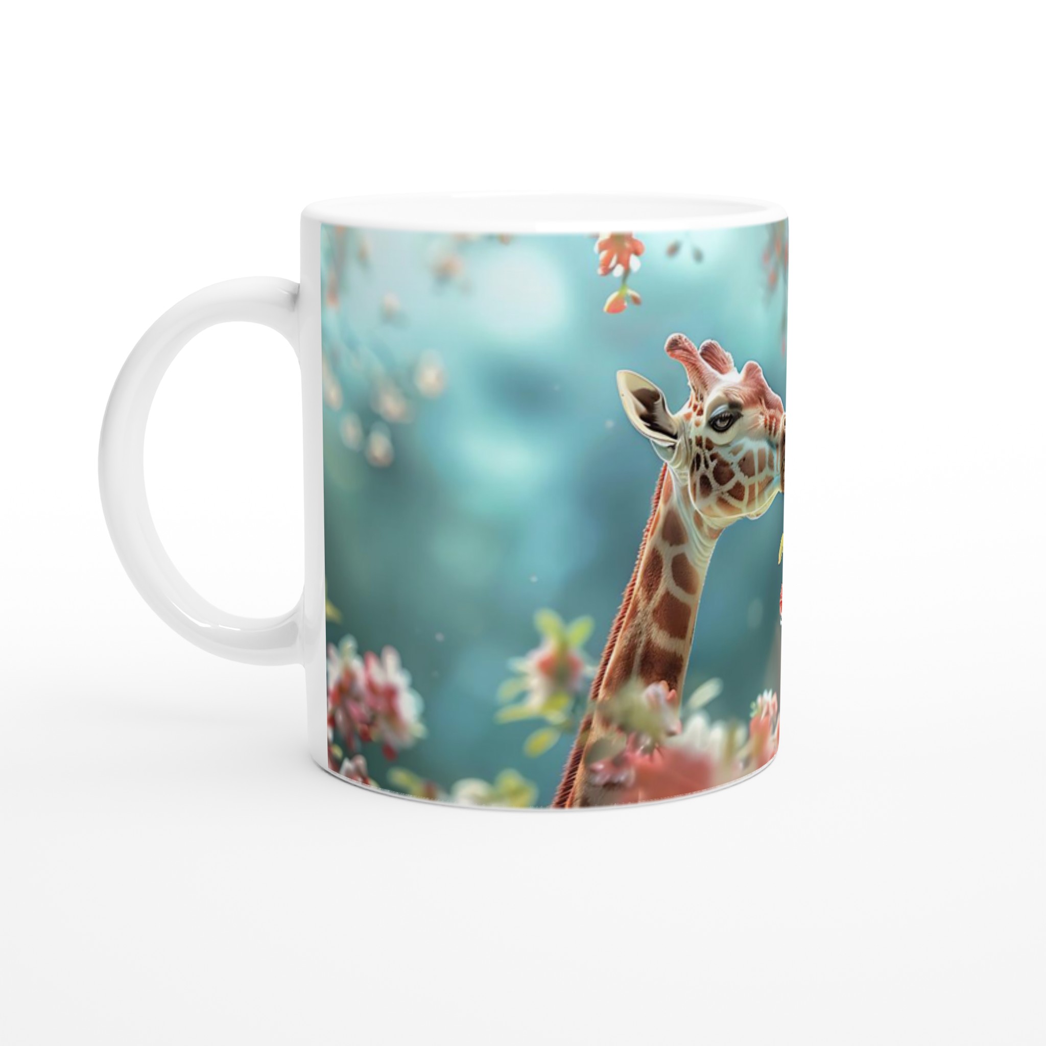 Denna förtrollande mugg fångar den lugna skönheten hos en giraff omgiven av ljuvliga vårblommor, vilket skapar en drömsk och fridfull känsla med sin mjuka färgpalett. En perfekt present till naturälskare eller för att ge din egen samling en touch av lugn elegans.