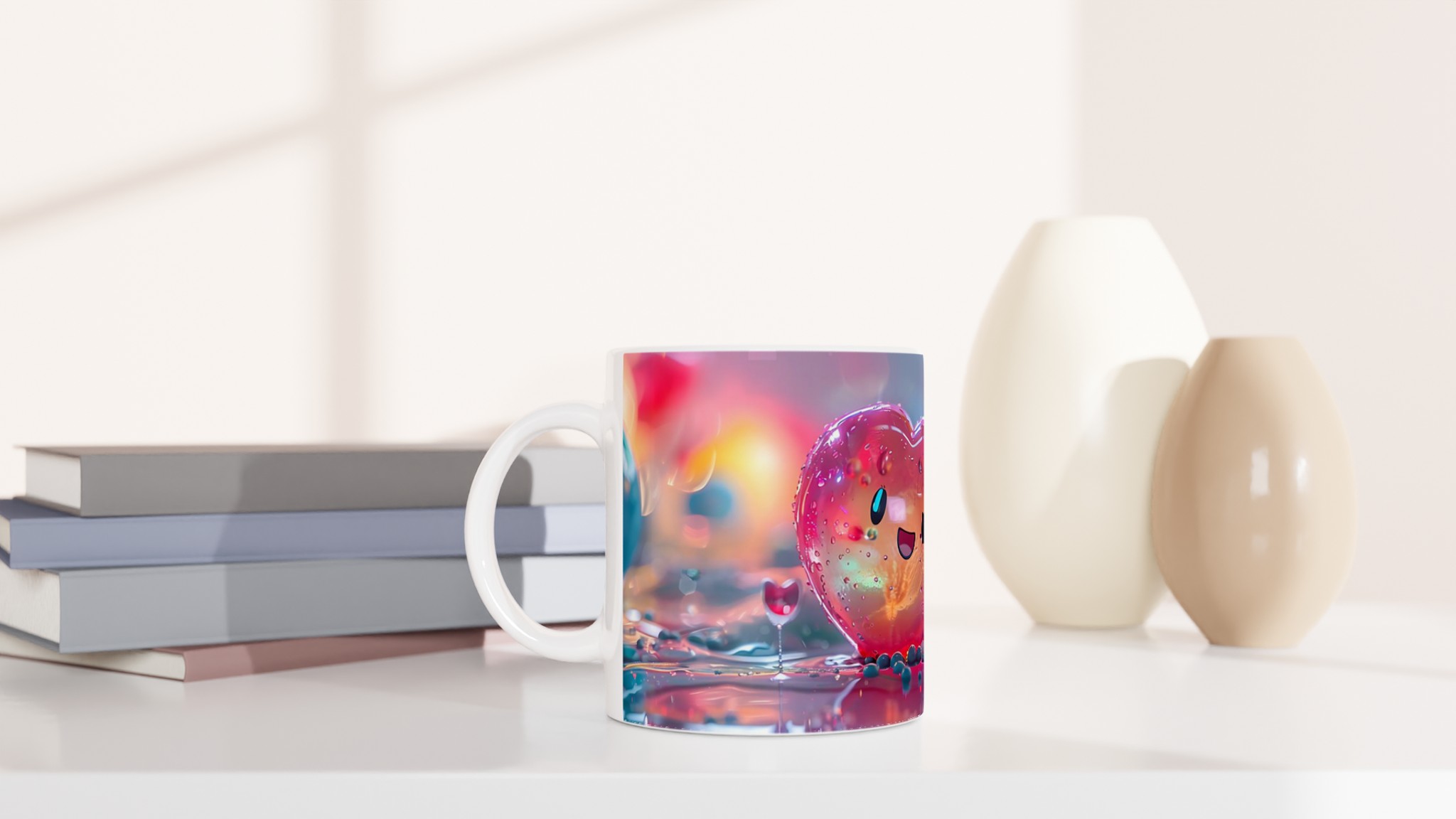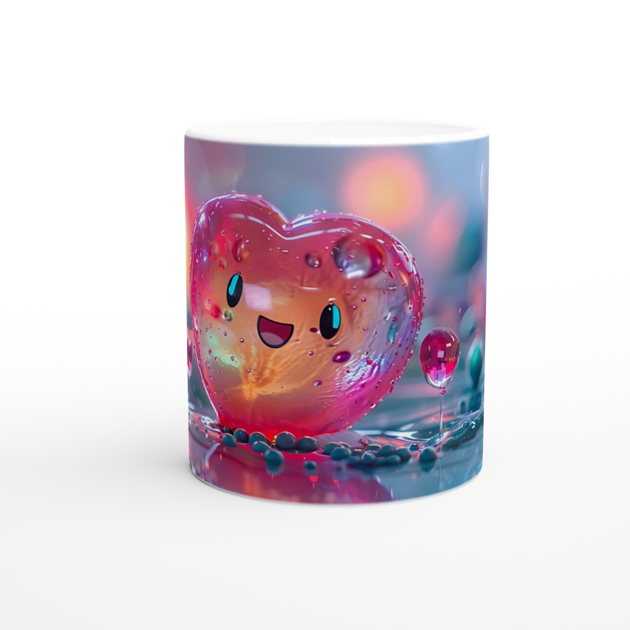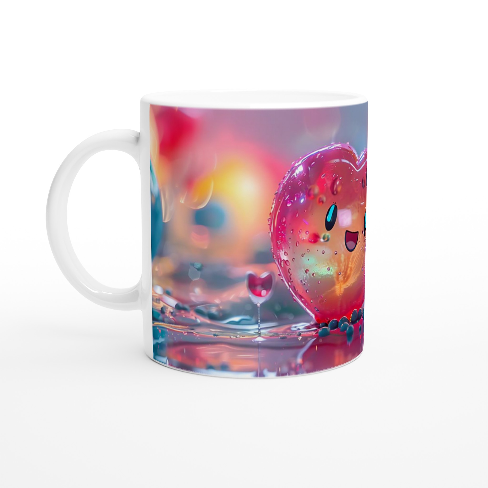 Denna livfulla keramiska mugg är mer än bara en kopp – den är en daglig dos av glädje! Inspirerad av bildens lekfulla bubbelhjärta och dess drömska färgpalett, blir denna mugg snabbt en vardagsfavorit som lyser upp varje ögonblick. Perfekt för morgonkaffet, kvällens varma choklad eller när du bara vill njuta av en kopp te med ett leende. Den blanka ytan får trycken att framhävas med klara och levande färger, som håller sig fina även efter många turer i mikron och diskmaskinen.