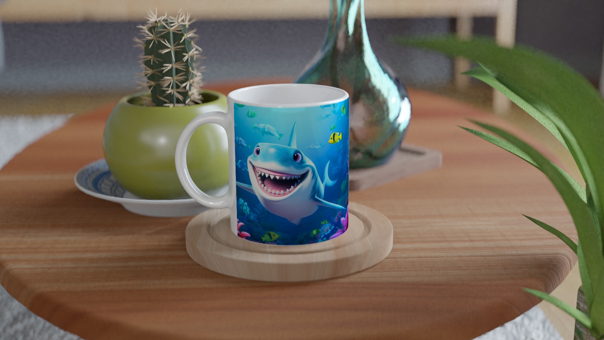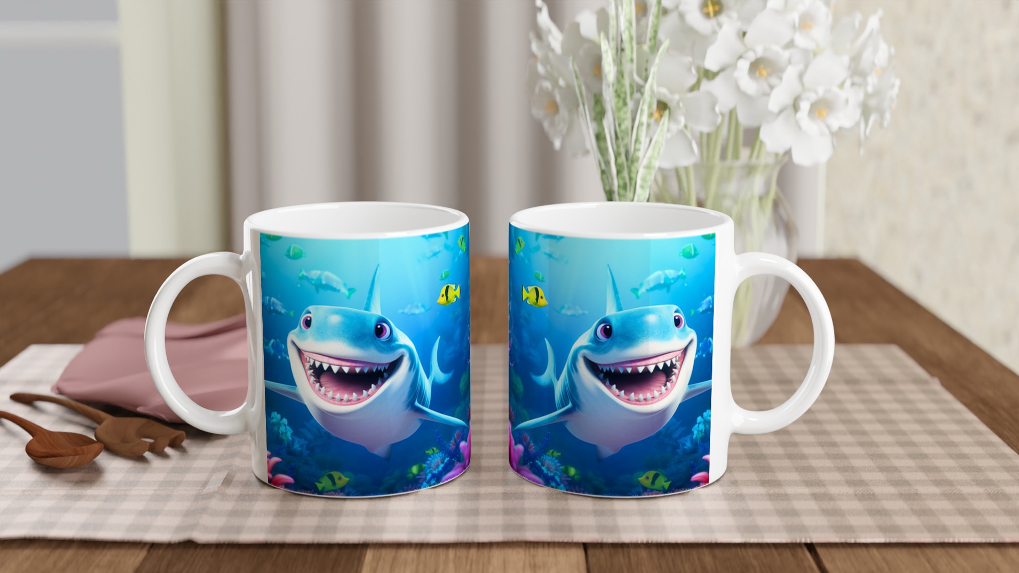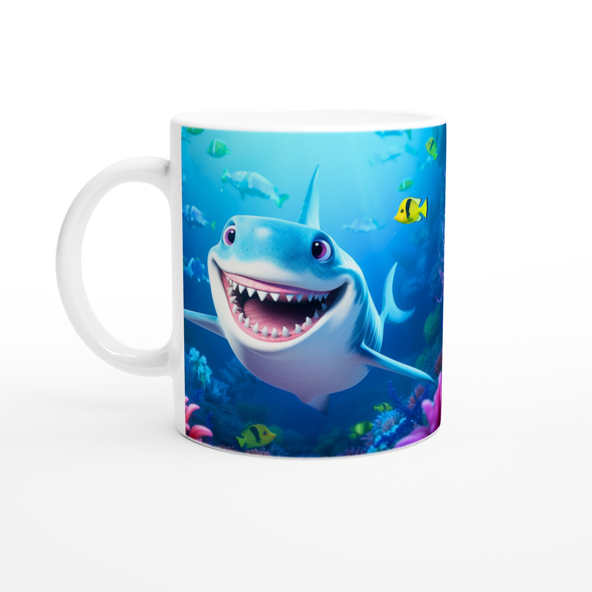 Dyk ner i en värld av glädje med vår ”Glad Haj” keramiska mugg! Denna mugg fångar den lekfulla charmen hos en tecknad haj i en livfull undervattensscen, komplett med färgglada koraller och simmande fiskar. Perfekt för morgonkaffet, kvällens varma choklad eller när du bara vill njuta av en kopp te, och låta dig inspireras av havets lugn och spänning.