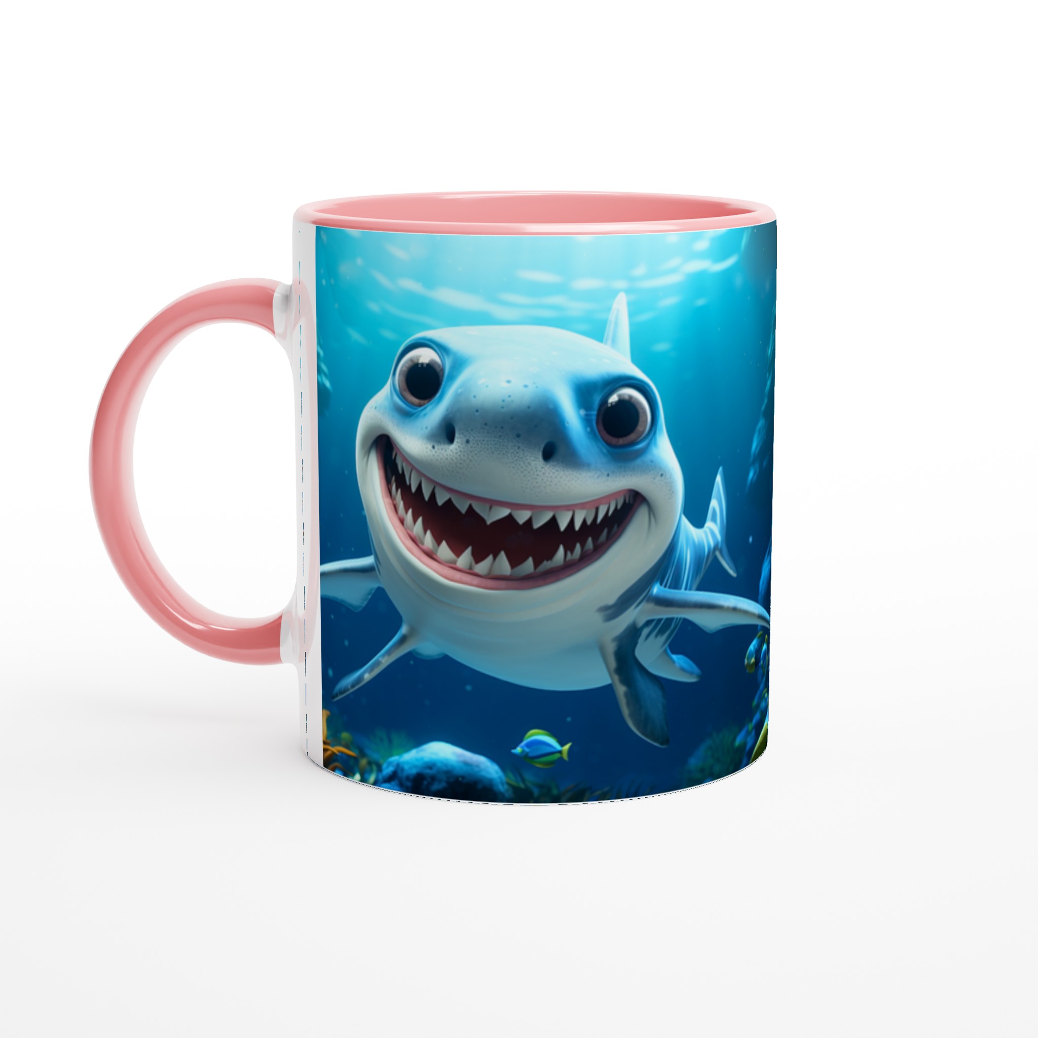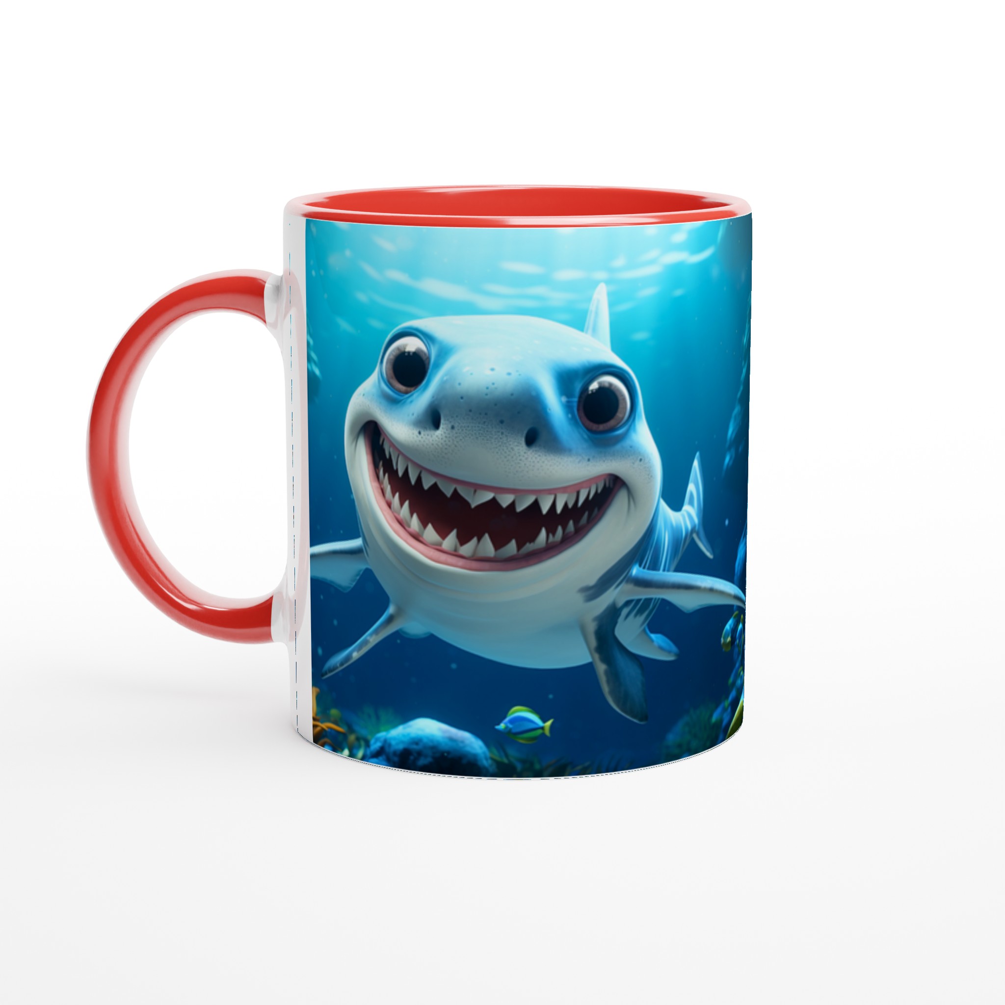 Den blanka ytan och livfulla trycket framhäver hajens glada uttryck med klara och levande färger, som håller sig fina även efter många turer i mikron och diskmaskinen. Välj din favoritfärg – vi erbjuder ett spektrum från klassiskt vitt till djärvt blått, piggt gult, sött rosa, fräscht grönt, passionerat rött eller elegant svart. Anpassa din mugg för att spegla din personlighet eller ge bort en unik present.