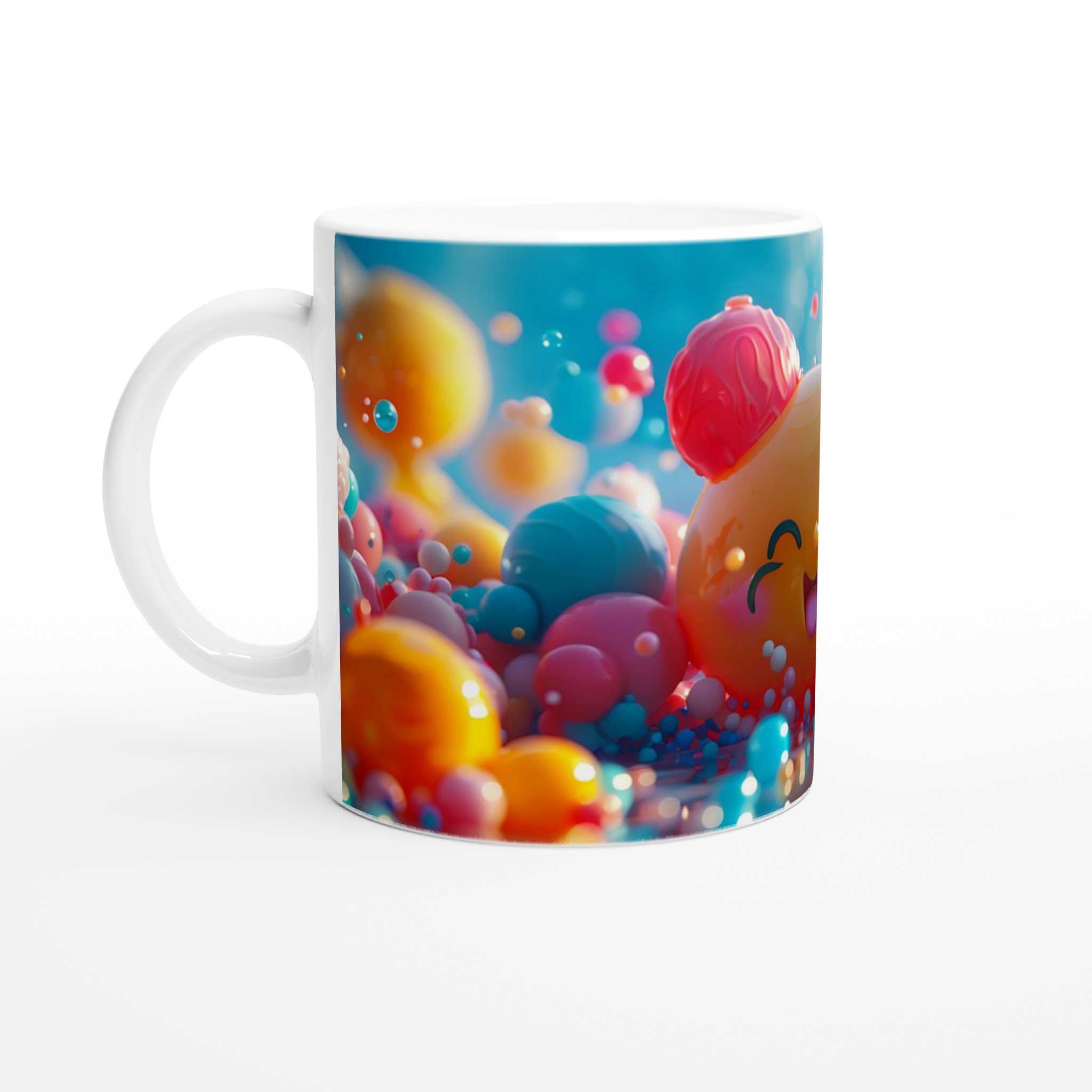 Denna mugg är inte bara en kopp, det är en daglig dos glädje! Med sitt livfulla och lekfulla motiv av en bubblig, glad figur omgiven av en explosion av färgglada bollar, förvandlar den varje klunk till en fest. Den blanka vita ytan ger ett skarpt och levande tryck som verkligen sticker ut, oavsett om det är en personlig design, ett roligt citat eller en present till någon du tycker om.