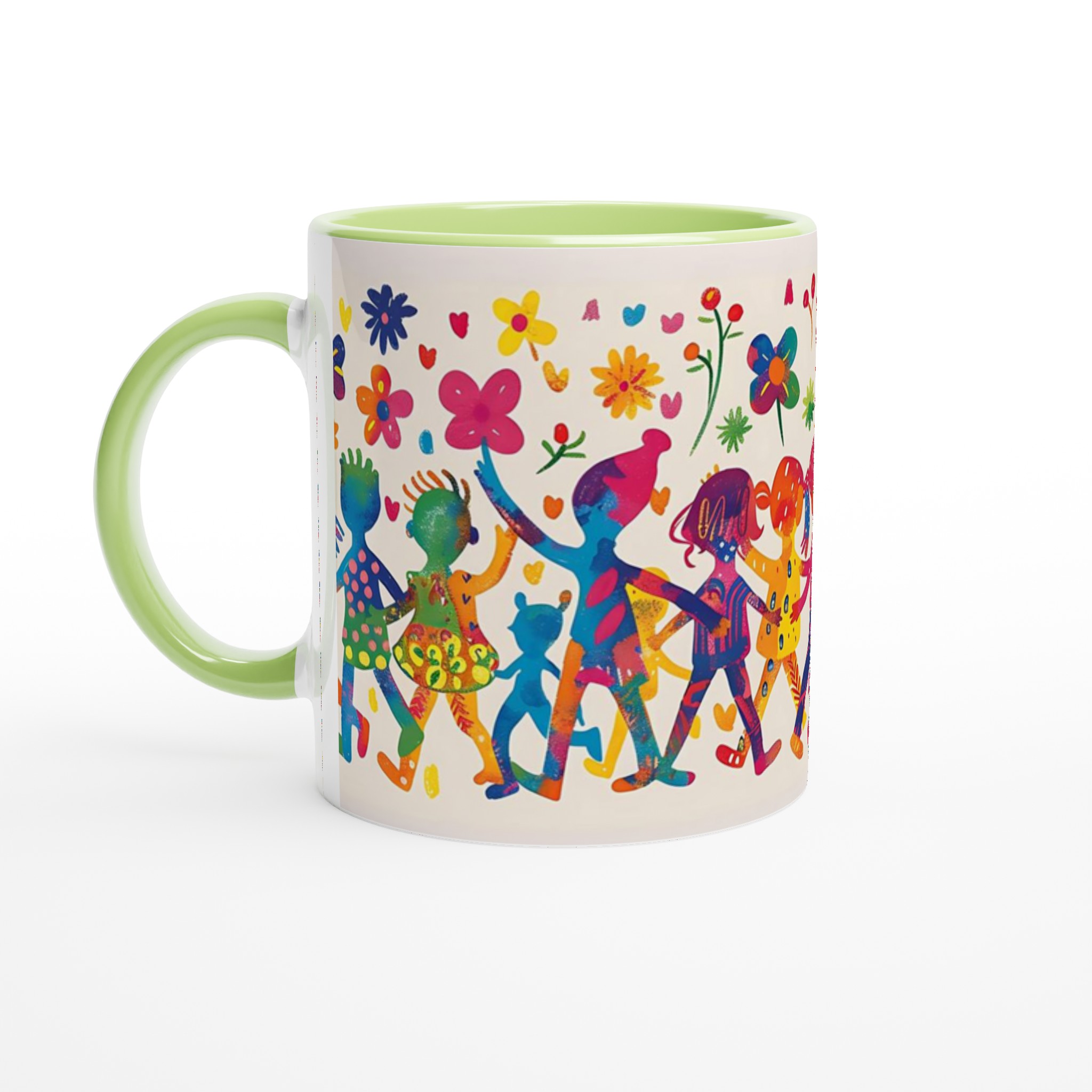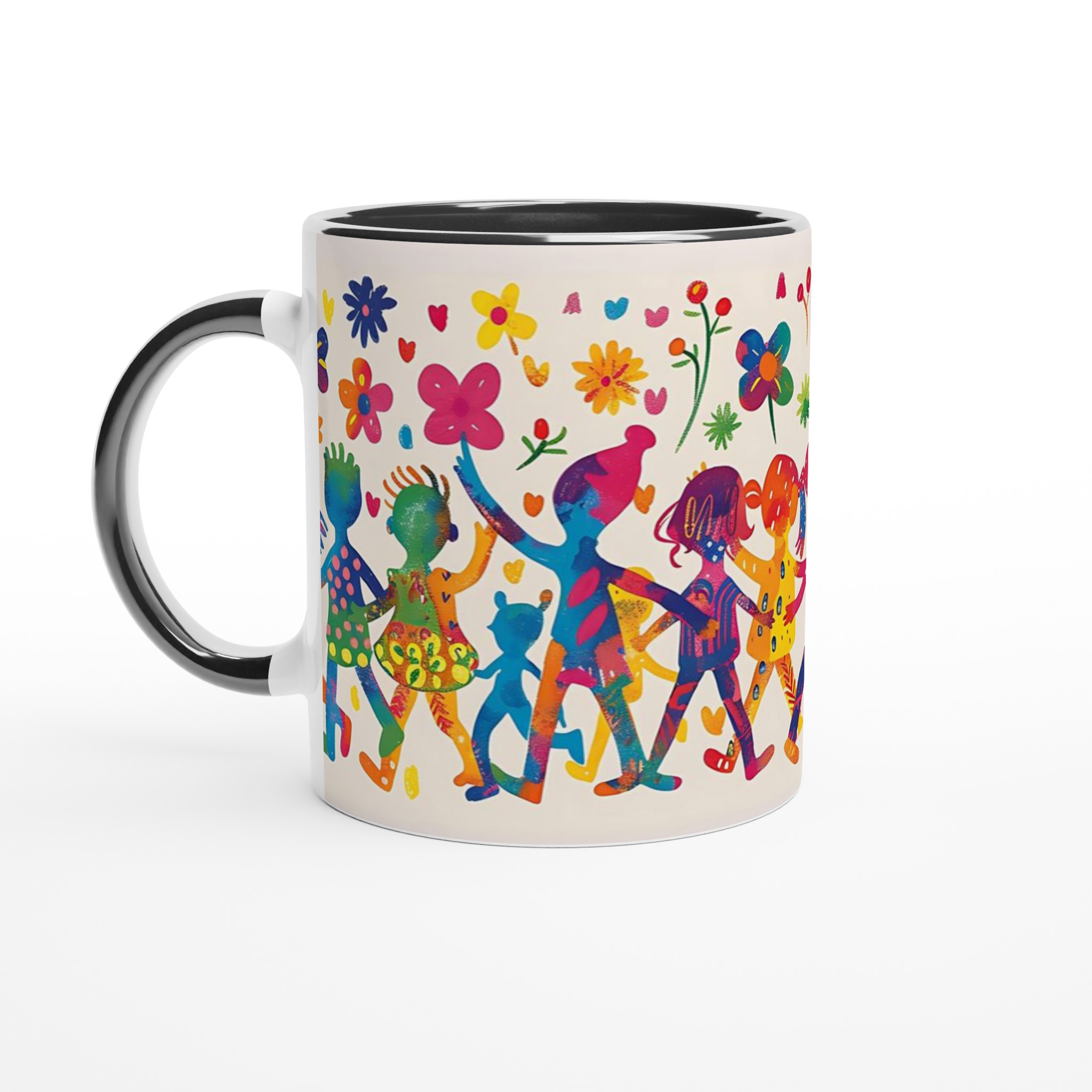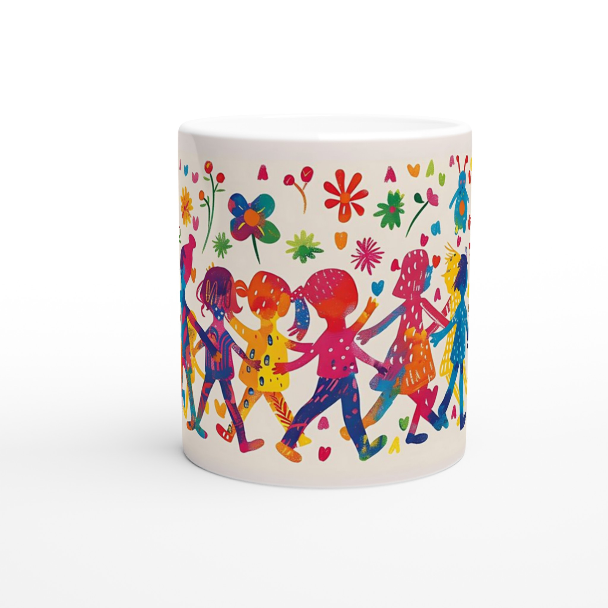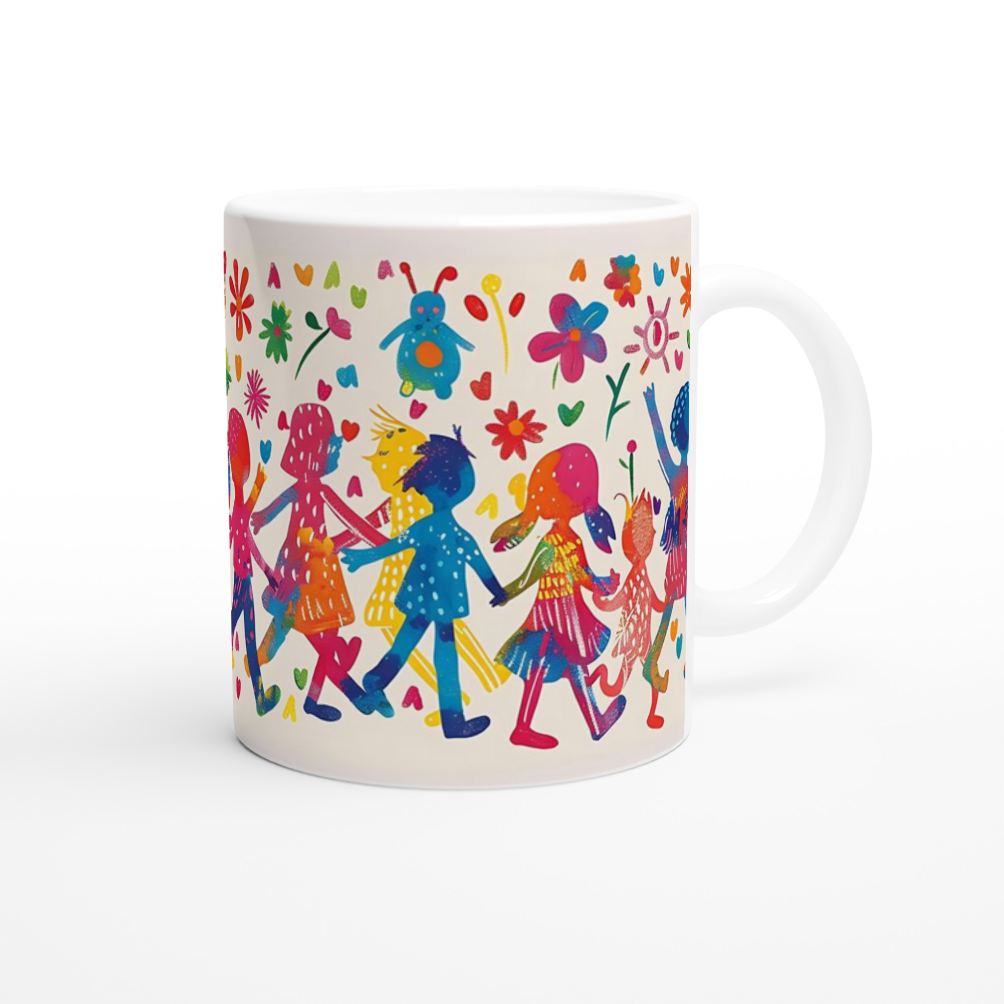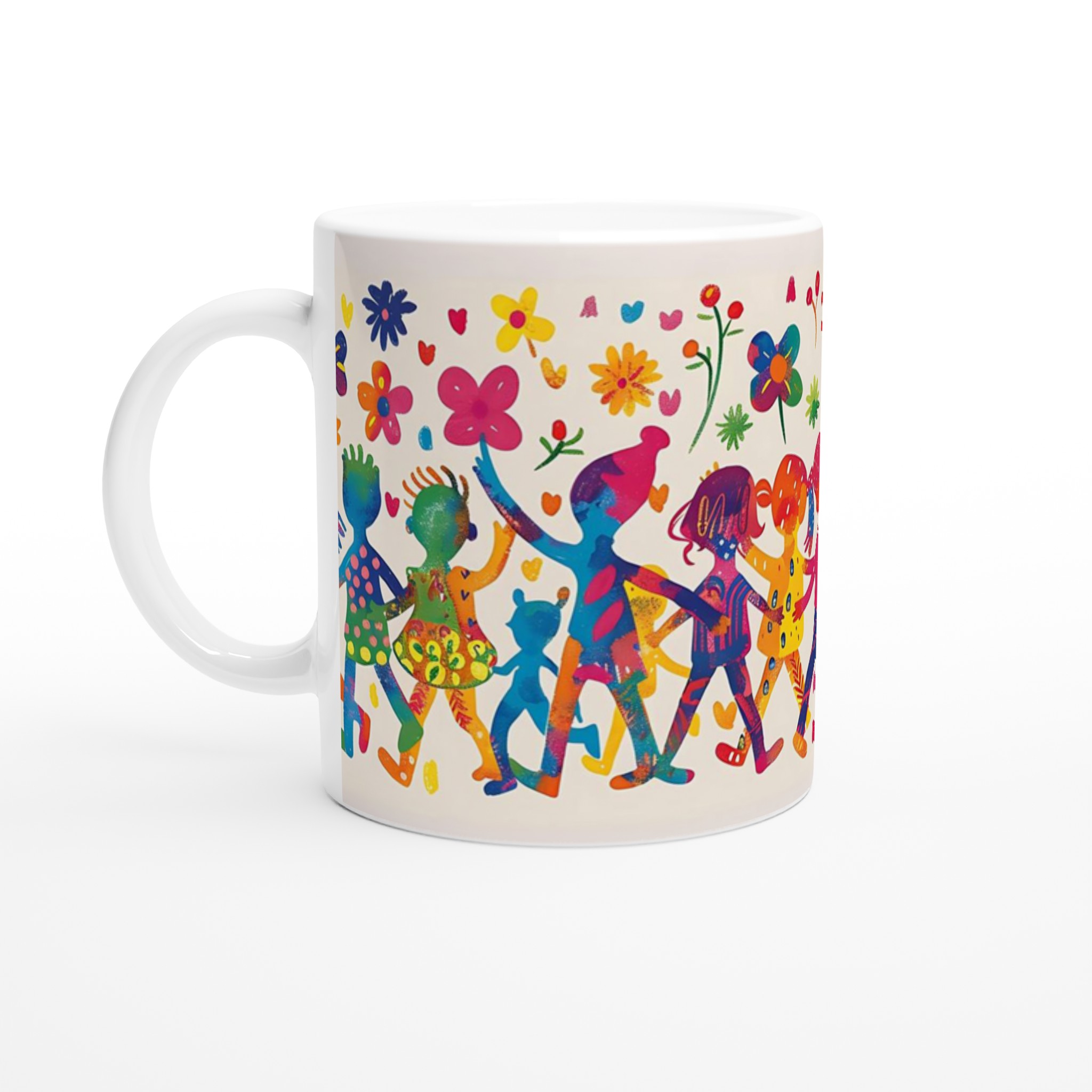 Lys upp din dag med denna sprudlande keramiska mugg, prydd med ett livfullt mönster av lekande barn och glada blommor i en akvarellinspirerad stil. Den fångar en känsla av glädje och gemenskap, perfekt för att förgylla din morgonrutin eller som en mysig detalj under kvällens avkoppling.