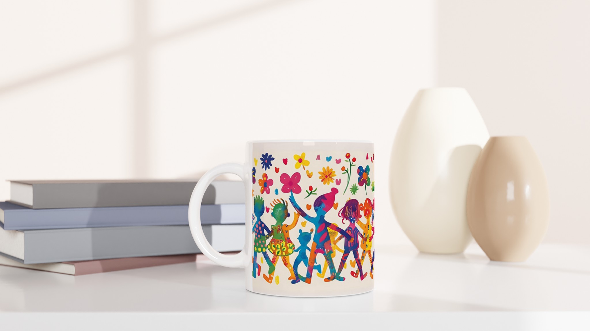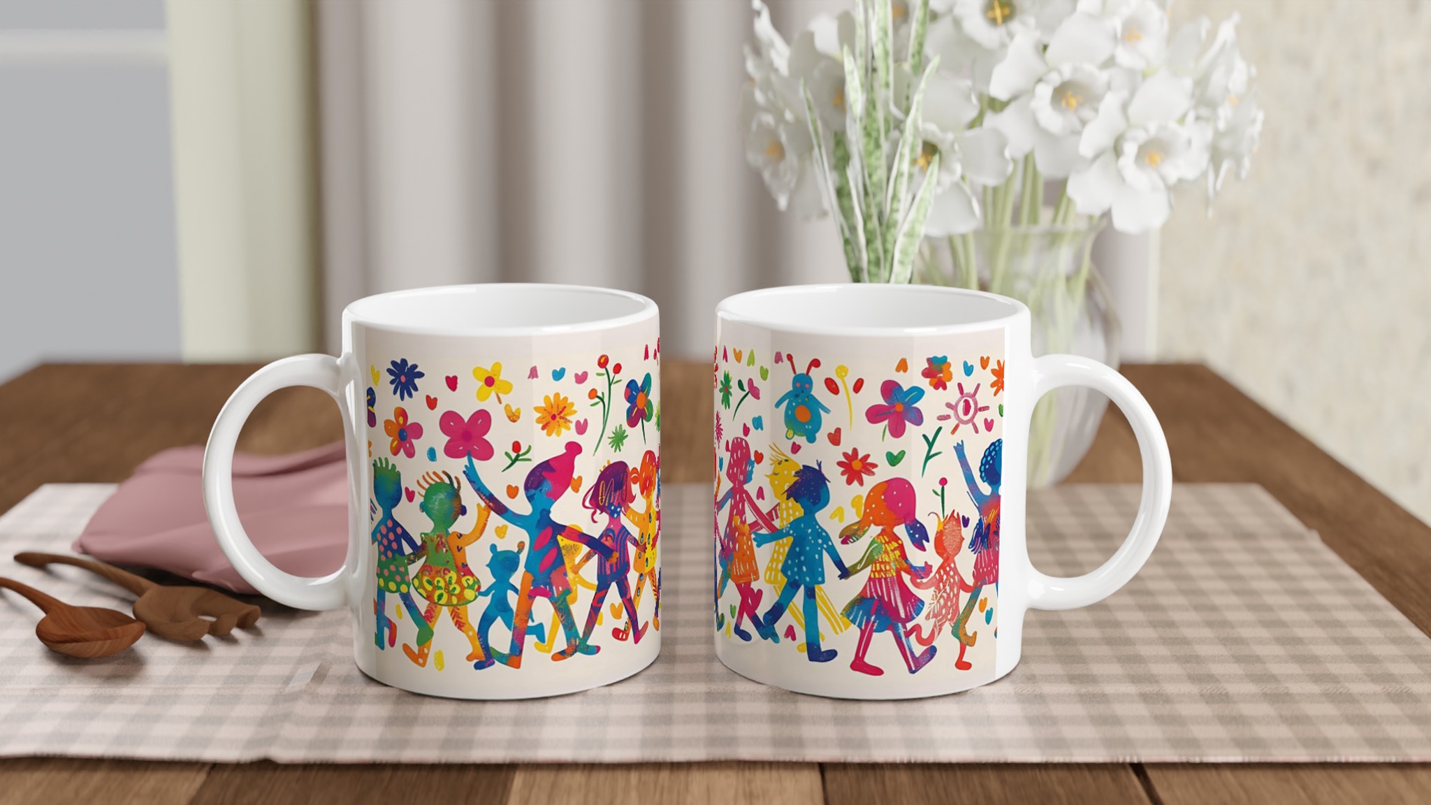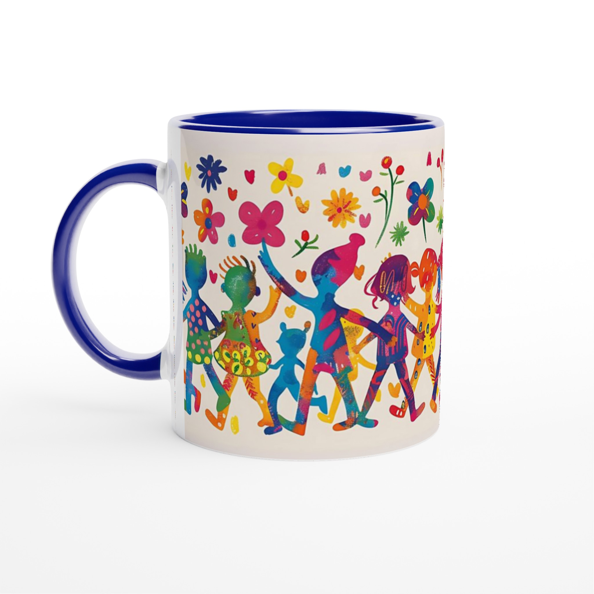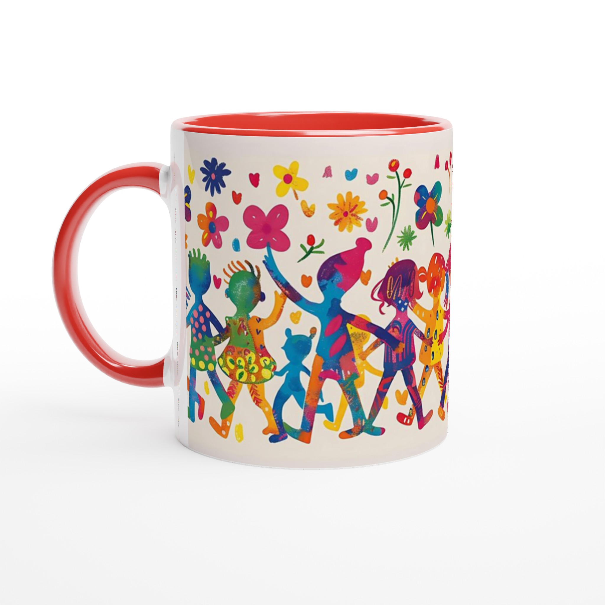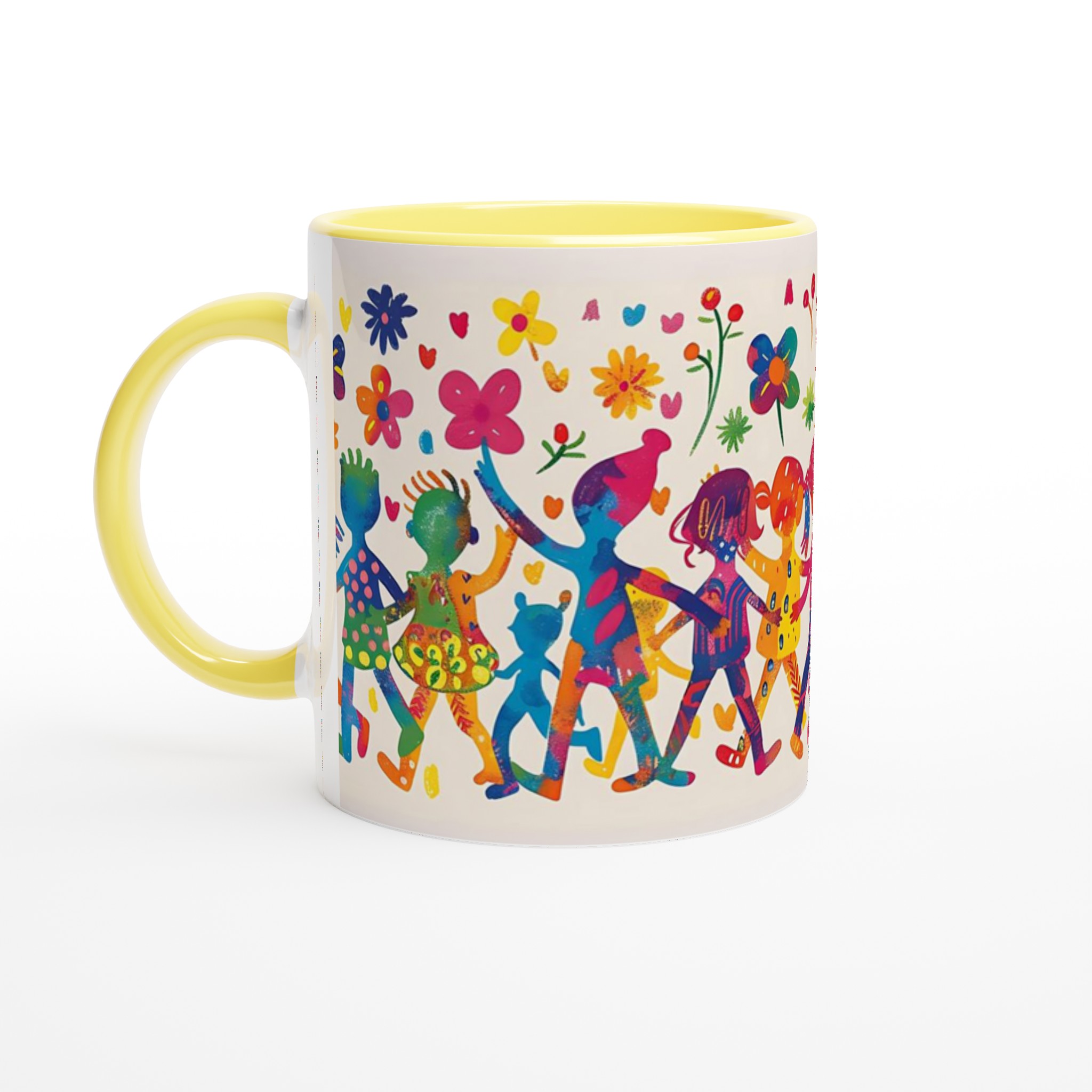 Lys upp din dag med denna sprudlande keramiska mugg, prydd med ett livfullt mönster av lekande barn och glada blommor i en akvarellinspirerad stil. Den fångar en känsla av glädje och gemenskap, perfekt för att förgylla din morgonrutin eller som en mysig detalj under kvällens avkoppling.