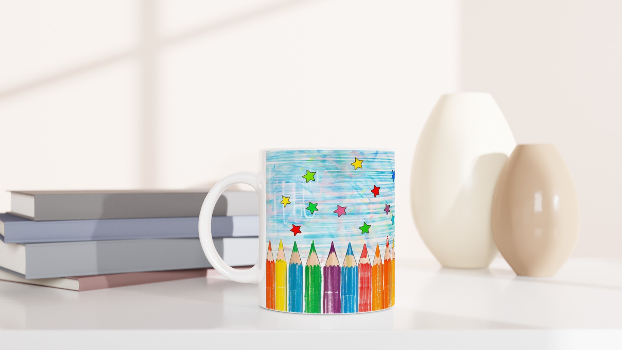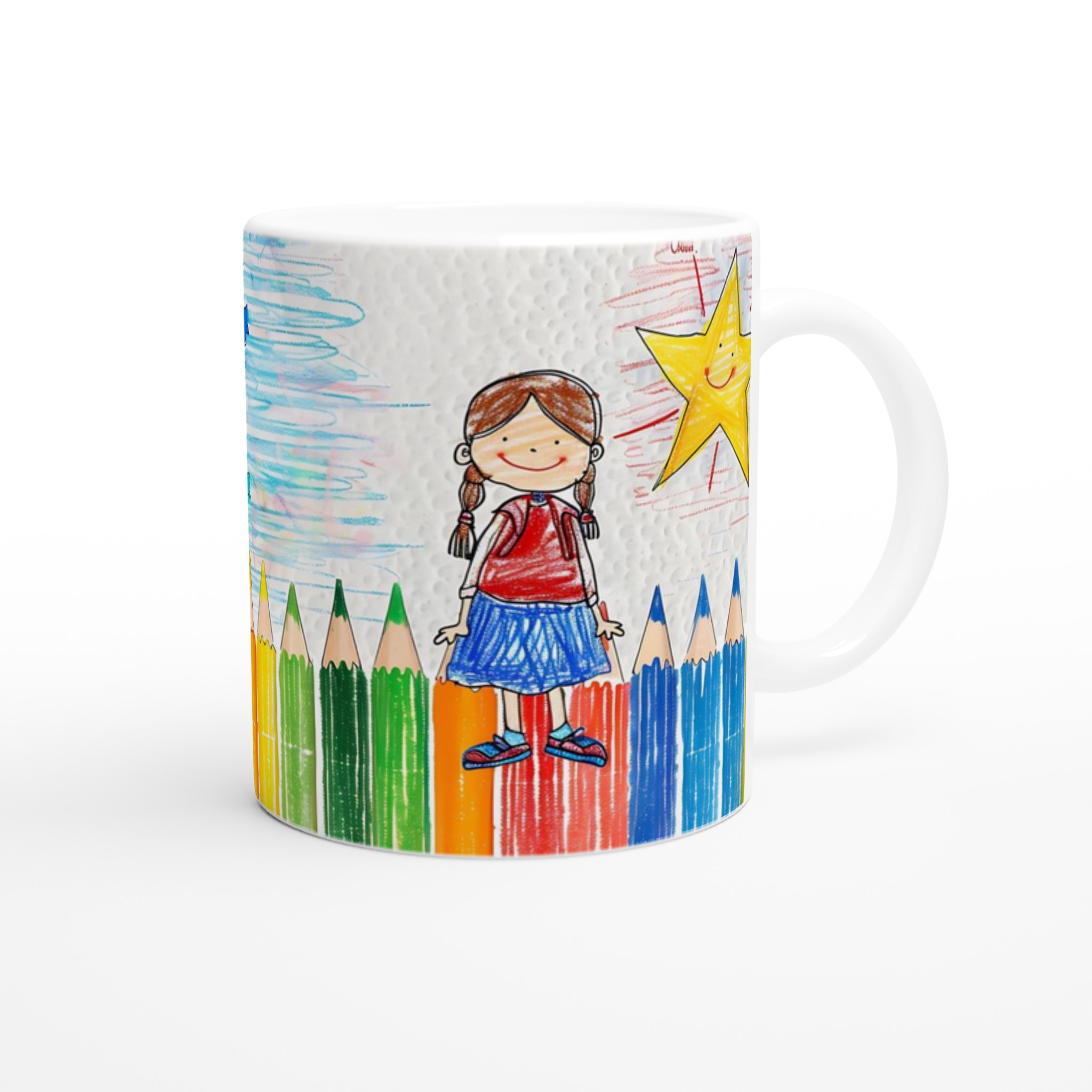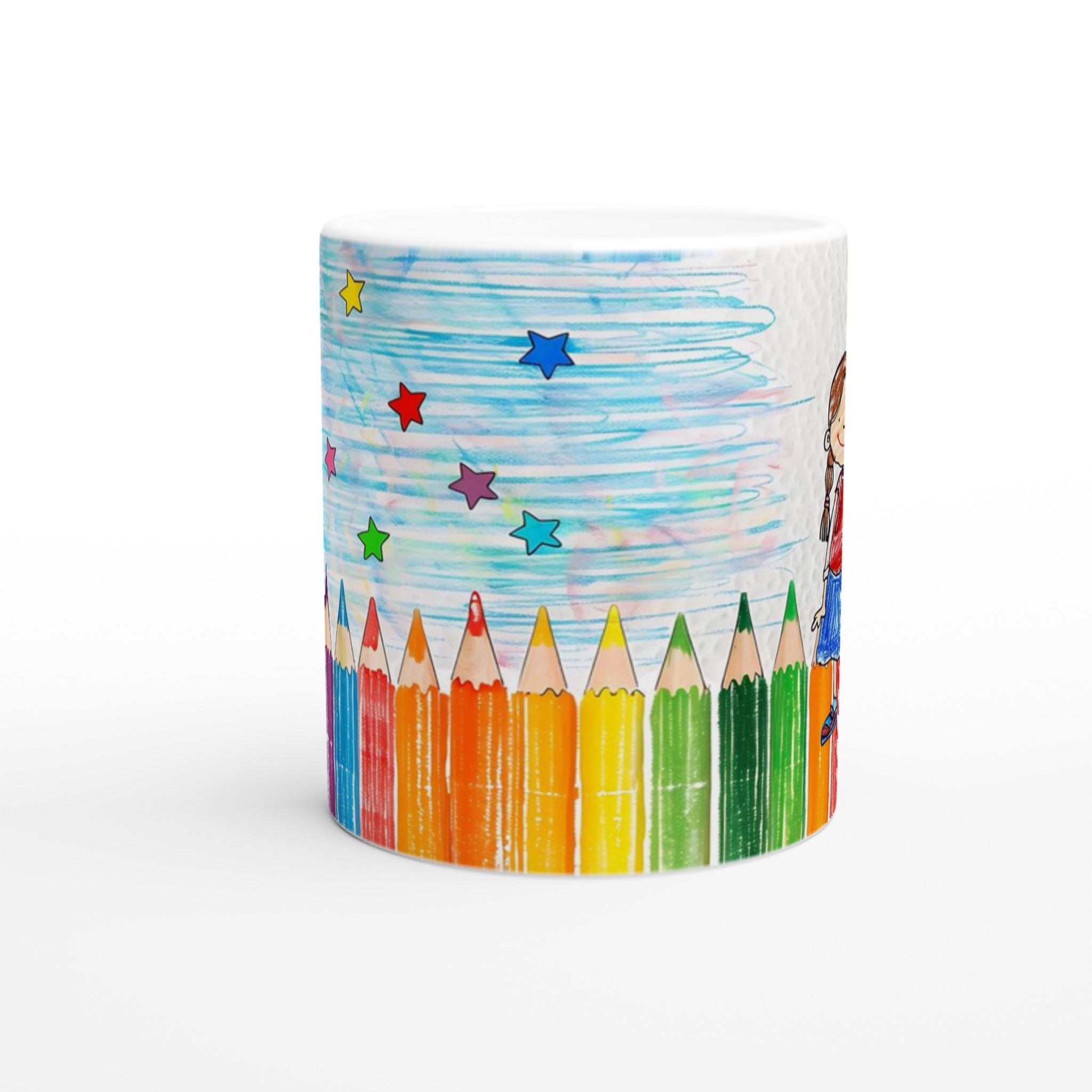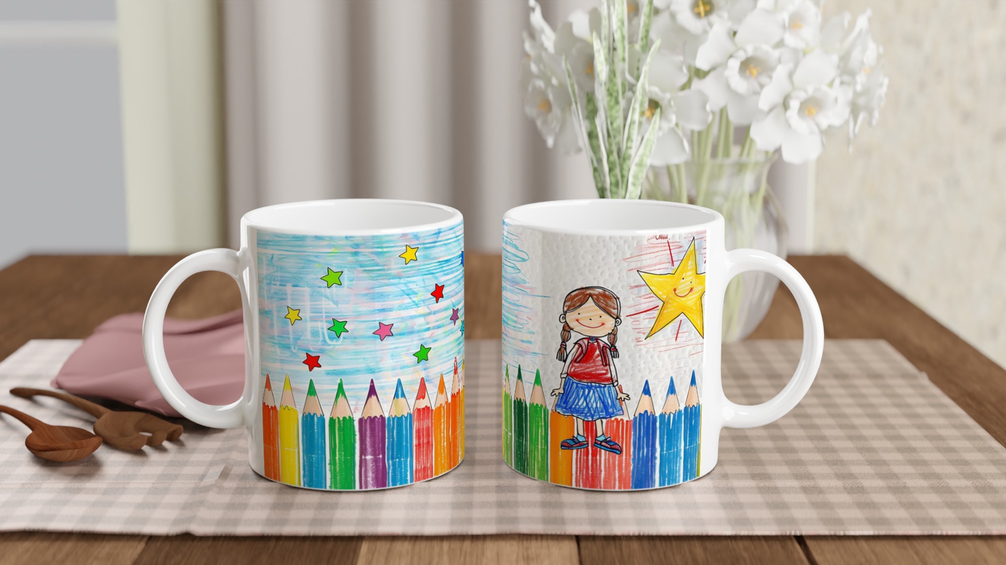 Väck barnasinnet med denna lekfulla keramiska mugg, prydd med en charmig design inspirerad av barns fantasifulla teckningar. Varje detalj, från de glada stjärnorna till den söta lilla flickan och de livfulla kritorna, skapar en känsla av glädje och nostalgi. Denna mugg blir snabbt en vardagsfavorit, perfekt för morgonkaffet, kvällens varma choklad eller när du bara vill njuta av en kopp te.