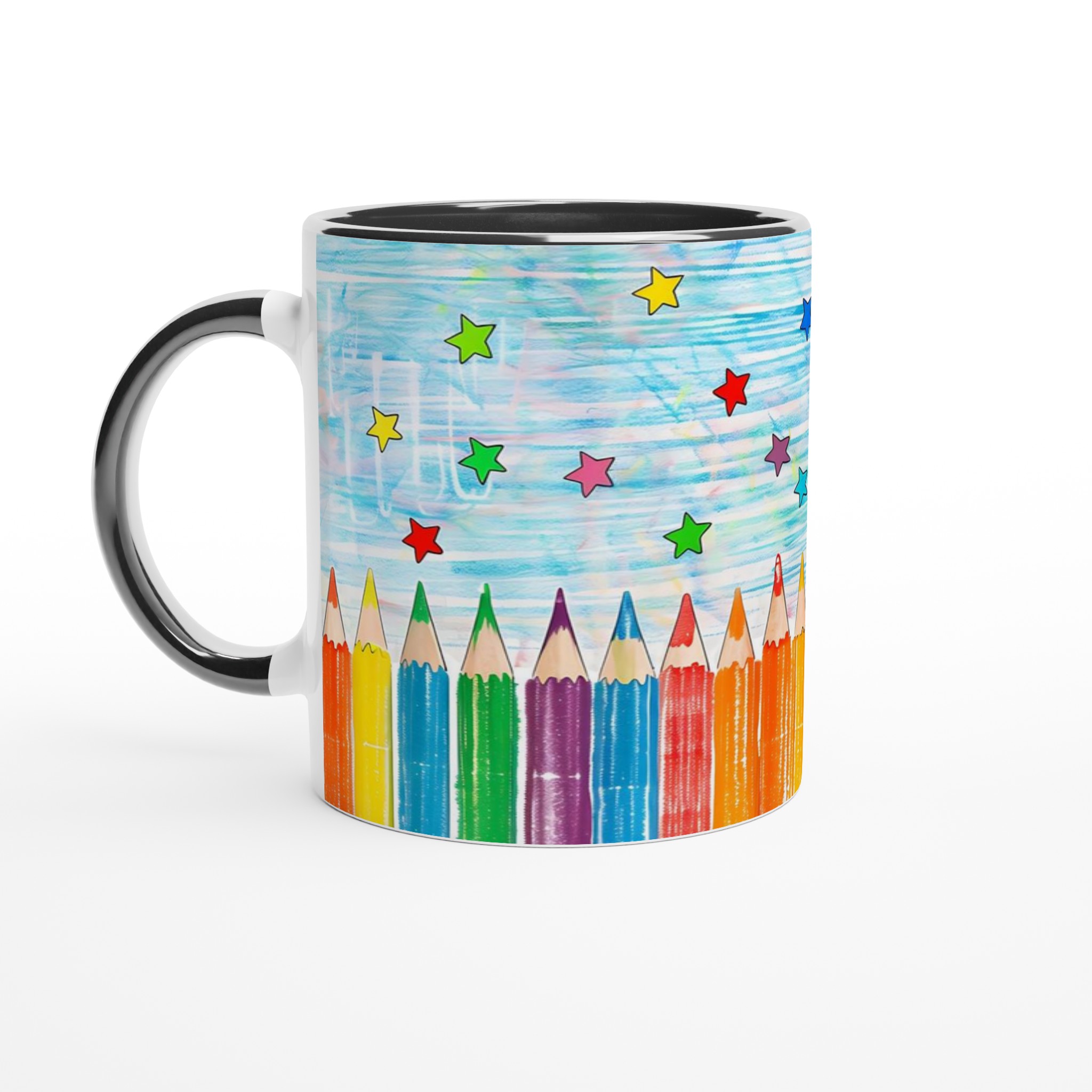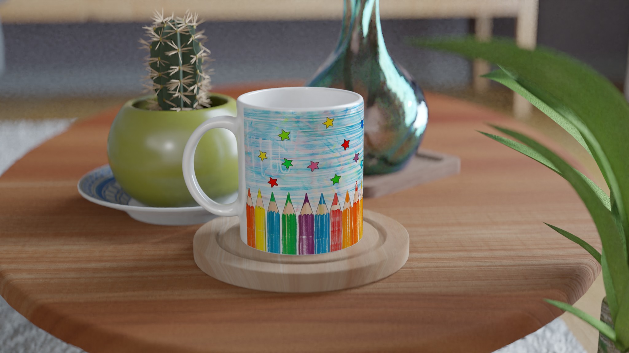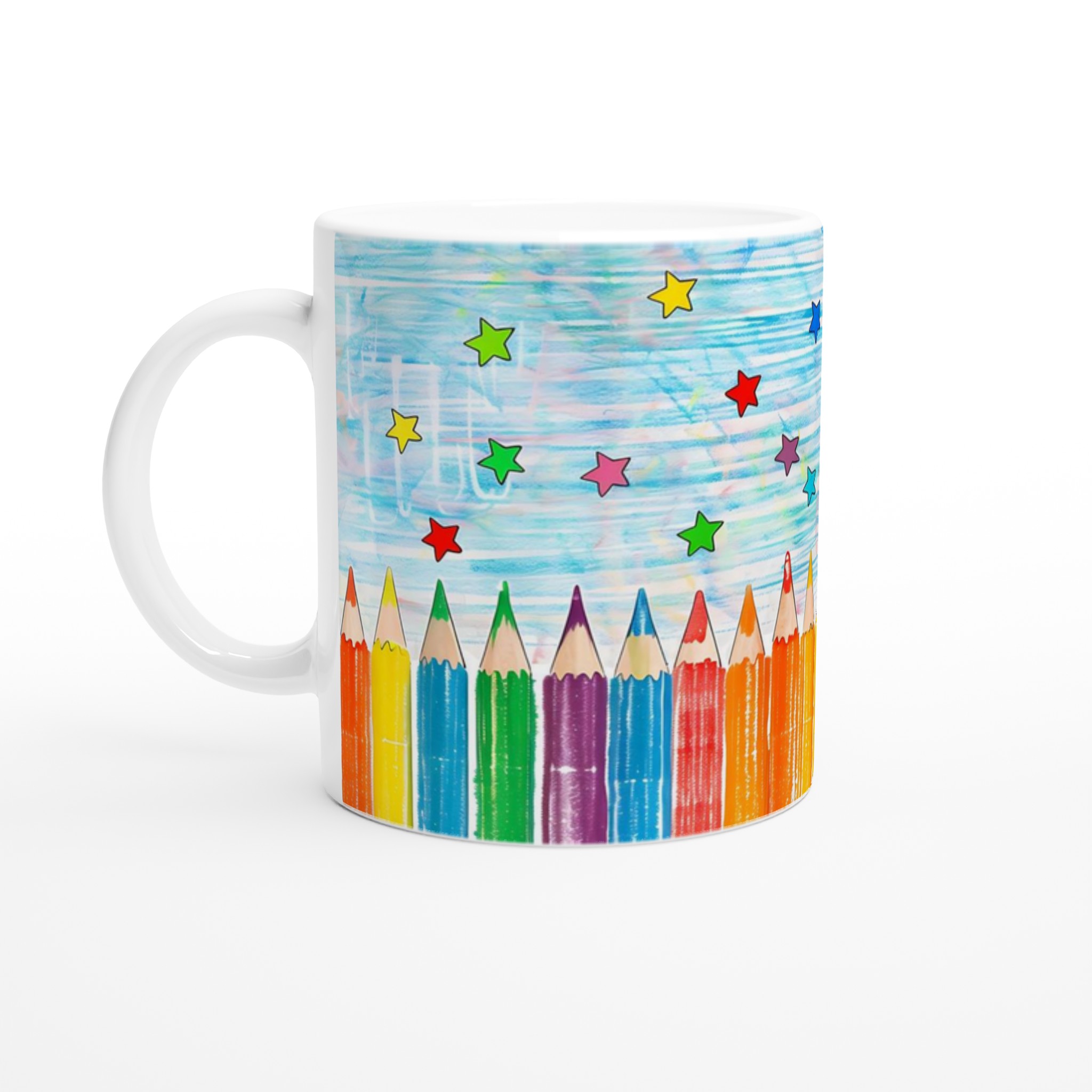 Väck barnasinnet med denna lekfulla keramiska mugg, prydd med en charmig design inspirerad av barns fantasifulla teckningar. Varje detalj, från de glada stjärnorna till den söta lilla flickan och de livfulla kritorna, skapar en känsla av glädje och nostalgi. Denna mugg blir snabbt en vardagsfavorit, perfekt för morgonkaffet, kvällens varma choklad eller när du bara vill njuta av en kopp te.
