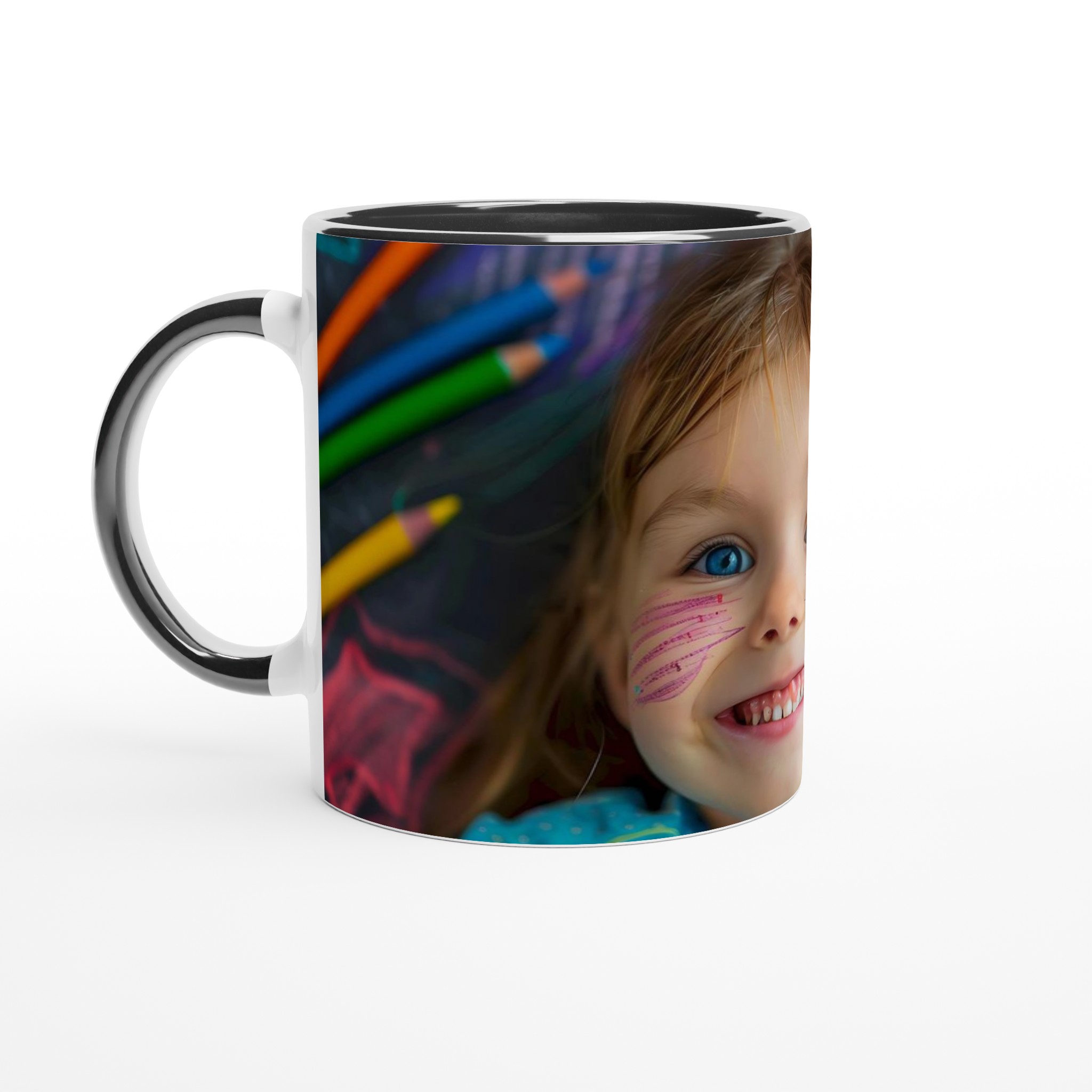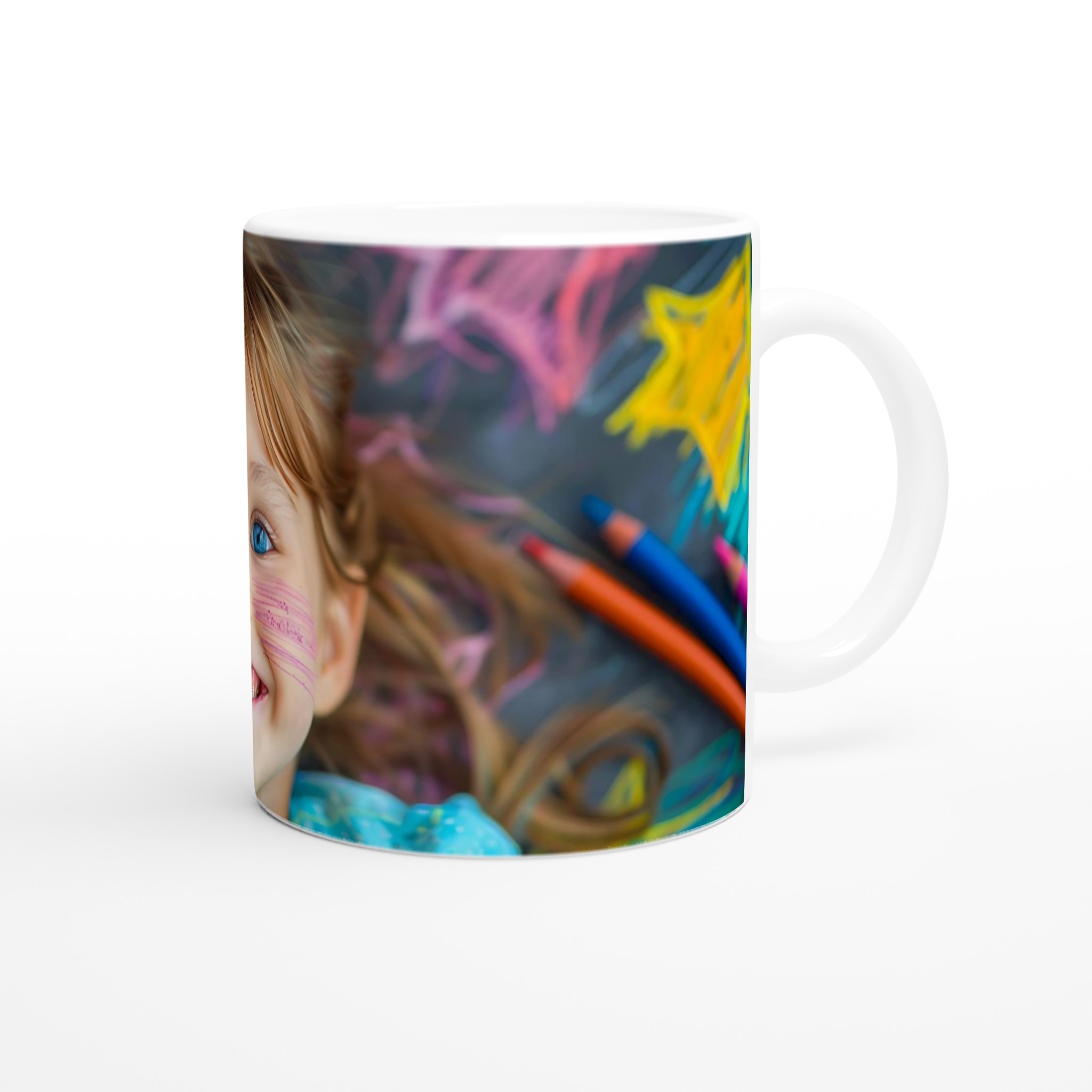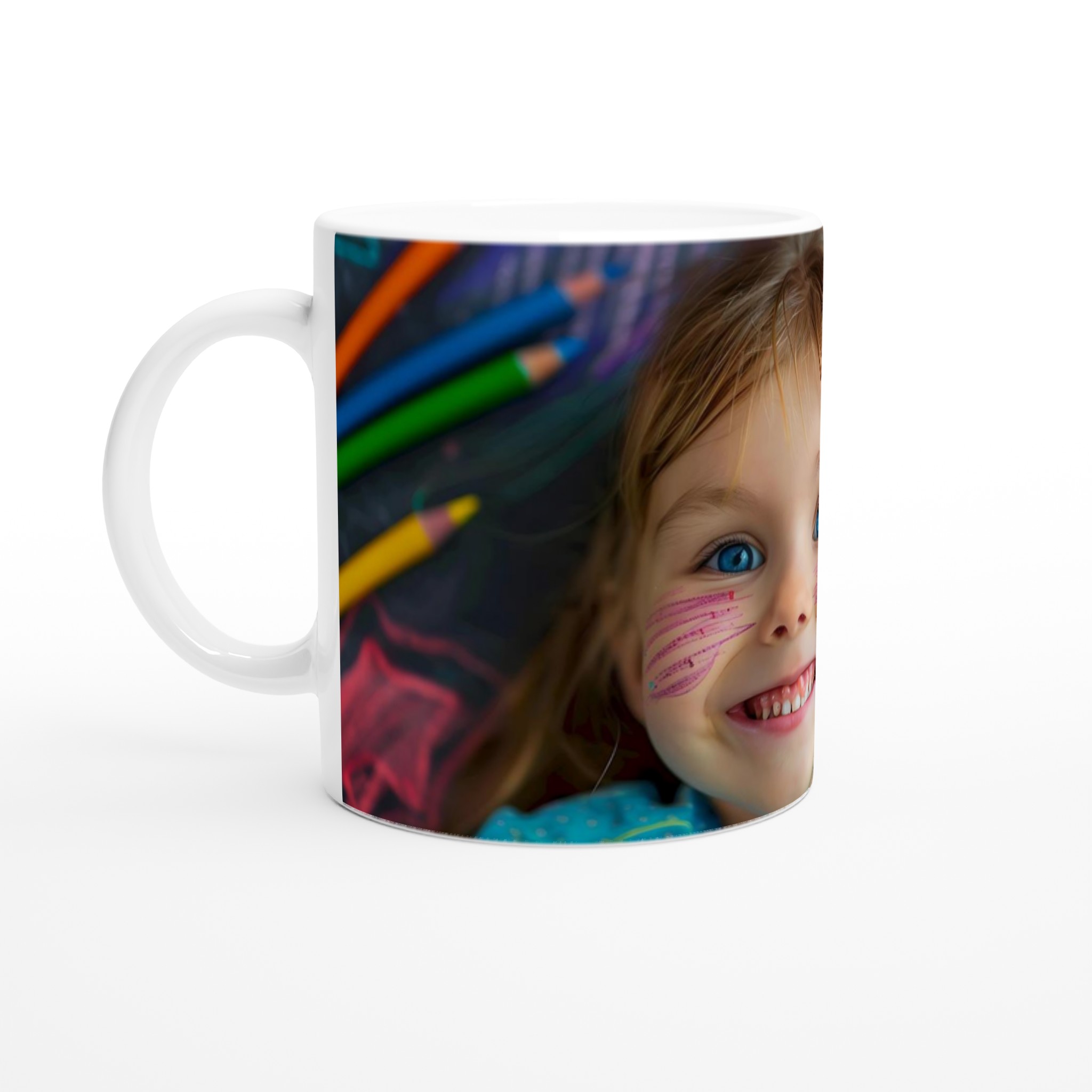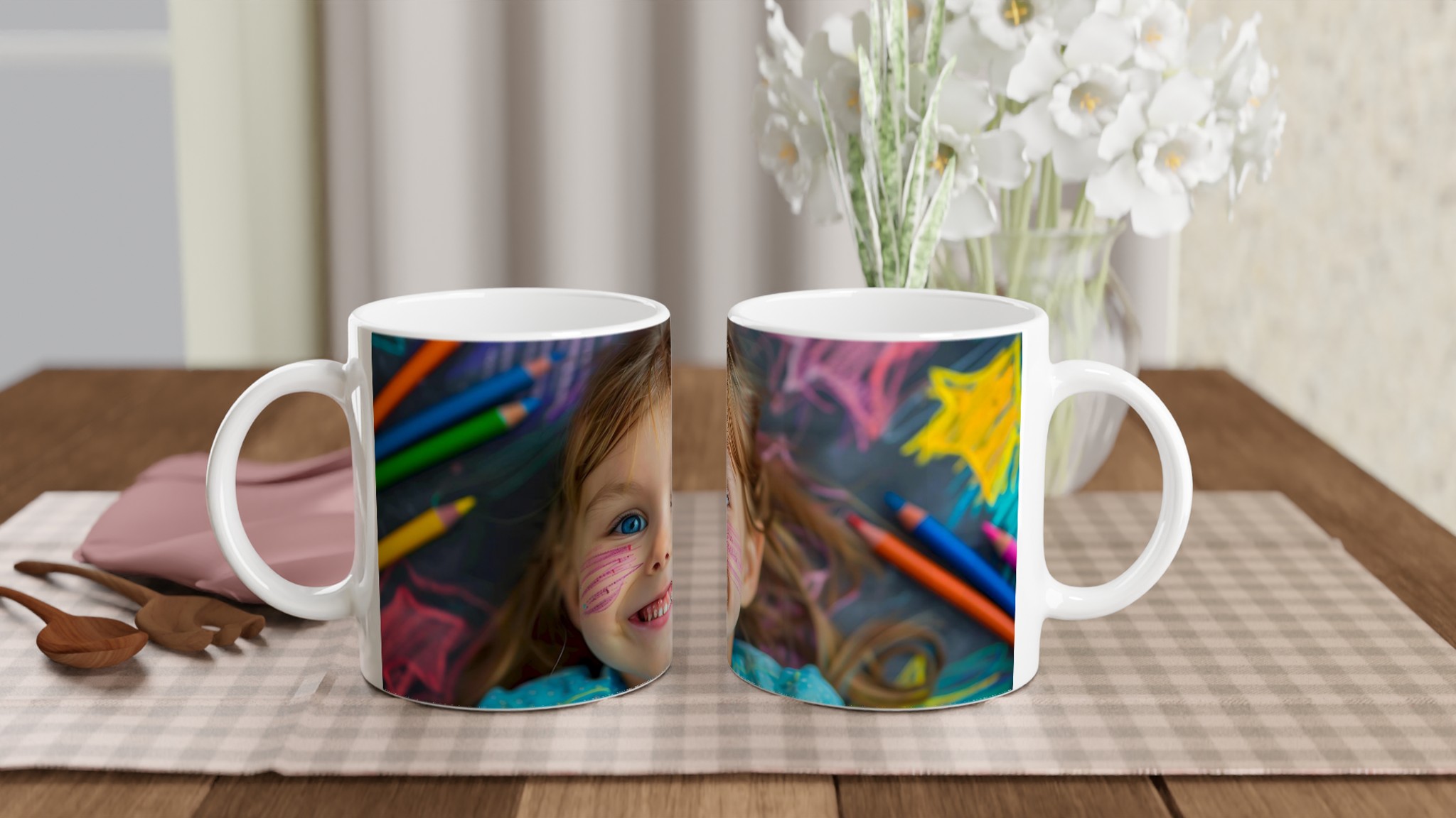 Lys upp din dag med vår glädjefulla keramiska mugg! Med en design som påminner om lekfull kreativitet och sprudlande fantasi, är denna mugg mer än bara en kopp – den är en daglig påminnelse om livets små, lyckliga stunder. Perfekt för morgonkaffet, kvällens varma choklad eller när du bara vill njuta av en kopp te. Den blanka ytan gör att trycken framhävs med klara och levande färger, som håller sig fina även efter många turer i mikron och diskmaskinen.