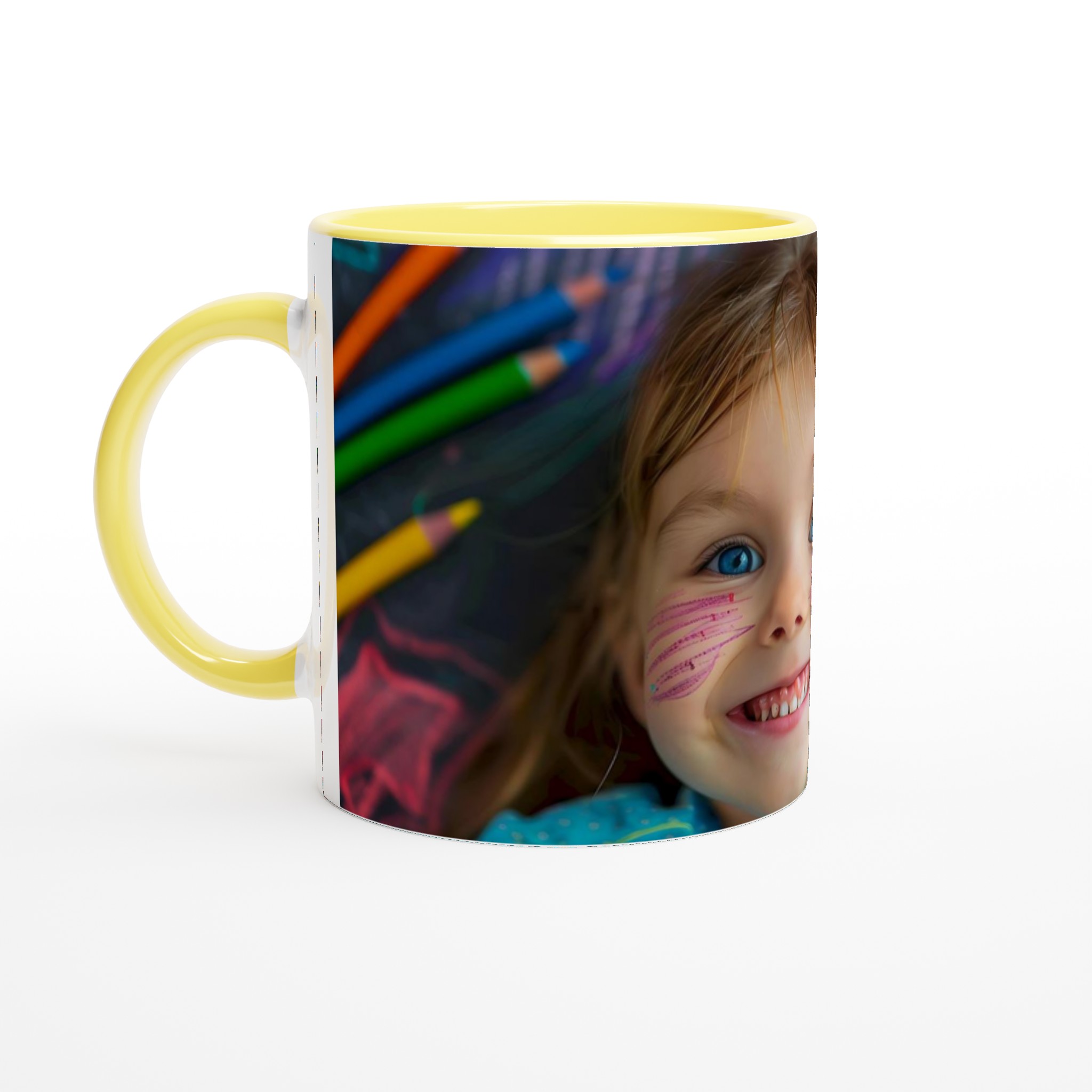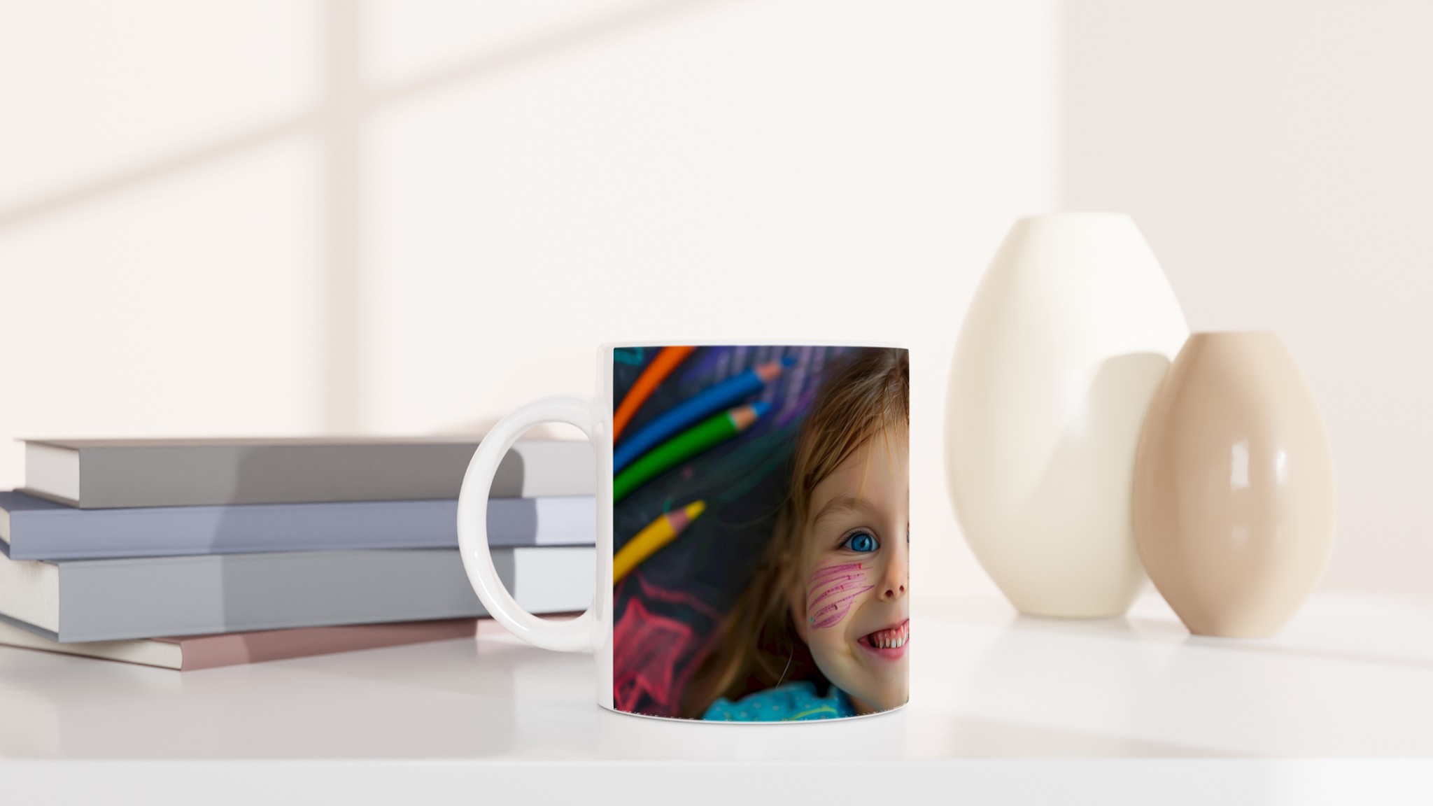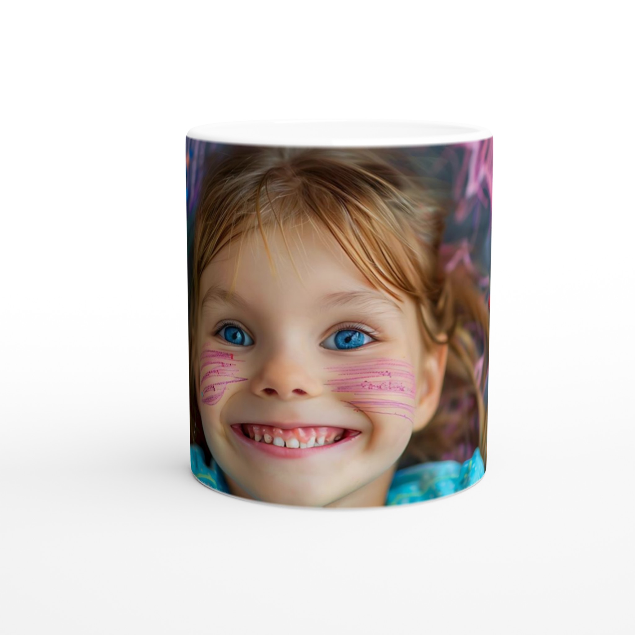 Lys upp din dag med vår glädjefulla keramiska mugg! Med en design som påminner om lekfull kreativitet och sprudlande fantasi, är denna mugg mer än bara en kopp – den är en daglig påminnelse om livets små, lyckliga stunder. Perfekt för morgonkaffet, kvällens varma choklad eller när du bara vill njuta av en kopp te. Den blanka ytan gör att trycken framhävs med klara och levande färger, som håller sig fina även efter många turer i mikron och diskmaskinen.