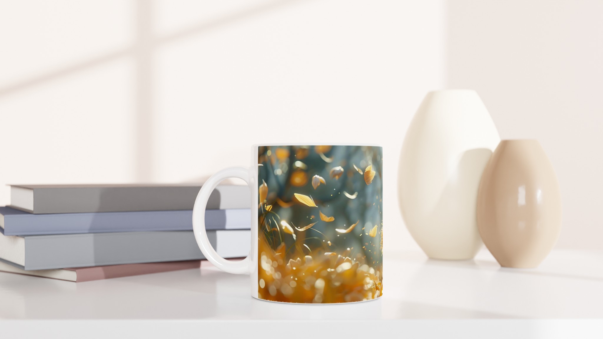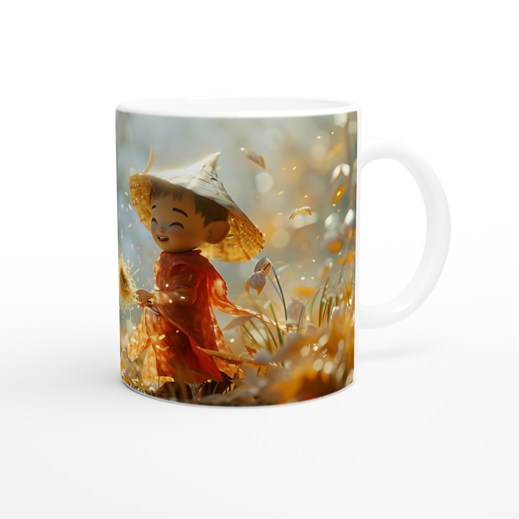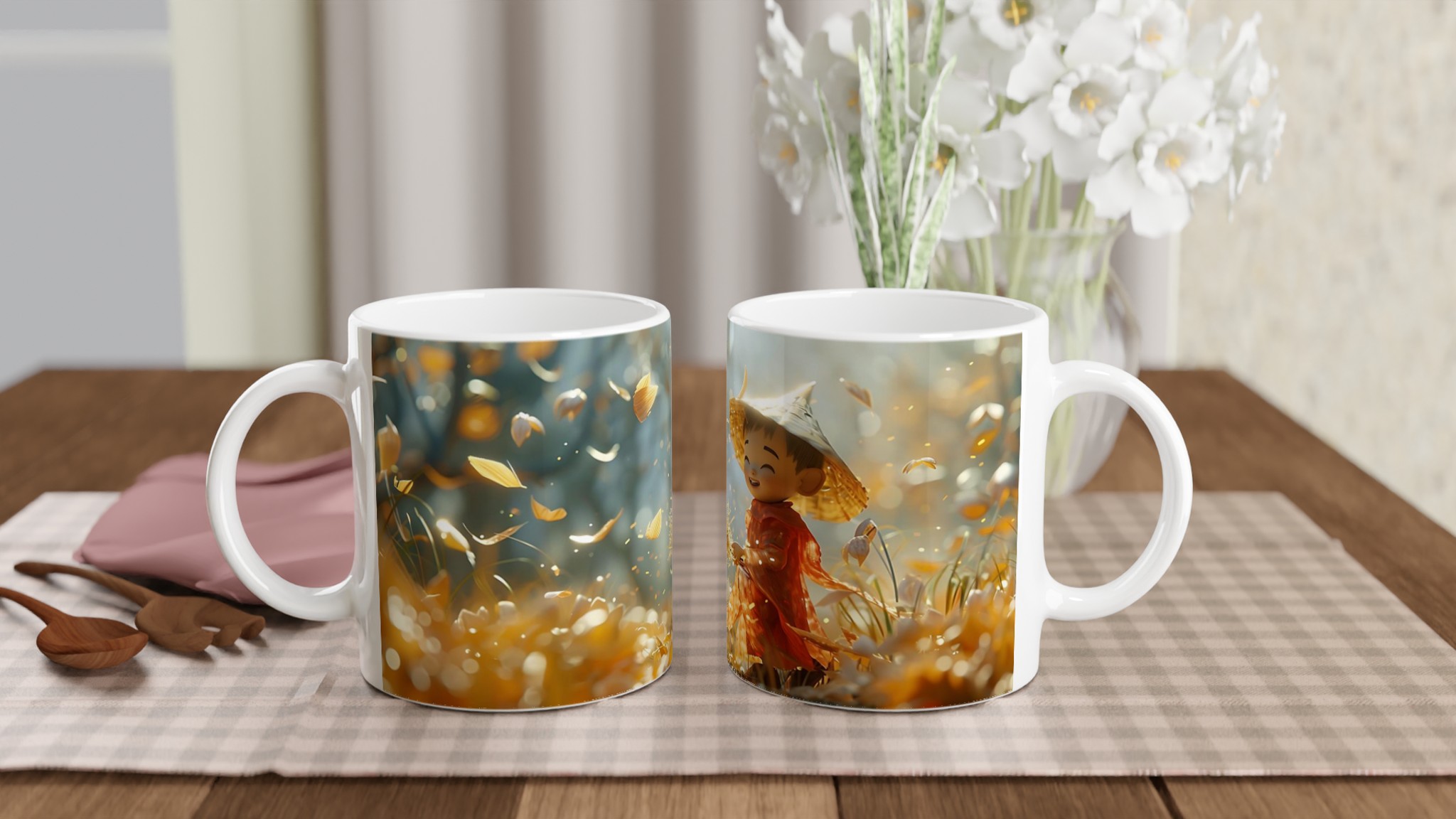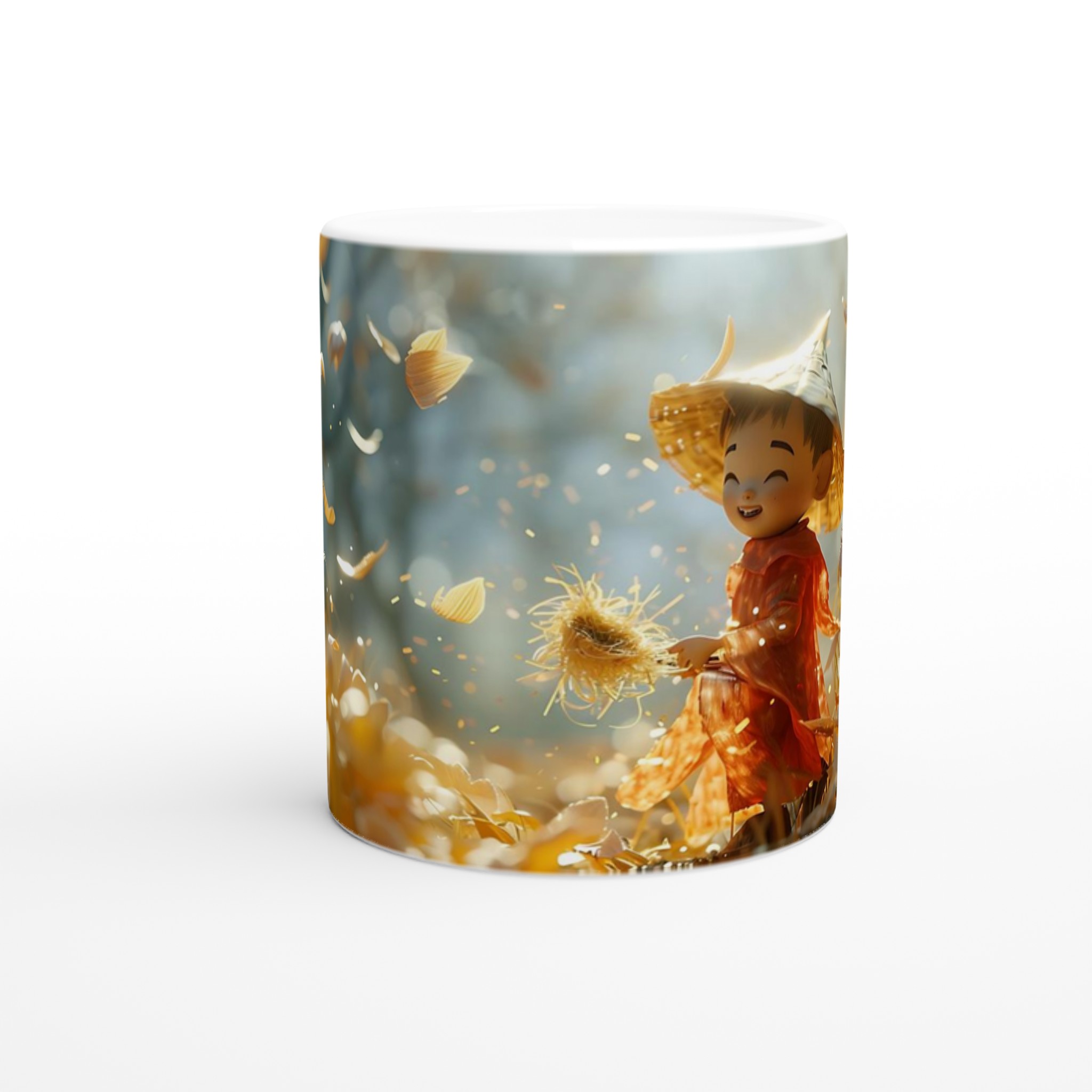 Låt dig förtrollas av denna charmiga keramiska mugg, som fångar ögonblicket av ren glädje och lekfullhet. Den föreställer en lycklig figur omgiven av gyllene löv och solsken, vilket sprider en värmande känsla vid varje användning. Perfekt för morgonkaffet, kvällens varma choklad eller när du bara vill njuta av en kopp te och drömma dig bort till en värld fylld av skratt och fantasi.