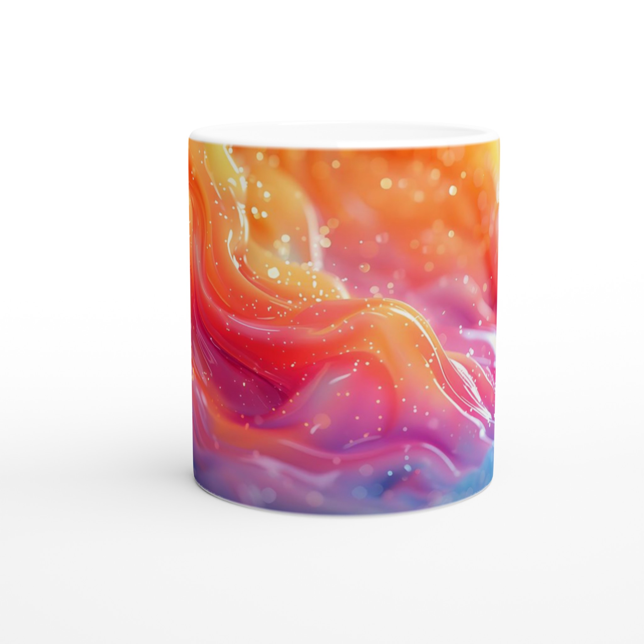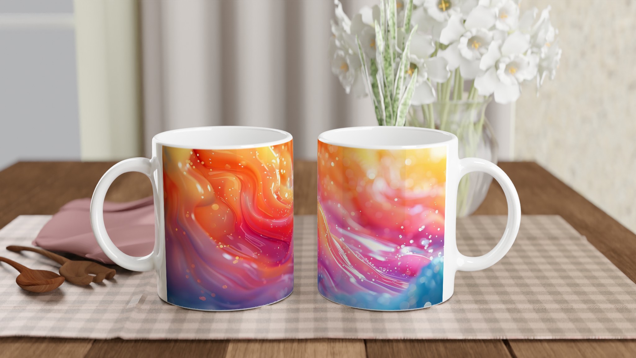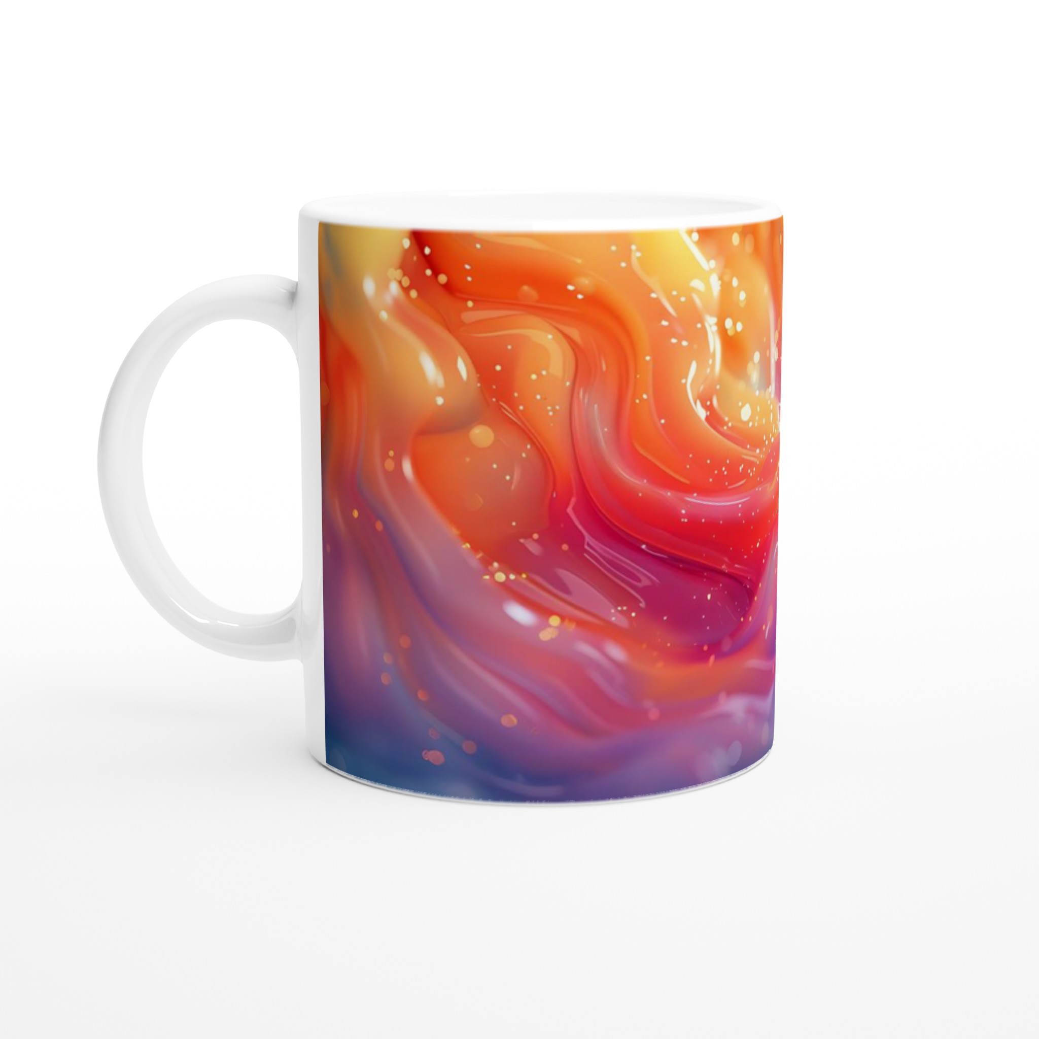 Föreställ dig att du omfamnas av en glittrande solnedgång varje gång du tar en klunk! Denna stilrena och vackra keramikmugg, inspirerad av den fängslande blandningen av varma och svala nyanser, är perfekt för alla dagens stunder – morgonkaffet, en värmande kopp te eller en härlig varm choklad. Den blanka vita ytan gör att trycken framträder klart och färgstarkt, vilket gör muggen till en riktig favorit i vardagen. Varje färgval förstärker den drömska glöden och den flytande elegansen från ett skimrande skymningslandskap.