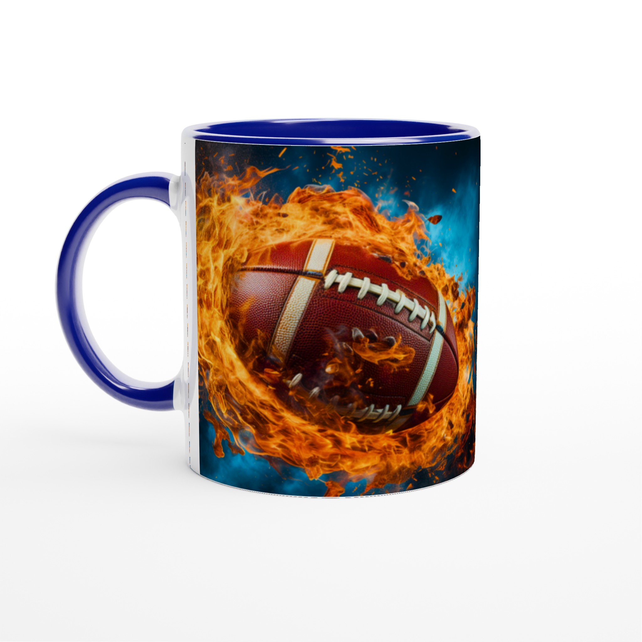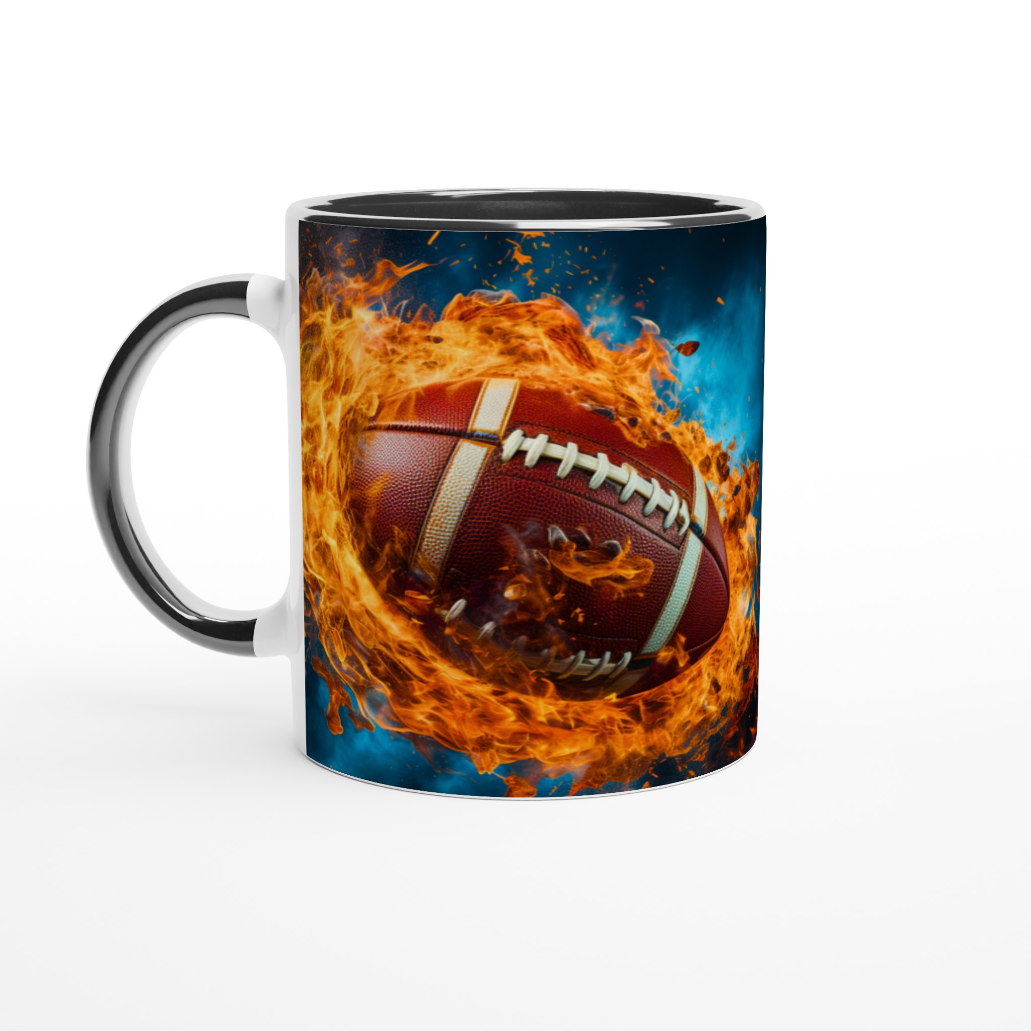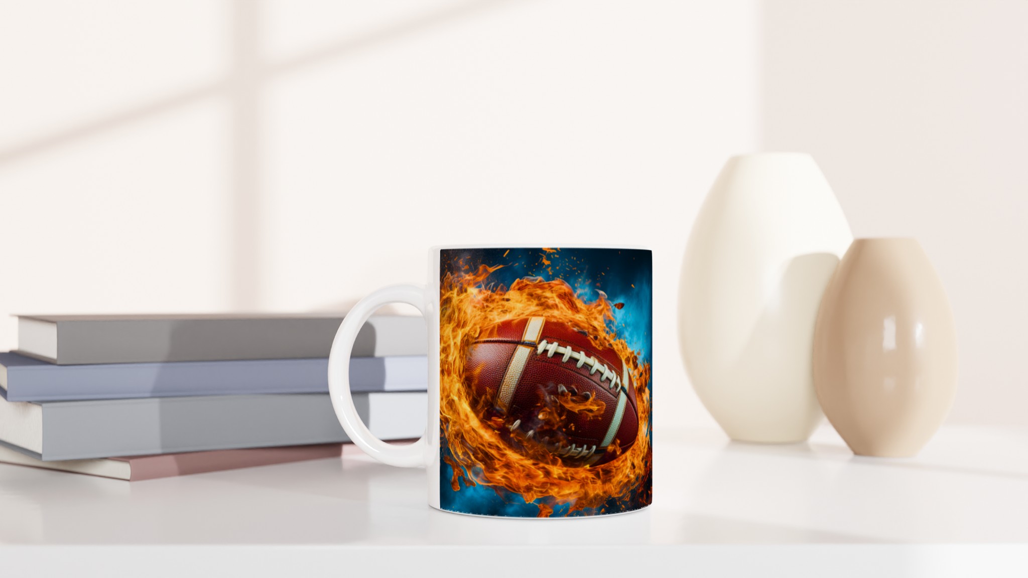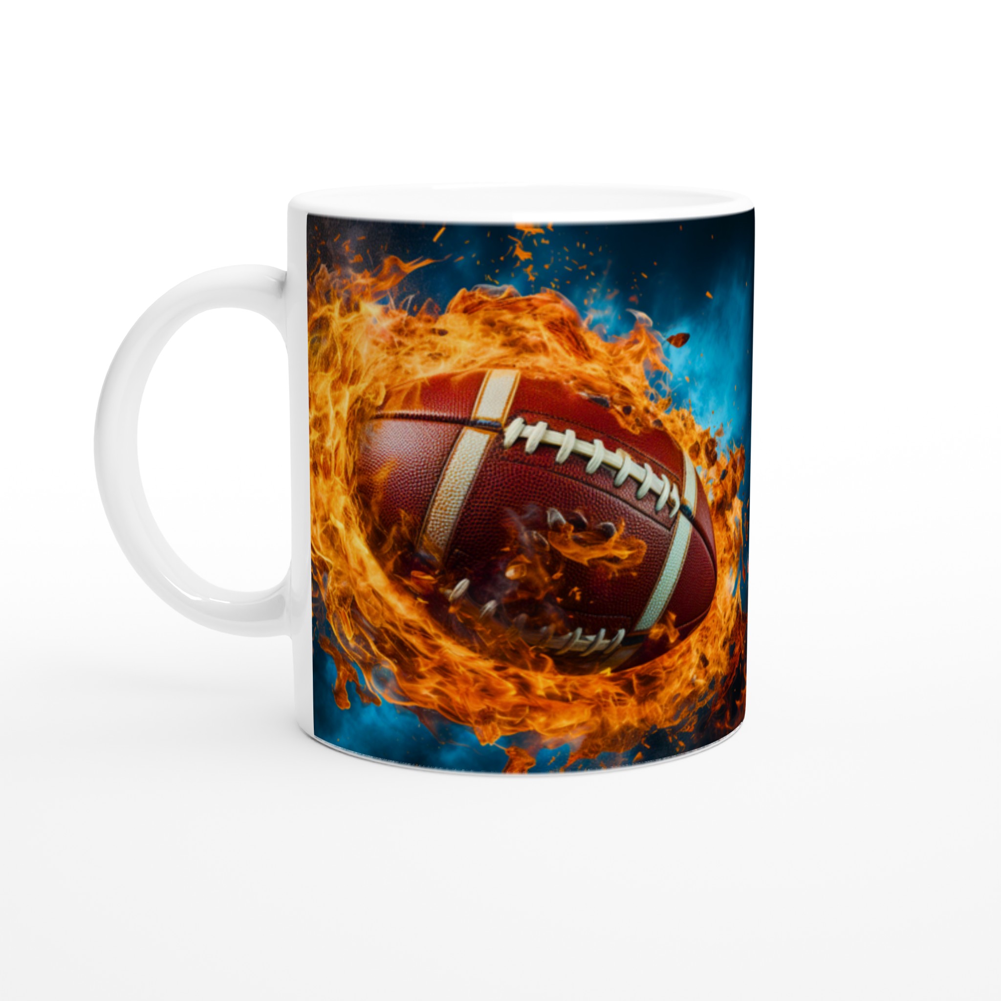 Tänd din passion för sport med denna dynamiska keramiska mugg, inspirerad av den glödande intensiteten i amerikansk fotboll. Perfekt för att värma upp inför matchdagen med ditt morgonkaffe, varma choklad under kvällens sena matcher, eller när du bara vill njuta av en kopp te medan du drömmer om touchdowns. Den blanka ytan framhäver trycket med klara och levande färger, som håller sig fina även efter många turer i mikron och diskmaskinen.