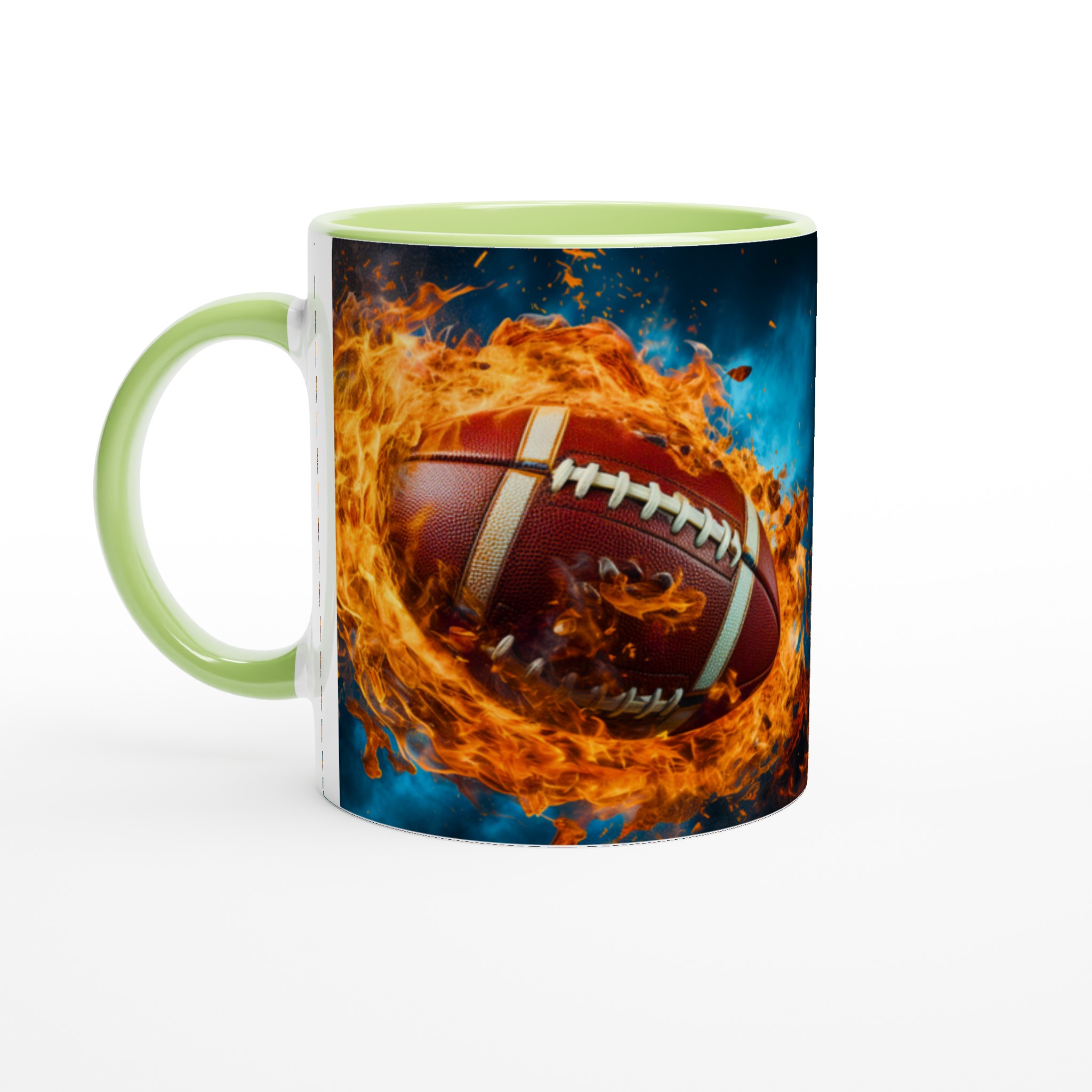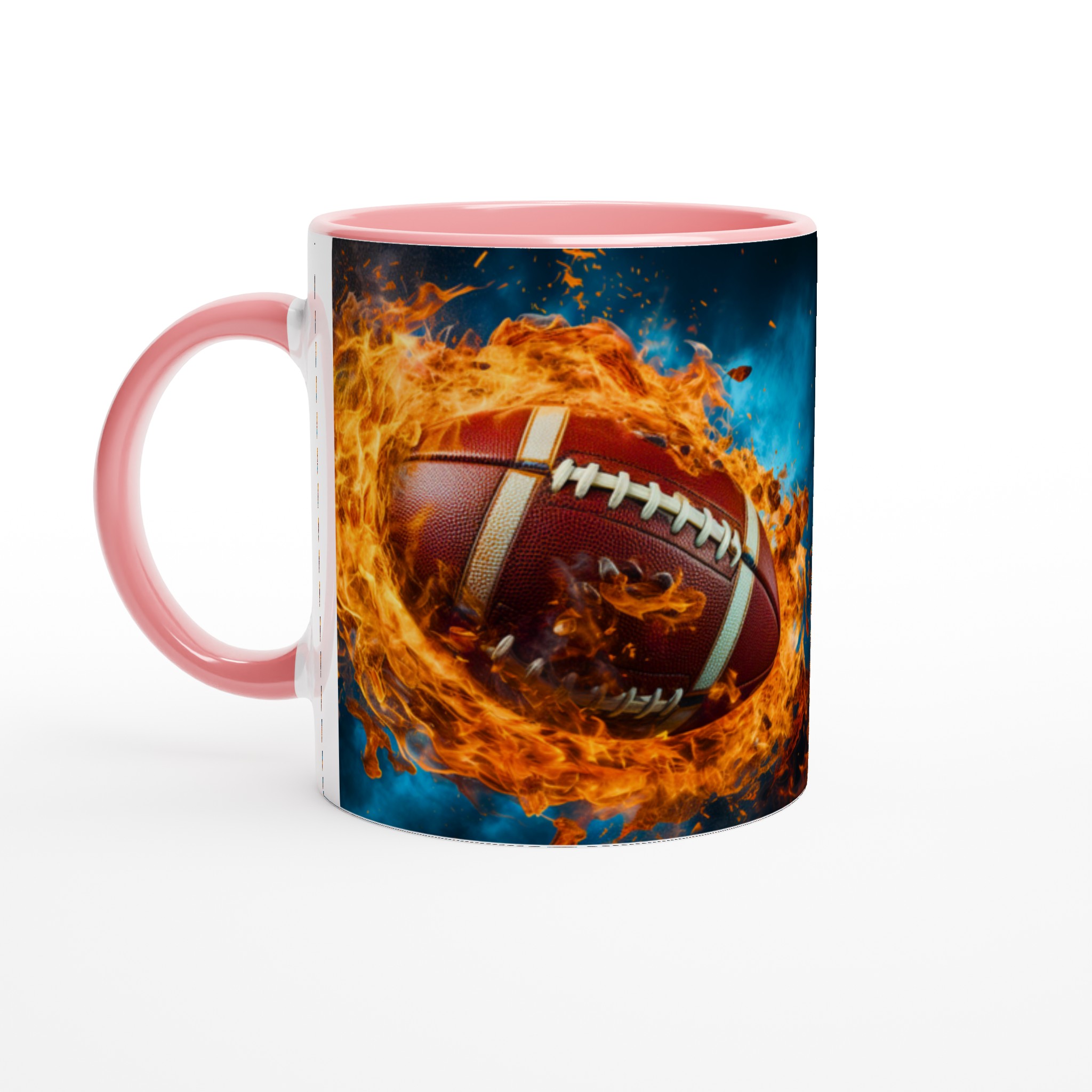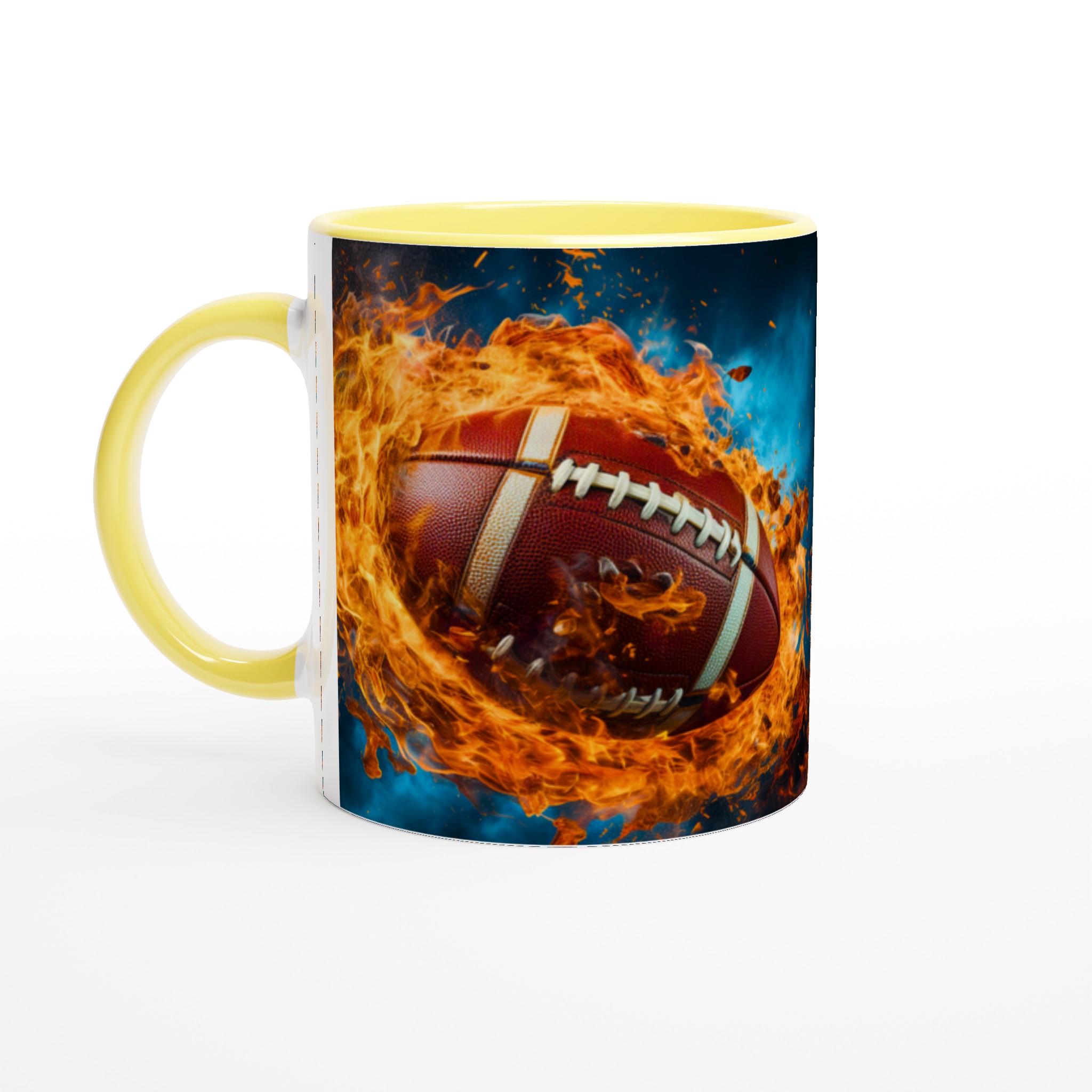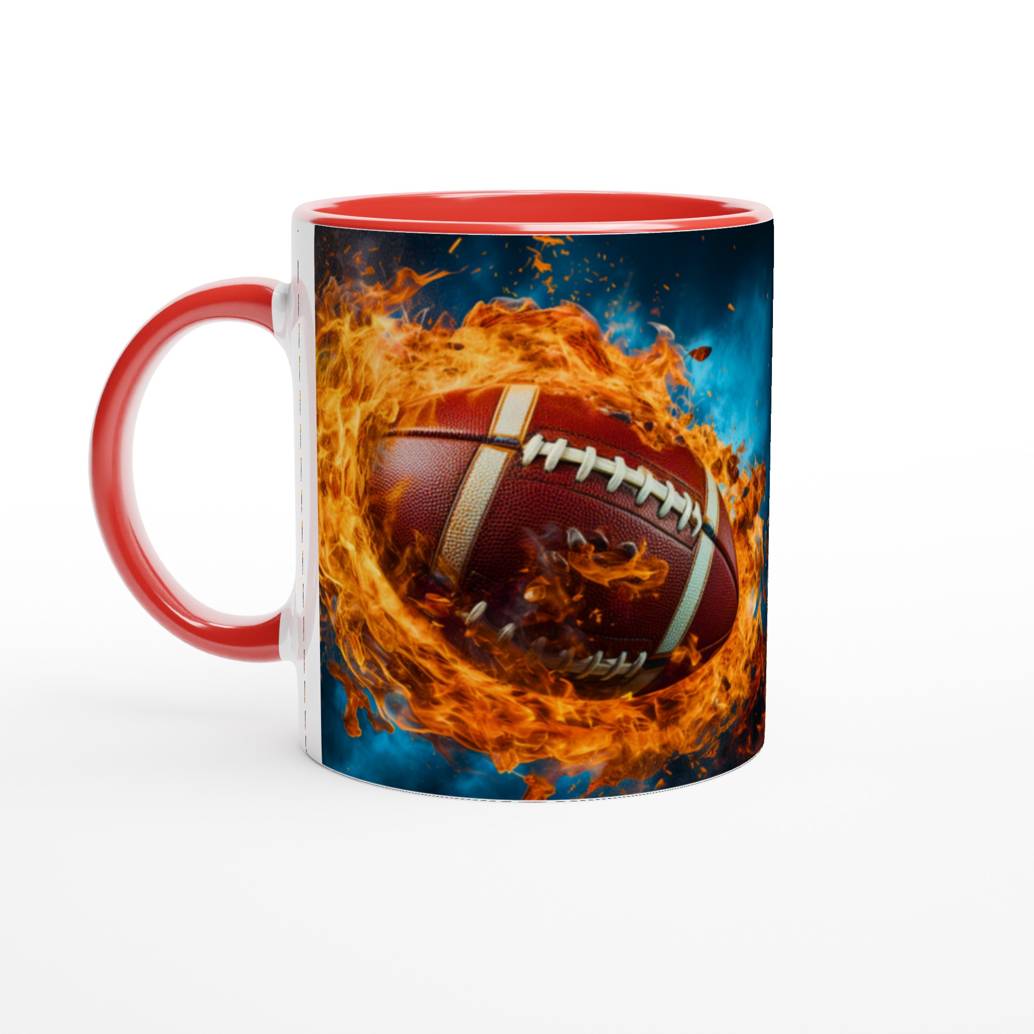 Tänd din passion för sport med denna dynamiska keramiska mugg, inspirerad av den glödande intensiteten i amerikansk fotboll. Perfekt för att värma upp inför matchdagen med ditt morgonkaffe, varma choklad under kvällens sena matcher, eller när du bara vill njuta av en kopp te medan du drömmer om touchdowns. Den blanka ytan framhäver trycket med klara och levande färger, som håller sig fina även efter många turer i mikron och diskmaskinen.