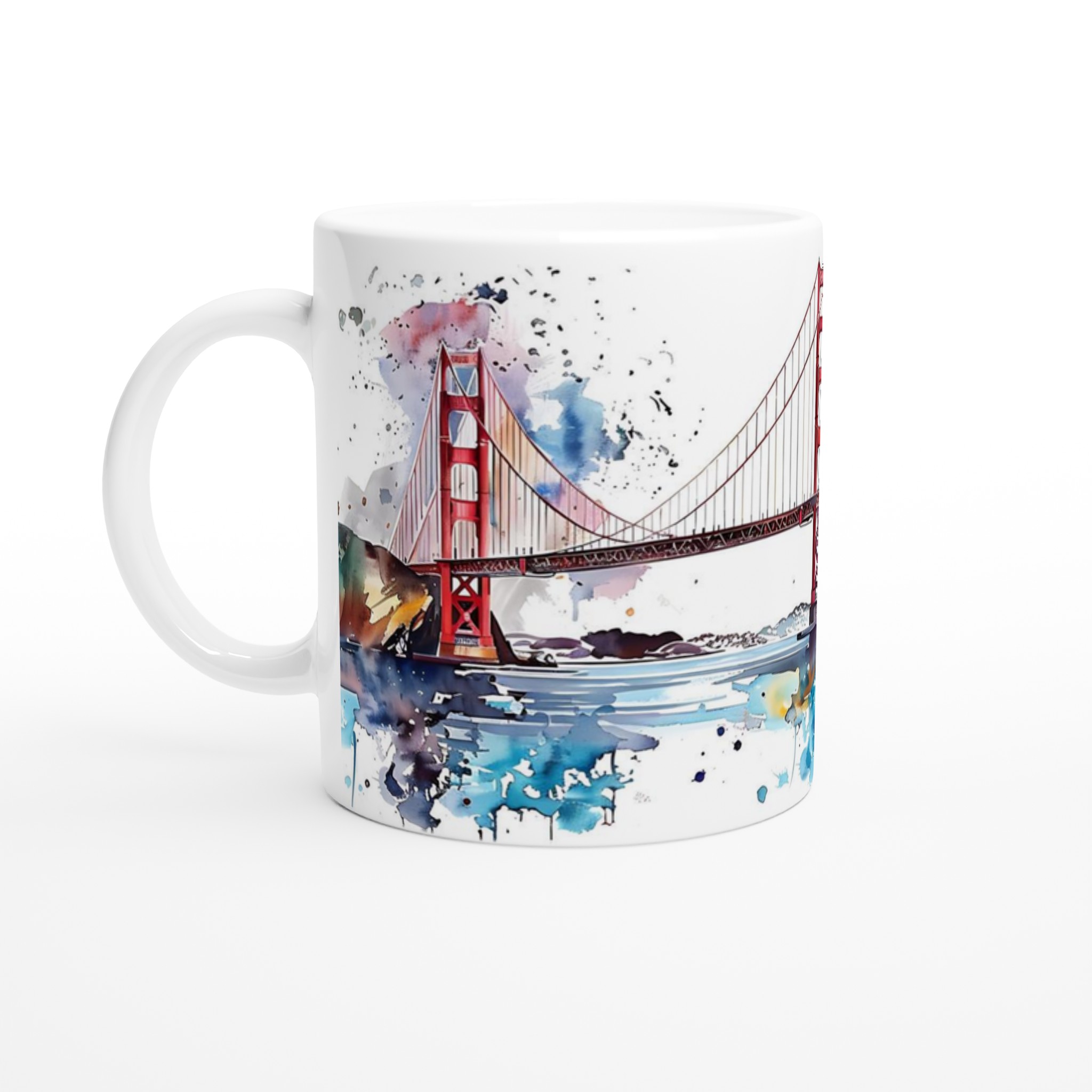 Denna unika mugg fångar den ikoniska Golden Gate-brons majestätiska skönhet i en livfull akvarellstil, med dramatiska färgstänk i rött, blått och guld som speglar San Franciscos dynamiska anda. Den blanka vita ytan ger ett skarpt och levande tryck som verkligen sticker ut, oavsett om det är en personlig design, ett roligt citat eller en present till någon du tycker om. Välj bland en palett av sju jordnära och klassiska keramiska nyanser för att perfekt matcha din stil eller inredning: tidlös Ceramic White, solig Ceramic Yellow, mjuk Ceramic Pink, lugn Ceramic Green, passionerad Ceramic Red, elegant Ceramic Black eller djup Ceramic Blue.