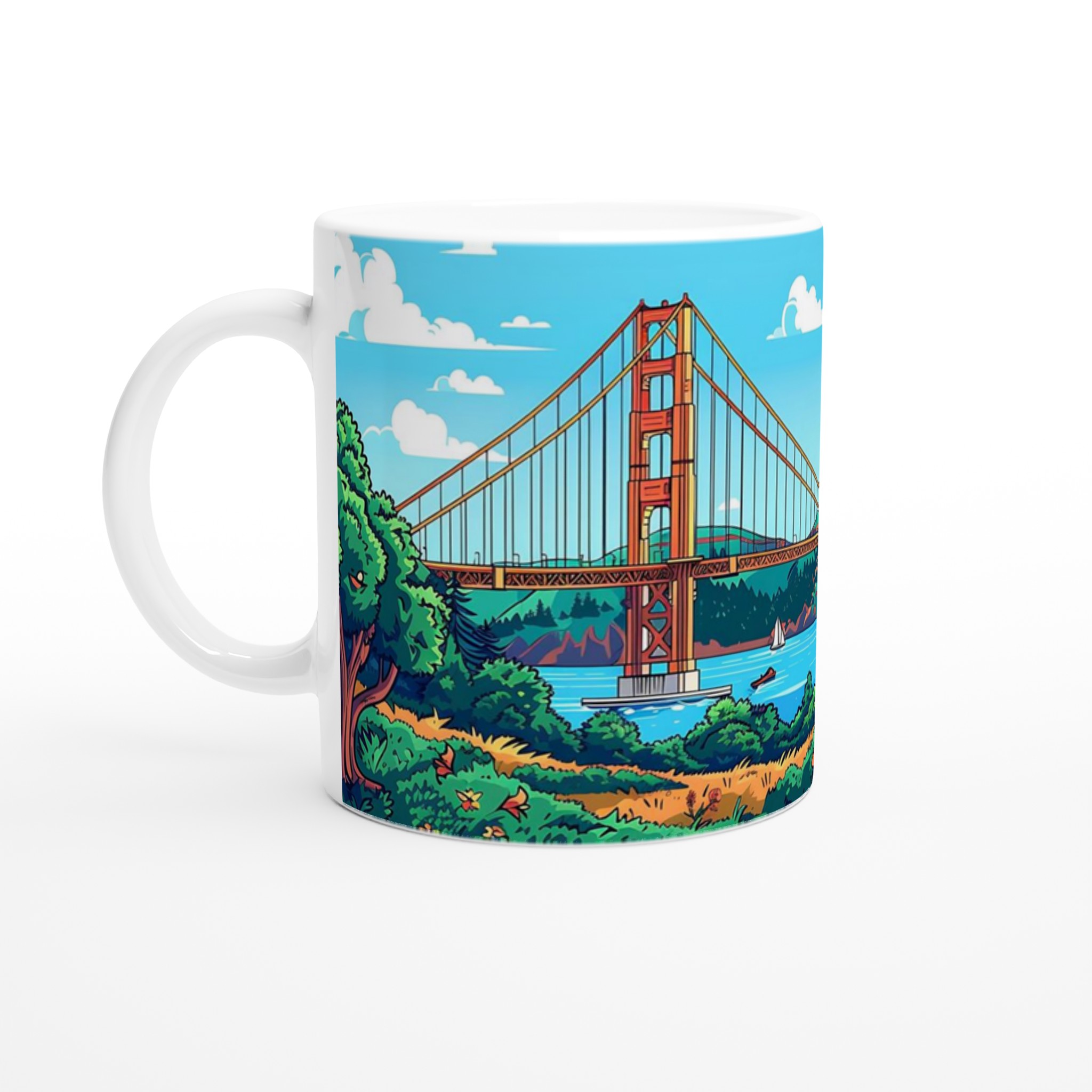Inspirerad av den ikoniska Golden Gate-bron i en charmig tecknad stil, fylld med levande gröna kullar, azurblått vatten och en klarblå himmel, ger denna mugg en lekfull och upplyftande känsla till din dag. Den blanka vita ytan ger ett skarpt och levande tryck som verkligen sticker ut, oavsett om det är en personlig design, ett roligt citat eller en present till någon du tycker om.