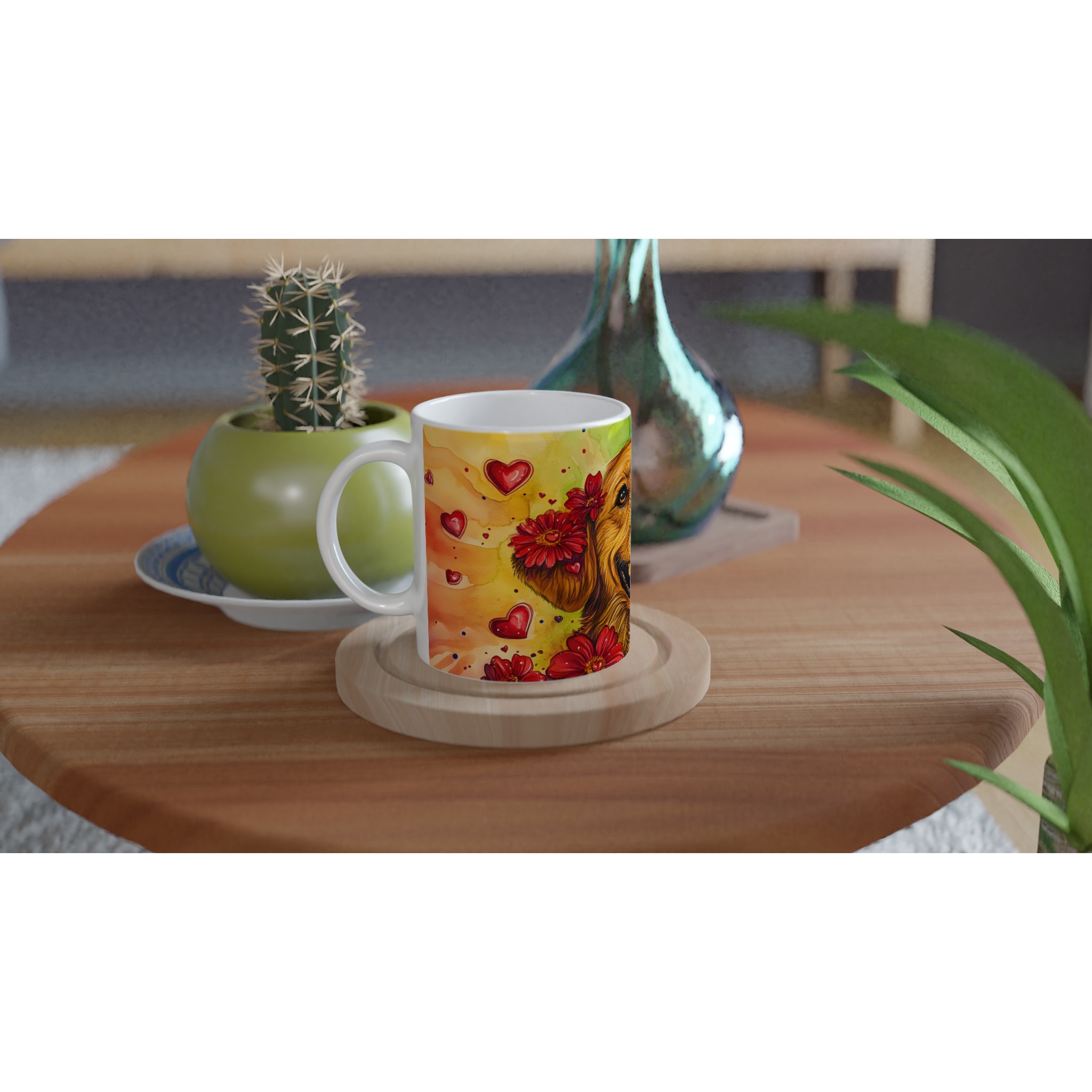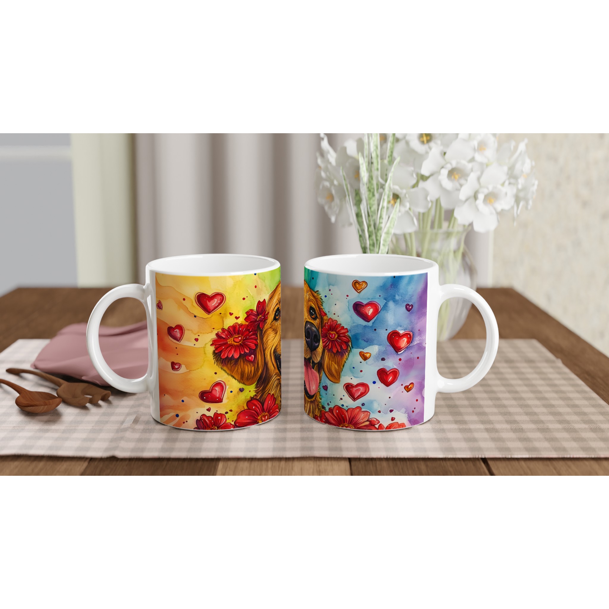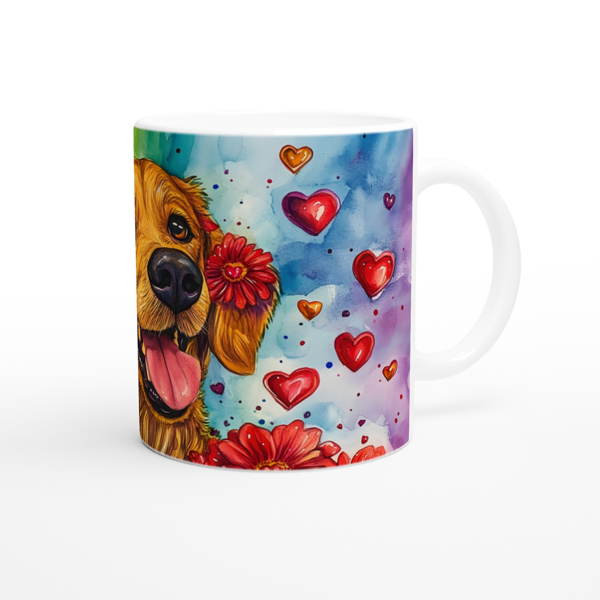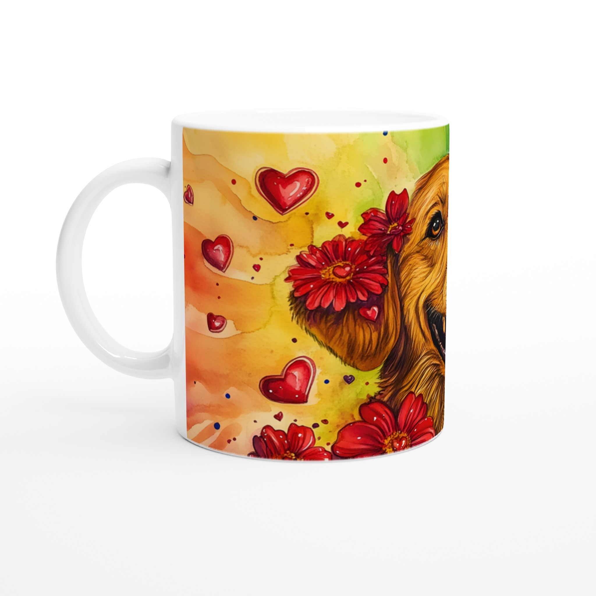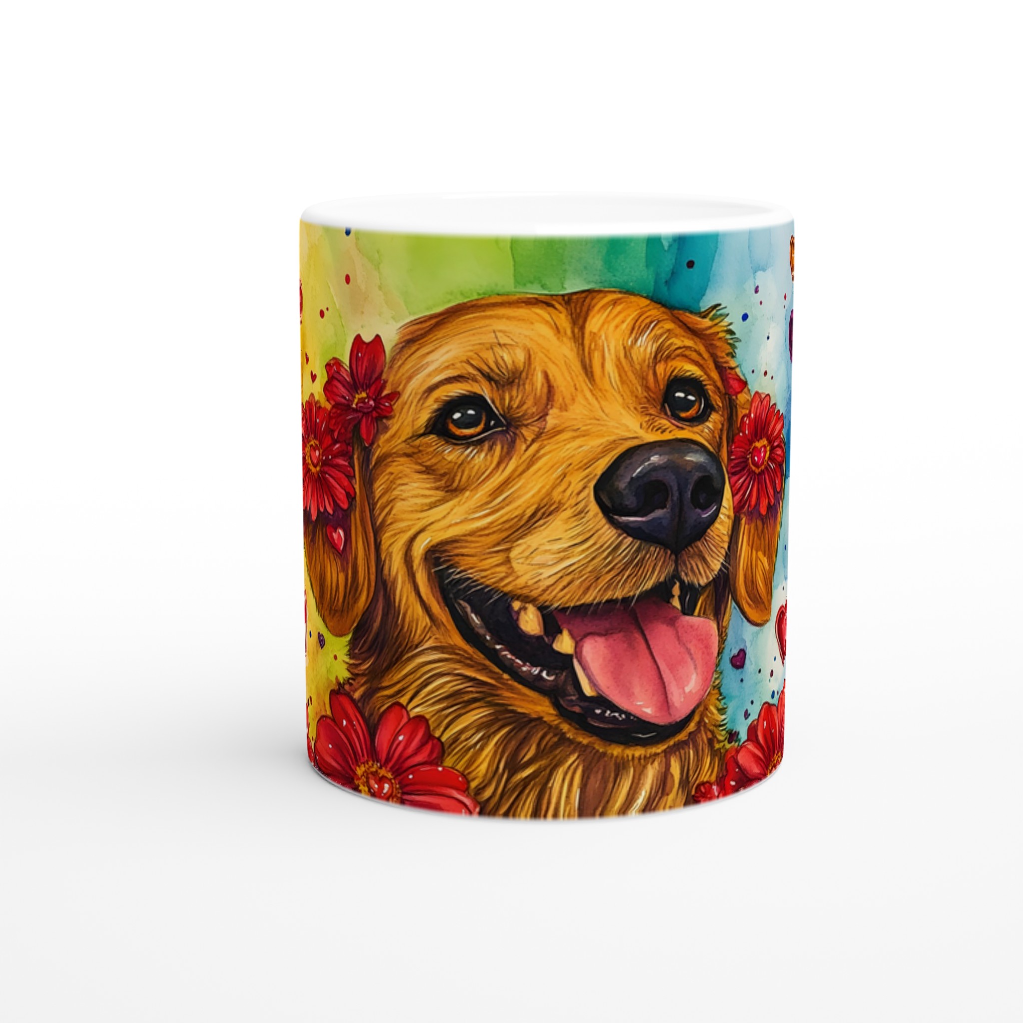 Lys upp din dag med vår Golden Retriever Kärlek keramikmugg! Denna underbara mugg, prydd med en strålande glad Golden Retriever omgiven av röda blommor och svävande hjärtan mot en färgsprakande akvarellbakgrund, är en hyllning till glädje och kärlek. Perfekt för alla dagens stunder – morgonkaffet, en värmande kopp te eller en härlig varm choklad. Varje detalj i akvarelldesignen framträder klart och färgstarkt på den blanka vita ytan, vilket gör muggen till en riktig favorit i vardagen och en omedelbar glädjespridare.