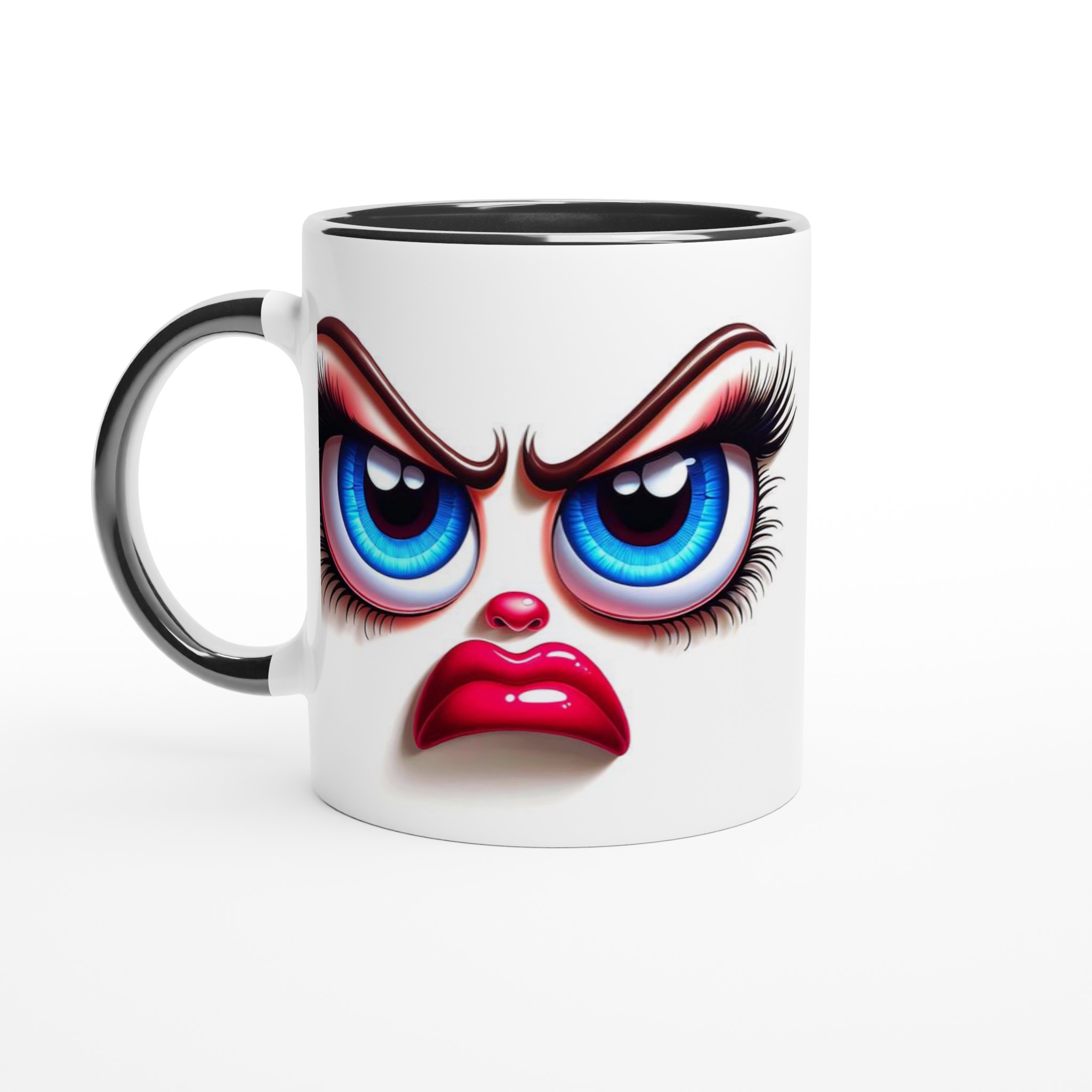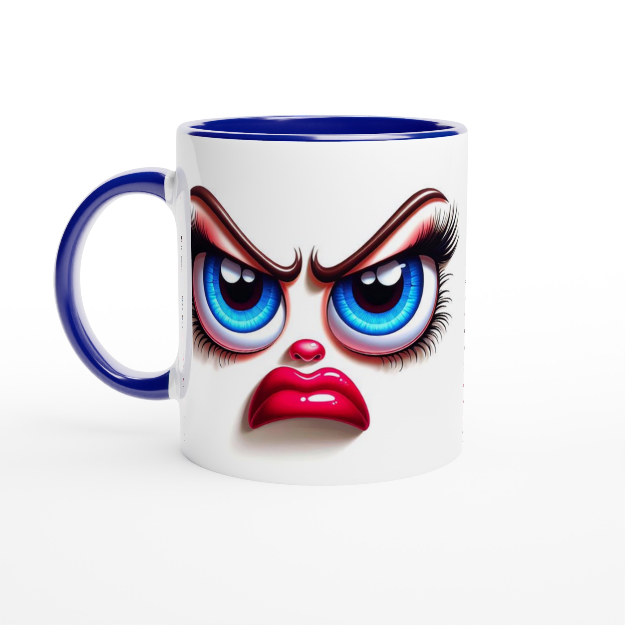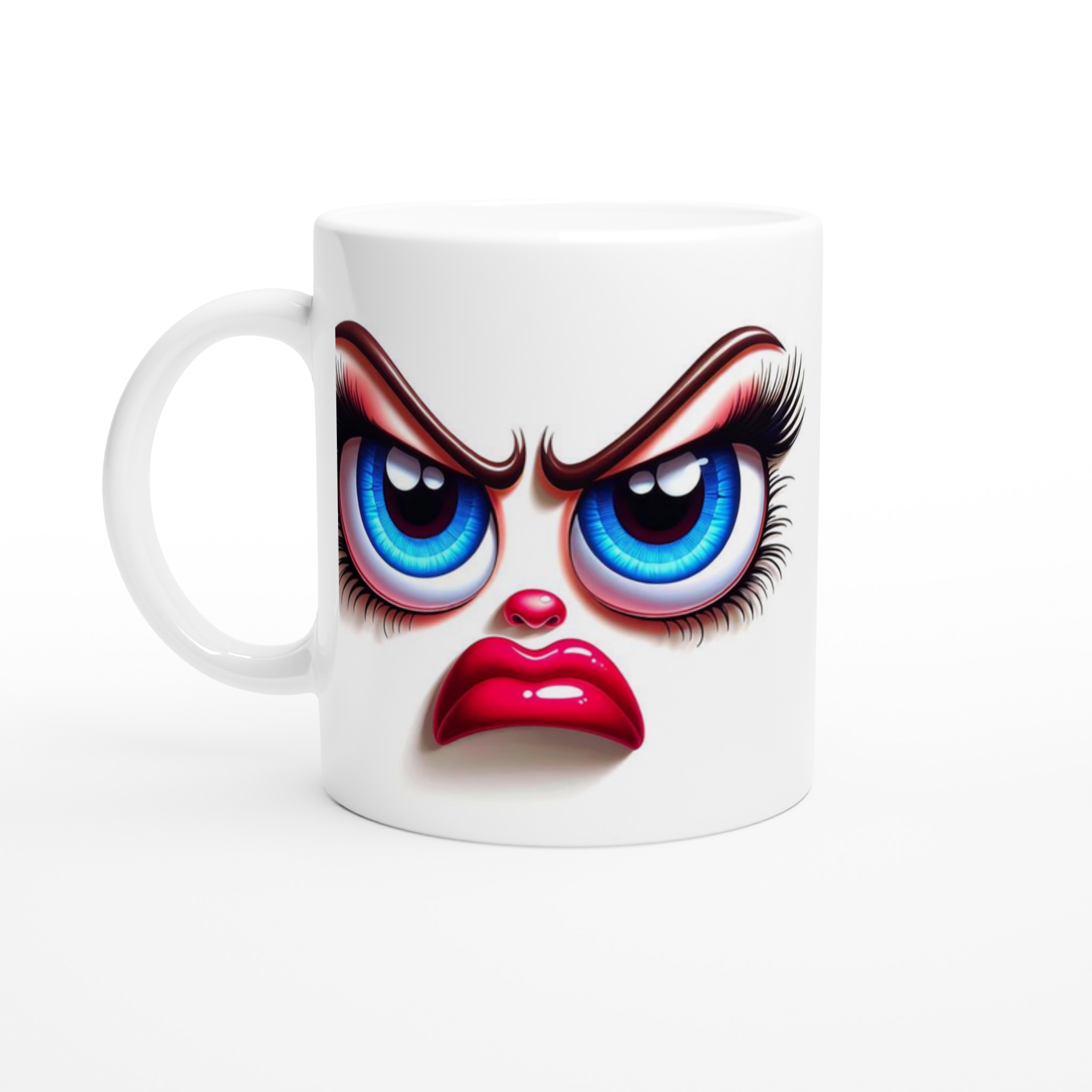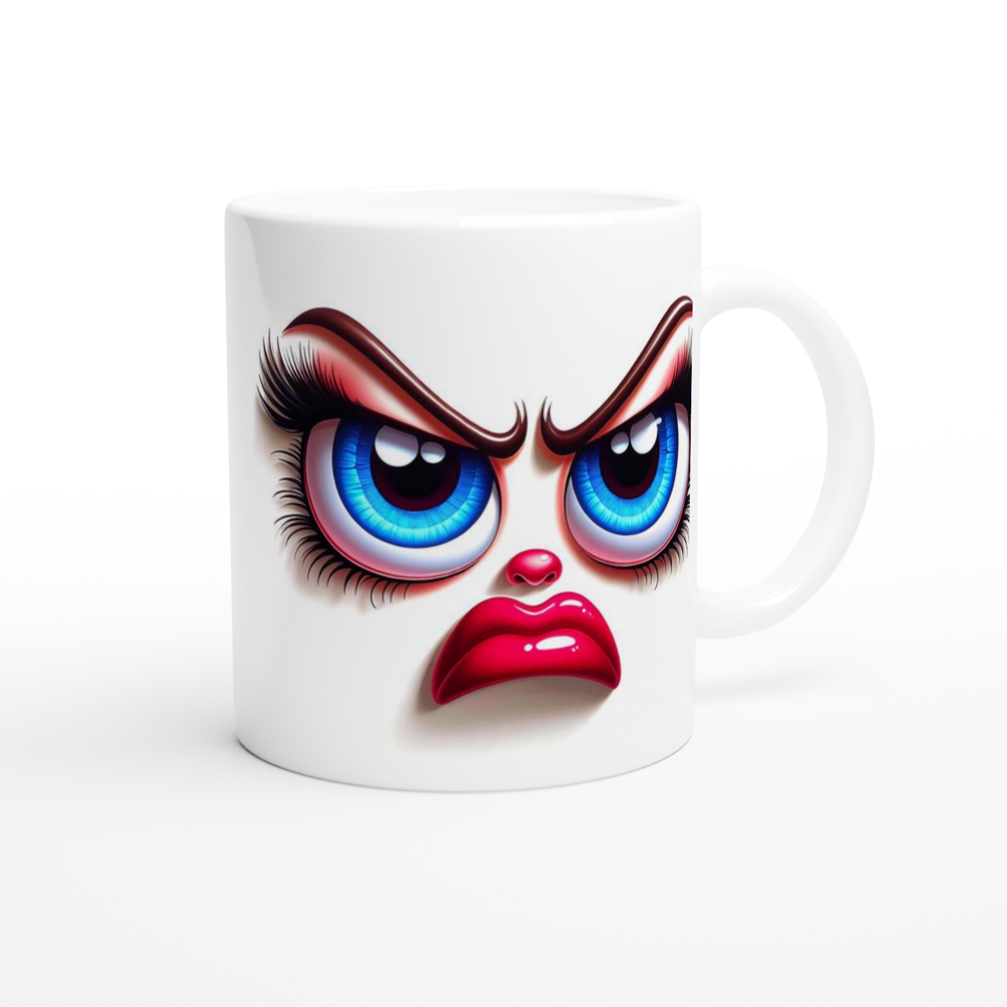 Denna mugg är perfekt för dig som gillar att uttrycka dig med en glimt i ögat! Med ett unikt och humoristiskt ”grumpy glamour”-ansikte med uttrycksfulla blå ögon och pussmun, kommer denna mugg garanterat att väcka uppmärksamhet och sprida glädje – eller åtminstone ett leende. Den blanka vita ytan ger ett skarpt och levande tryck som verkligen sticker ut, oavsett om det är en personlig design, ett roligt citat eller en present till någon du tycker om.