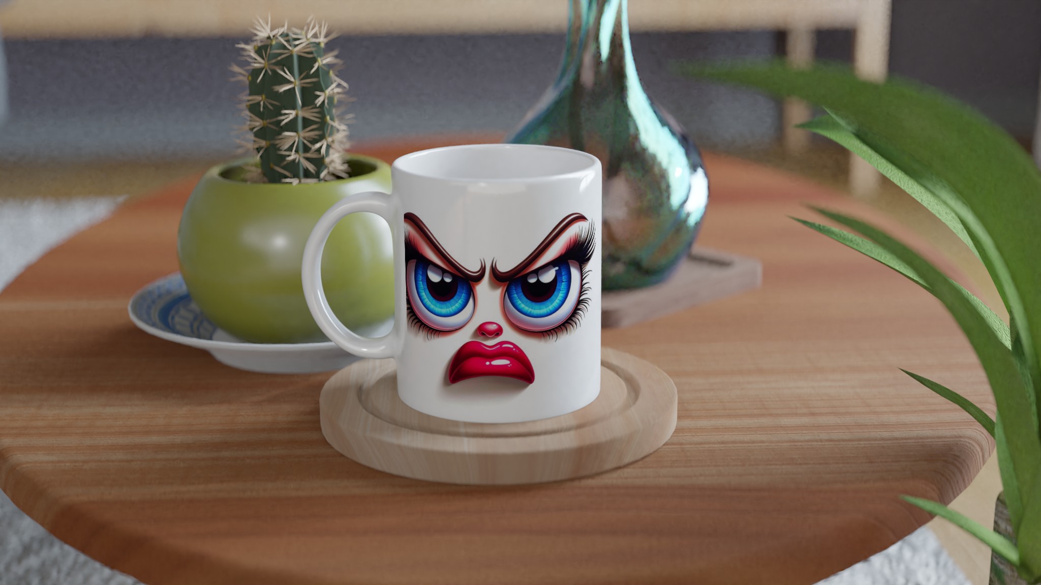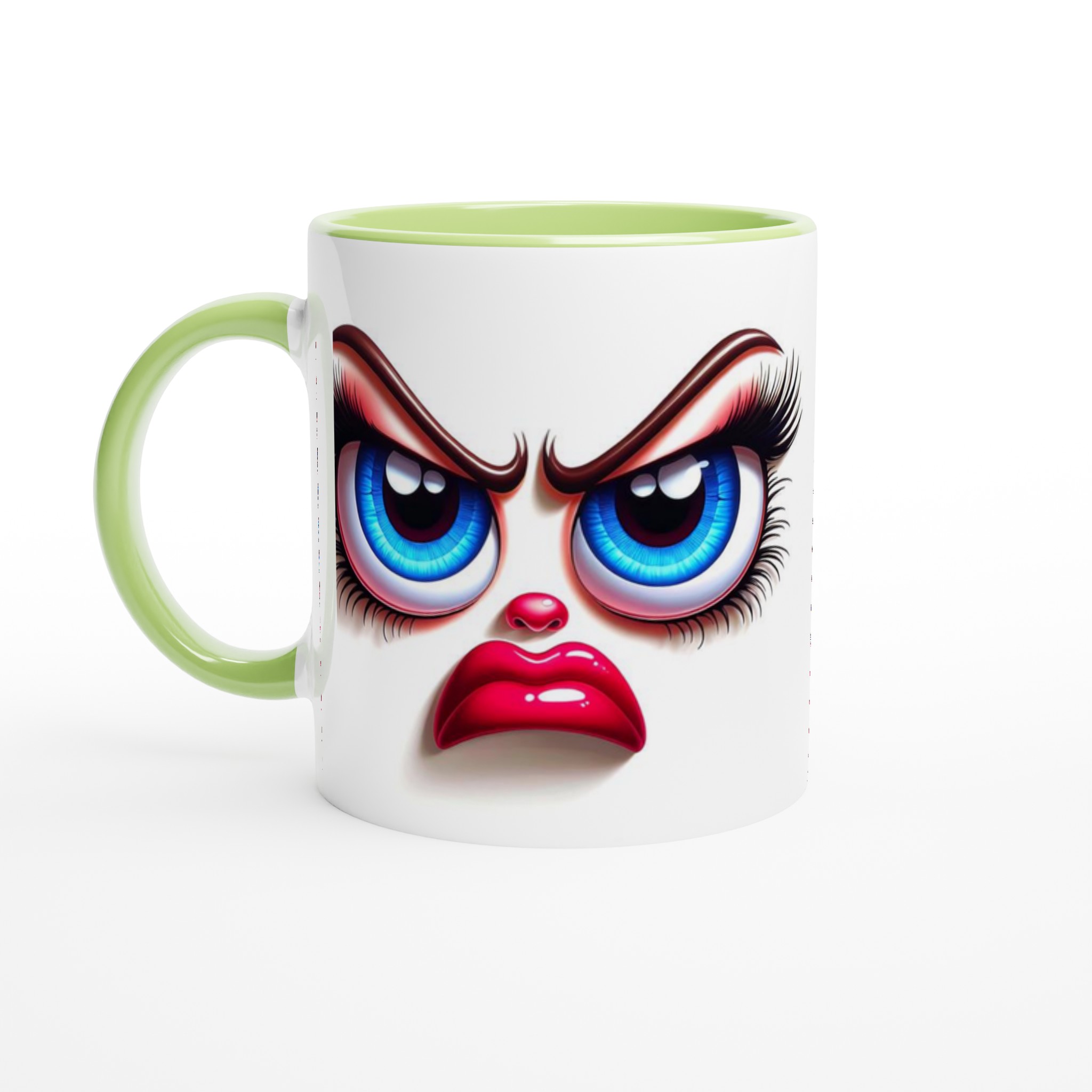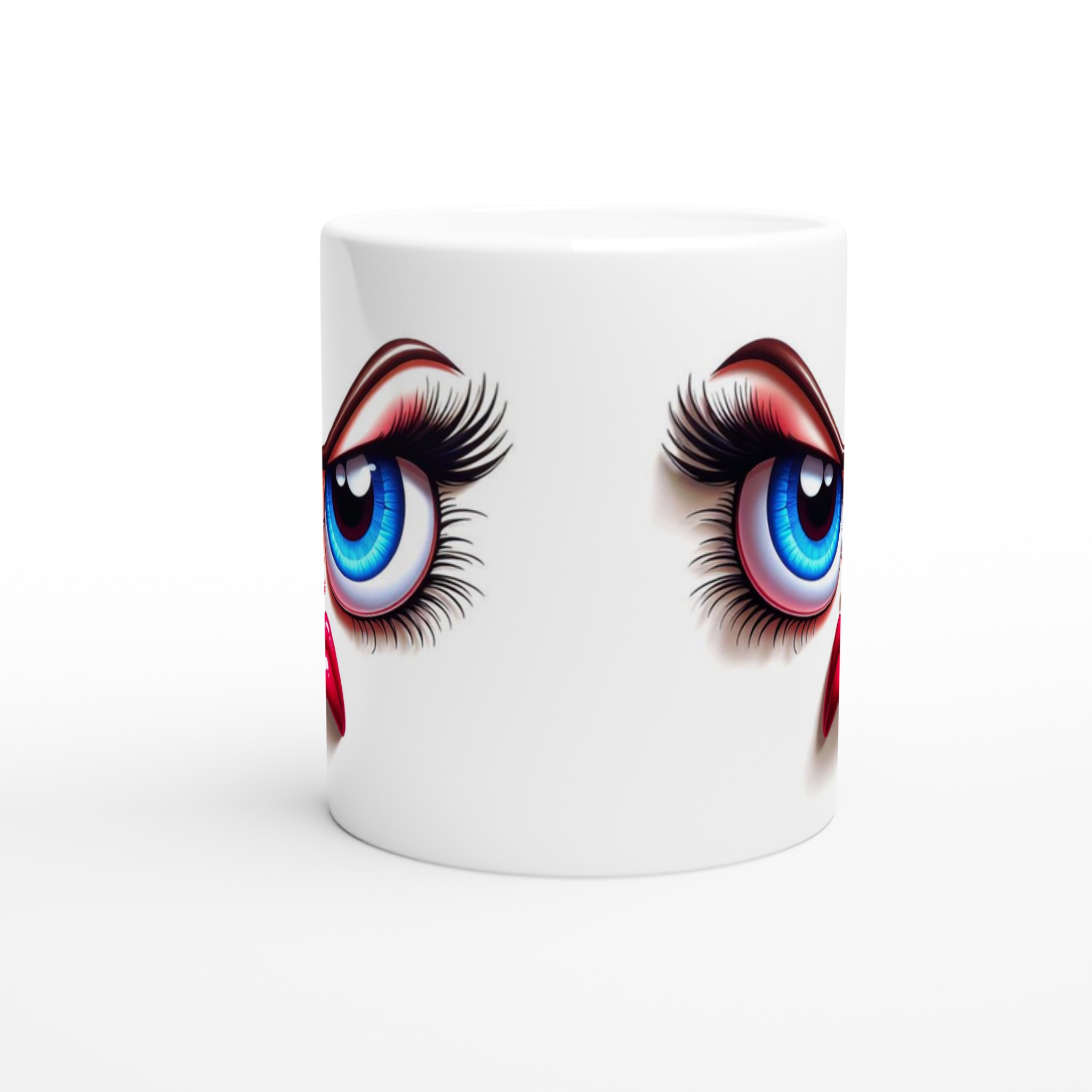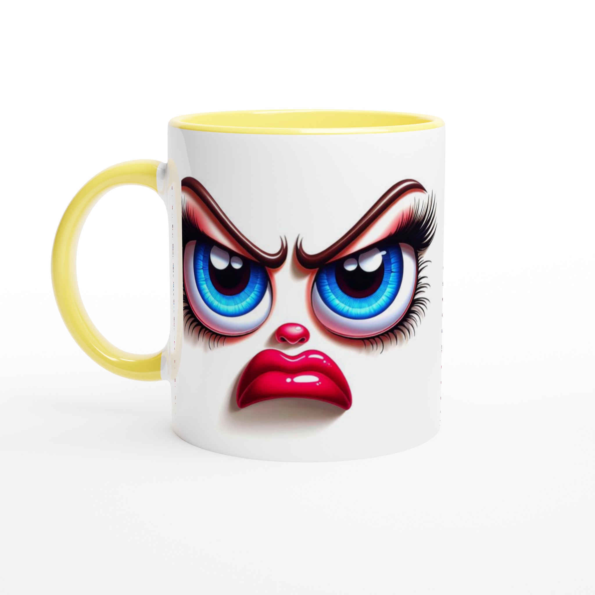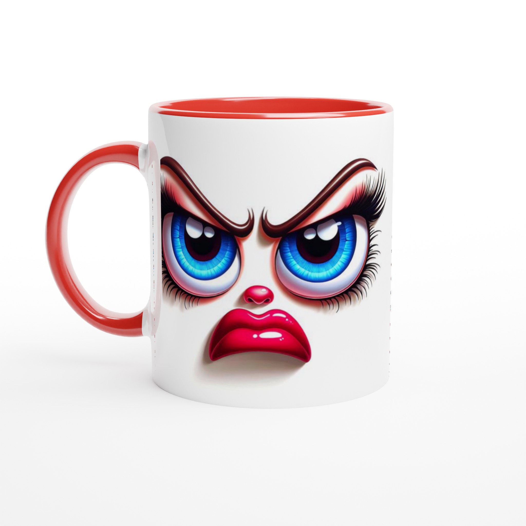 Denna mugg är perfekt för dig som gillar att uttrycka dig med en glimt i ögat! Med ett unikt och humoristiskt ”grumpy glamour”-ansikte med uttrycksfulla blå ögon och pussmun, kommer denna mugg garanterat att väcka uppmärksamhet och sprida glädje – eller åtminstone ett leende. Den blanka vita ytan ger ett skarpt och levande tryck som verkligen sticker ut, oavsett om det är en personlig design, ett roligt citat eller en present till någon du tycker om.