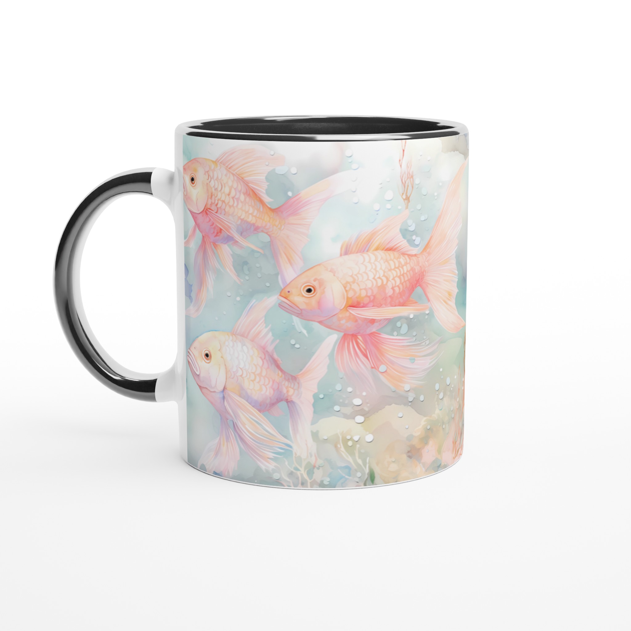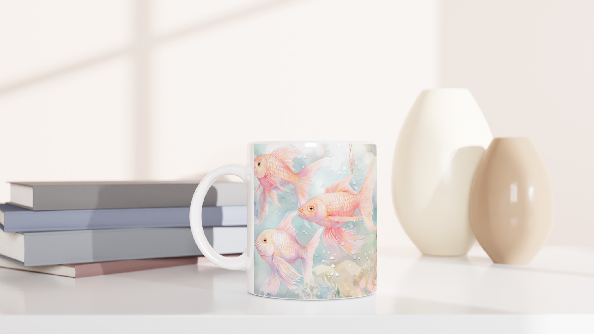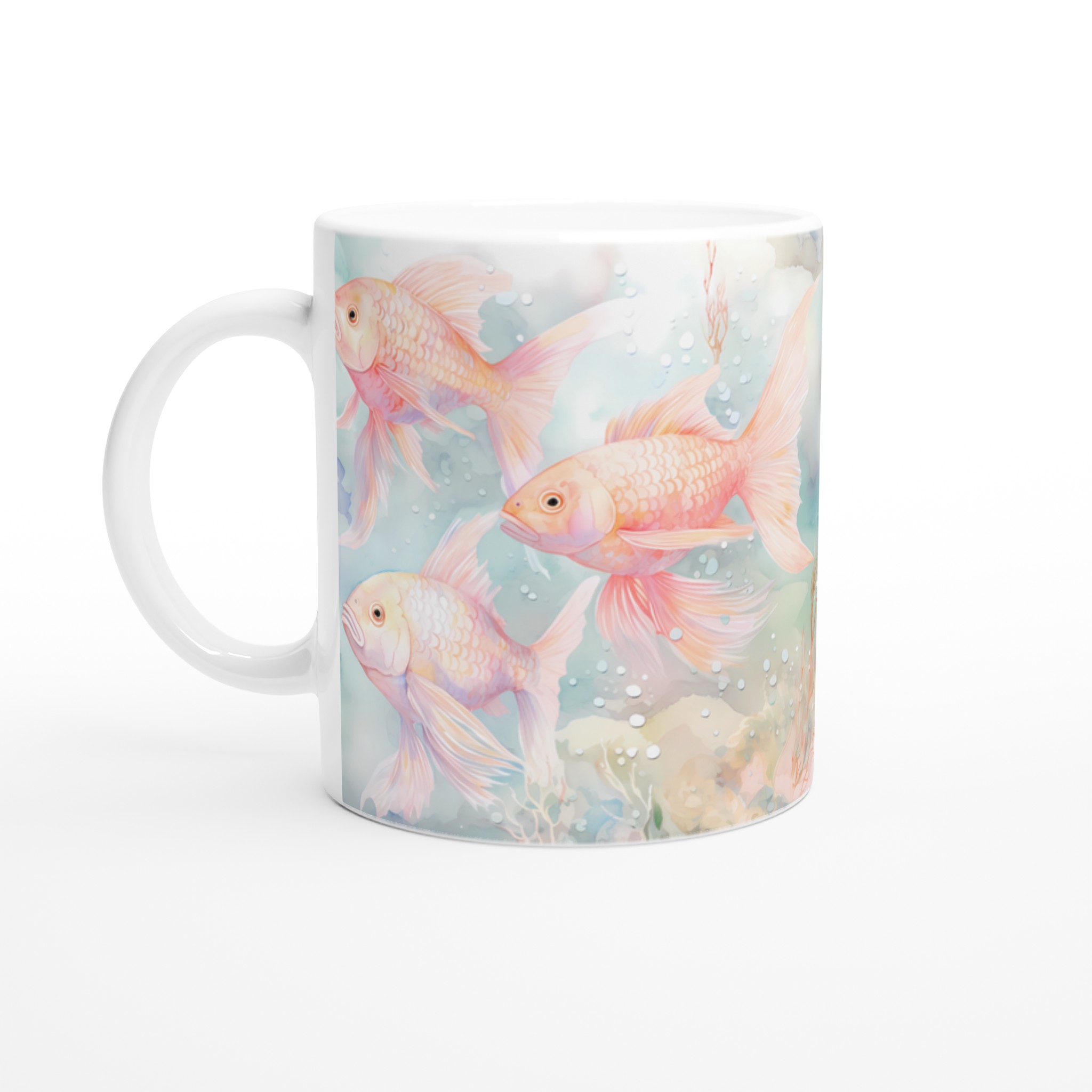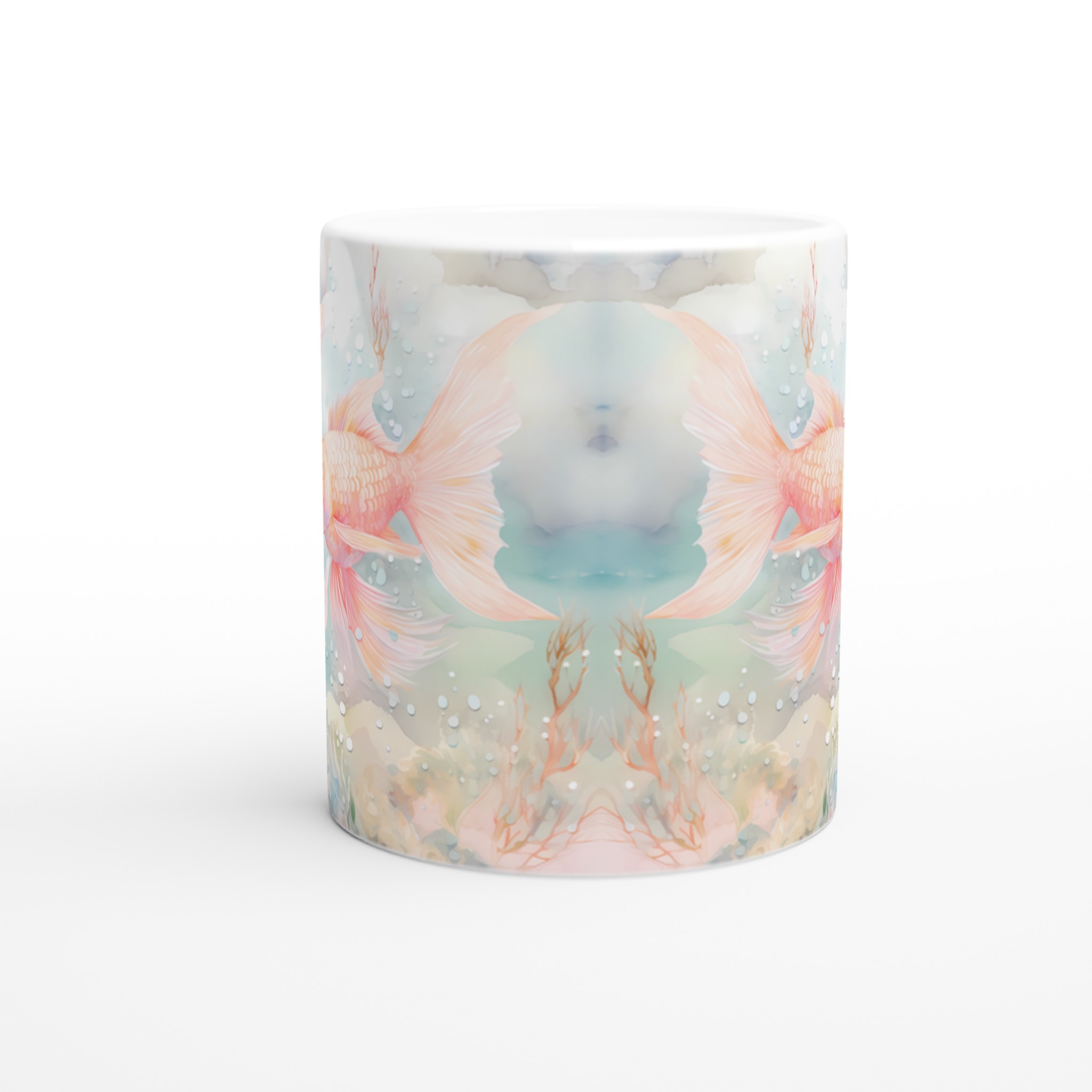 Fånga den lugnande skönheten från undervattensvärlden med vår akvarellmugg. Denna mugg är prydd med en konstnärlig illustration av simmande guldfiskar i drömska pastelltoner av rosa och mintgrönt, vilket skapar en känsla av rofylldhet vid varje användning. Låt den bli din dagliga påminnelse om lugn och harmoni, perfekt för din morgonrutin eller en avkopplande stund.