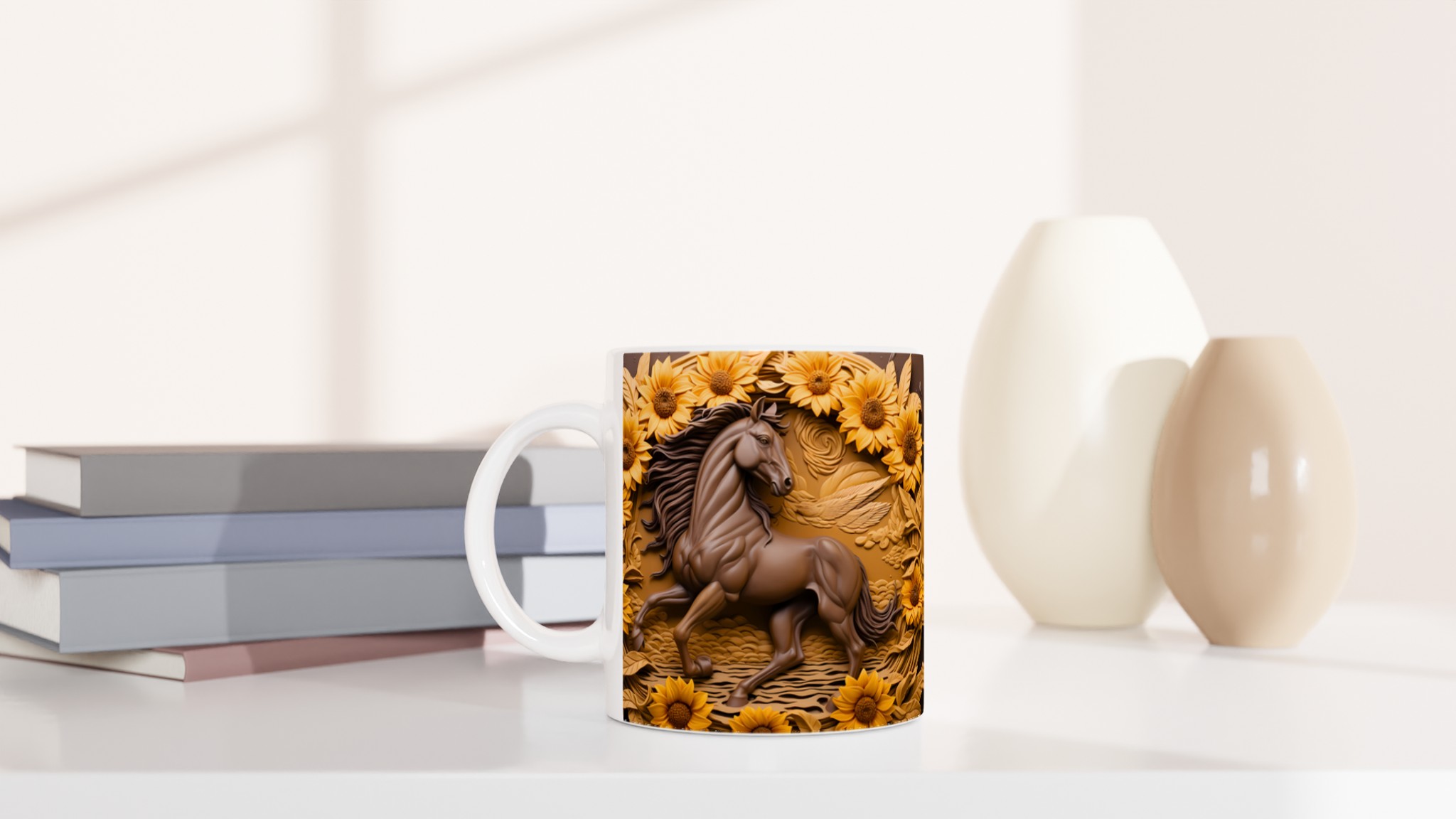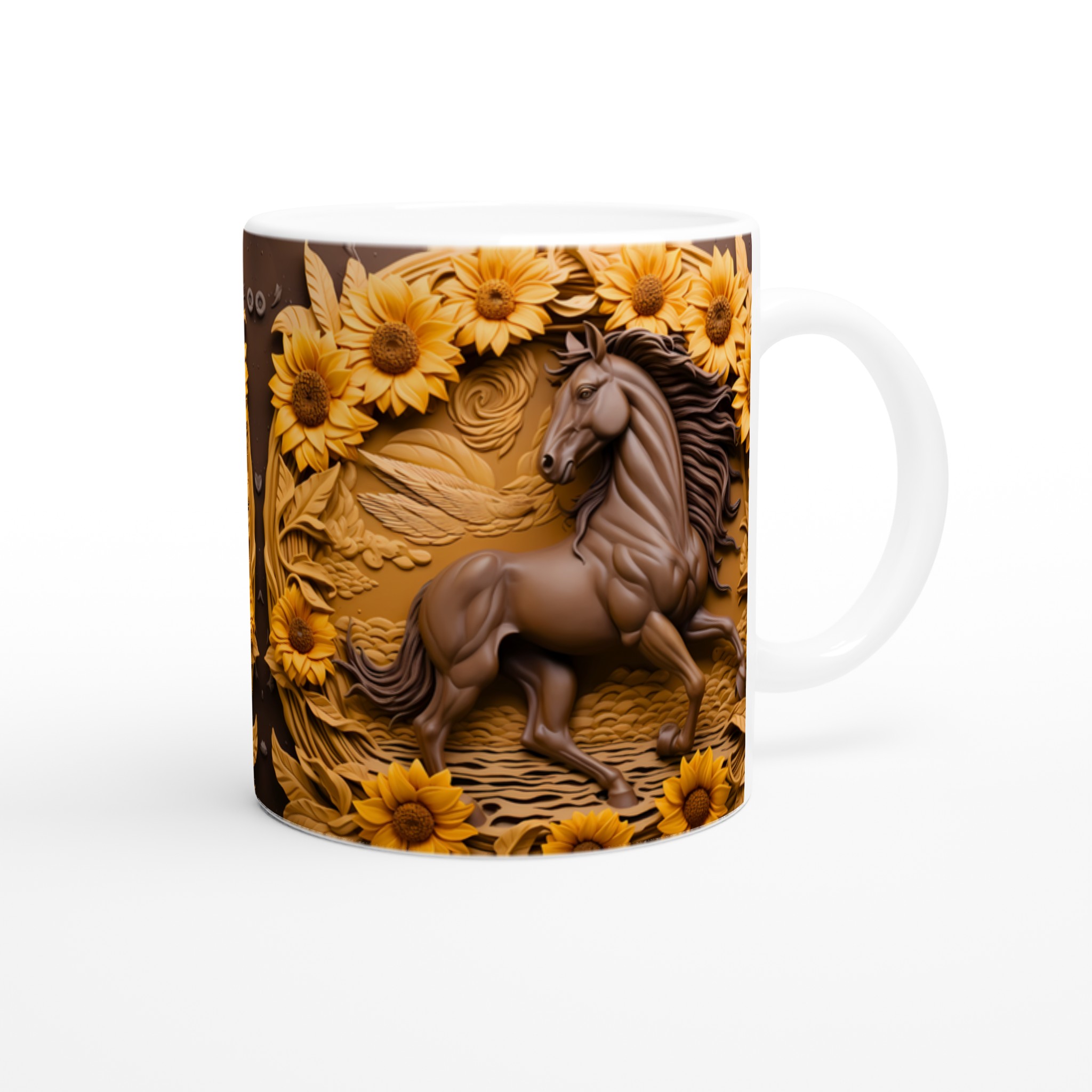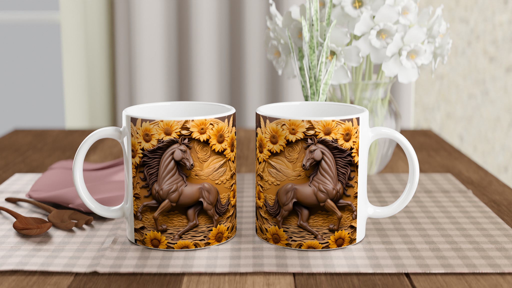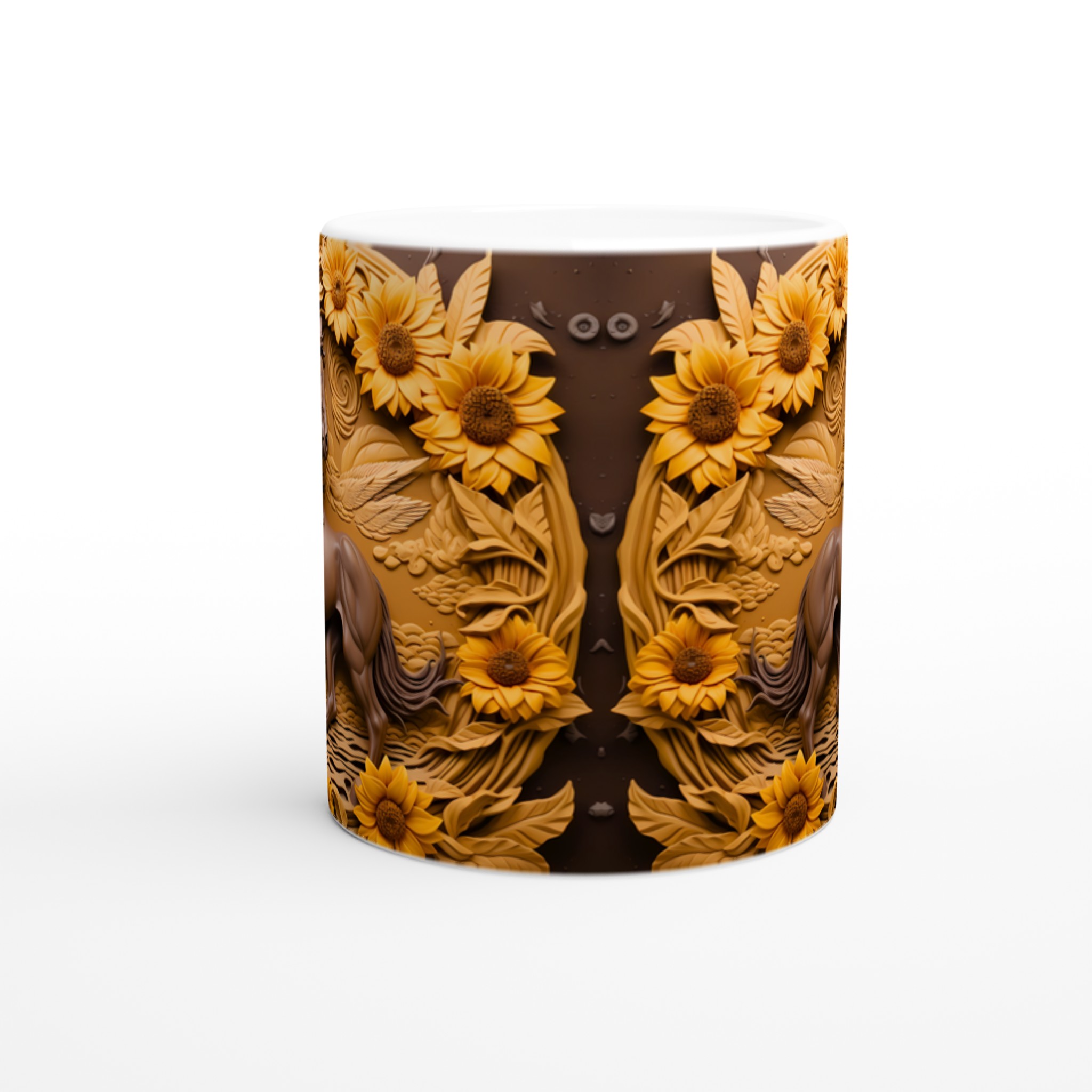 Lyft din fikastund med denna magnifika keramiska mugg, som kombinerar konstnärlig elegans med vardaglig funktionalitet. Den detaljerade designen, inspirerad av majestätiska hästar och strålande solrosor i en rik guld- och brunpalett, skapar en känsla av lyx och natur i varje klunk. Den blanka ytan framhäver tryckets levande färger, som håller sig lika vackra även efter många turer i mikron och diskmaskinen. En perfekt följeslagare för morgonkaffet, en lugnande kopp te, eller kvällens varma choklad.