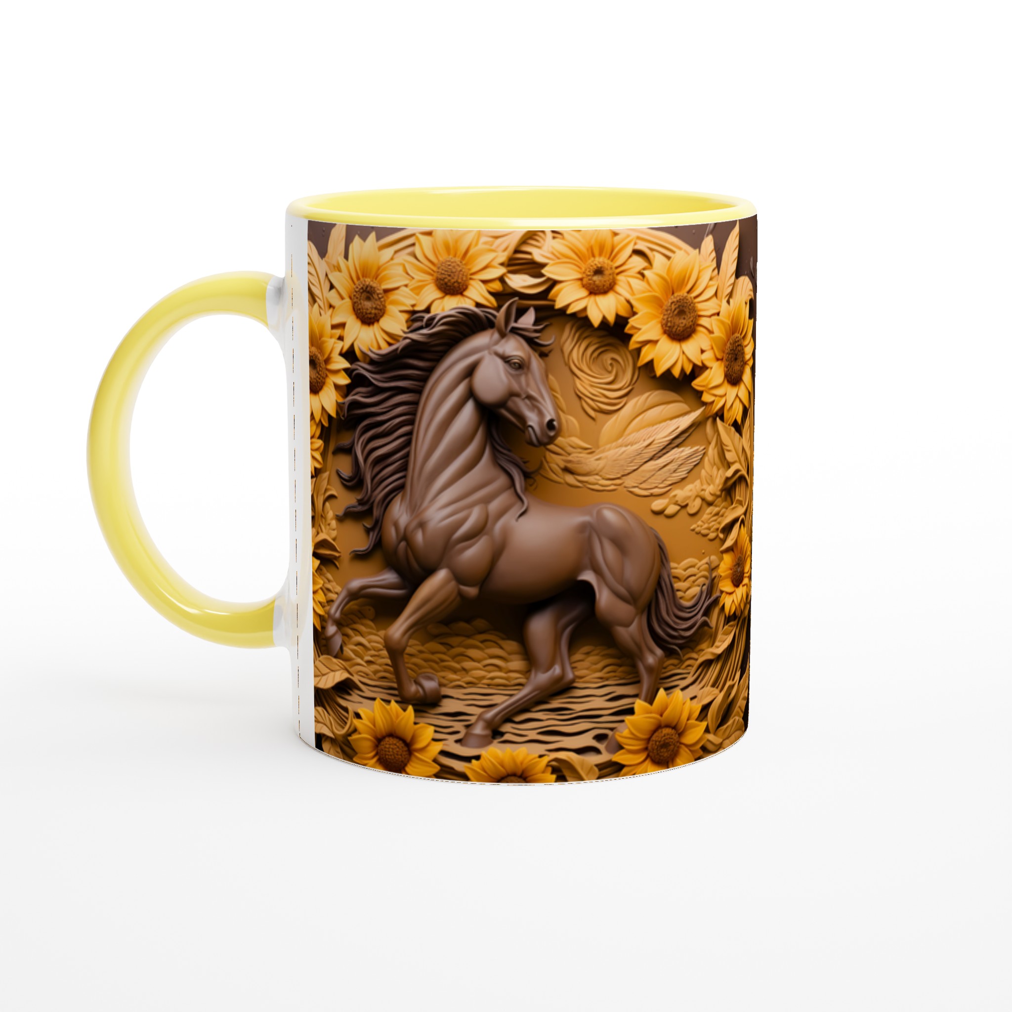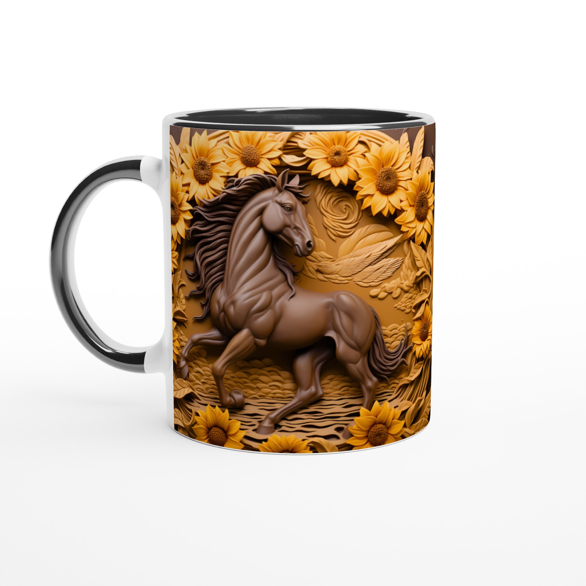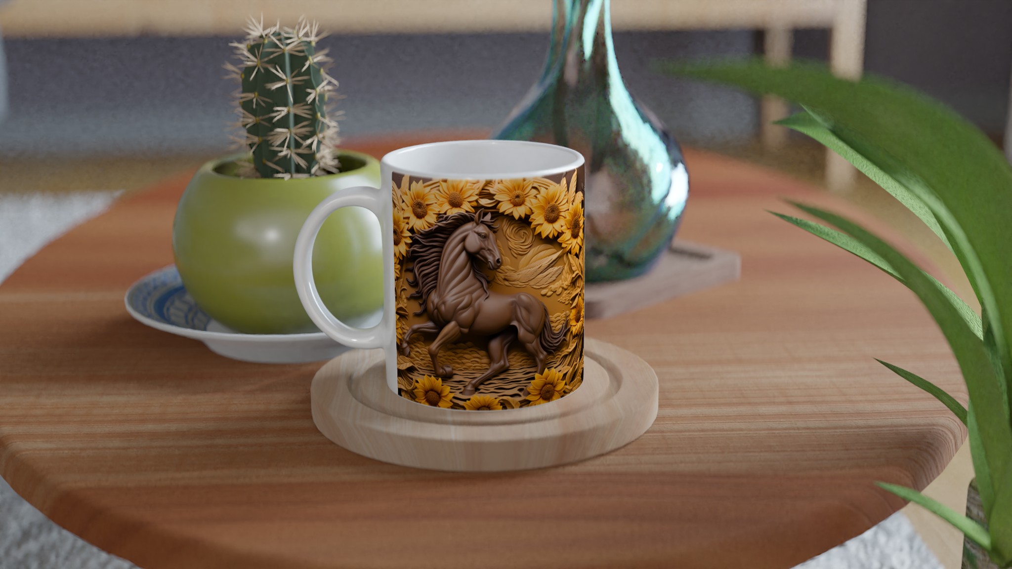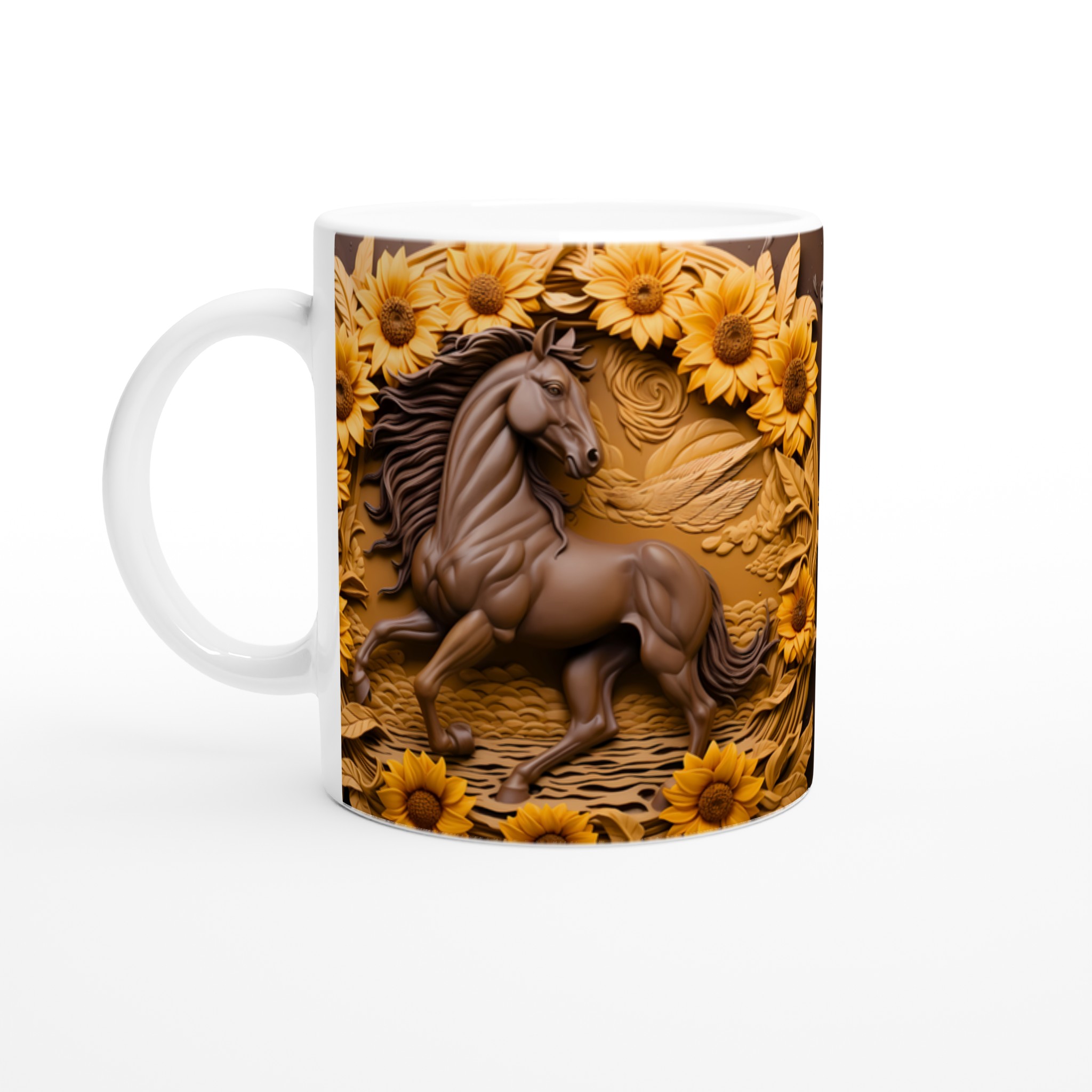 Lyft din fikastund med denna magnifika keramiska mugg, som kombinerar konstnärlig elegans med vardaglig funktionalitet. Den detaljerade designen, inspirerad av majestätiska hästar och strålande solrosor i en rik guld- och brunpalett, skapar en känsla av lyx och natur i varje klunk. Den blanka ytan framhäver tryckets levande färger, som håller sig lika vackra även efter många turer i mikron och diskmaskinen. En perfekt följeslagare för morgonkaffet, en lugnande kopp te, eller kvällens varma choklad.