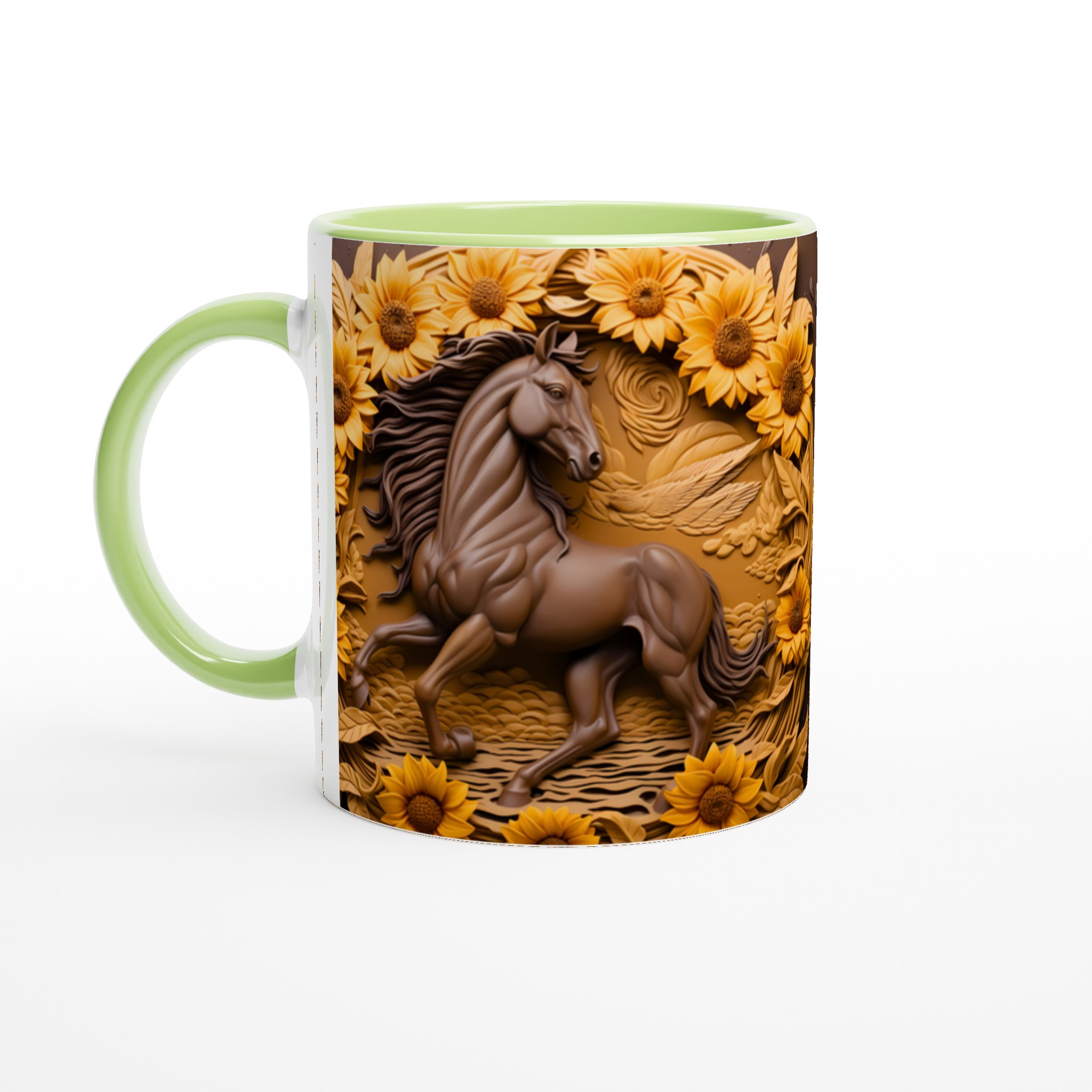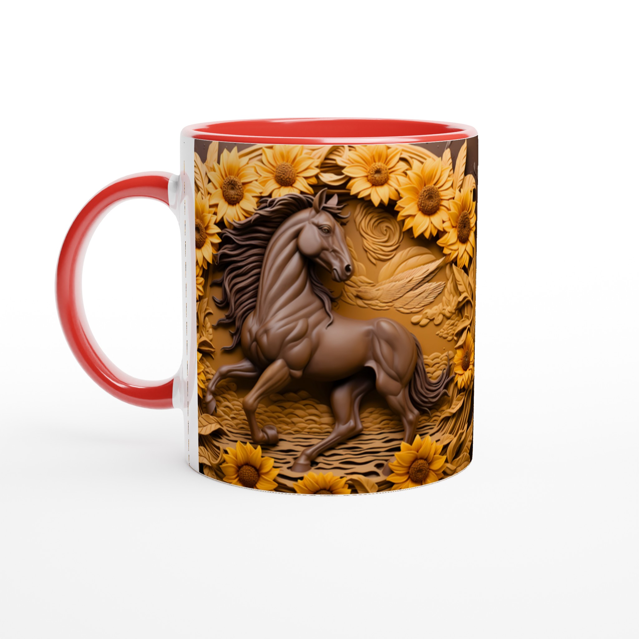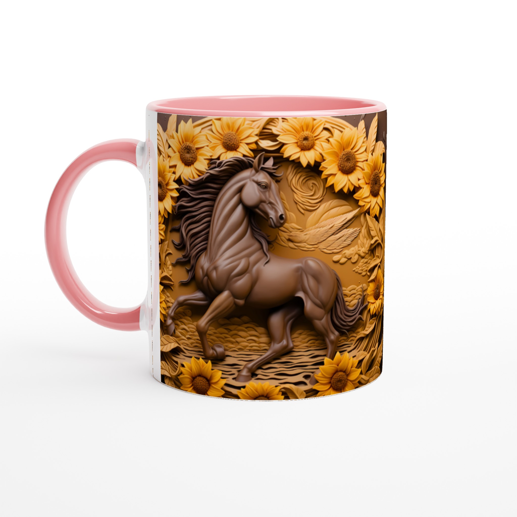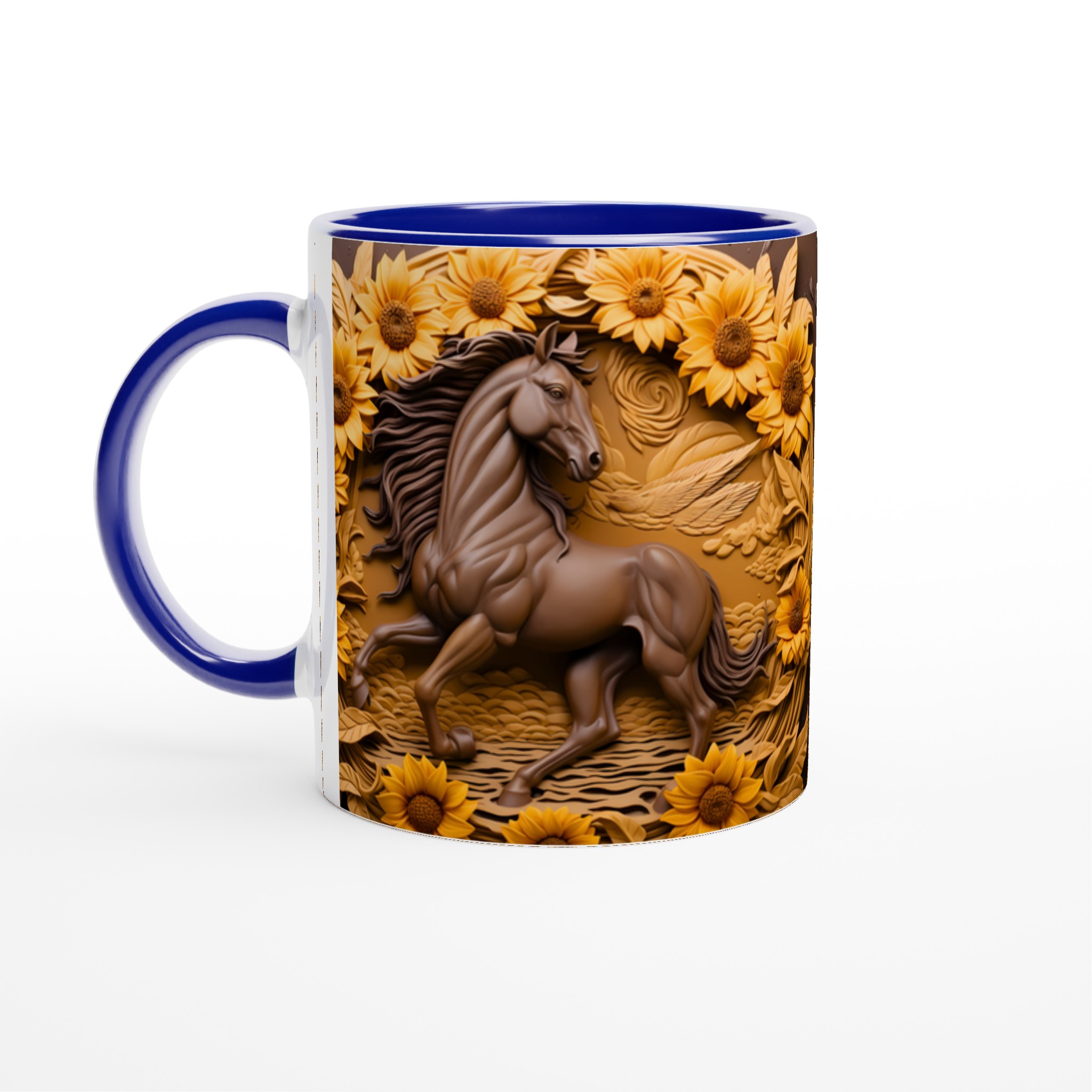 Lyft din fikastund med denna magnifika keramiska mugg, som kombinerar konstnärlig elegans med vardaglig funktionalitet. Den detaljerade designen, inspirerad av majestätiska hästar och strålande solrosor i en rik guld- och brunpalett, skapar en känsla av lyx och natur i varje klunk. Den blanka ytan framhäver tryckets levande färger, som håller sig lika vackra även efter många turer i mikron och diskmaskinen. En perfekt följeslagare för morgonkaffet, en lugnande kopp te, eller kvällens varma choklad.