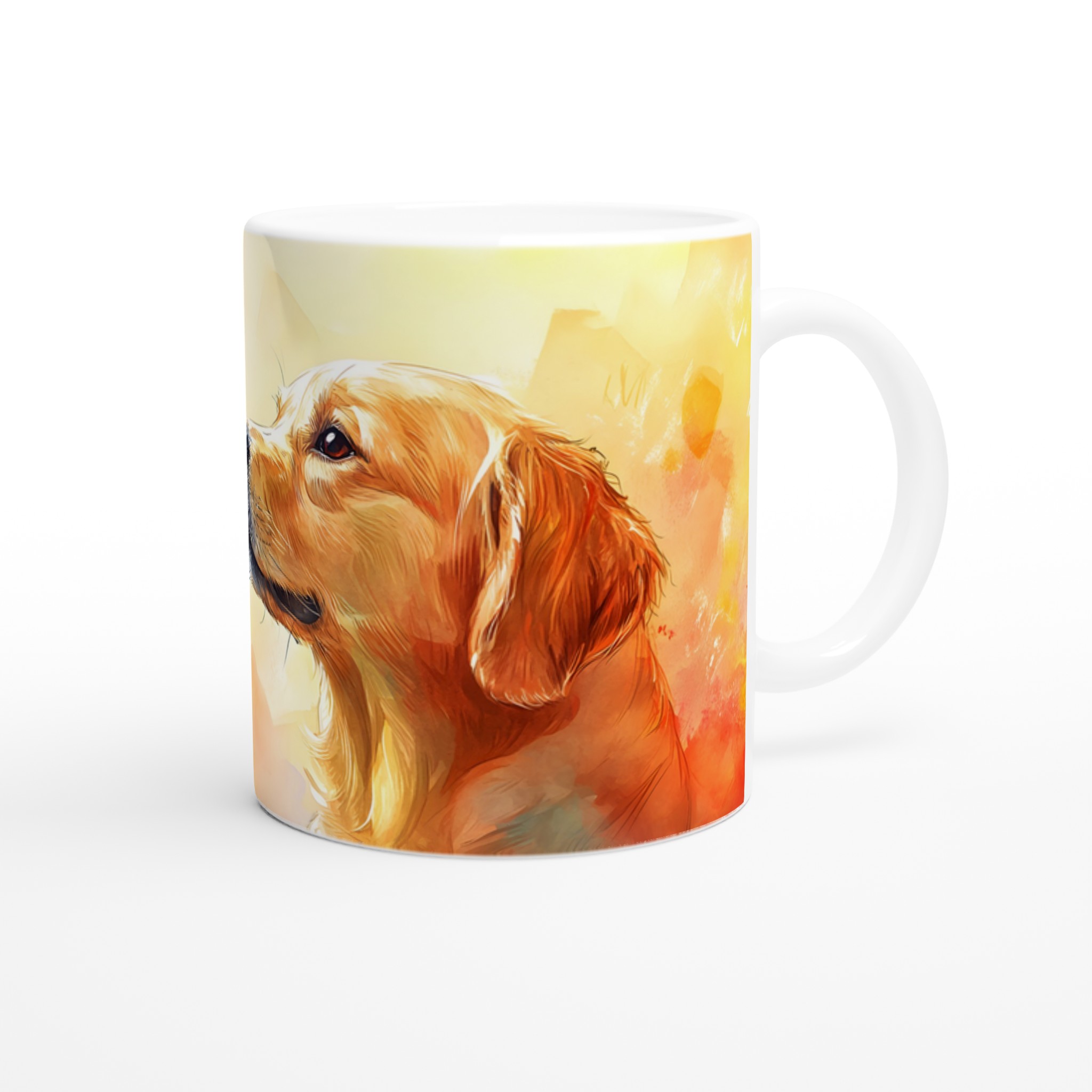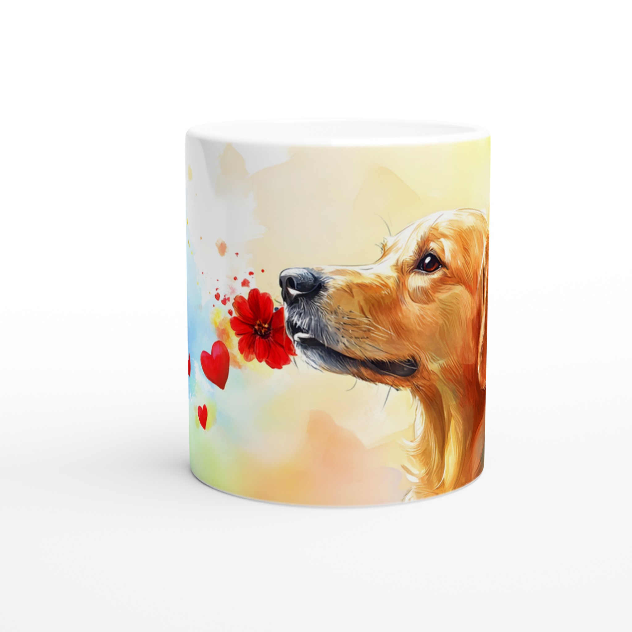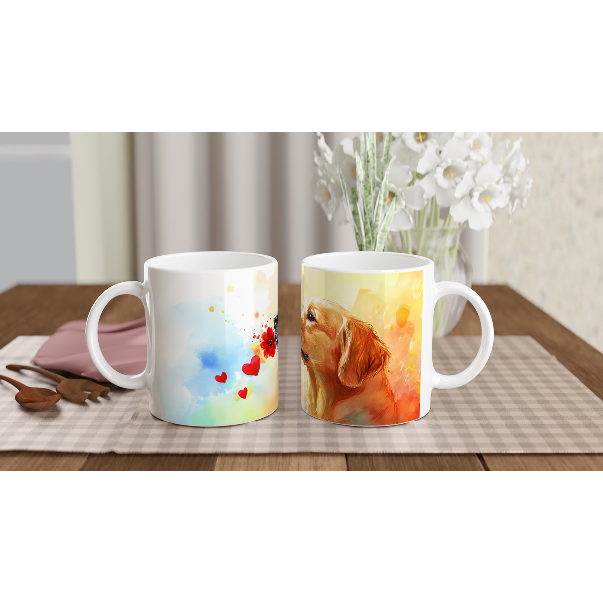 Fånga den hjärtvärmande glädjen och lojaliteten med vår keramiska mugg ”Guldiga Vännen”, med en bedårande golden retriever i en livfull akvarellstil. Denna mugg är en hyllning till våra fyrbenta vänner, perfekt för att lysa upp din morgonkaffe eller mysiga te-stunder. Den konstnärliga designen, med dess varma färger och lekfulla hjärtan, gör varje sipp till en stund av ren glädje.