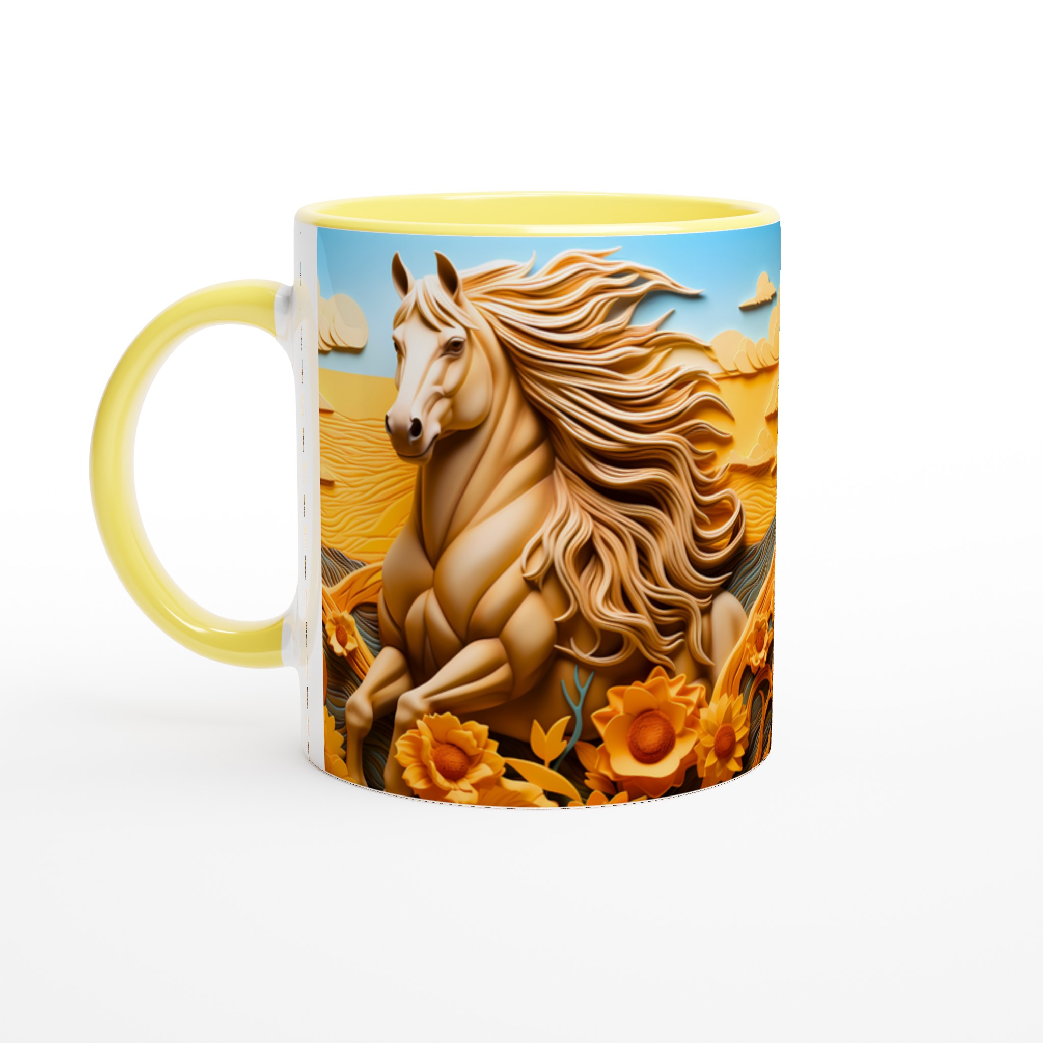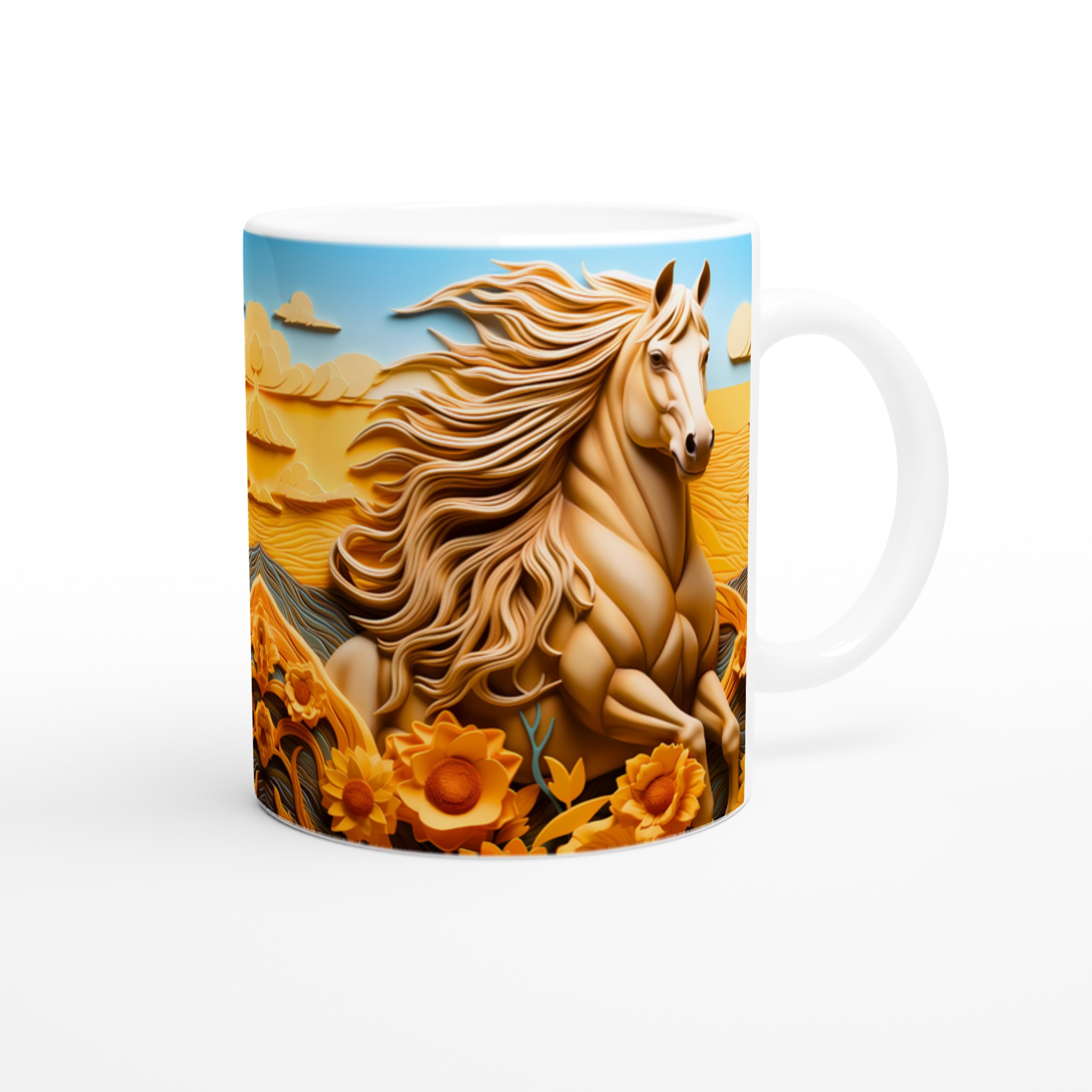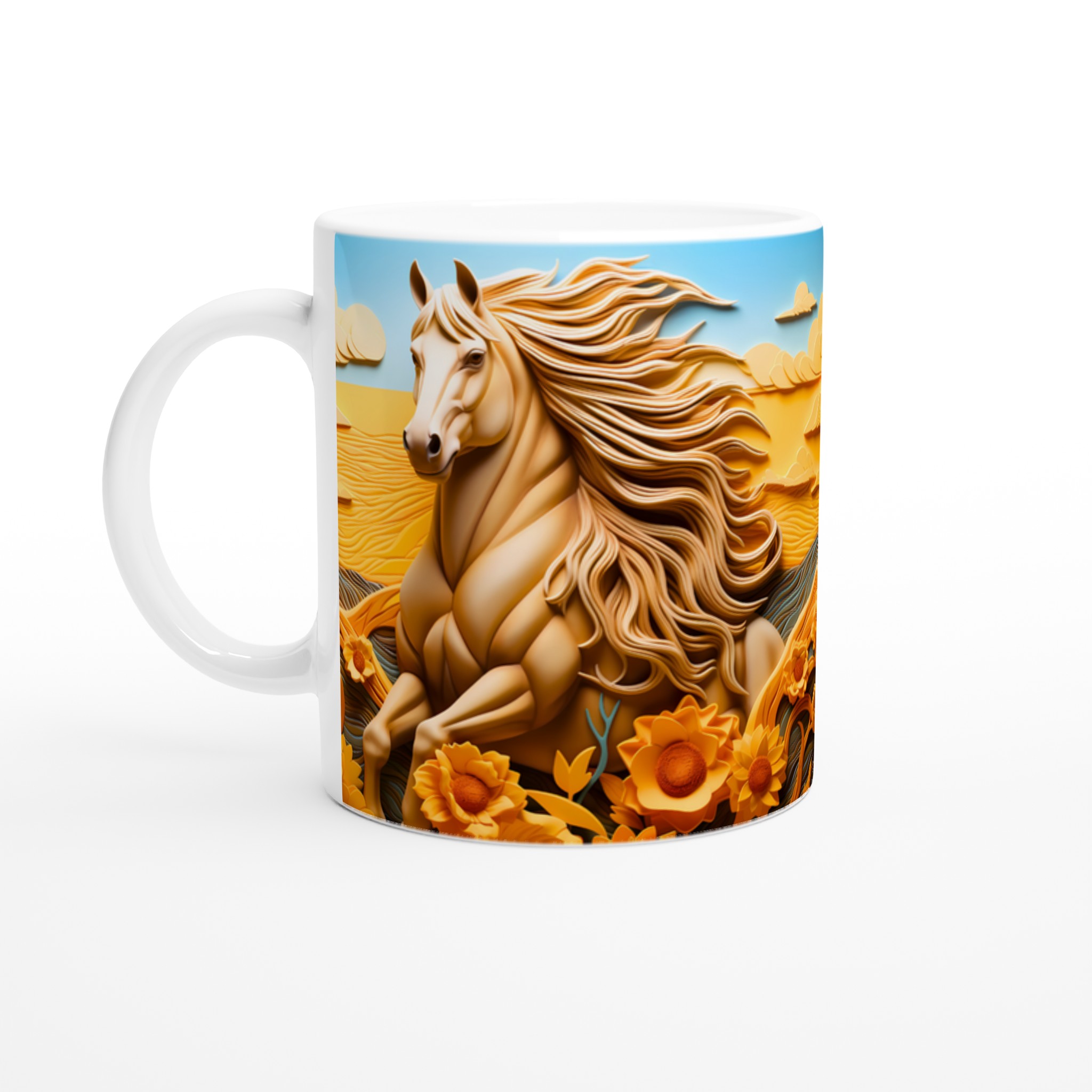 Fånga dagen med denna magnifika keramiska mugg, som förvandlar varje dryckesstund till en hyllning till art deco-inspirerad skönhet. Med ett förtrollande hästmotiv i varma guld- och sandtoner mot en klarblå himmel, blir denna mugg snabbt en vardagsfavorit. Den detaljerade designen, som påminner om intrikata pappersutskärningar, ger en känsla av lyx och kreativitet, perfekt för morgonkaffet, kvällens varma choklad eller när du bara vill njuta av en kopp te.