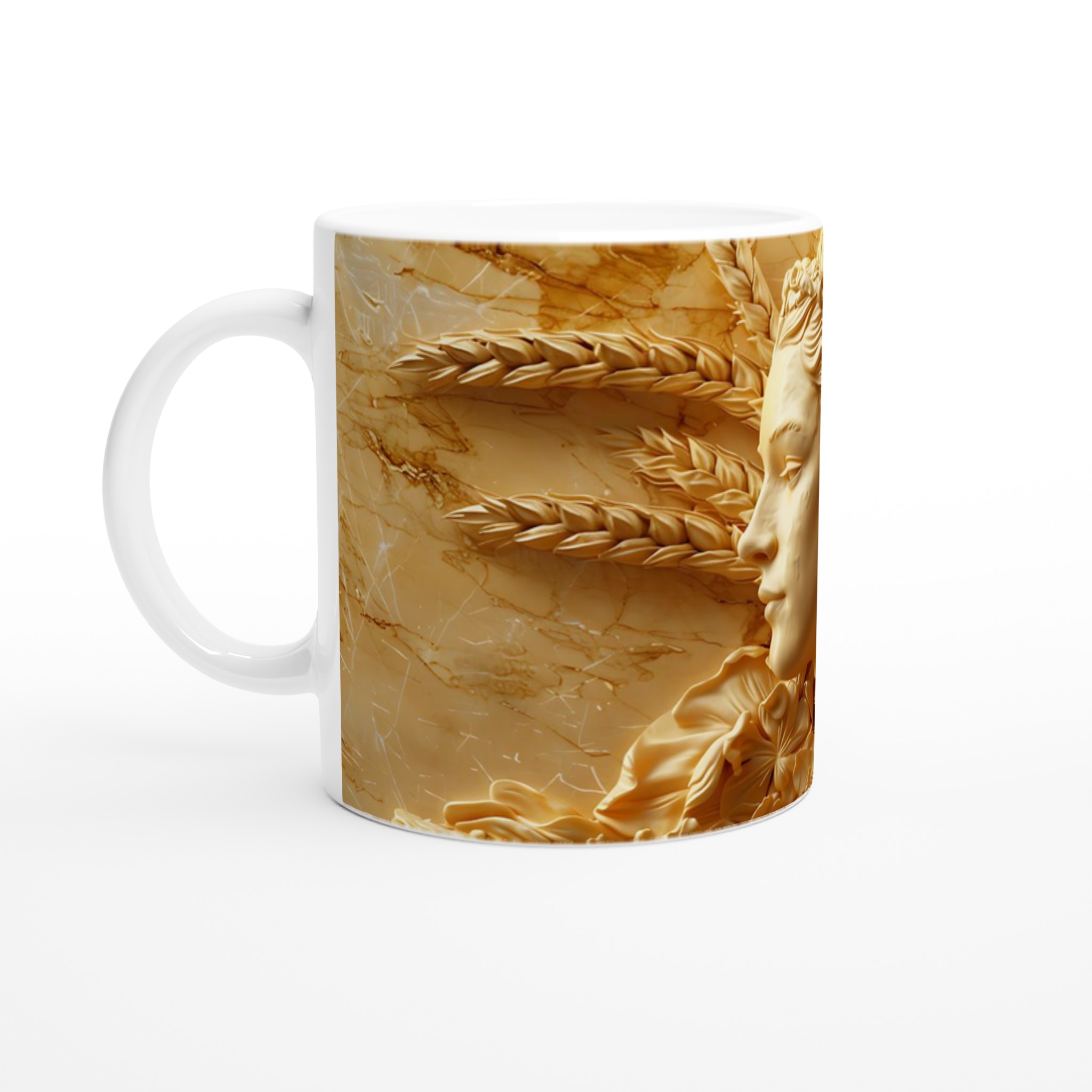 Lyft varje kaffestund med vår premium keramikmugg – stilren, hållbar och skapad för att låta ditt motiv glänsa. Inspirerad av klassisk skönhet och naturens överflöd, med ett konstnärligt uttryck som påminner om guldskimrande statyer och frodiga skördar.