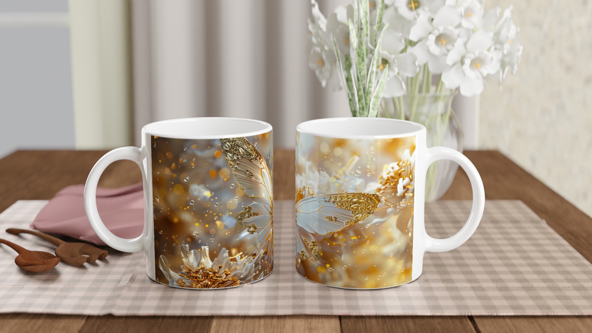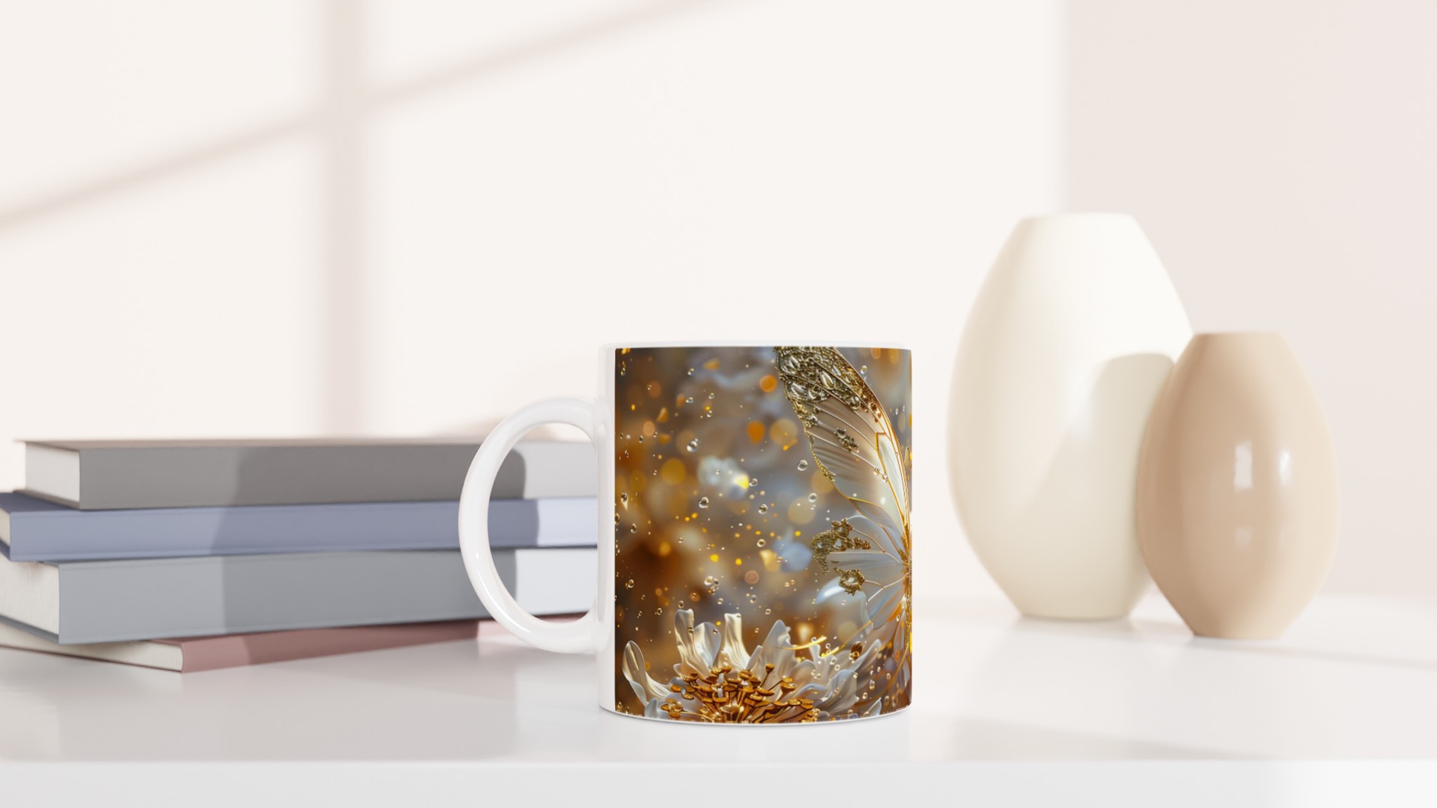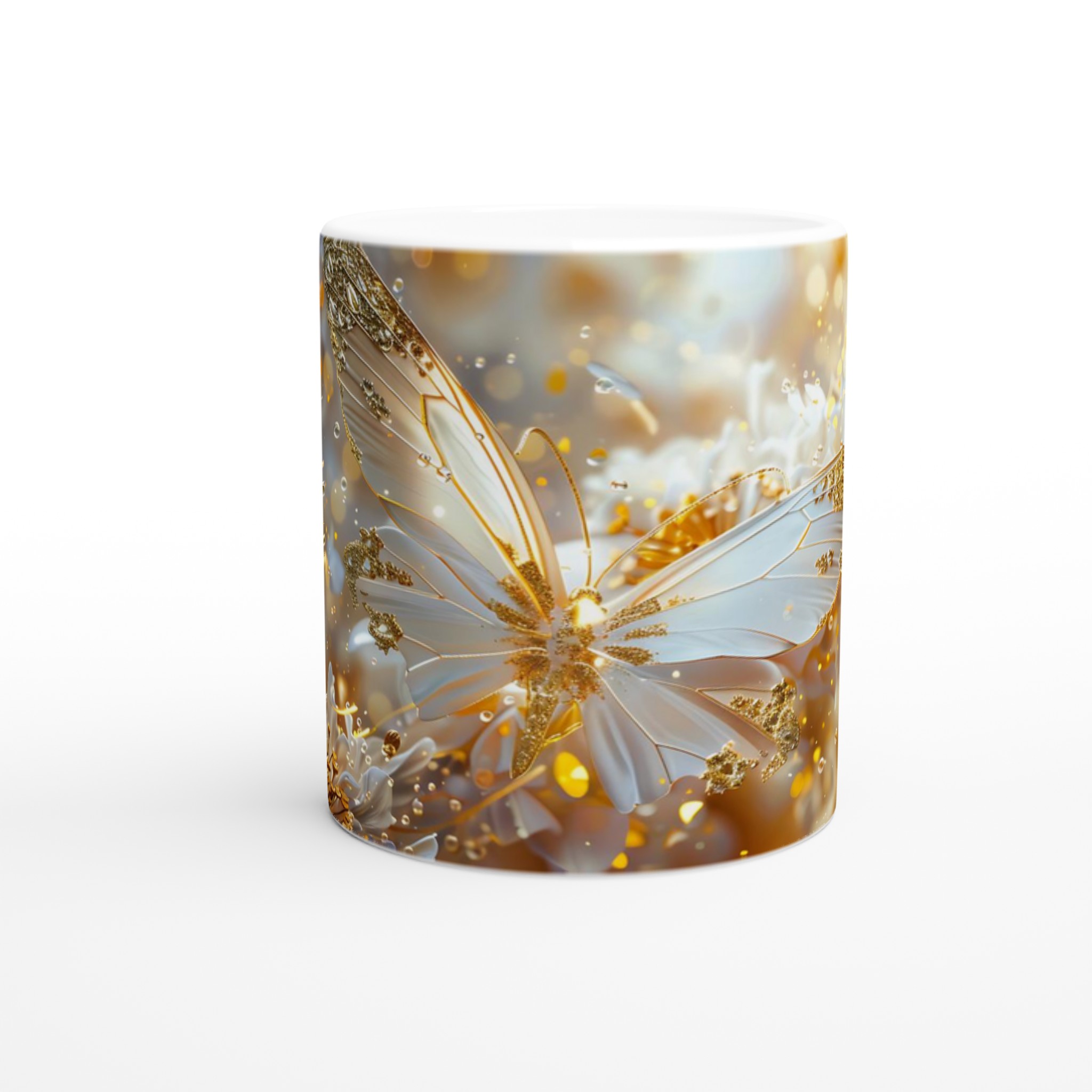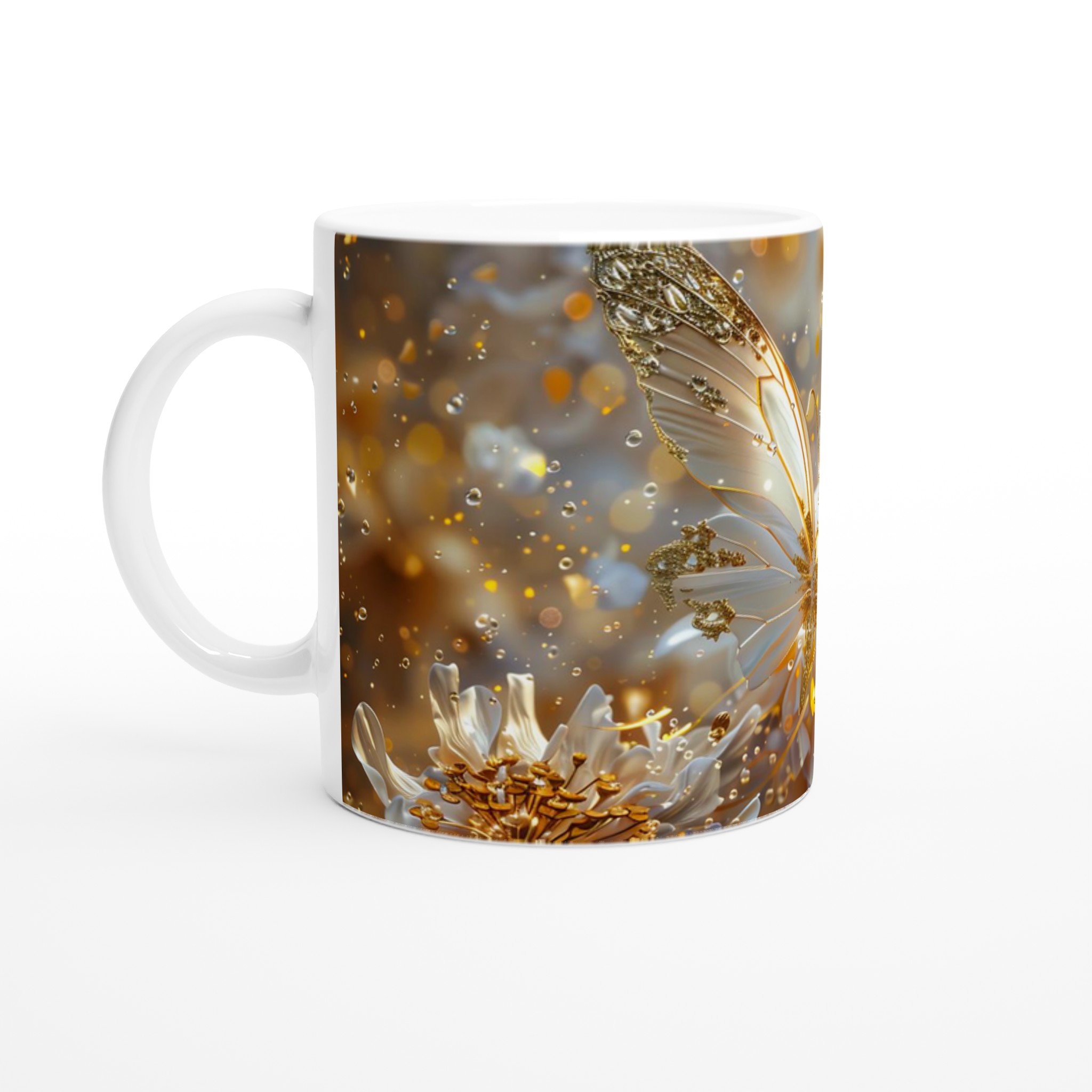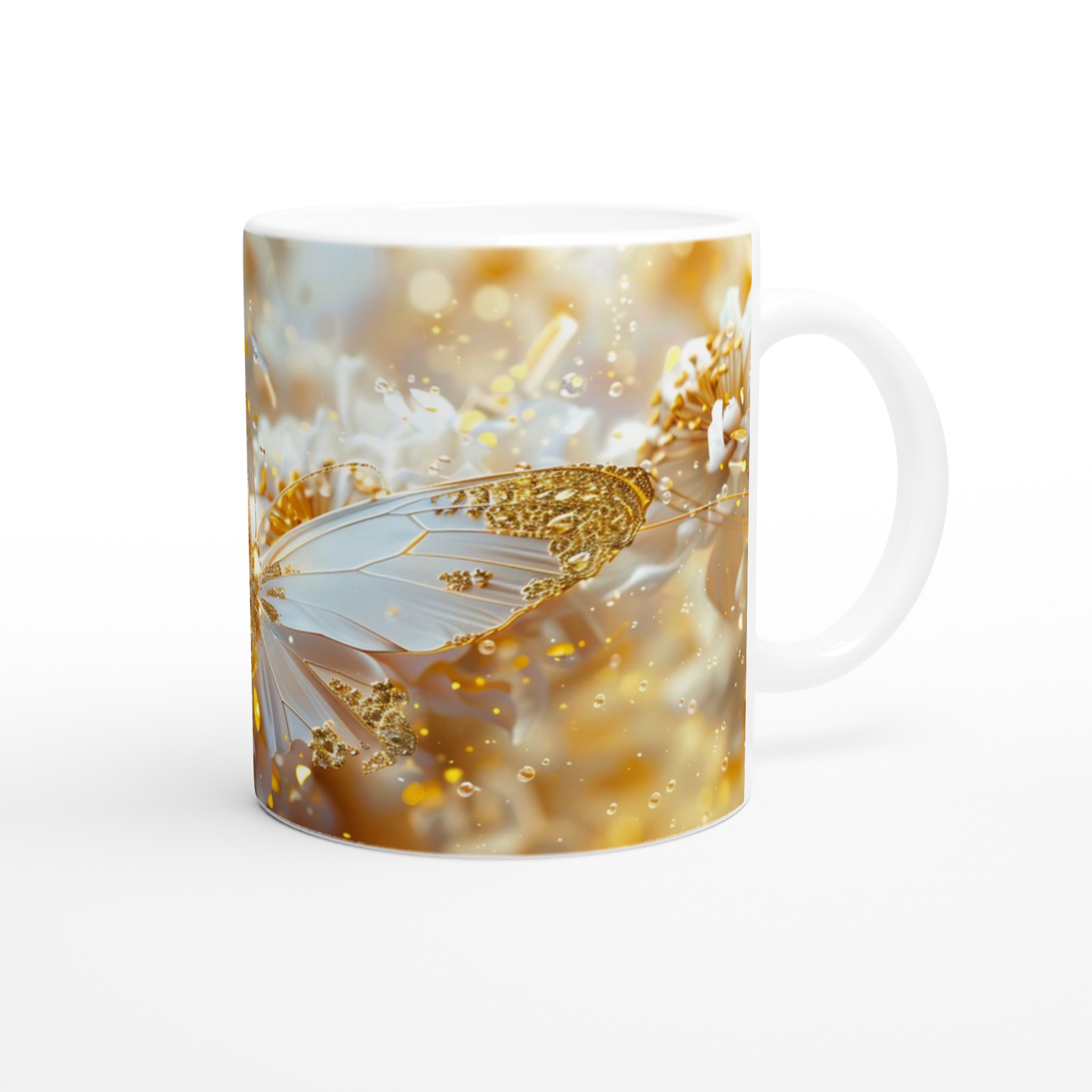 Fånga magin med varje klunk från denna förtrollande keramiska mugg, prydd med ett konstverk av en skimrande gyllene fjäril. Denna mugg blir snabbt en vardagsfavorit, perfekt för morgonkaffet, kvällens varma choklad eller när du bara vill njuta av en kopp te. Den blanka vita ytan gör att trycken framhävs med klara och levande färger, som håller sig fina även efter många turer i mikron och diskmaskinen.