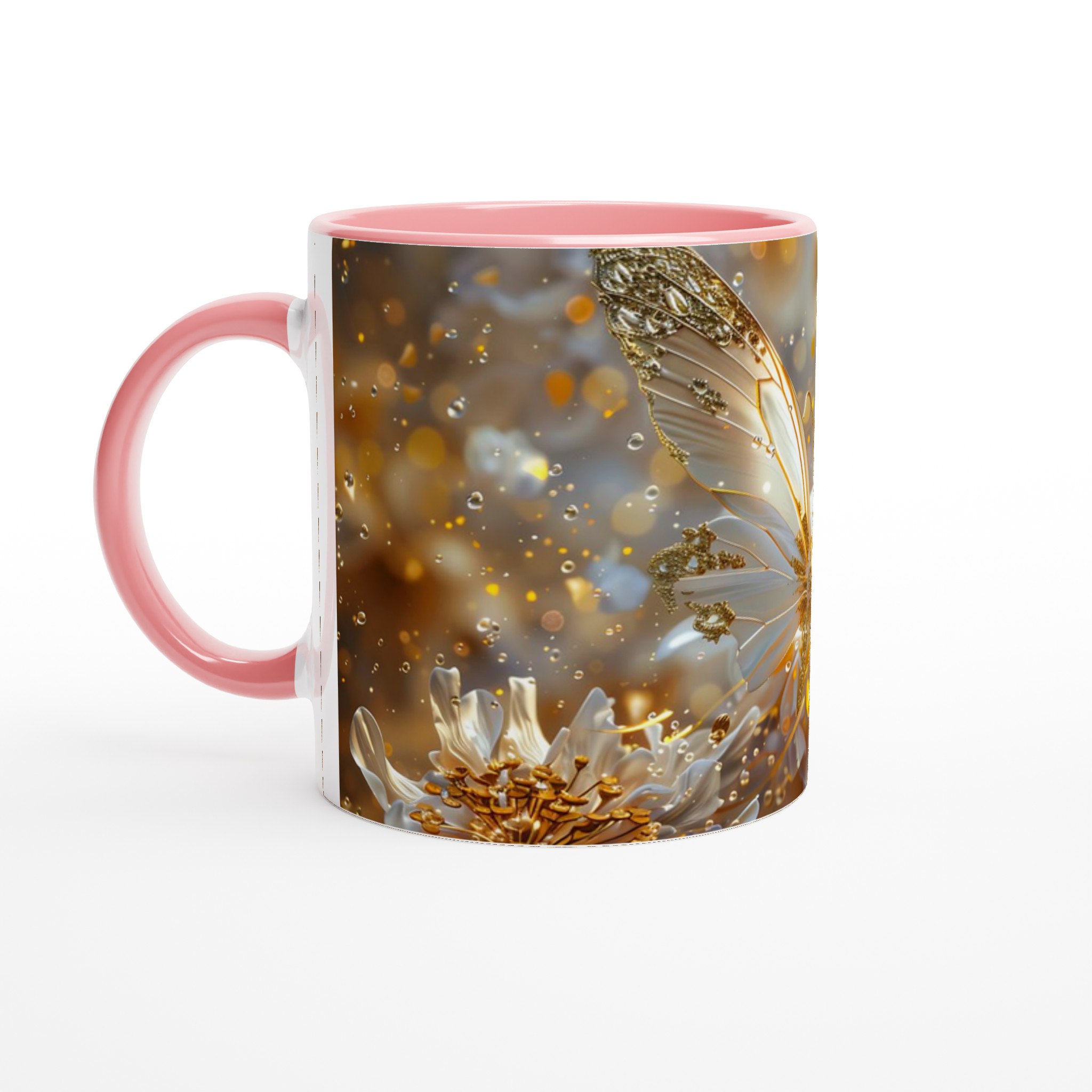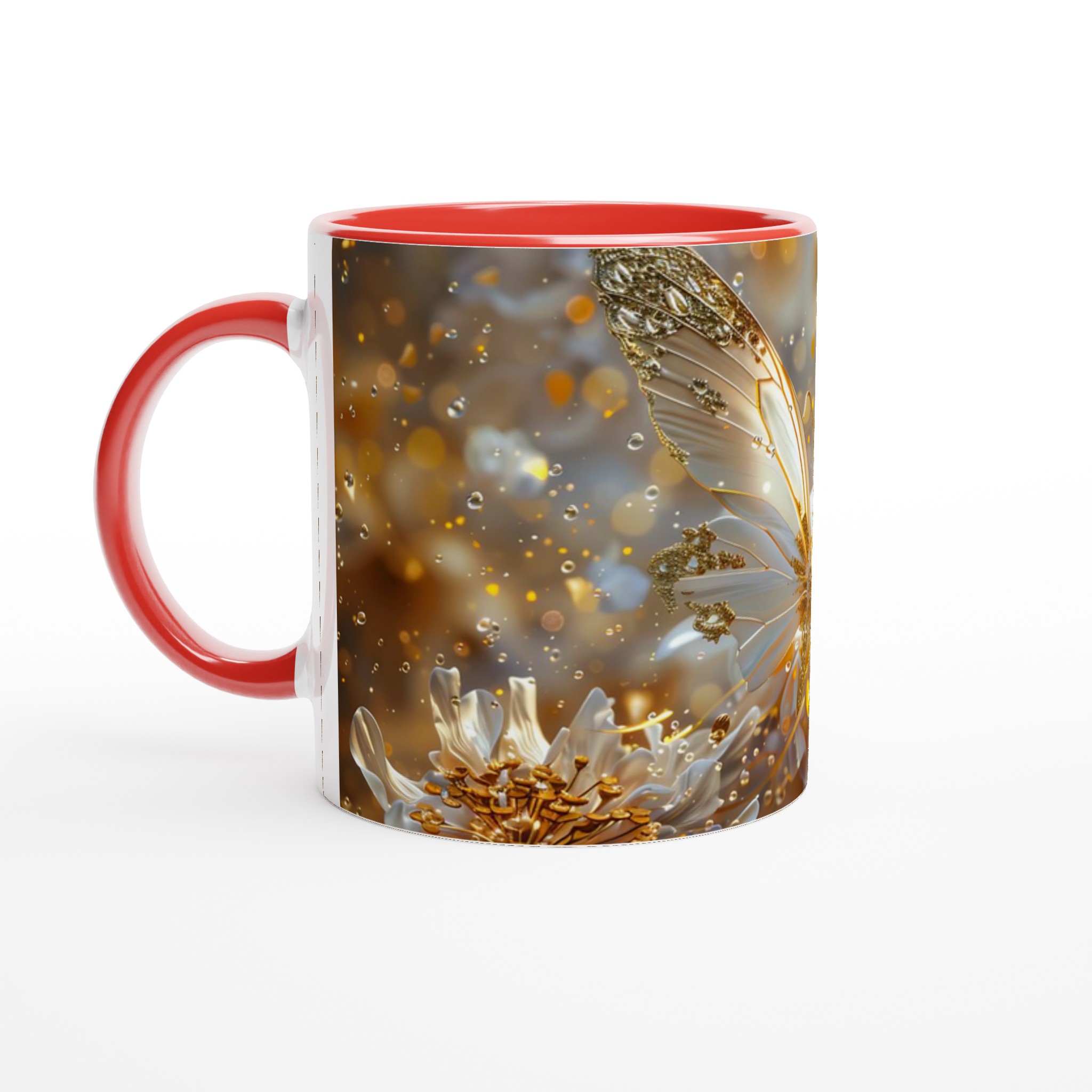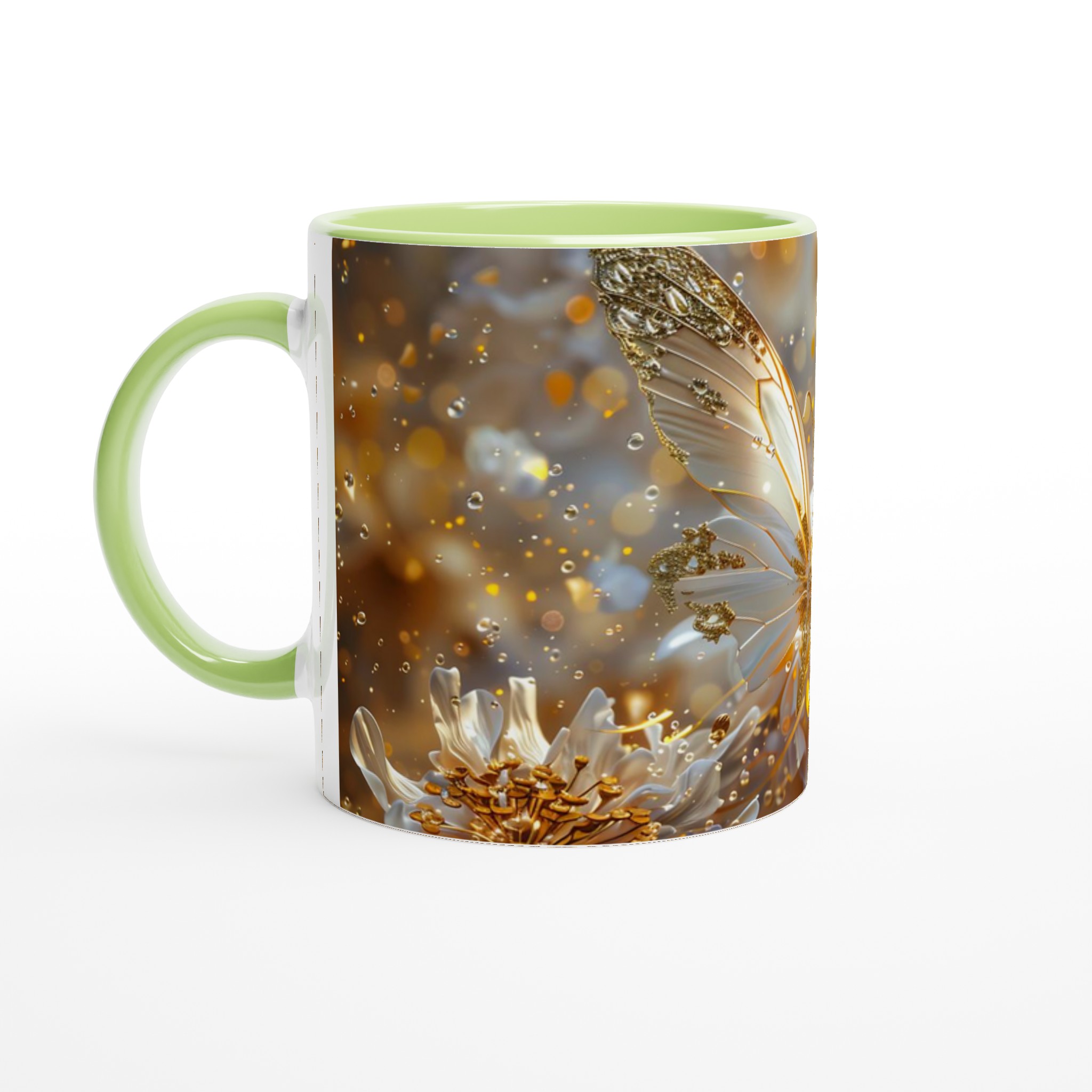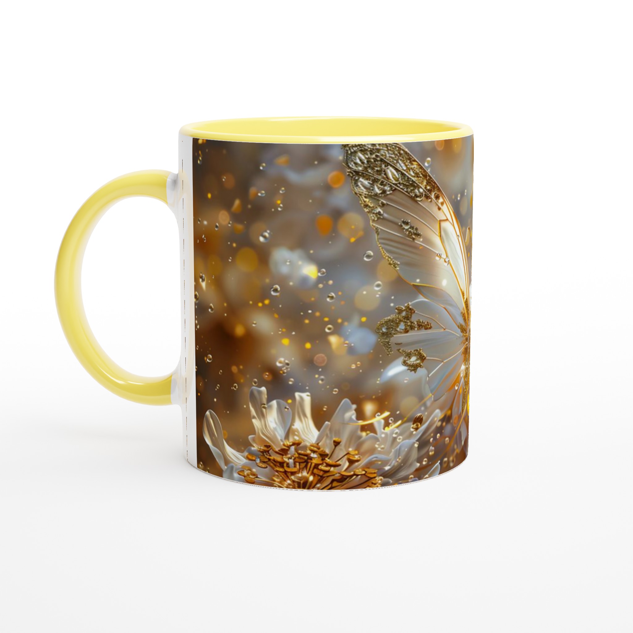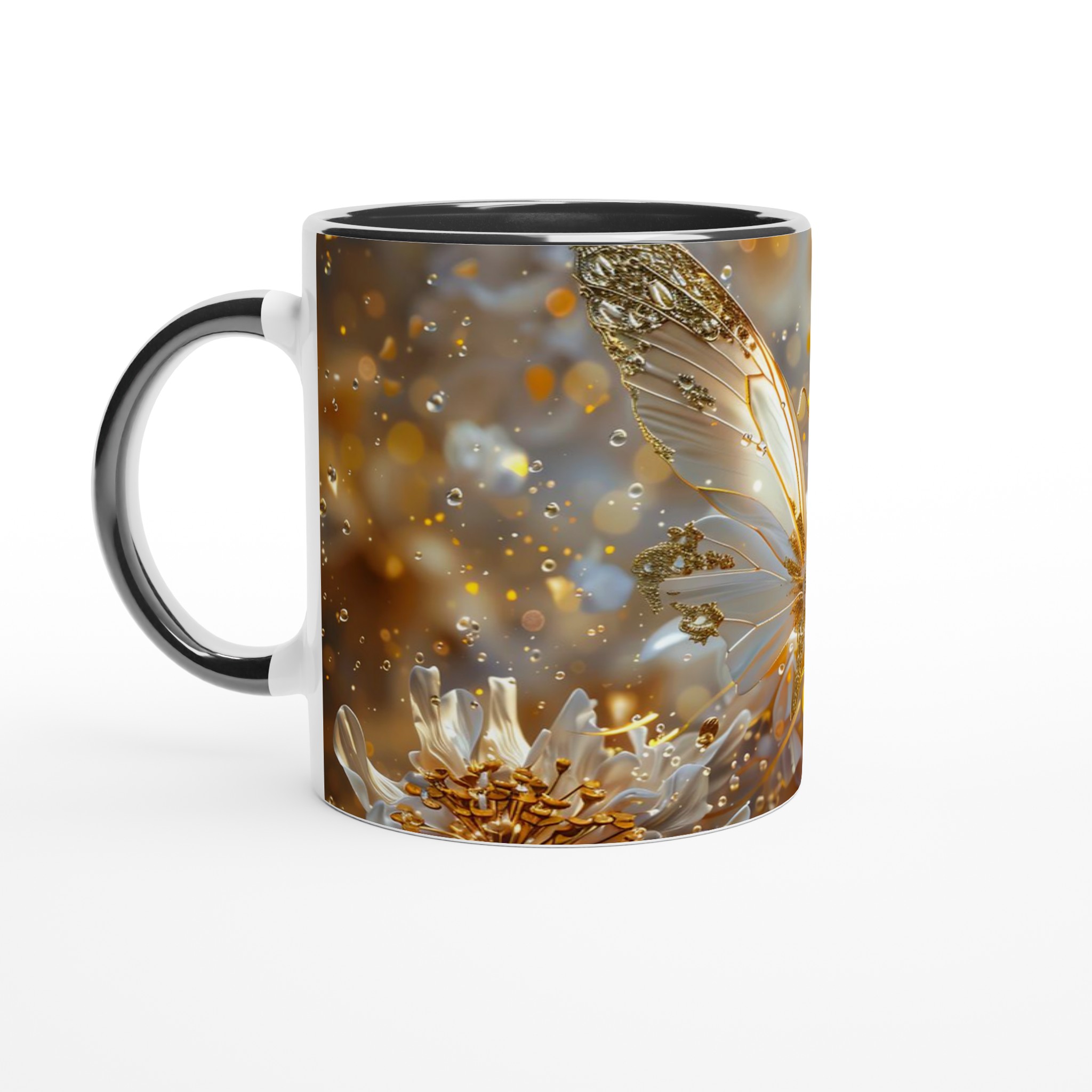 Fånga magin med varje klunk från denna förtrollande keramiska mugg, prydd med ett konstverk av en skimrande gyllene fjäril. Denna mugg blir snabbt en vardagsfavorit, perfekt för morgonkaffet, kvällens varma choklad eller när du bara vill njuta av en kopp te. Den blanka vita ytan gör att trycken framhävs med klara och levande färger, som håller sig fina även efter många turer i mikron och diskmaskinen.