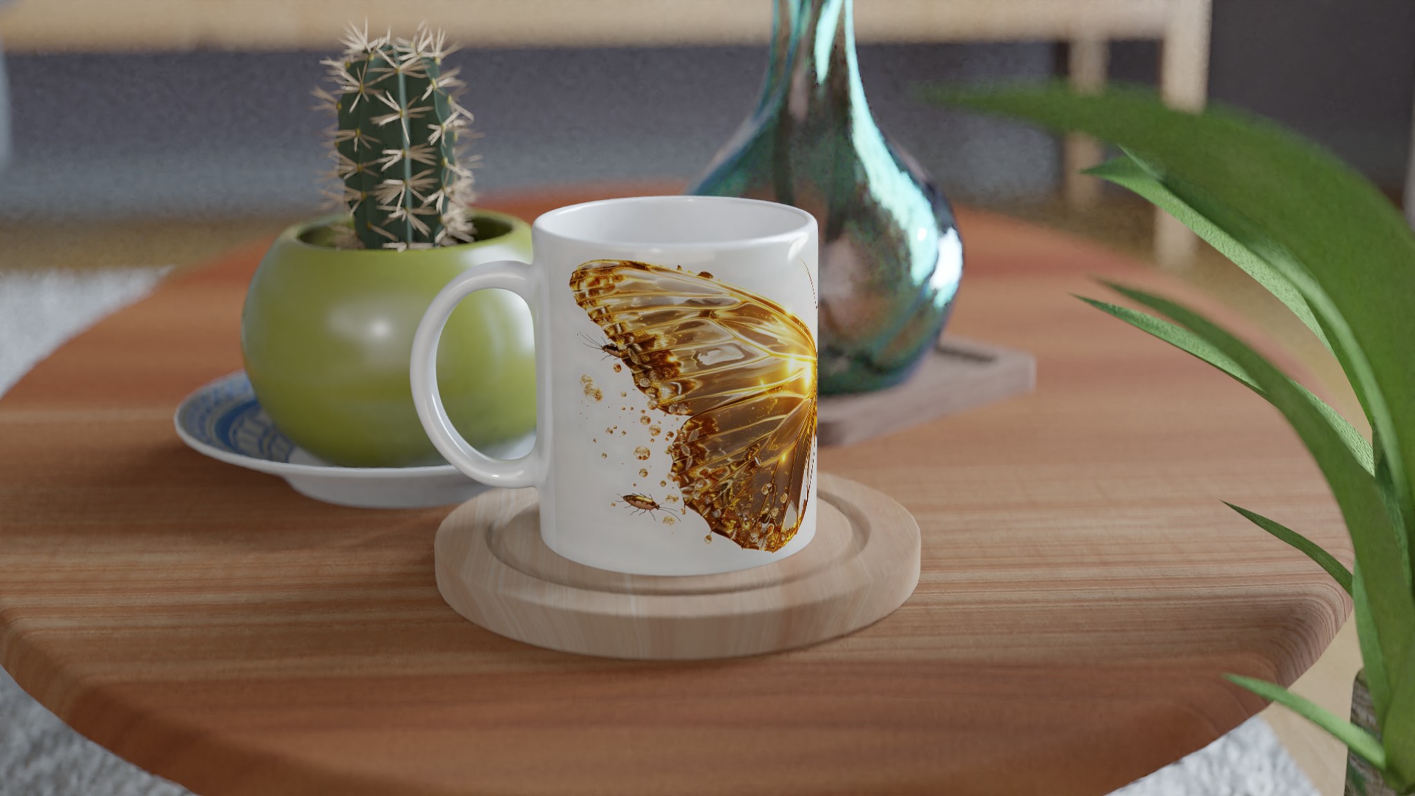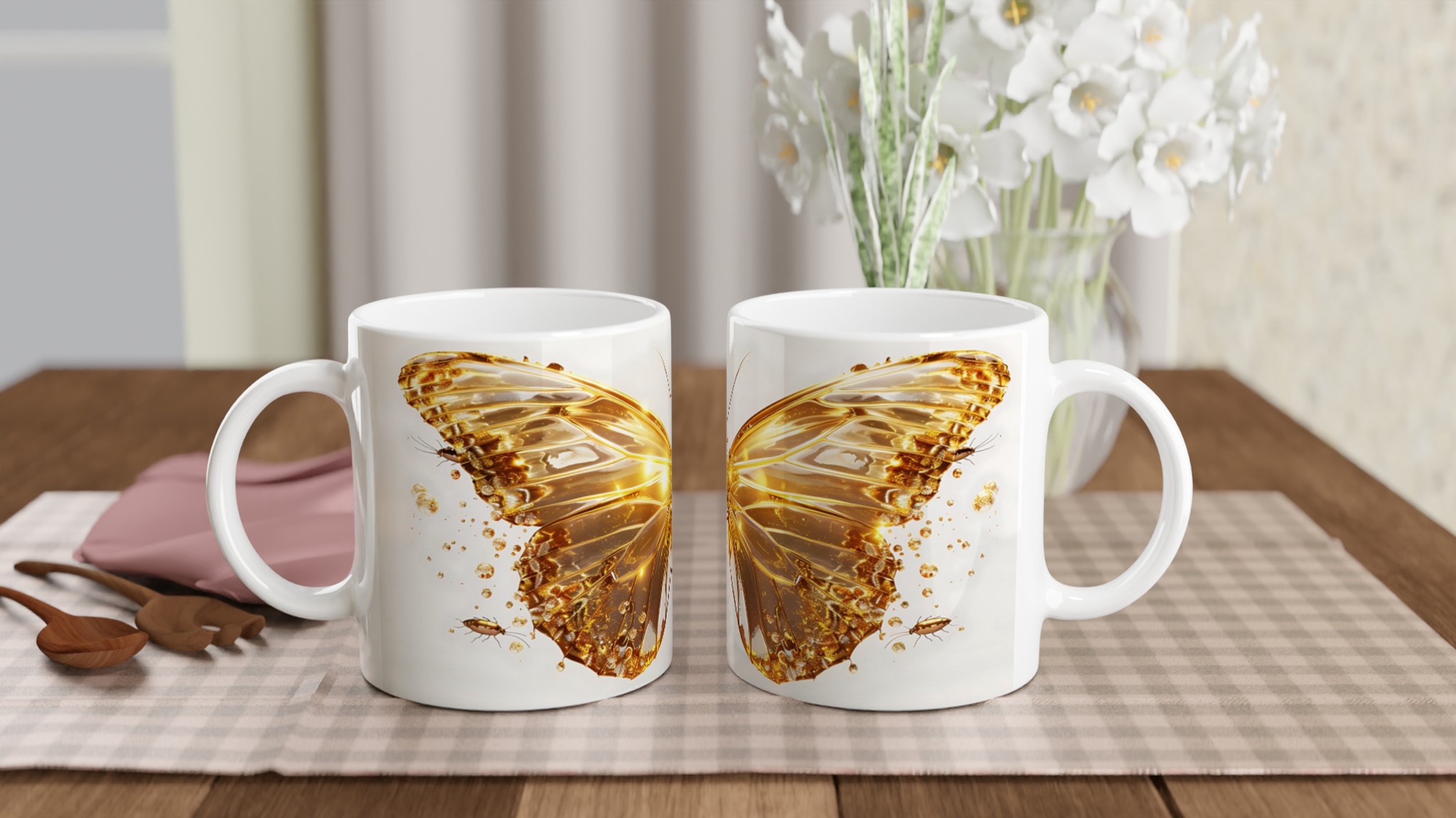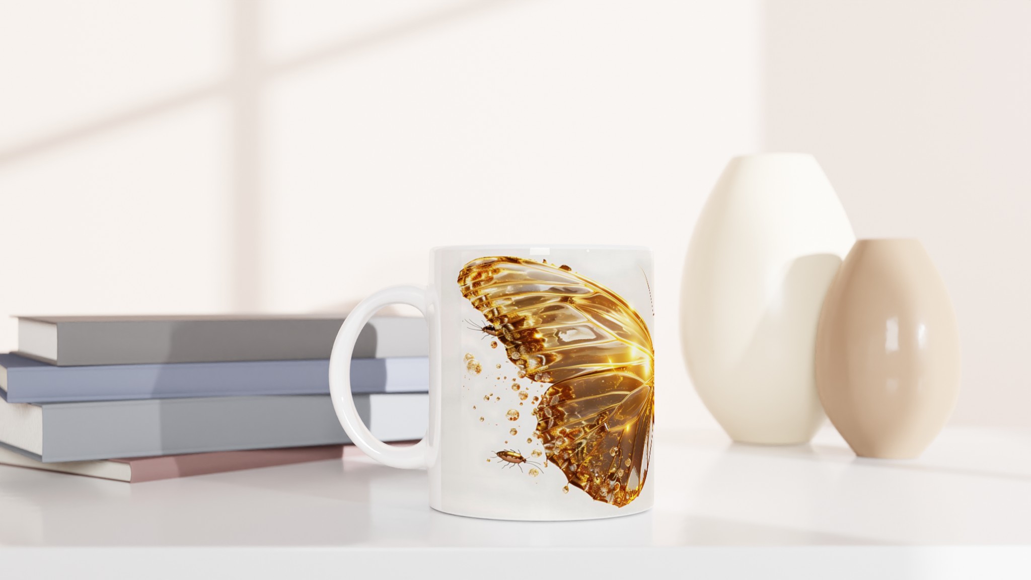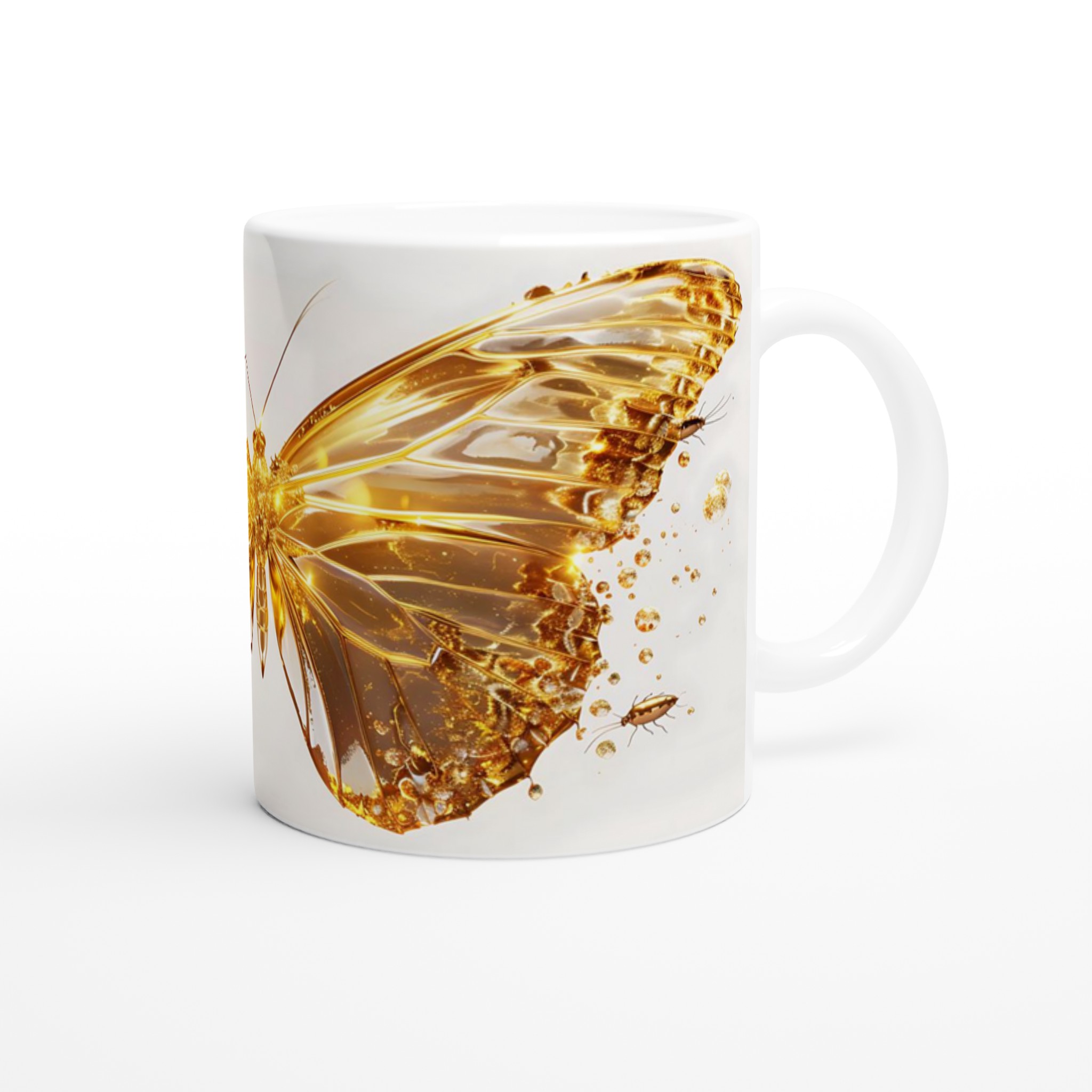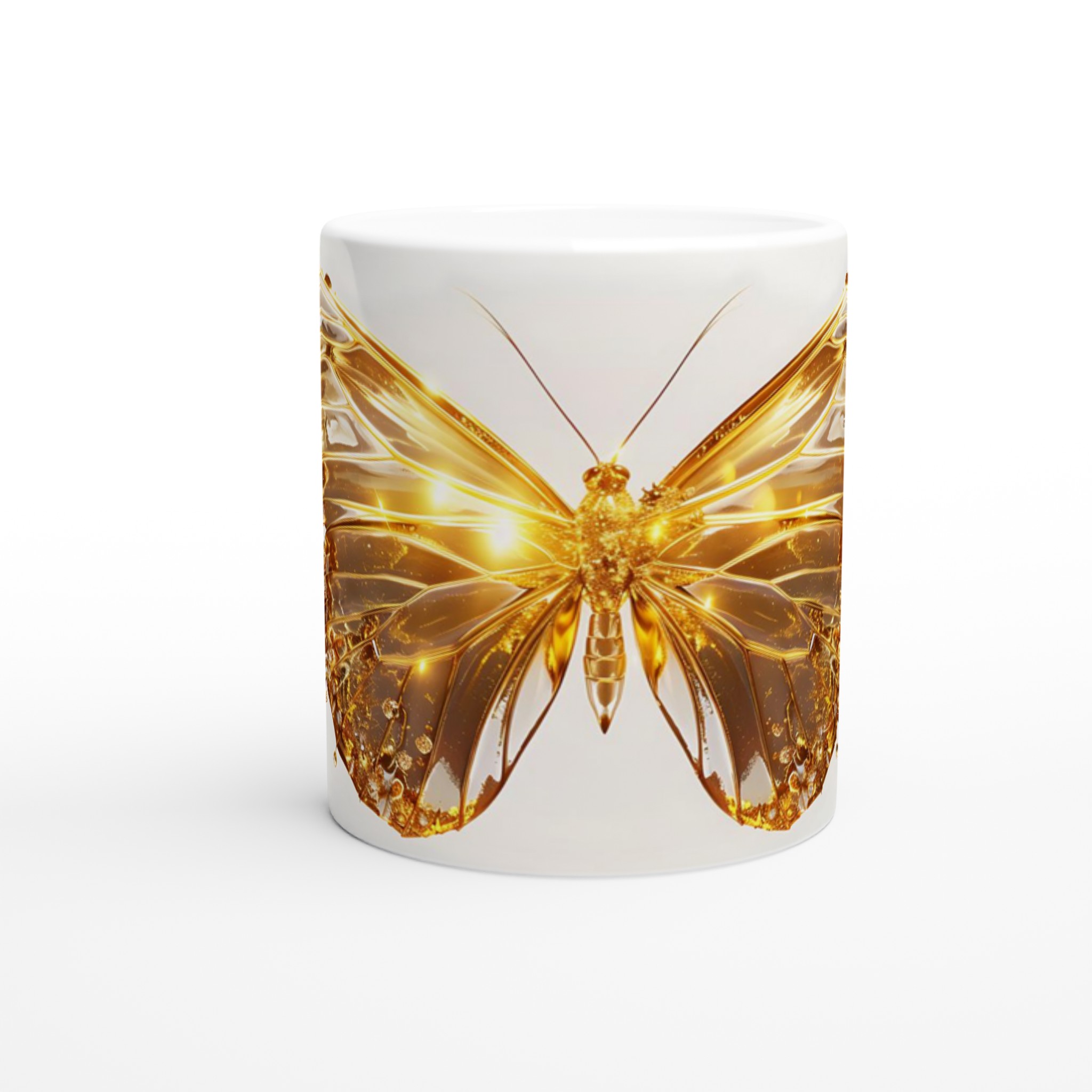 Lyft din fikastund med denna strålande keramiska mugg, som fångar den eteriska skönheten hos en gyllene fjäril. Varje detalj, från vingarnas skimrande yta till de gnistrande dropparna, framhävs med en exceptionell lyster som gör varje kopp till en liten lyx. Denna mugg är mer än bara en behållare för din favoritdryck; den är ett konstverk som utstrålar elegans och blir en omedelbar blickfångare, perfekt för dig som uppskattar det lilla extra i vardagen.